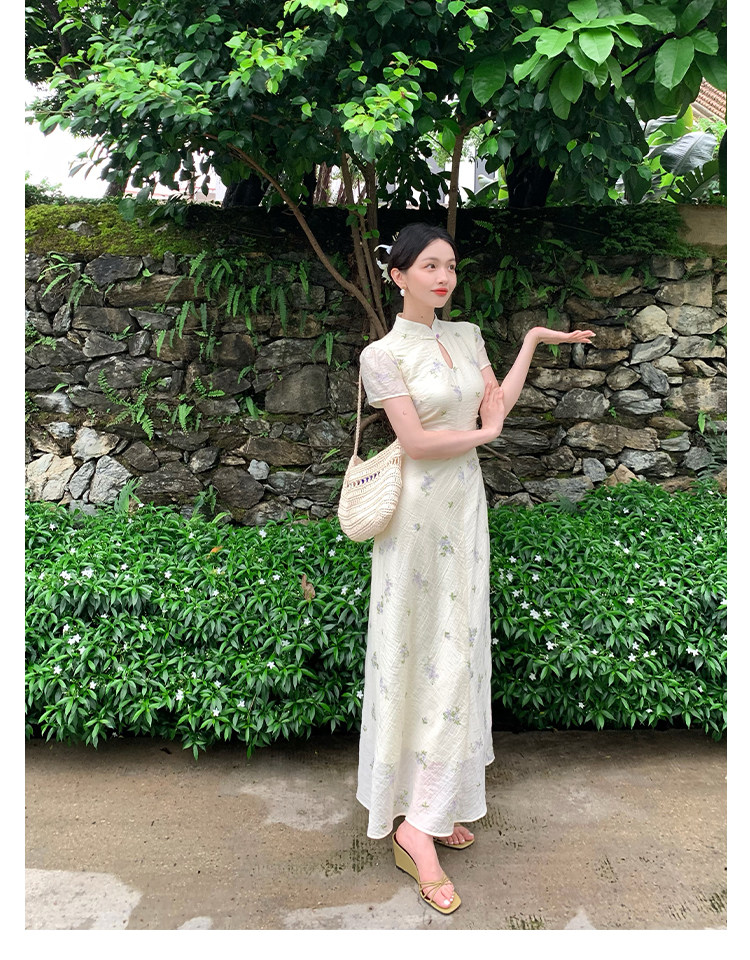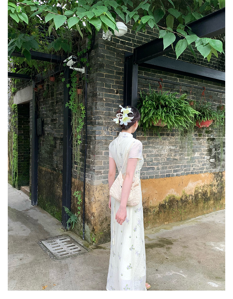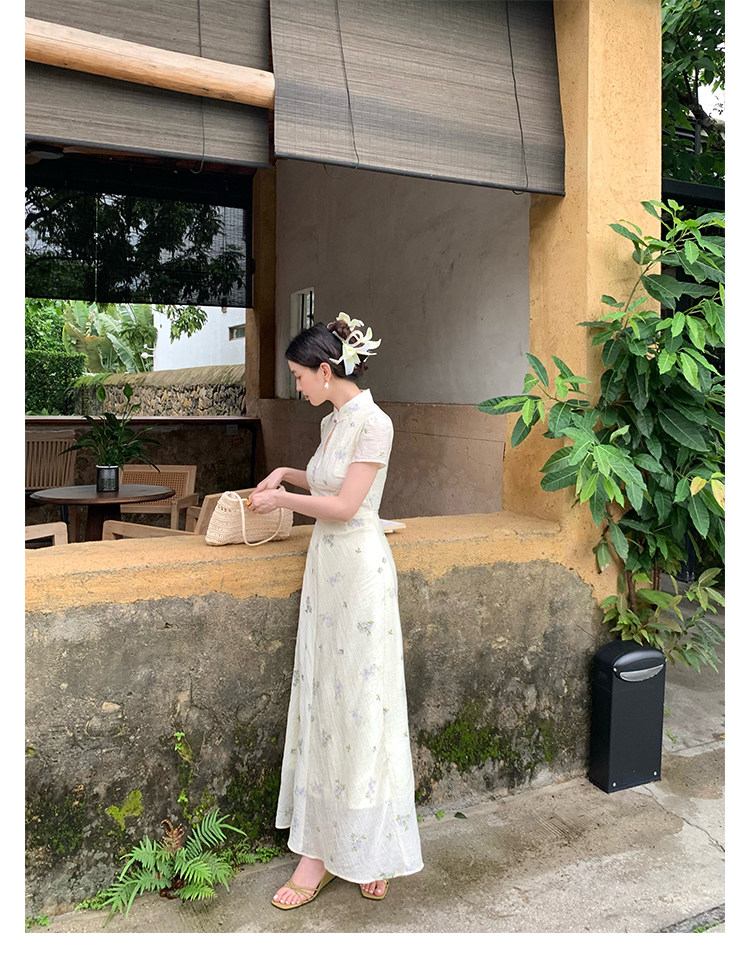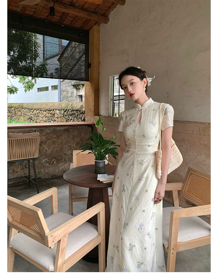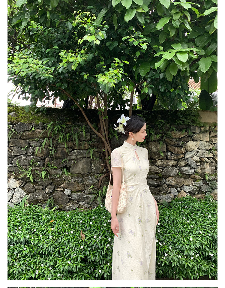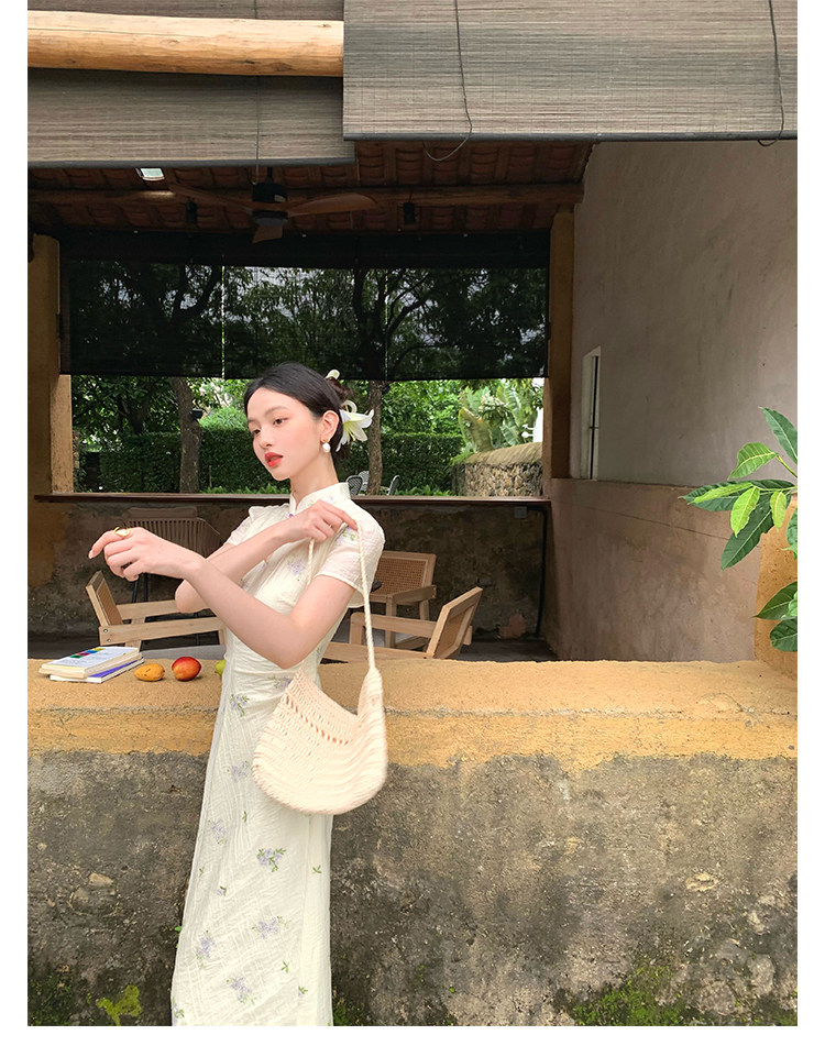 Disc Buckle Collar Embroidered Cheongsam Dress