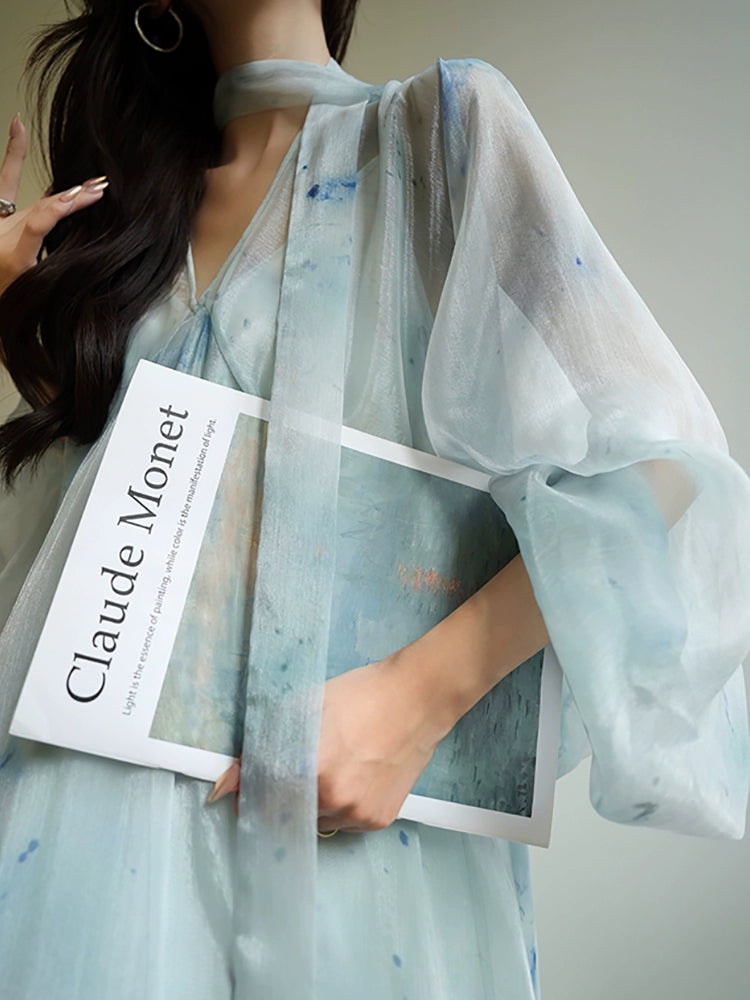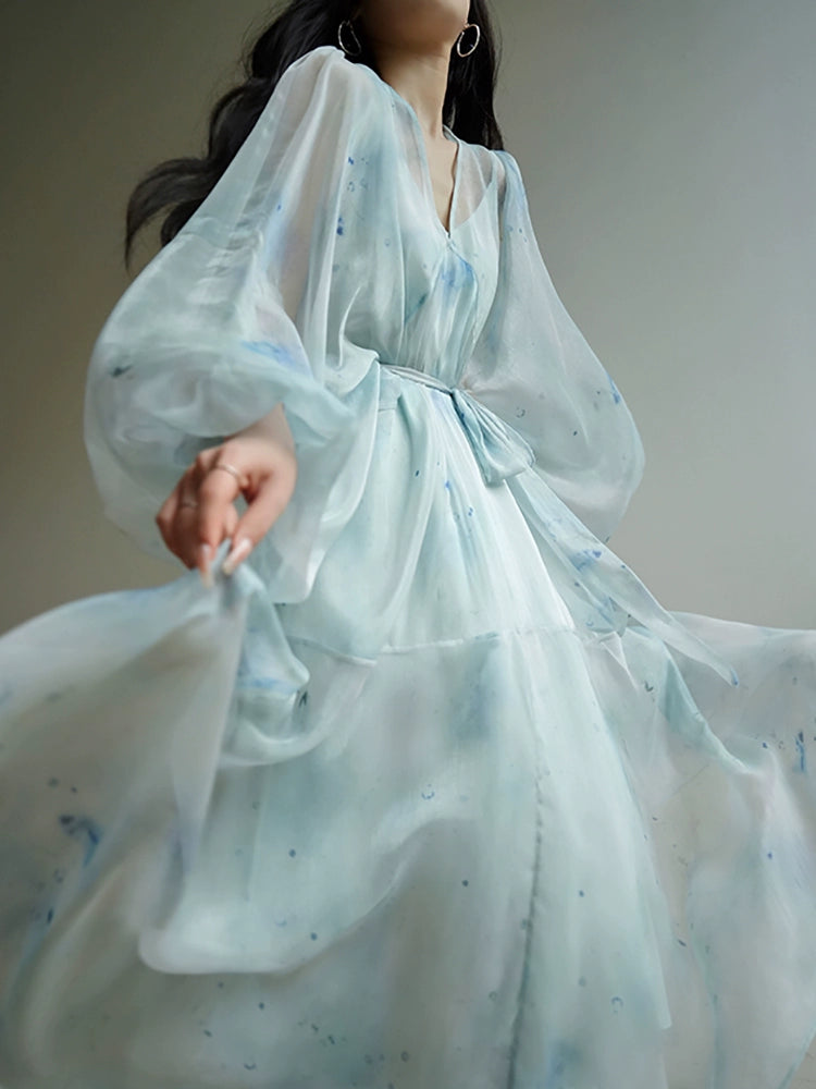 V-Neck Smudge Print Fairy Dress – Soft French Mood