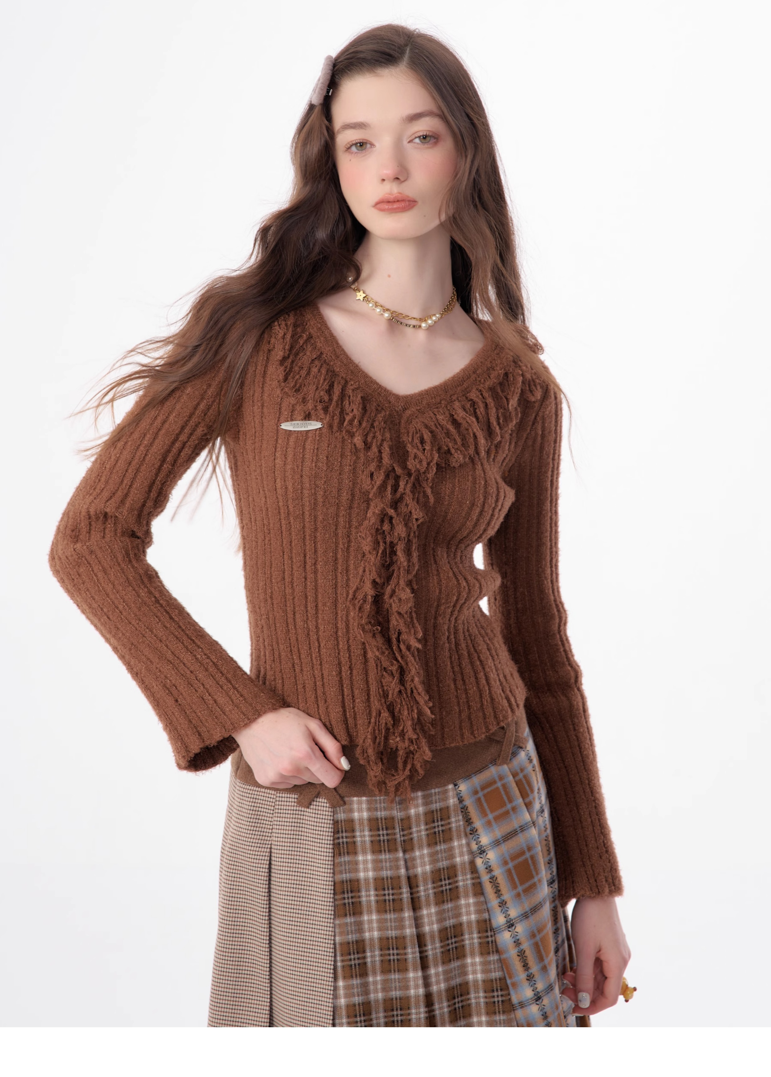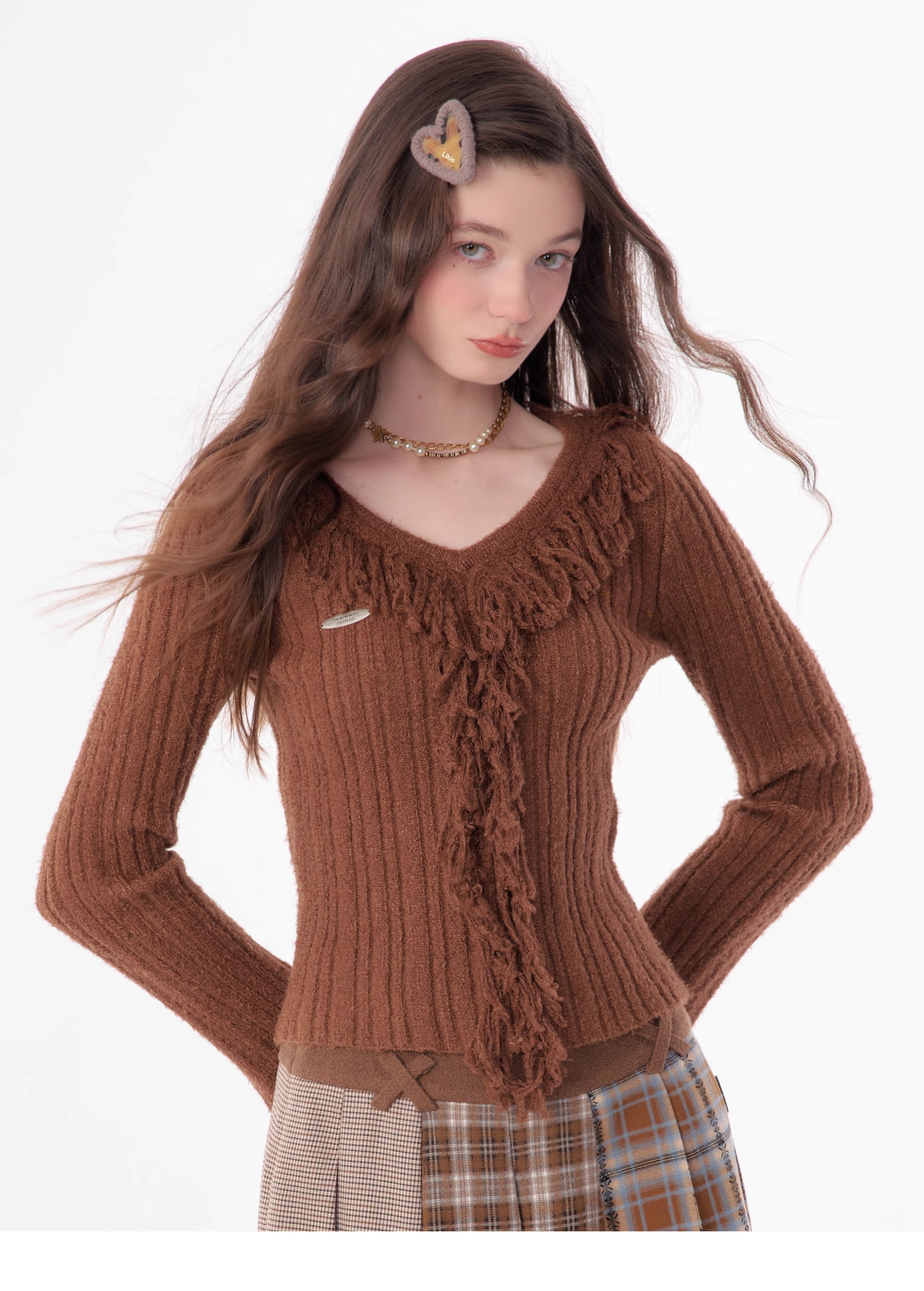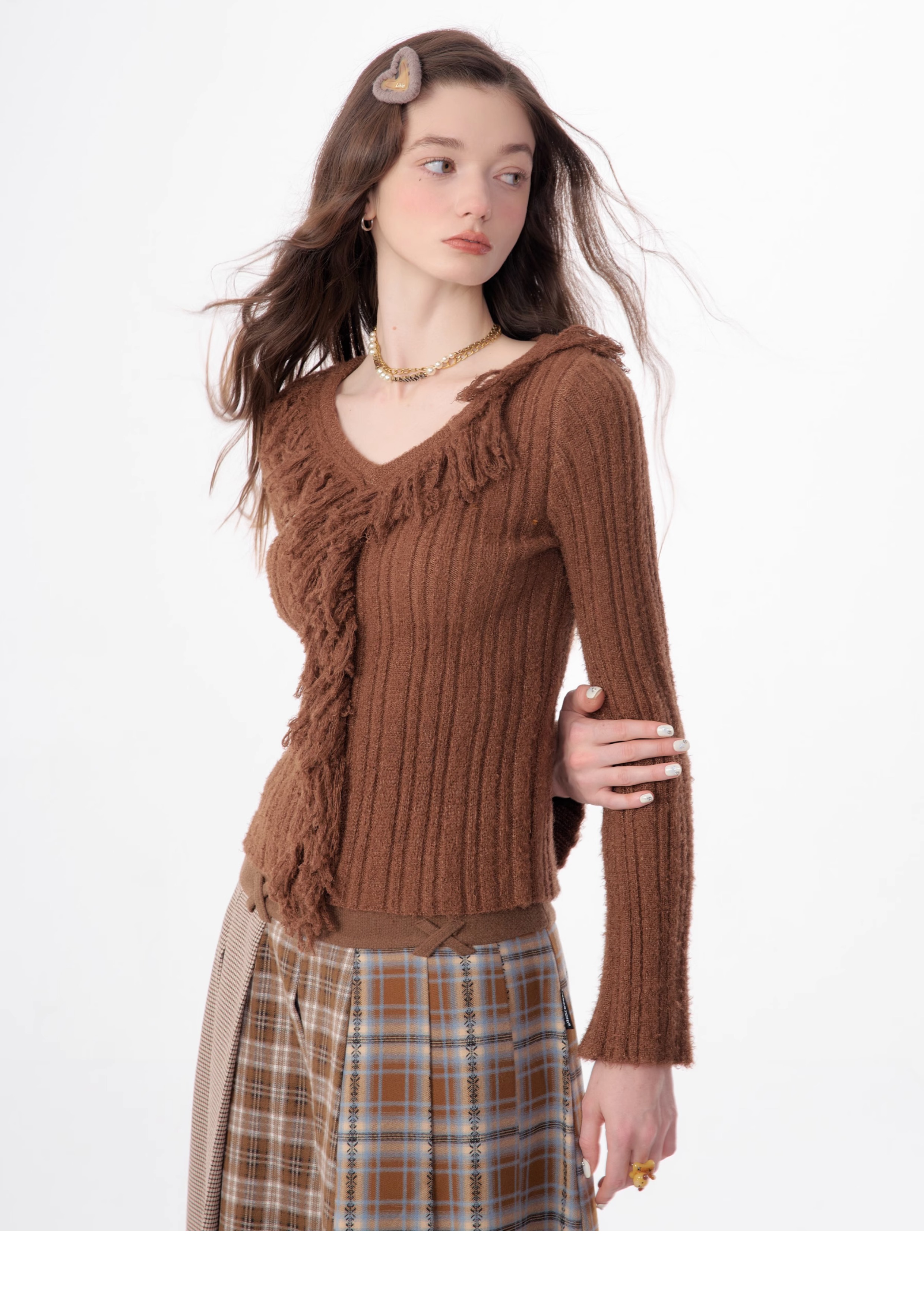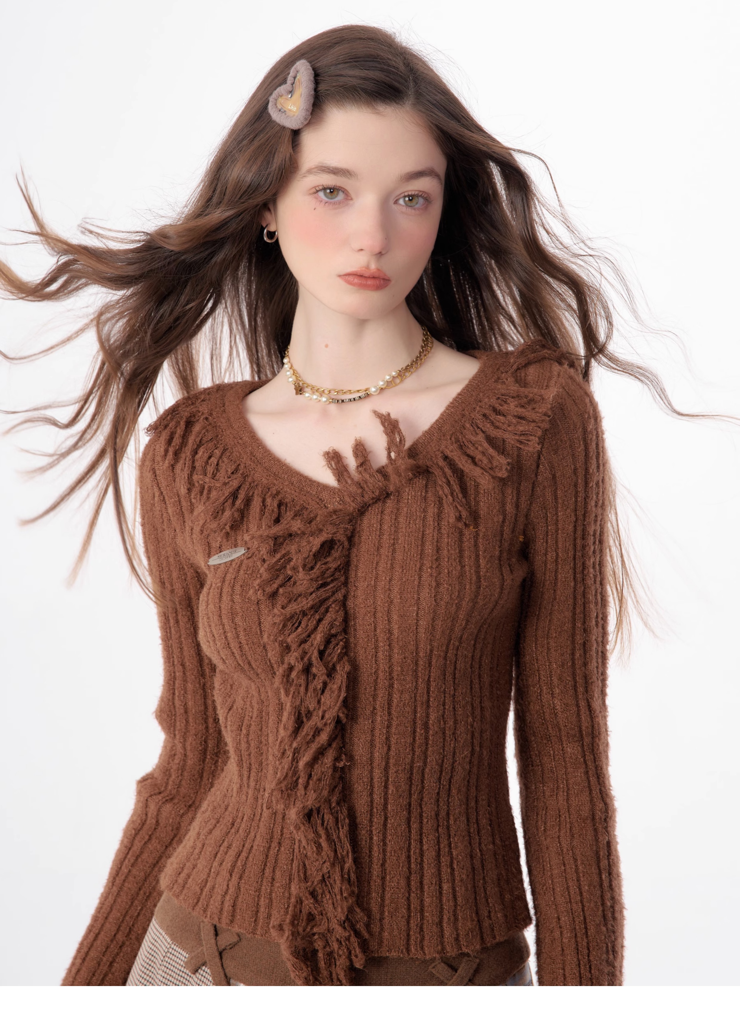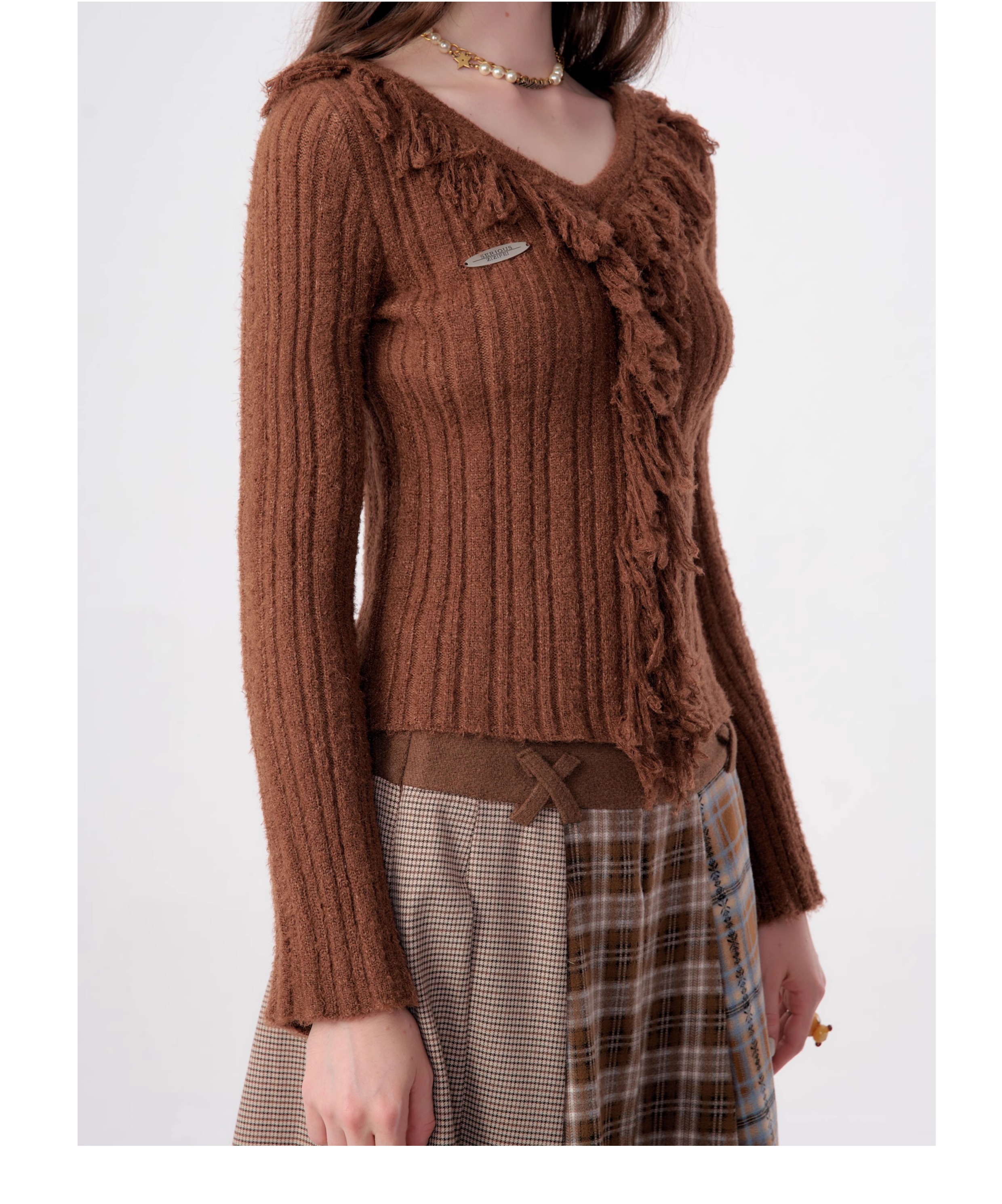 suéter con cuello en V y borlas, diseño retro entallado y cálido y suave para otoño/invierno