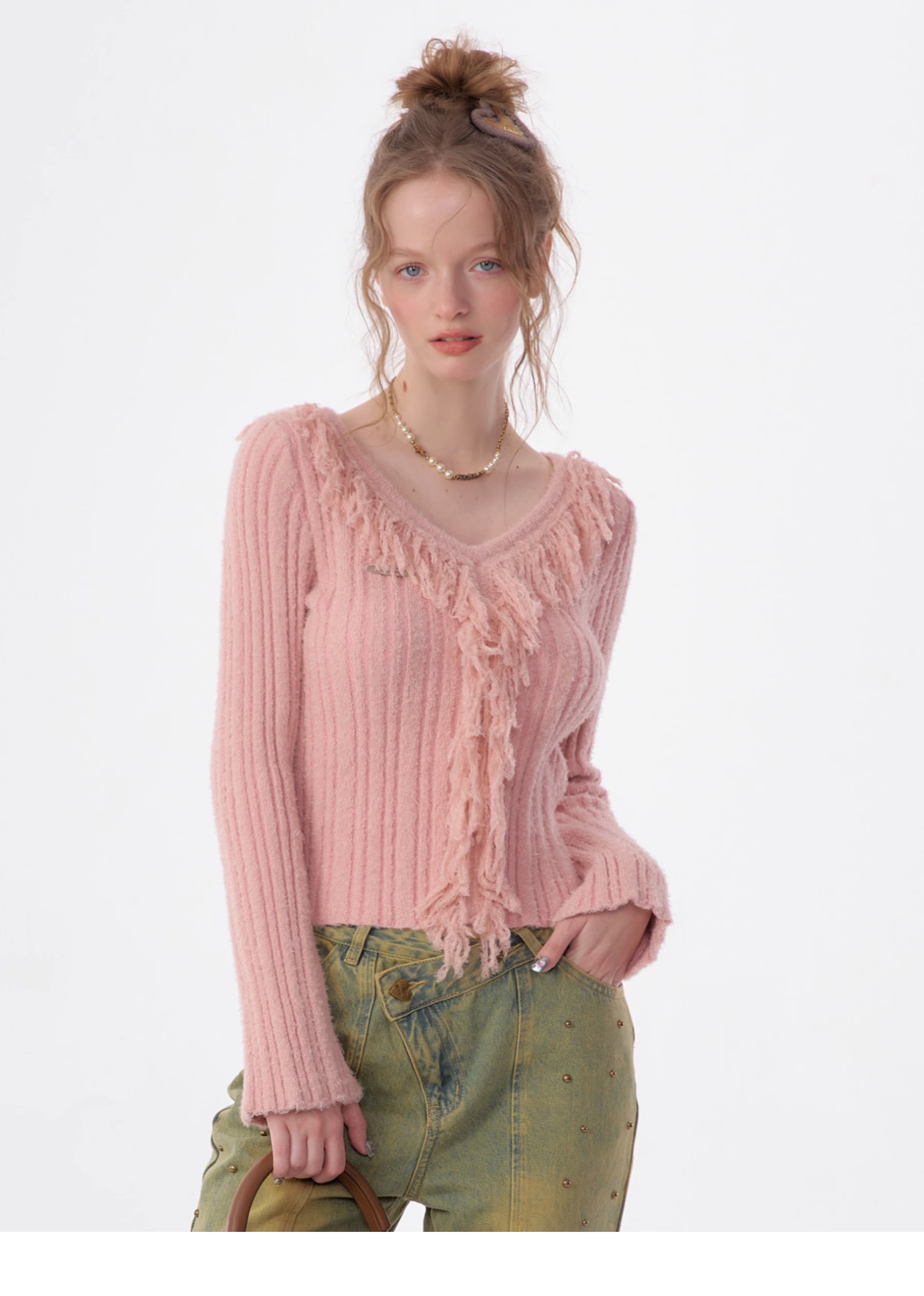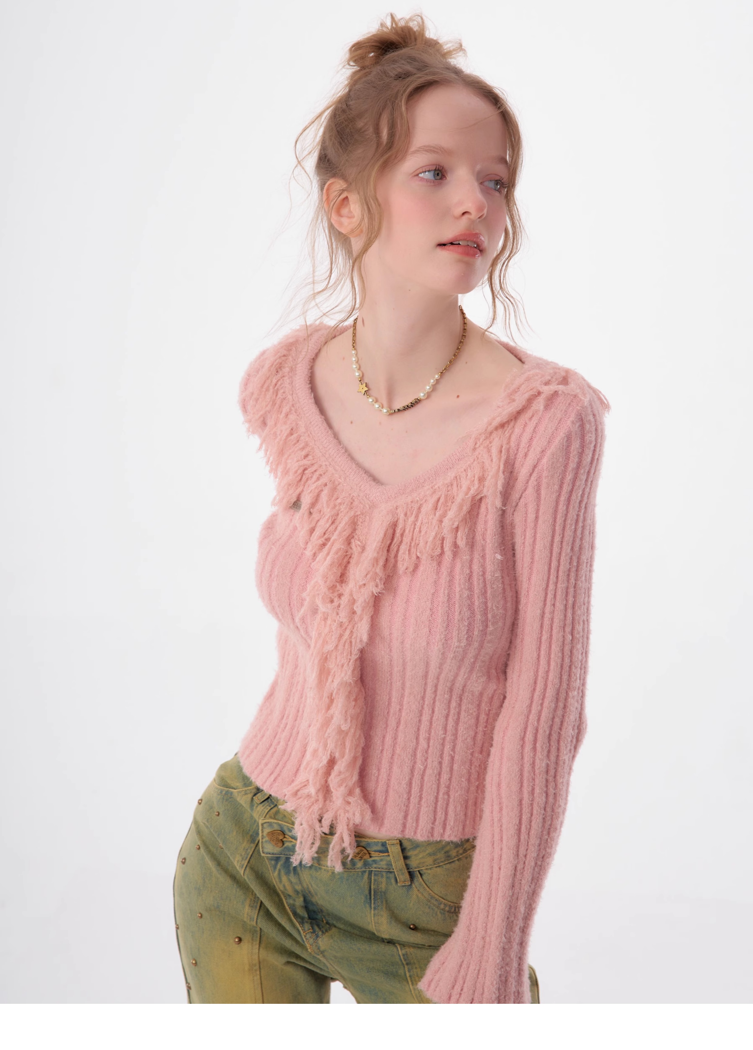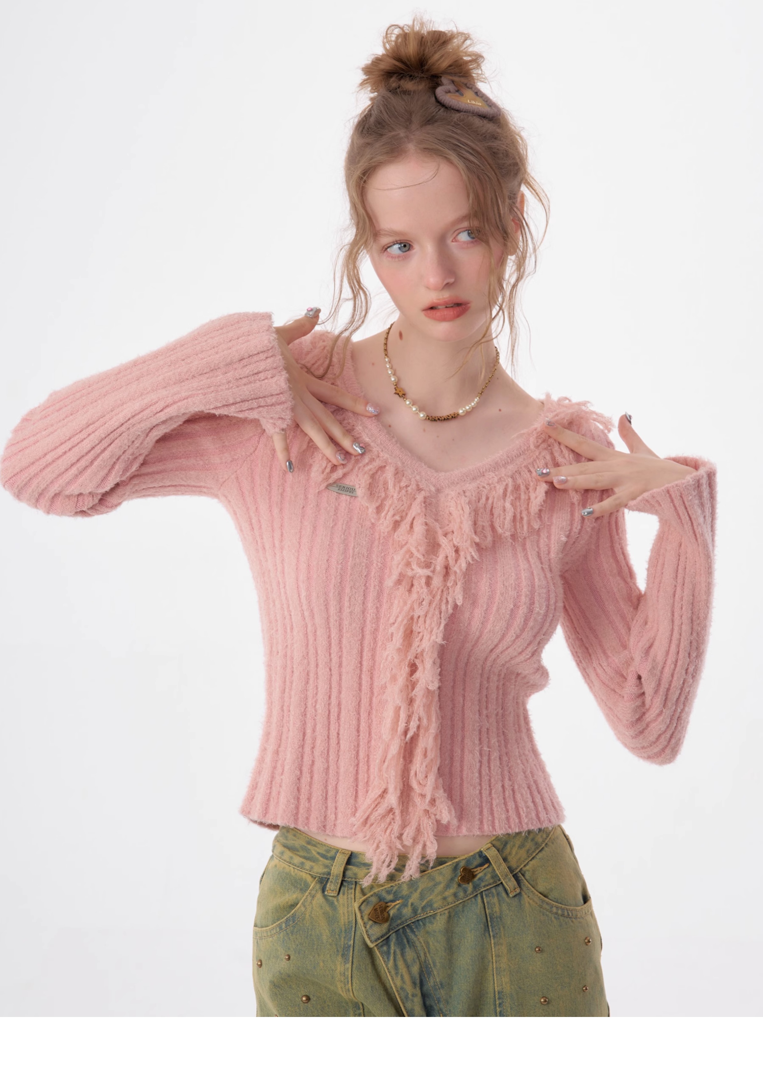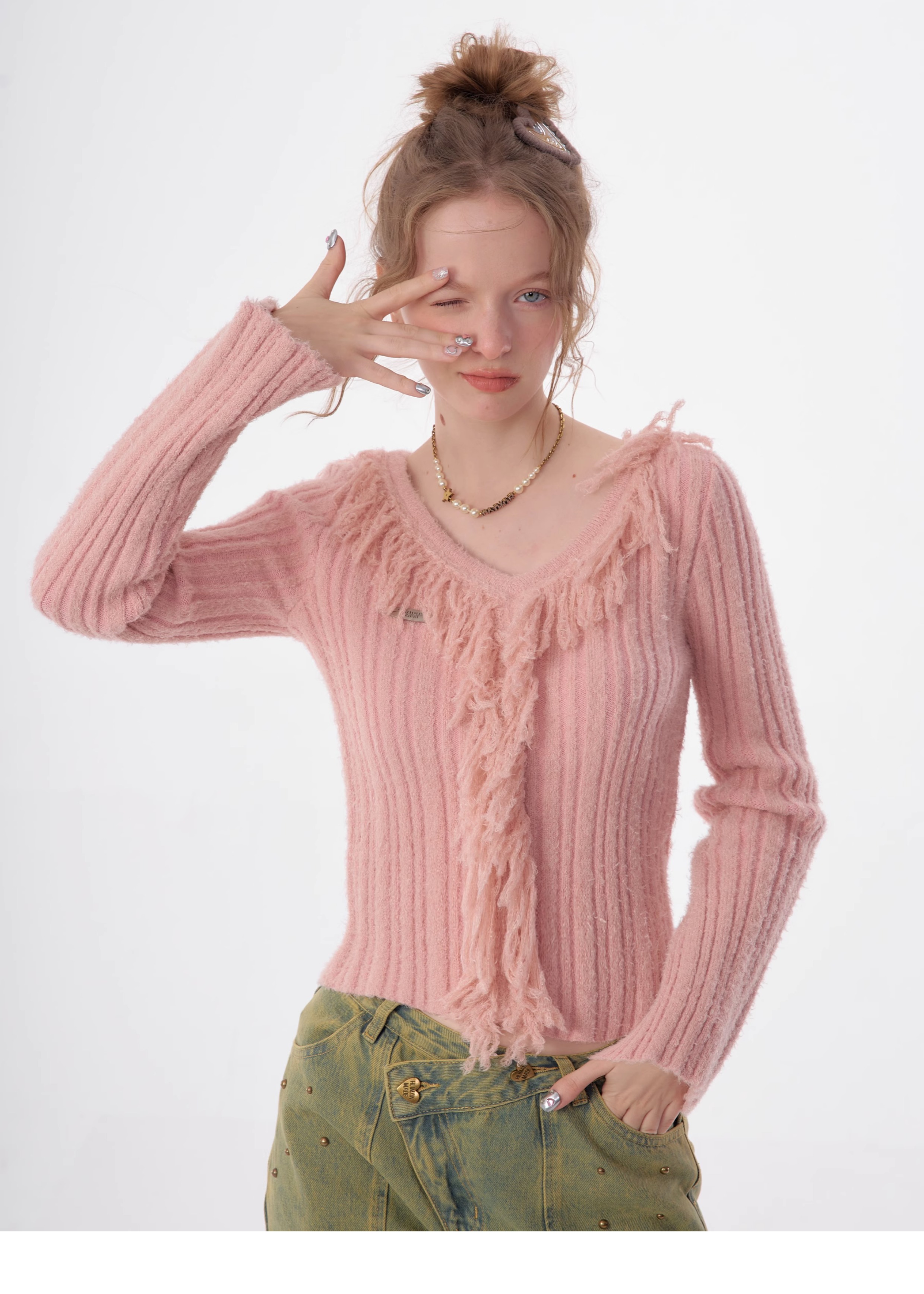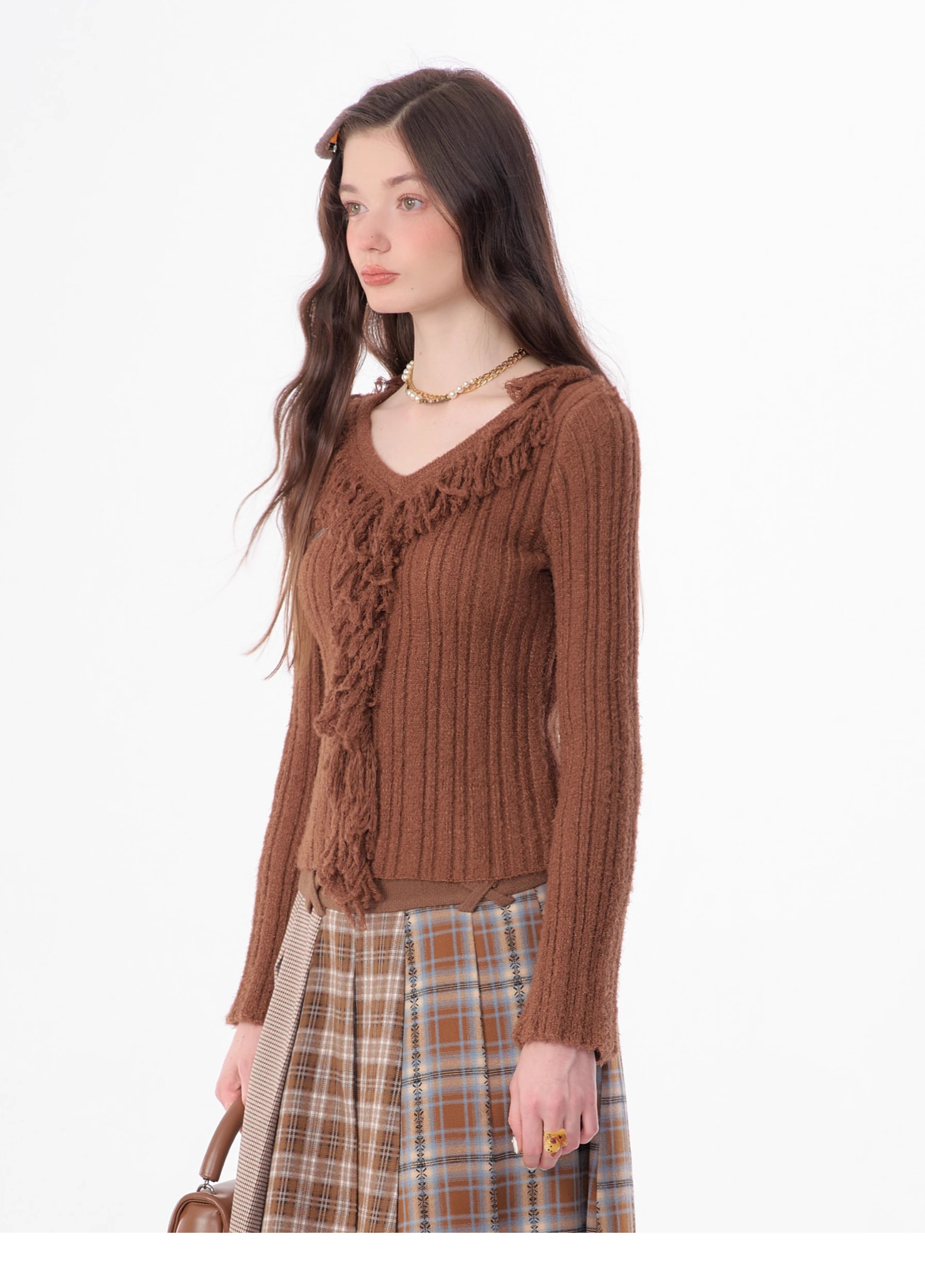 suéter con cuello en V y borlas, diseño retro entallado y cálido y suave para otoño/invierno