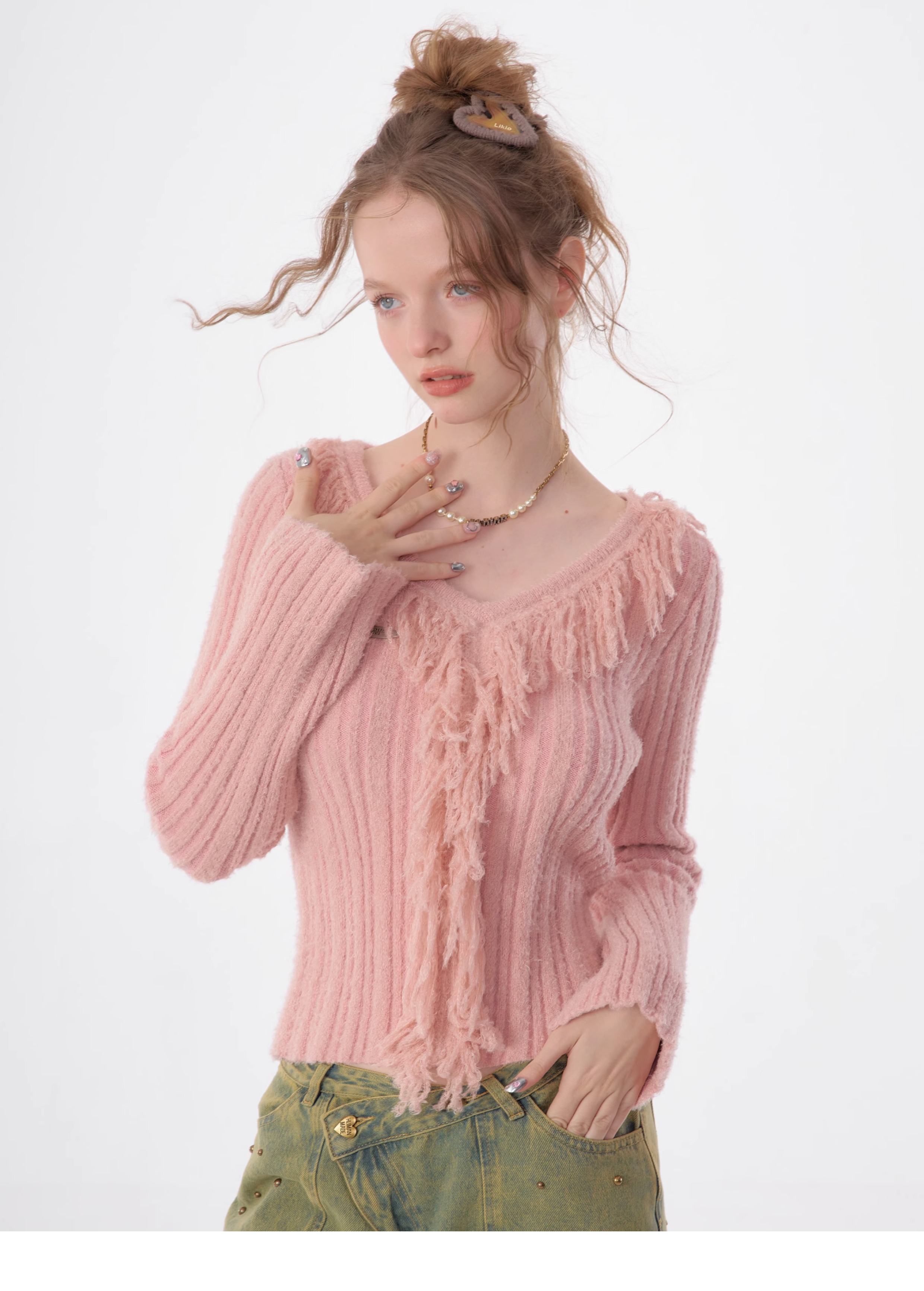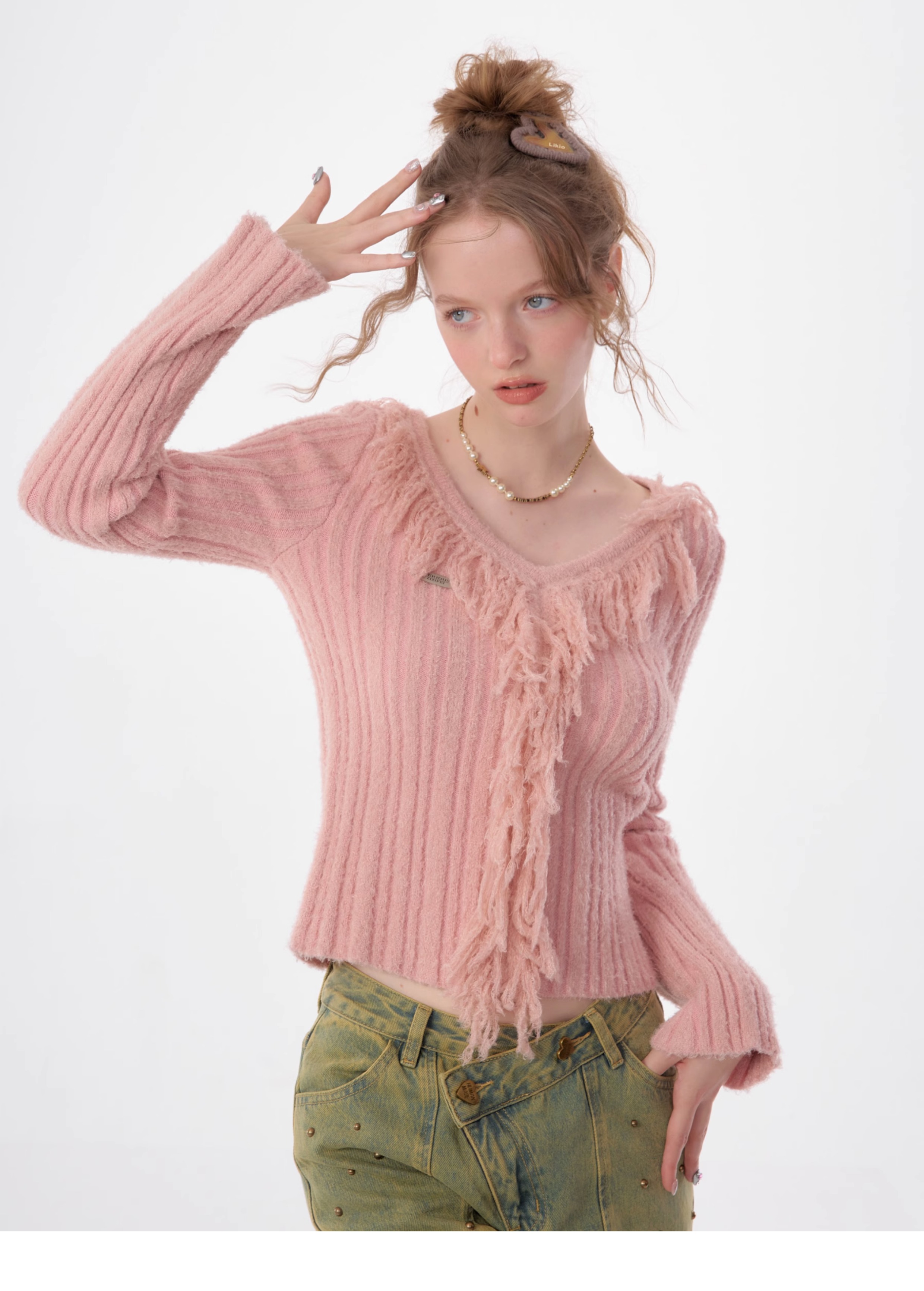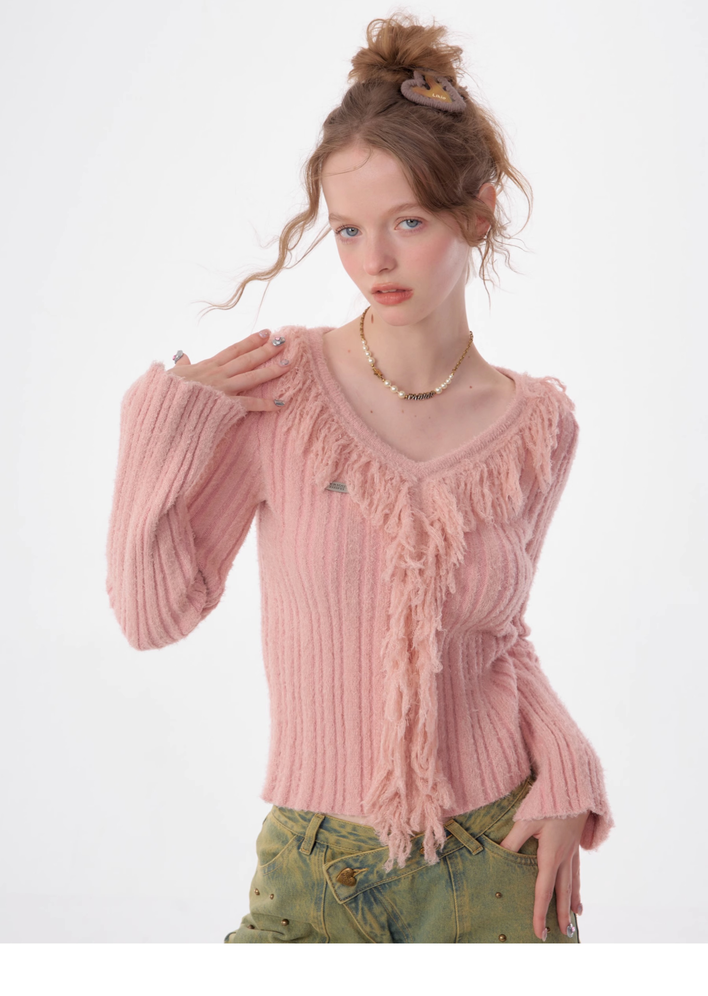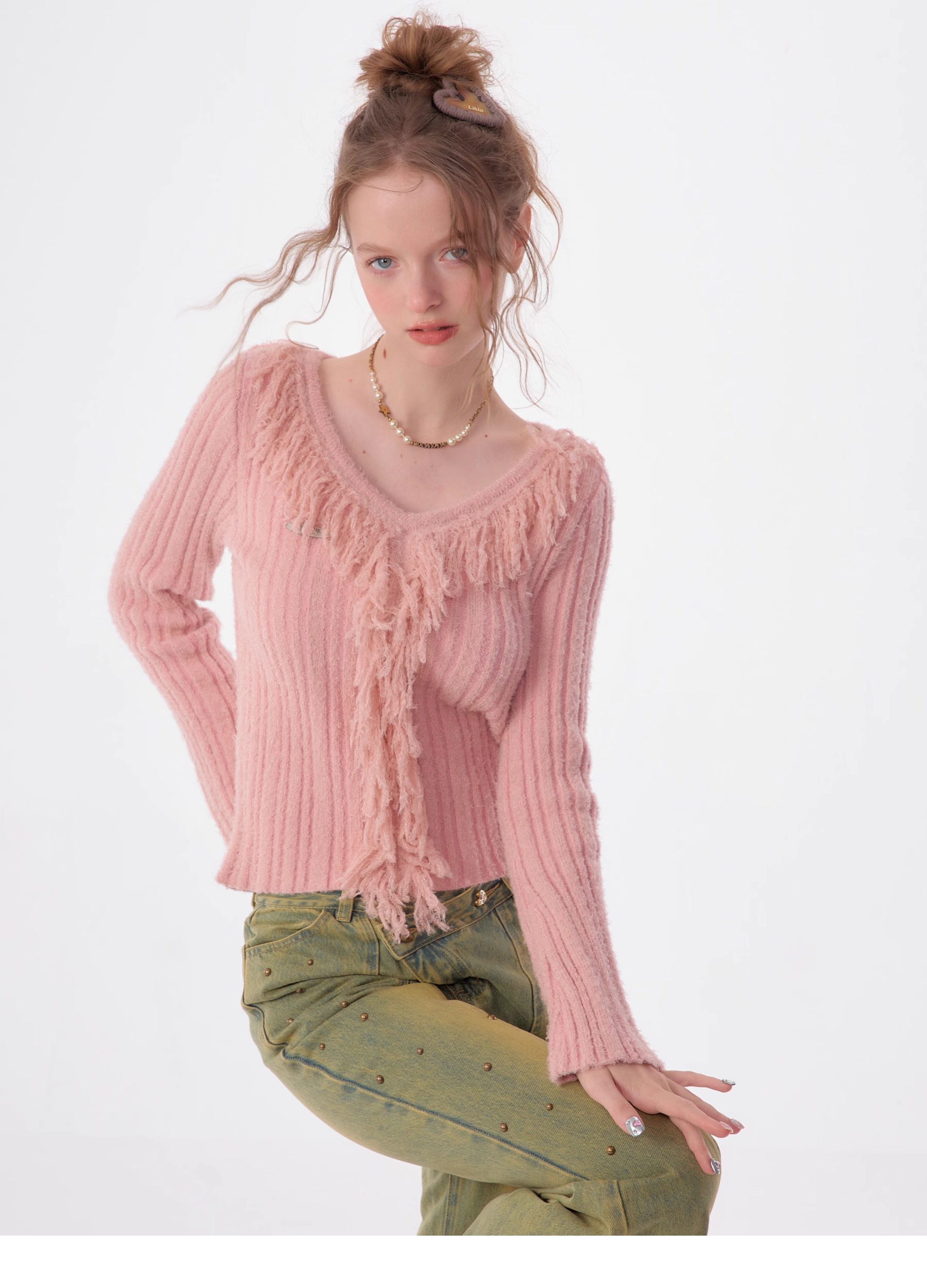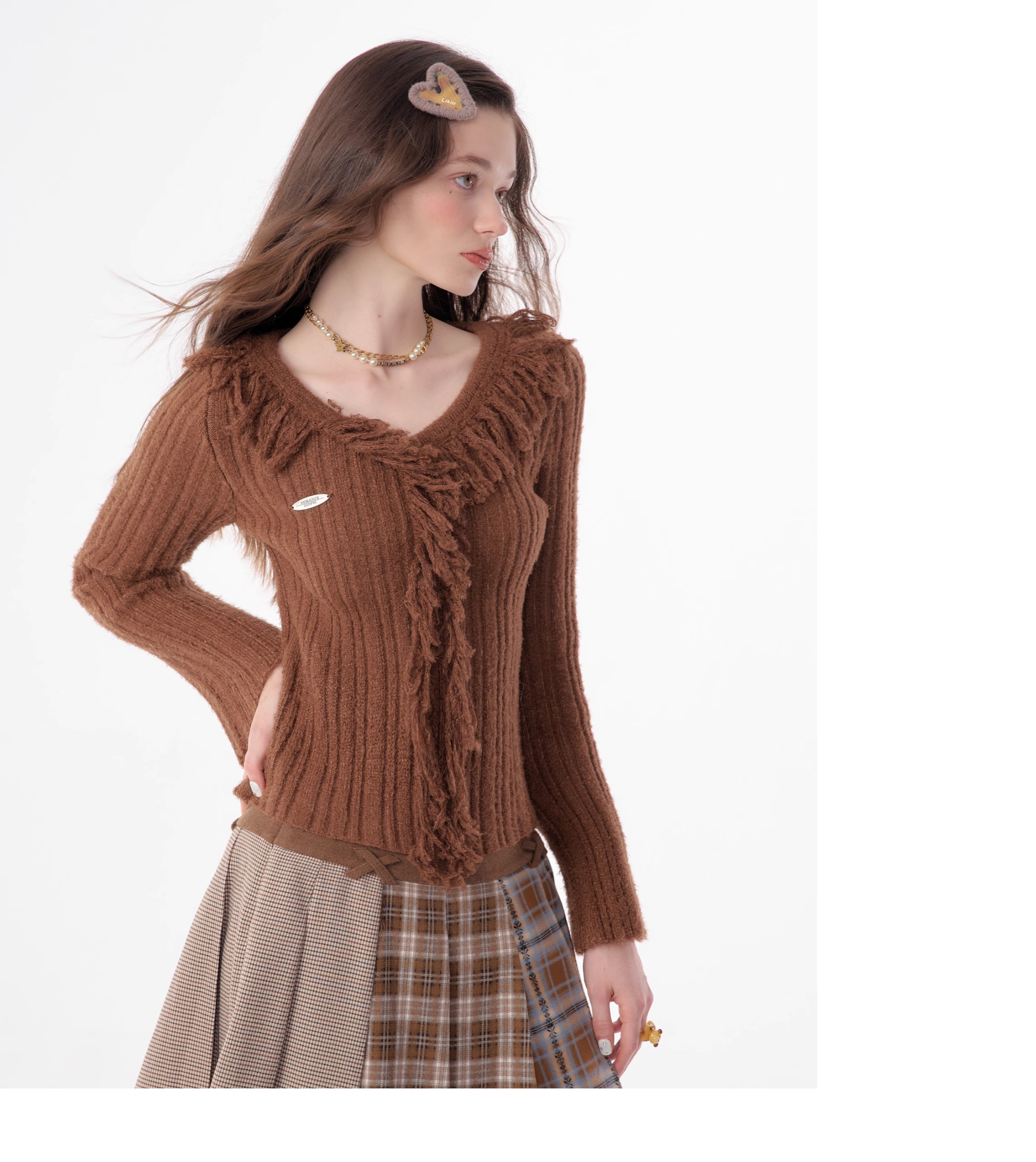 suéter con cuello en V y borlas, diseño retro entallado y cálido y suave para otoño/invierno