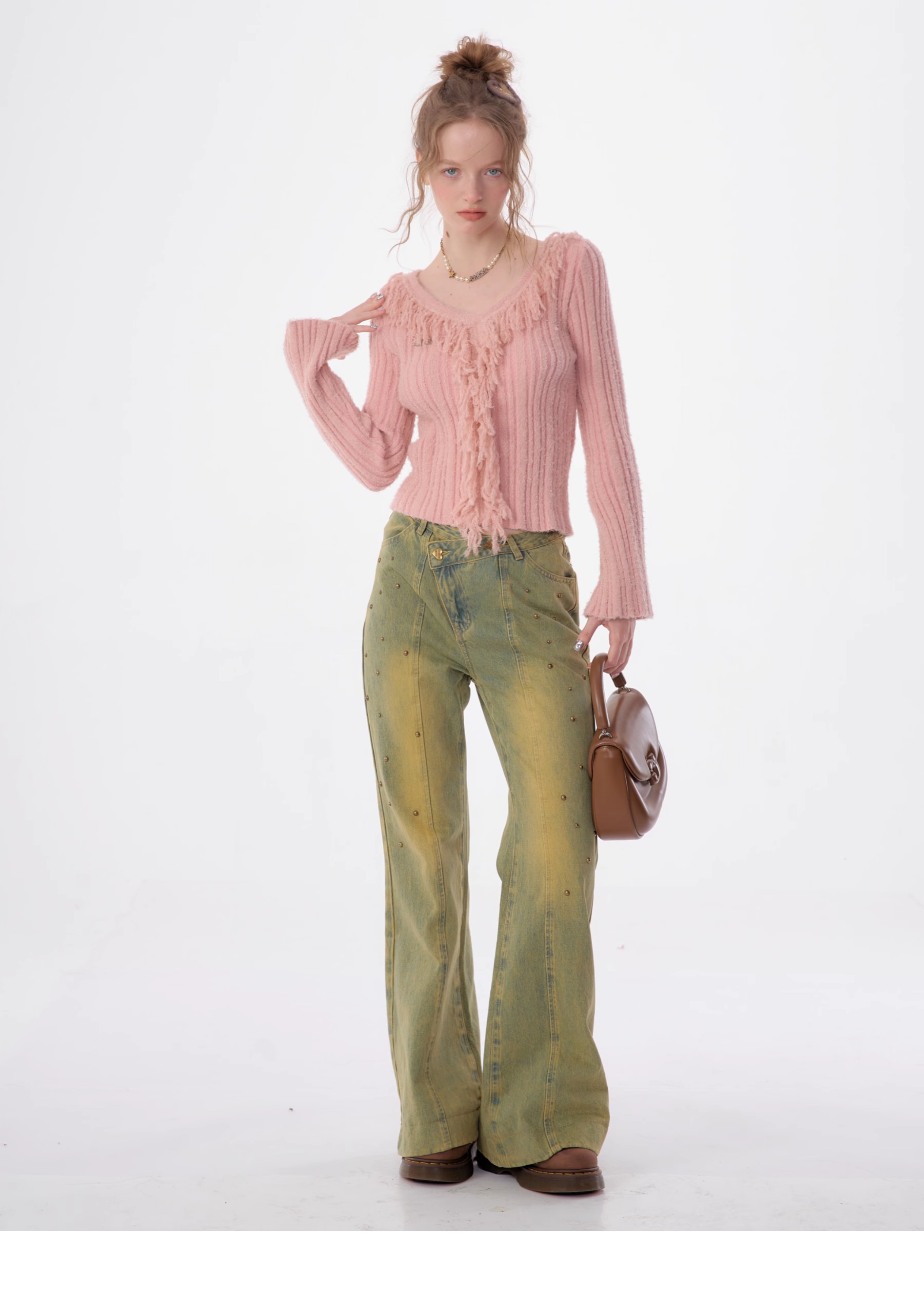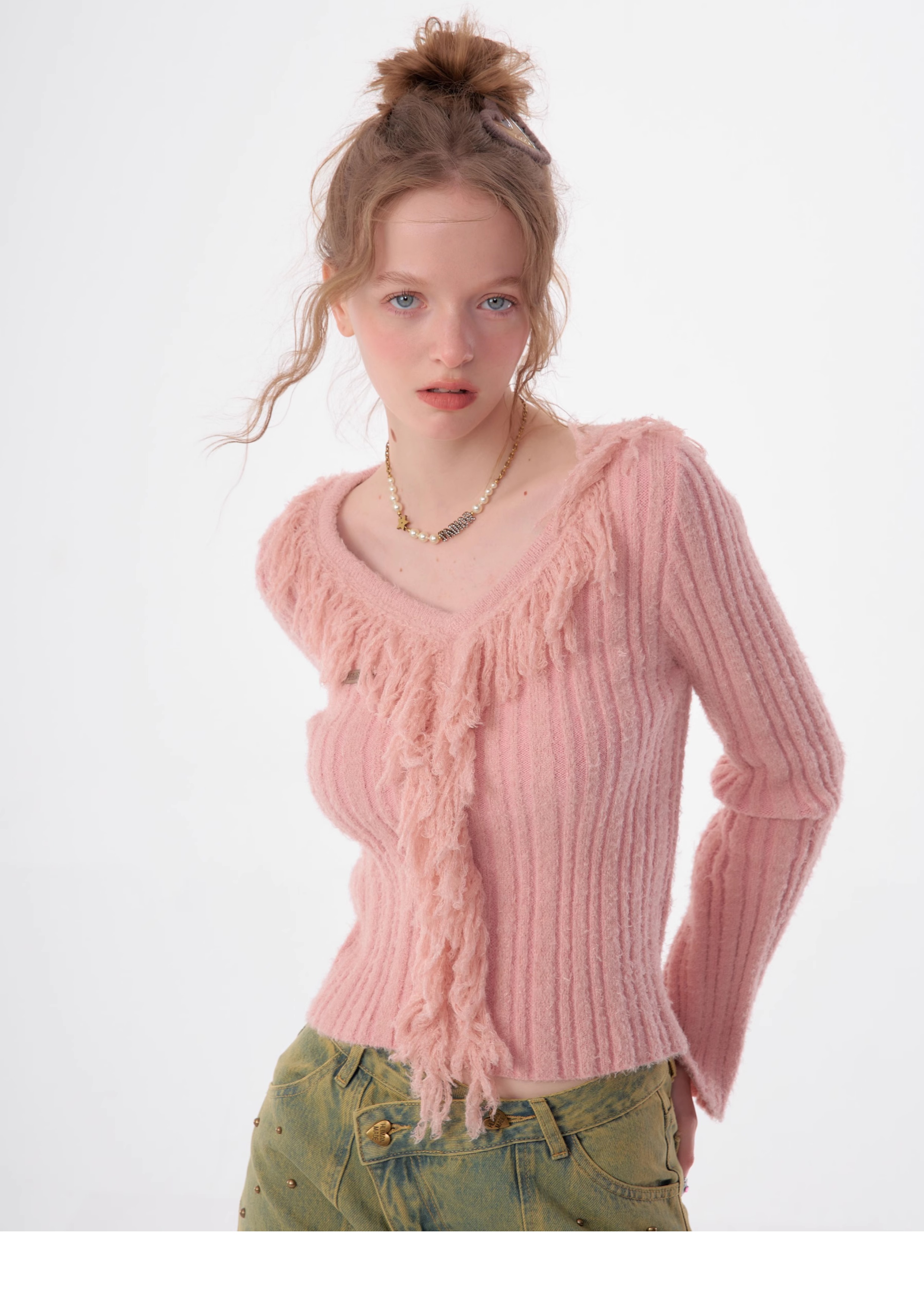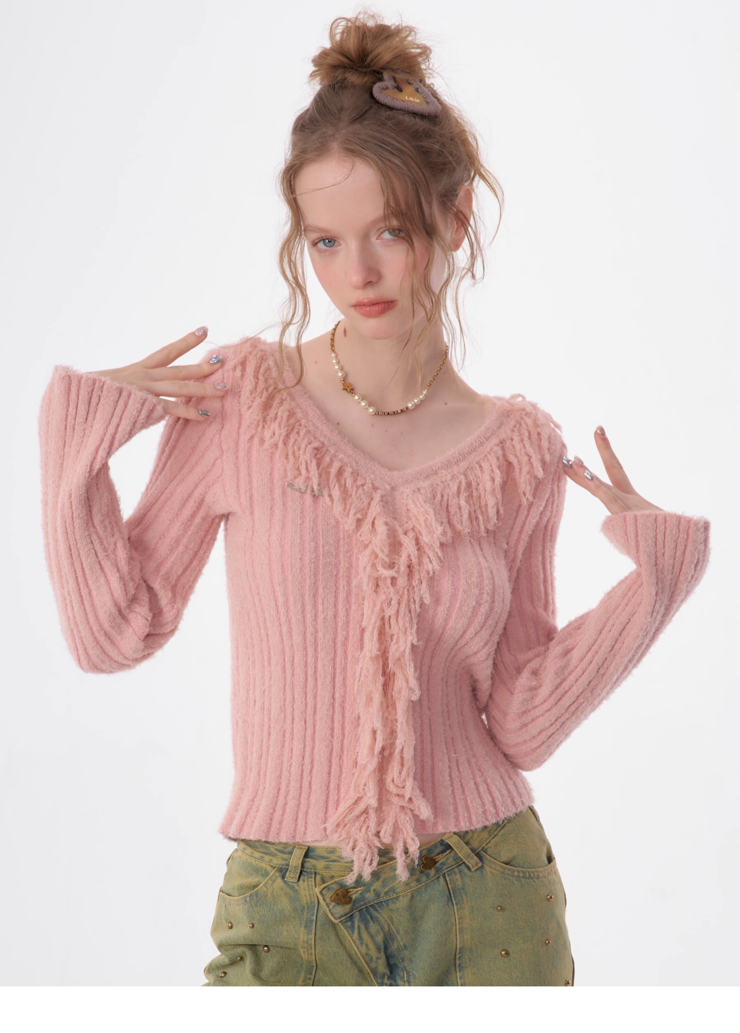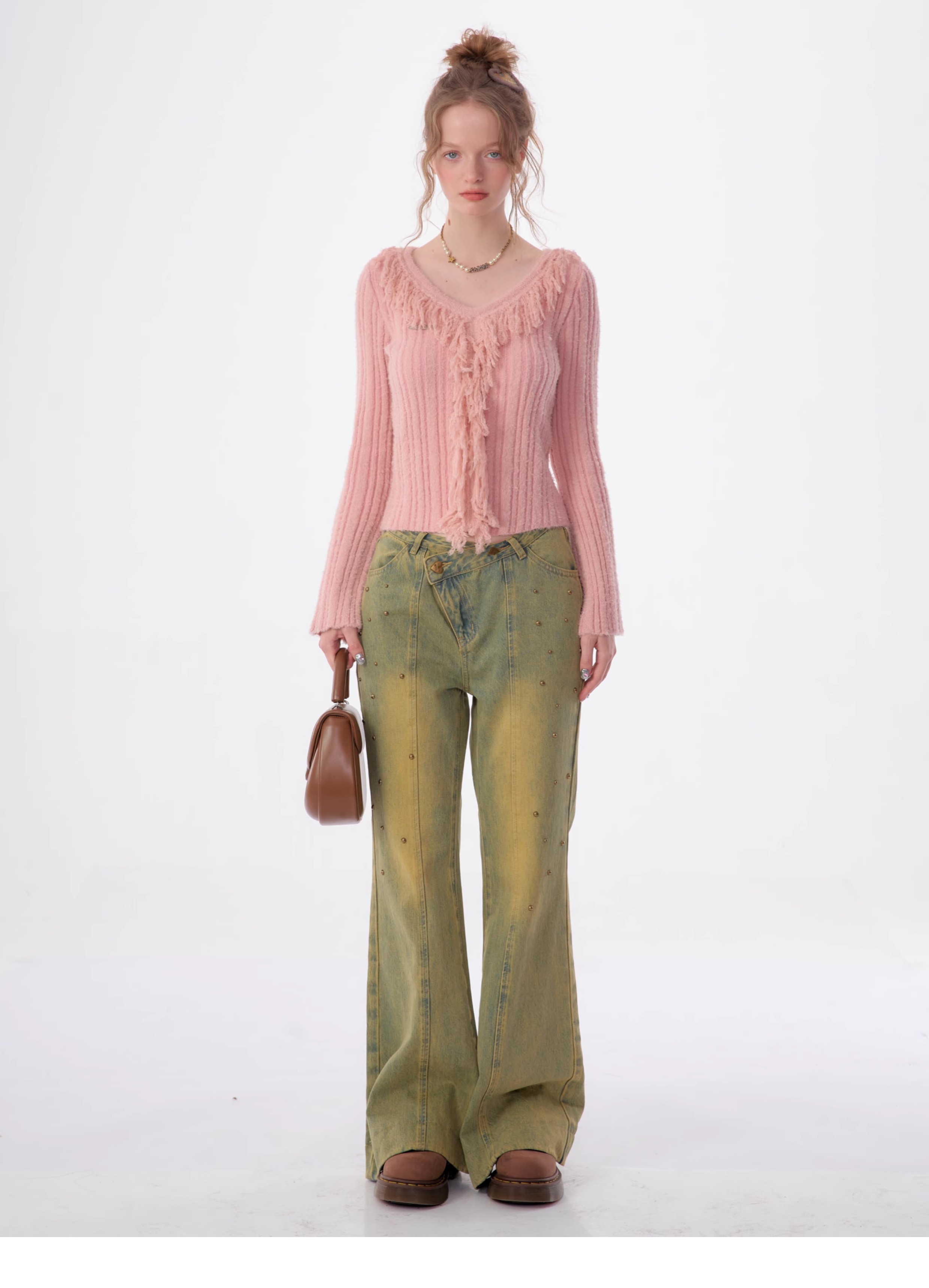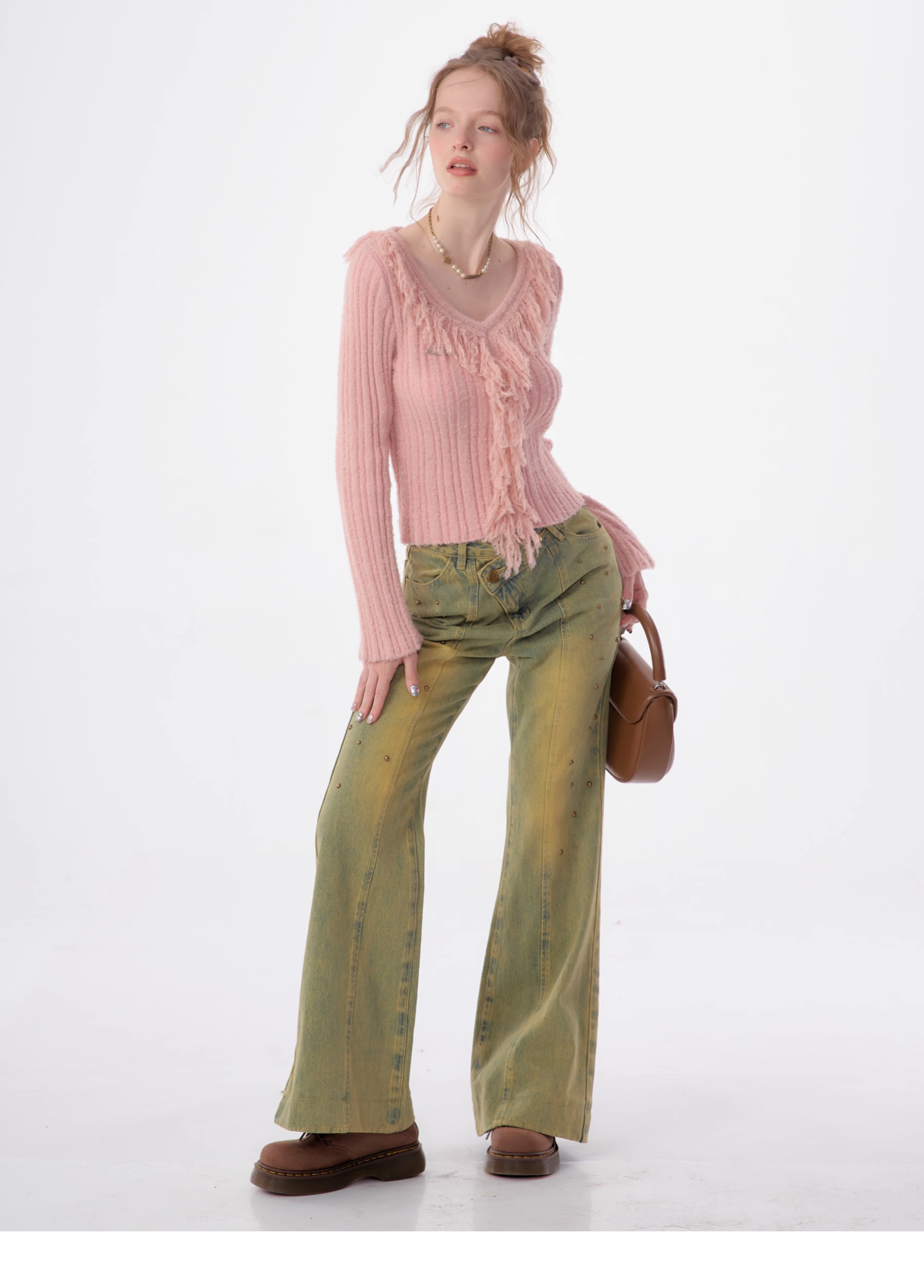 suéter con cuello en V y borlas, diseño retro entallado y cálido y suave para otoño/invierno
