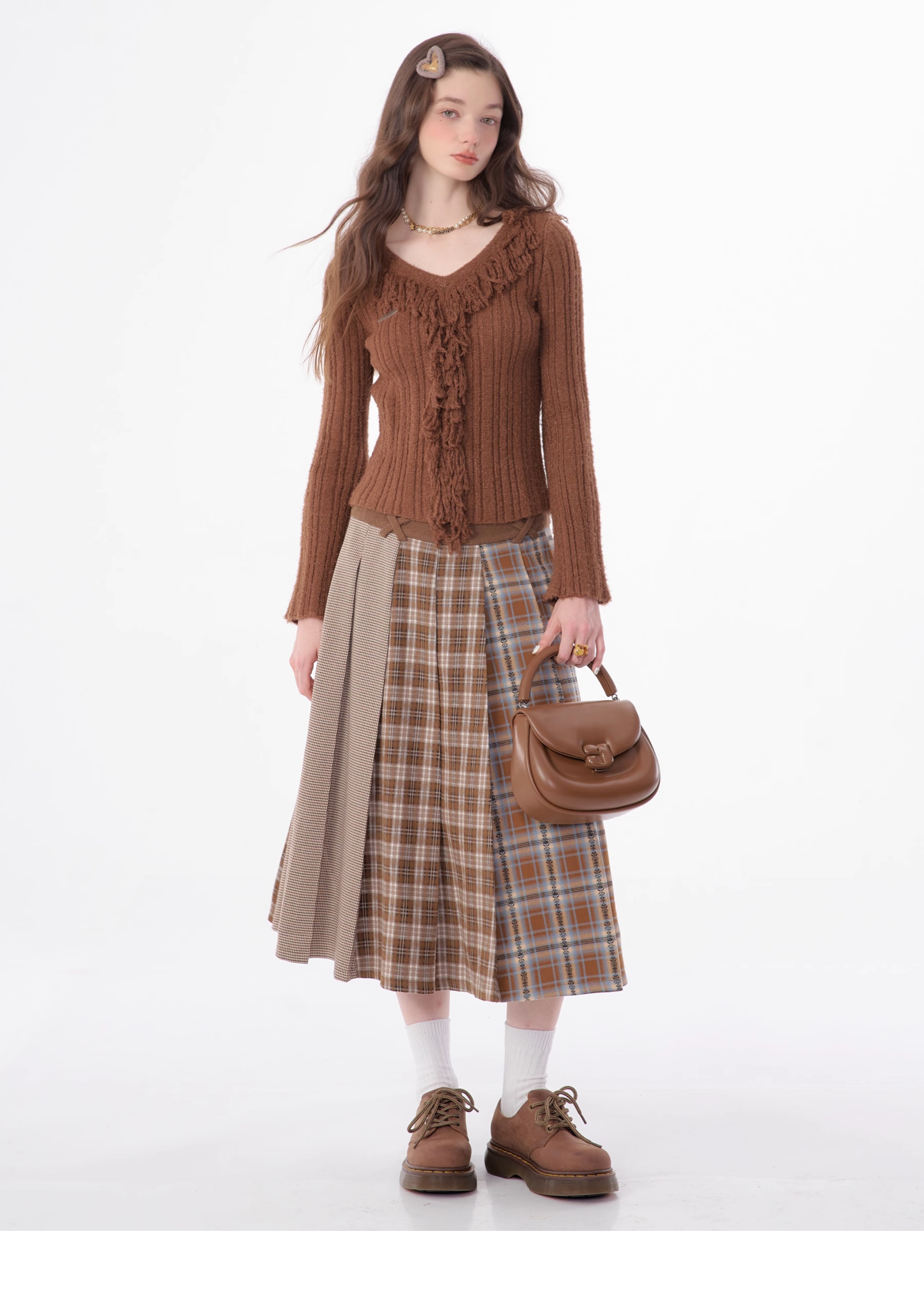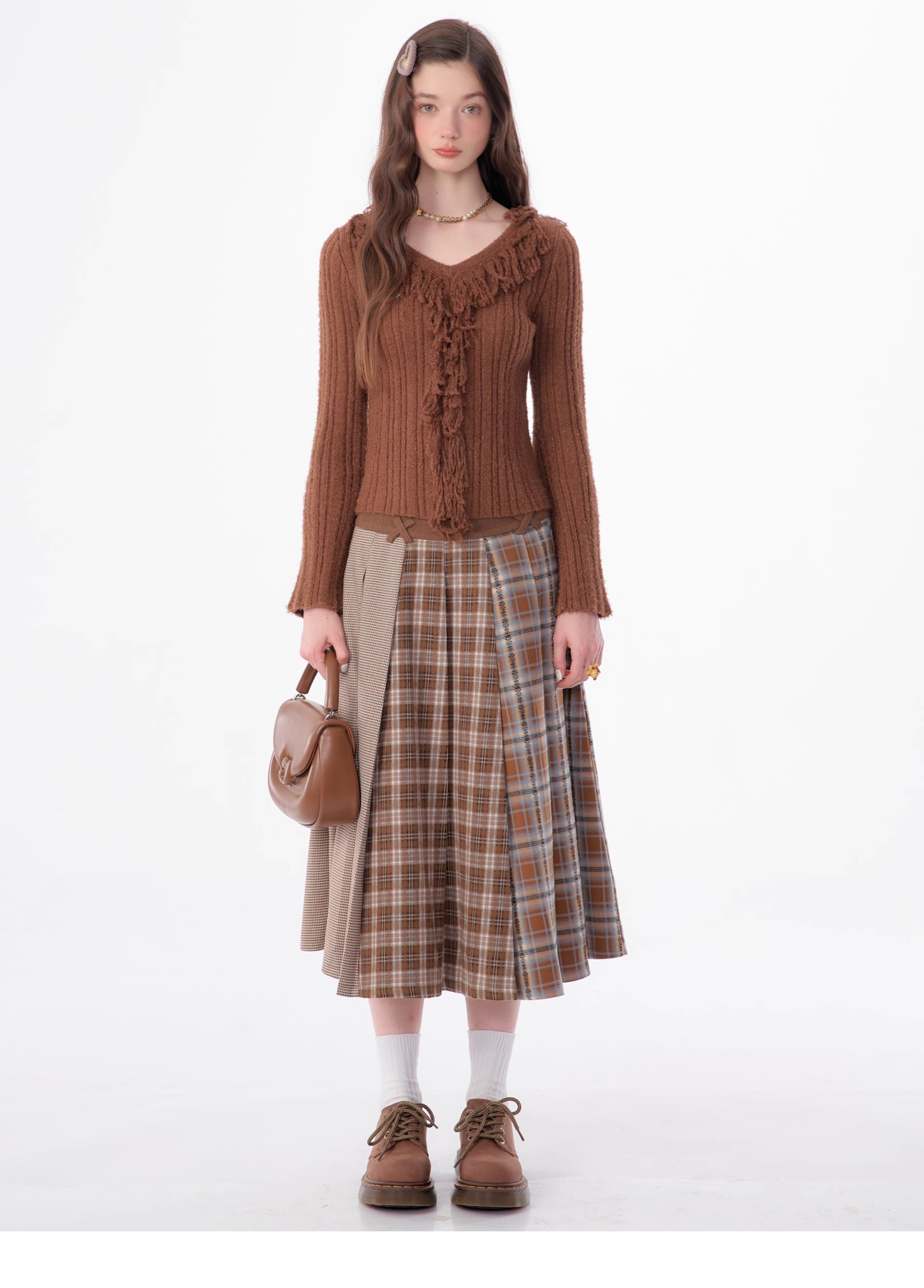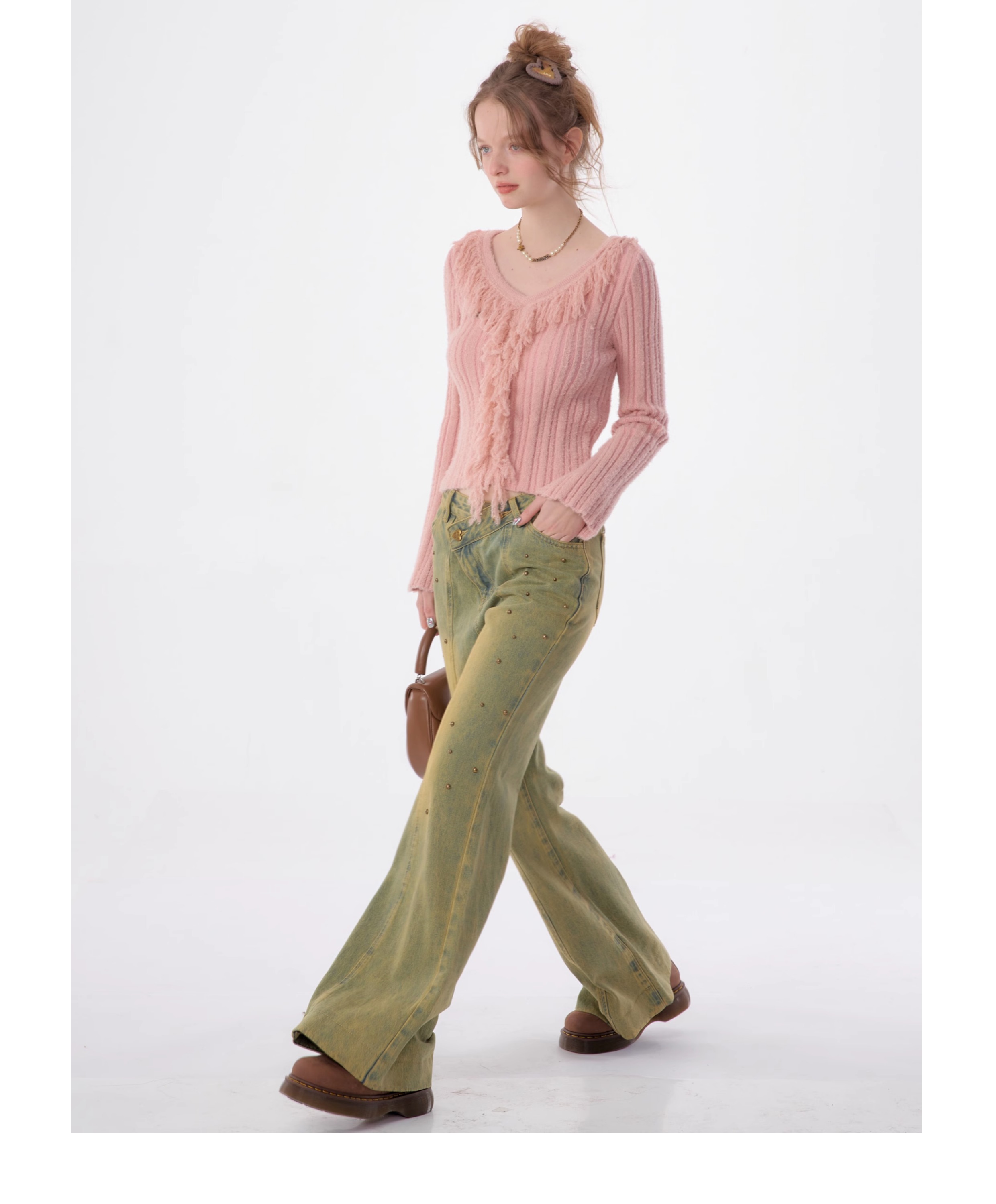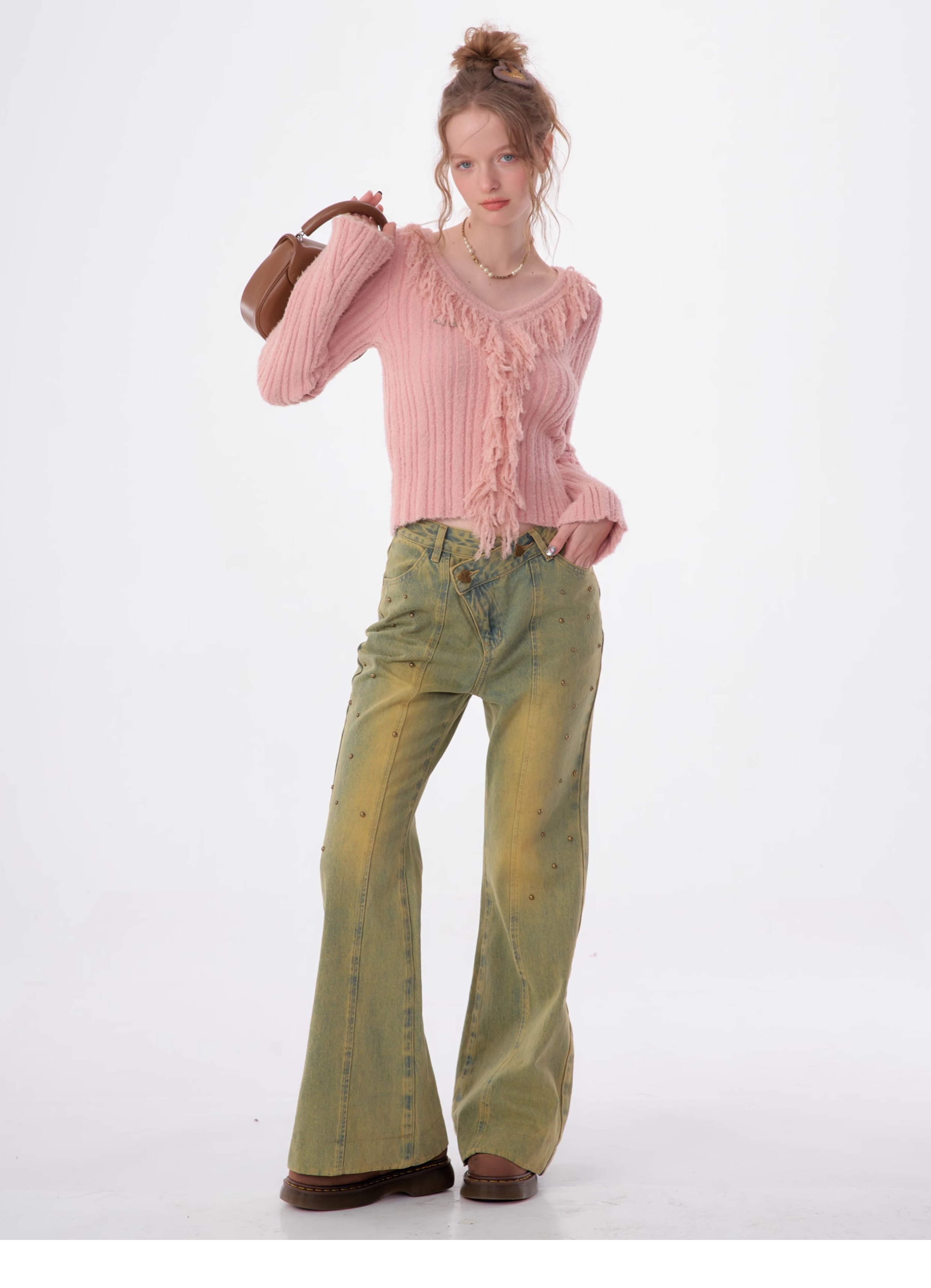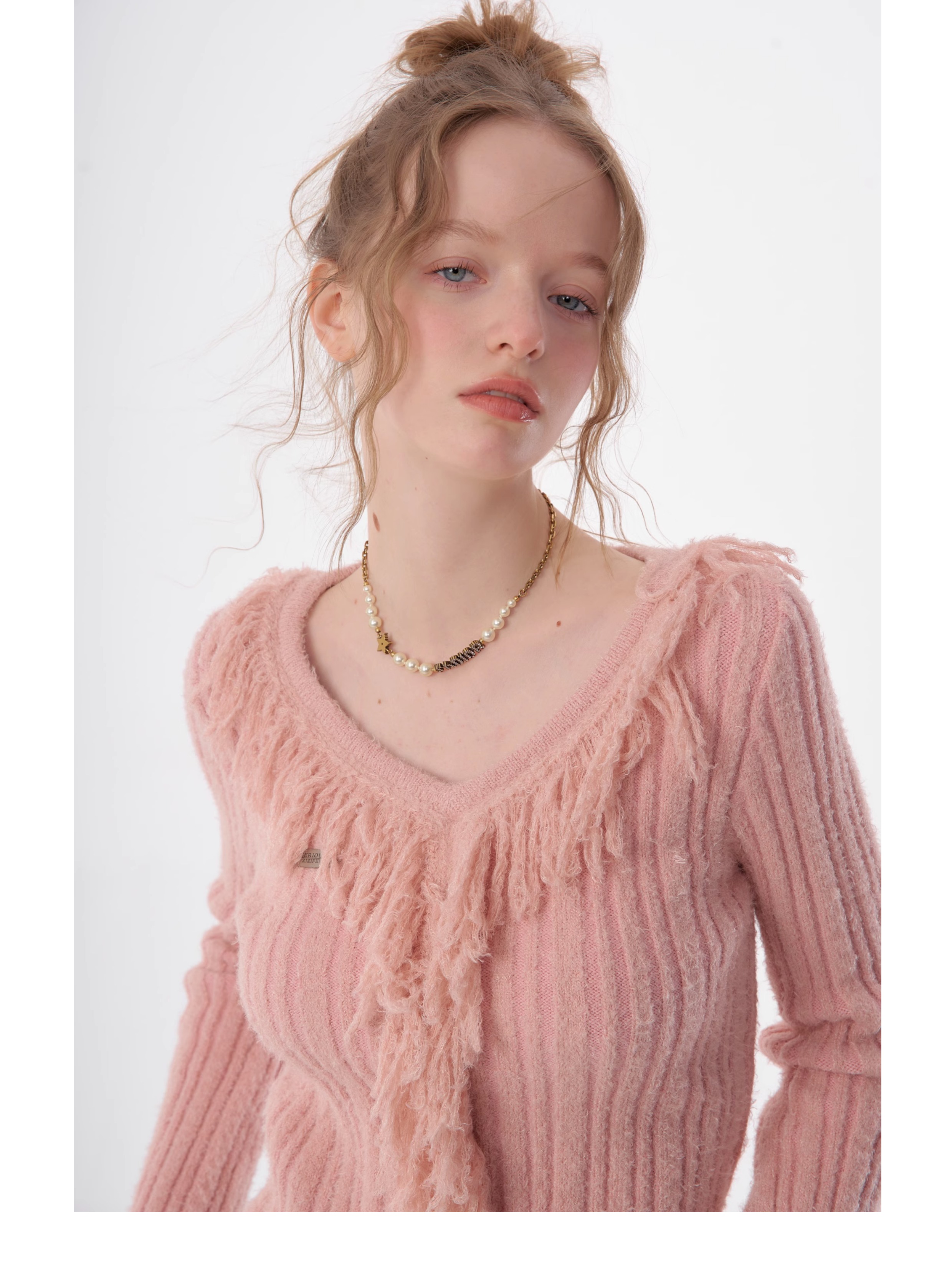 suéter con cuello en V y borlas, diseño retro entallado y cálido y suave para otoño/invierno