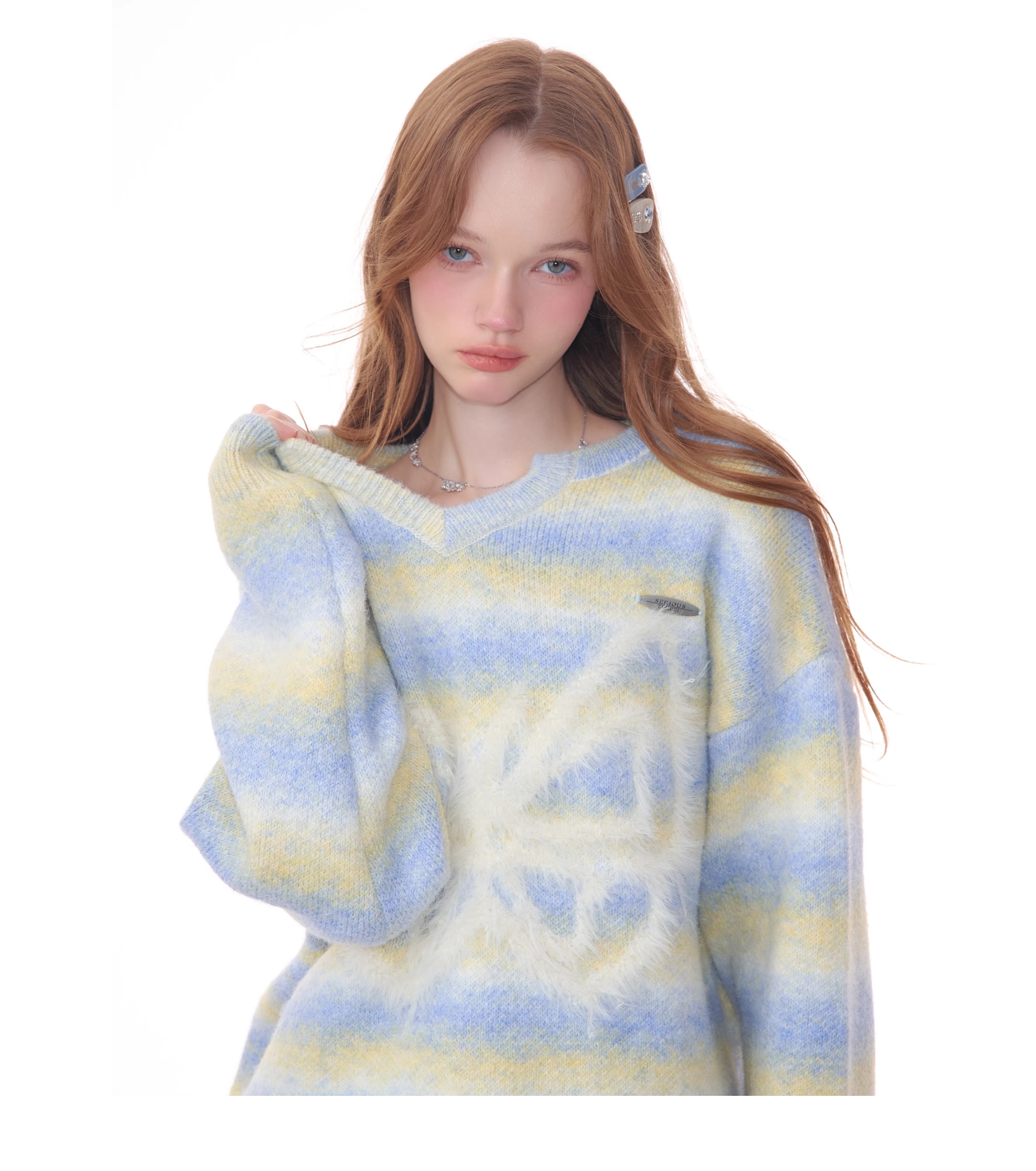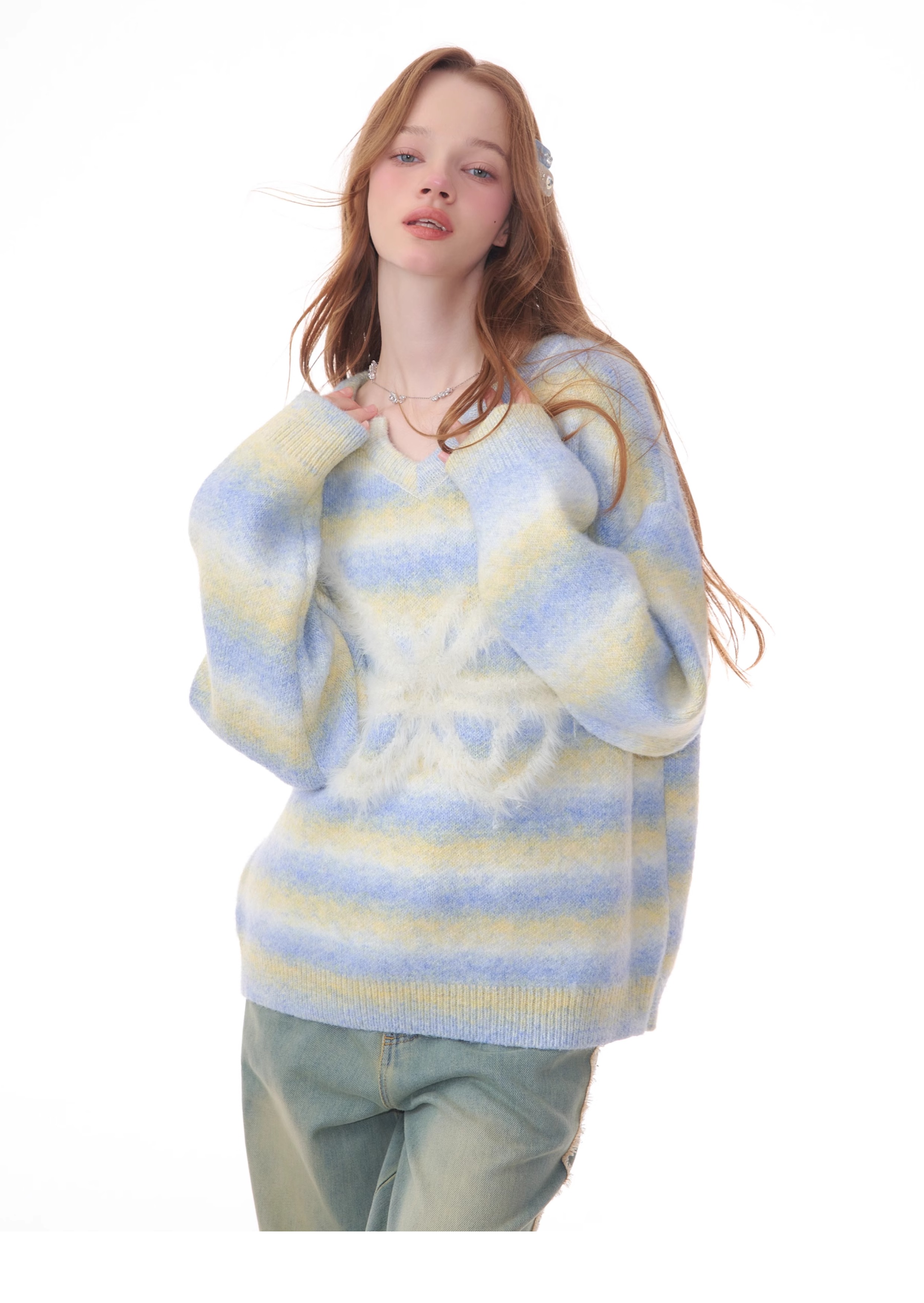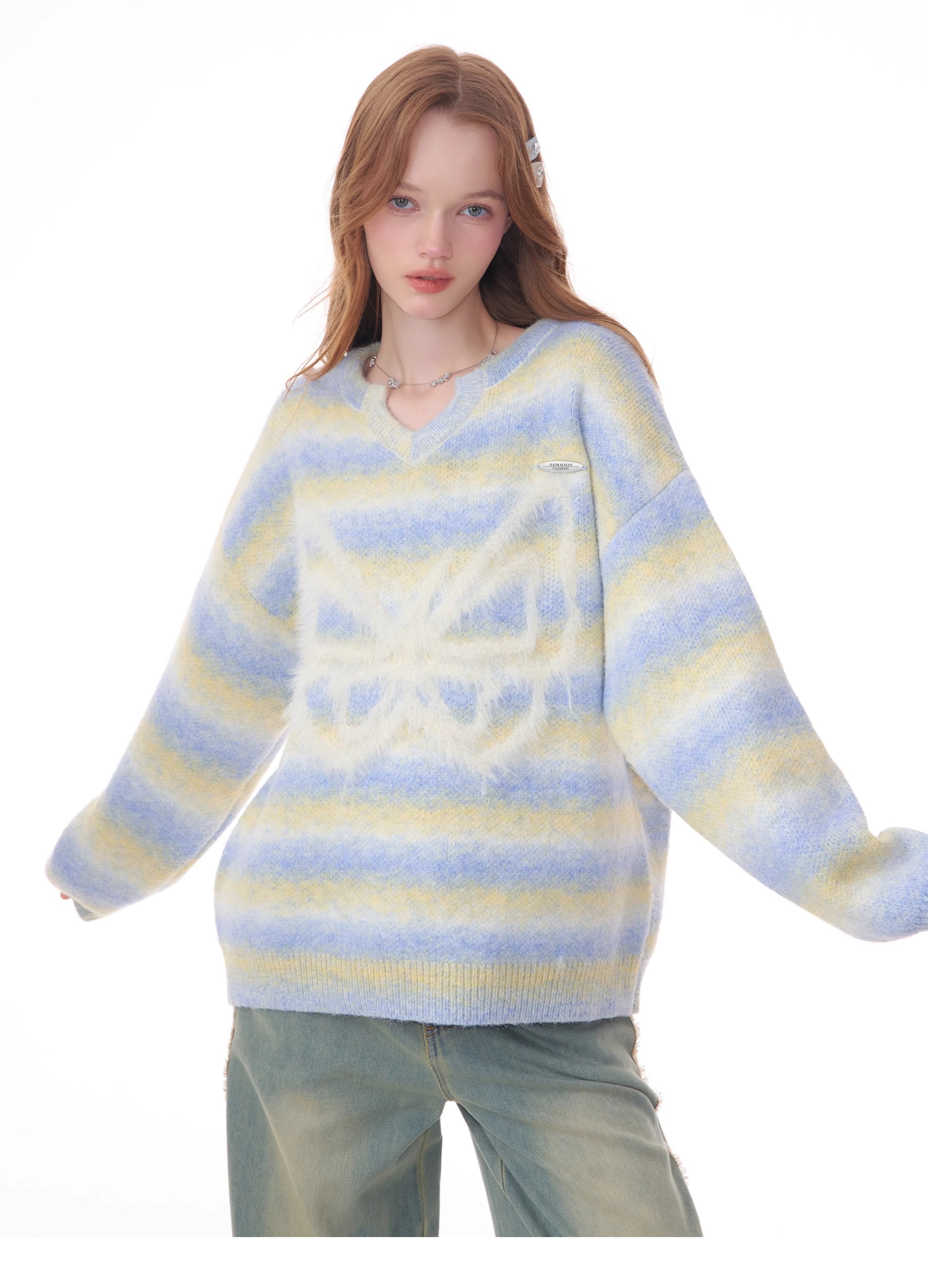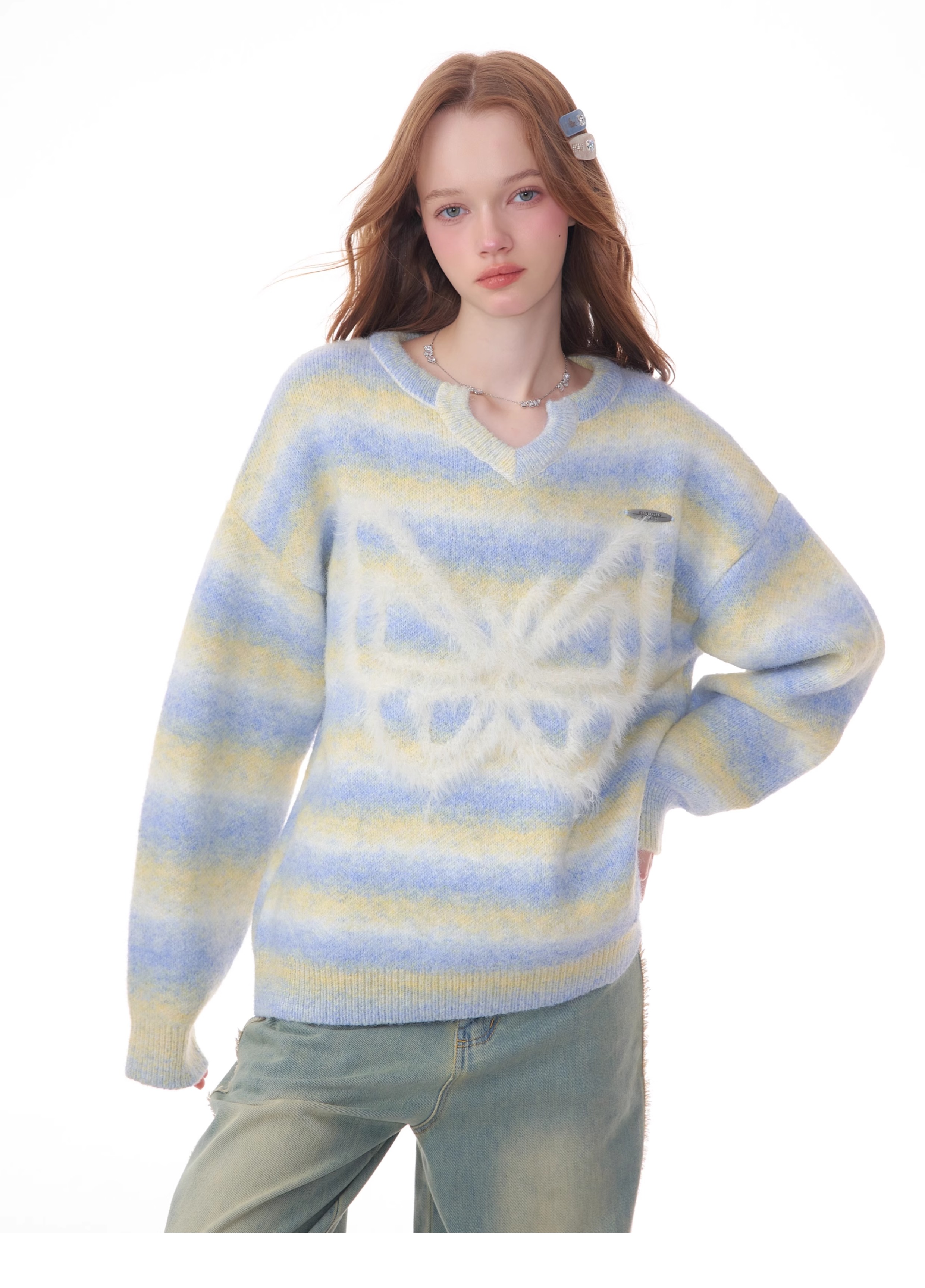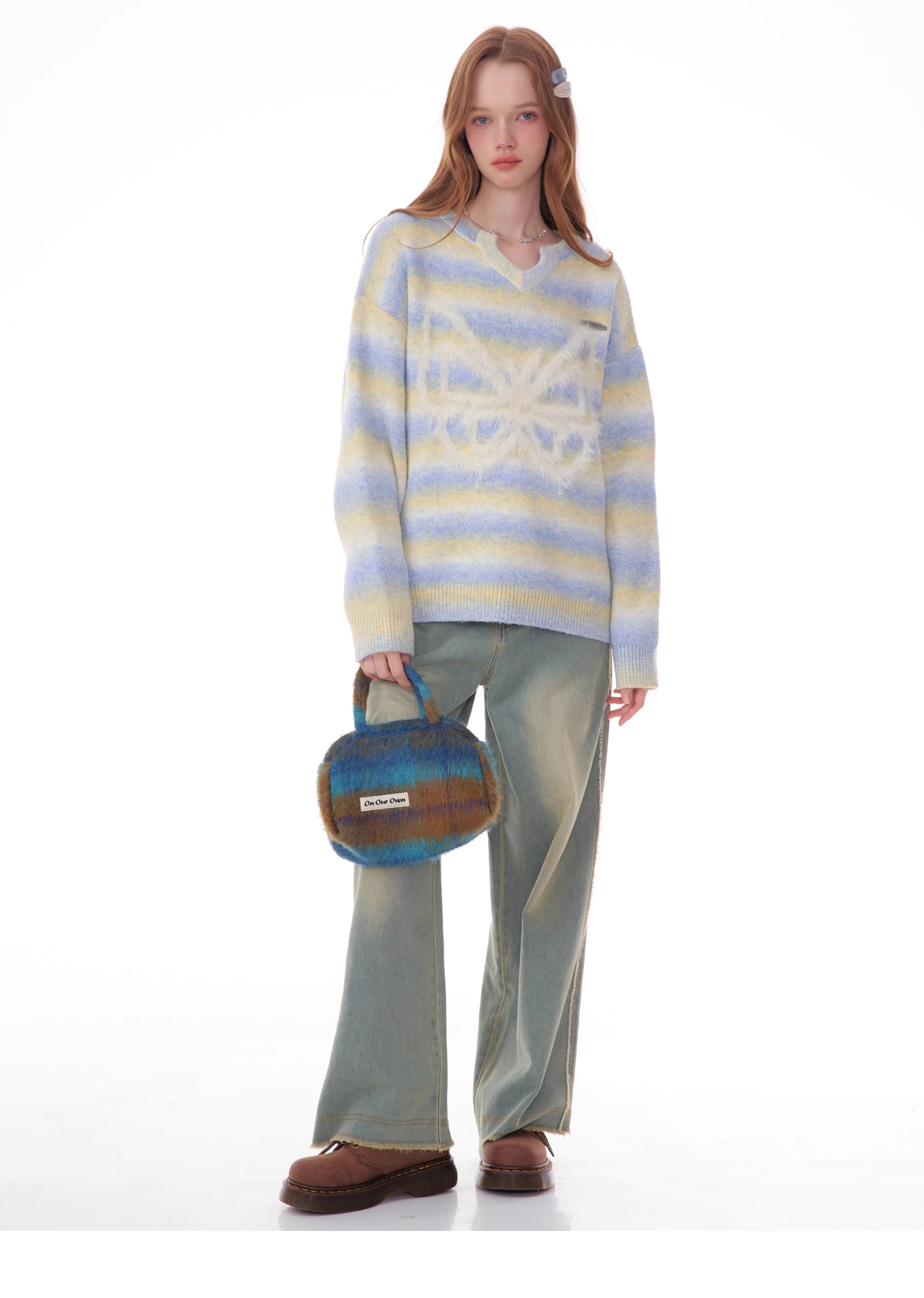 Suéter de mariposa peluda a rayas azules y amarillas, diseño retro suave y grueso para otoño/invierno