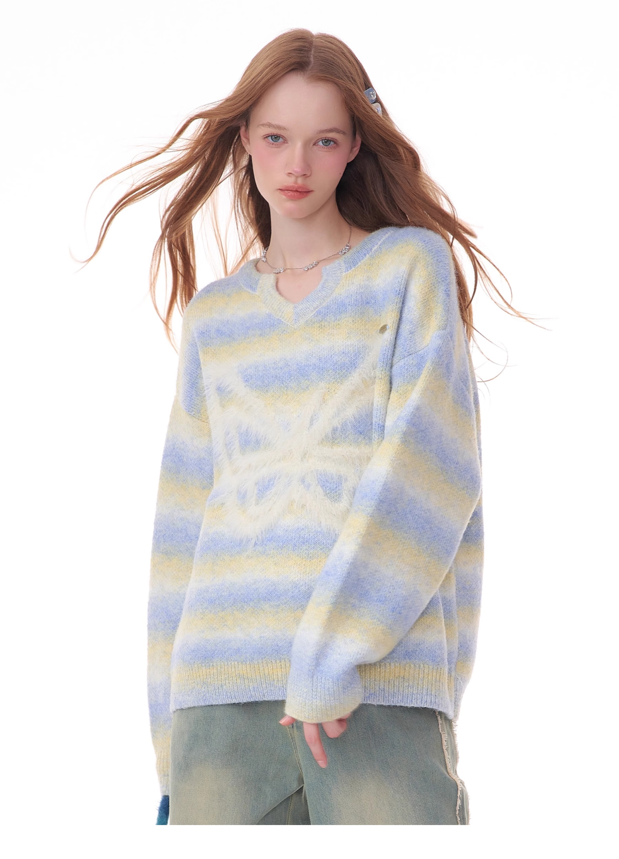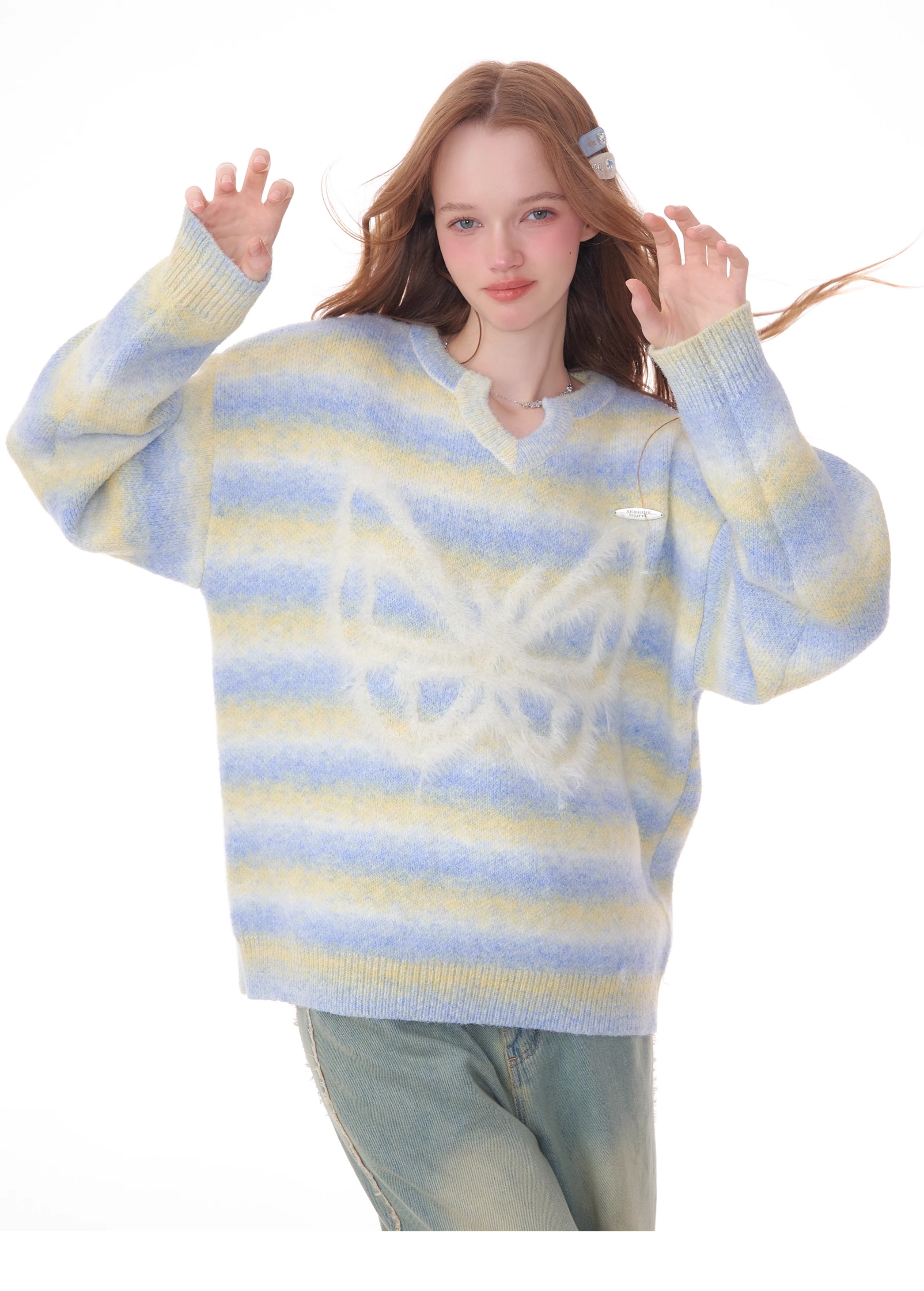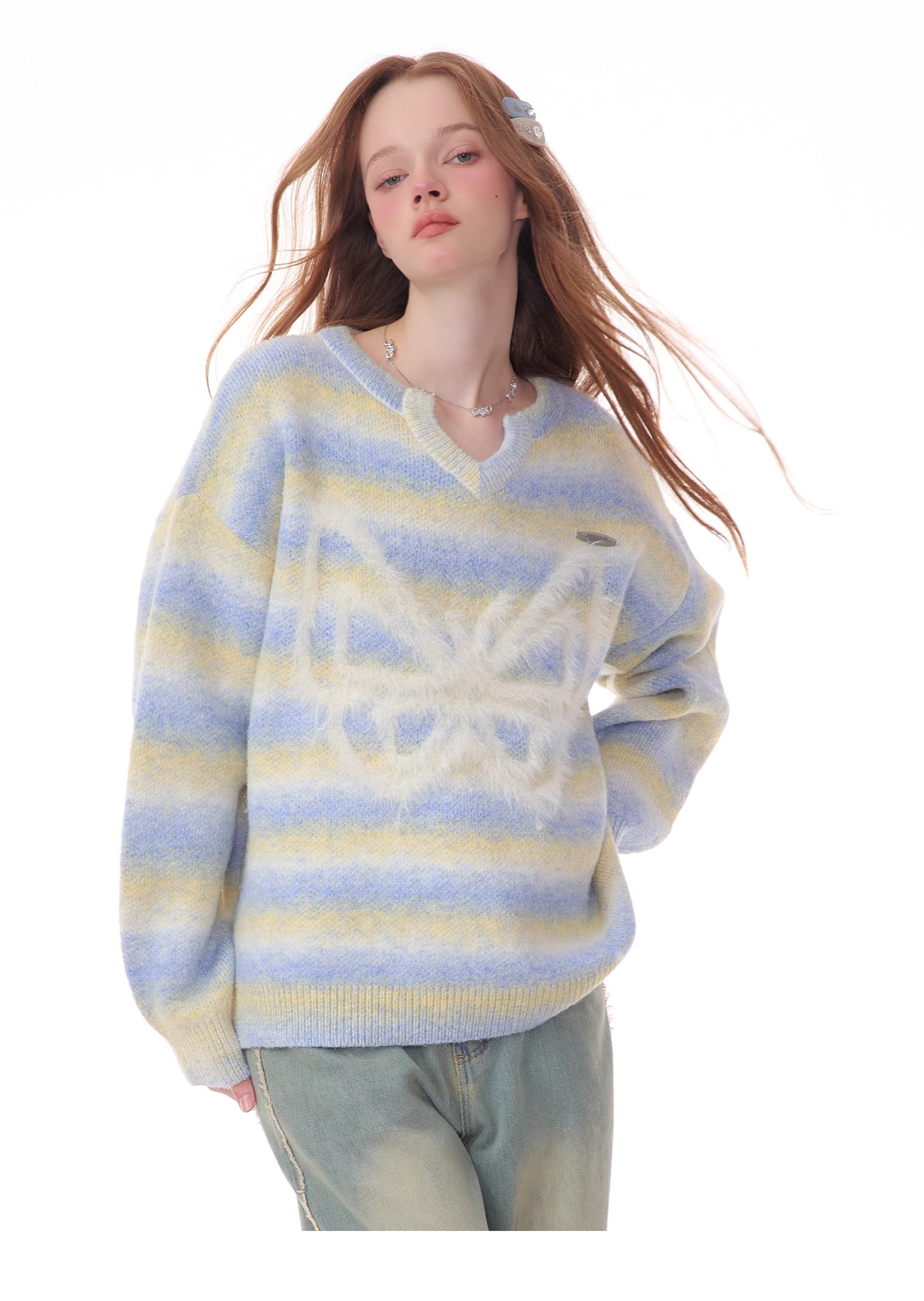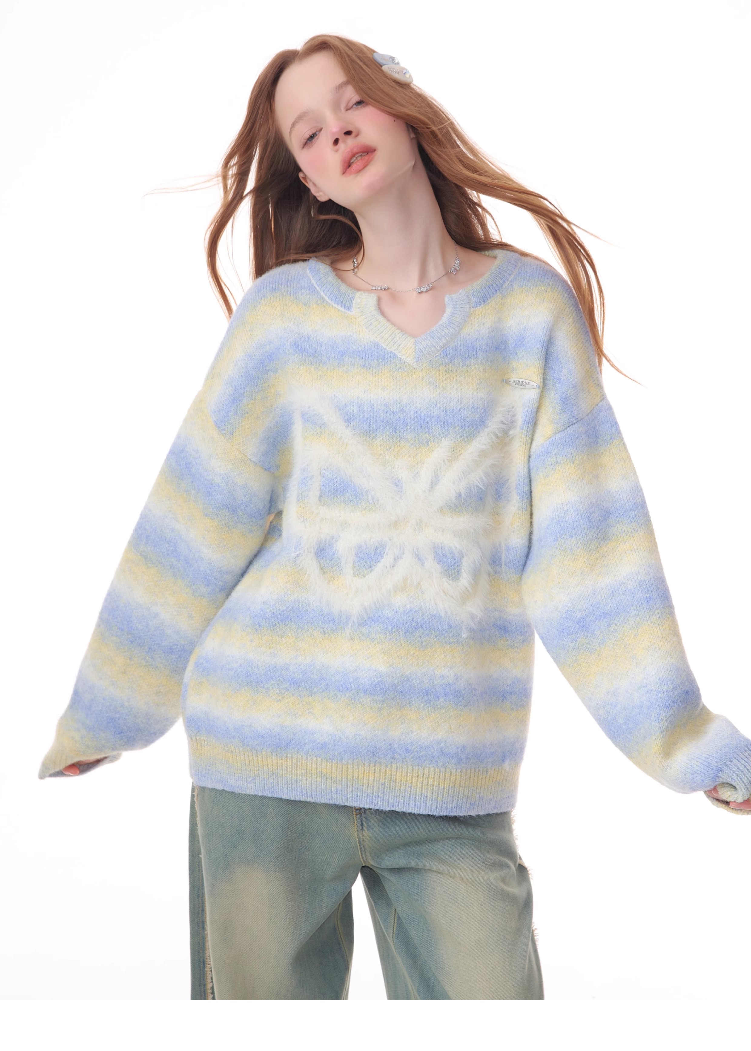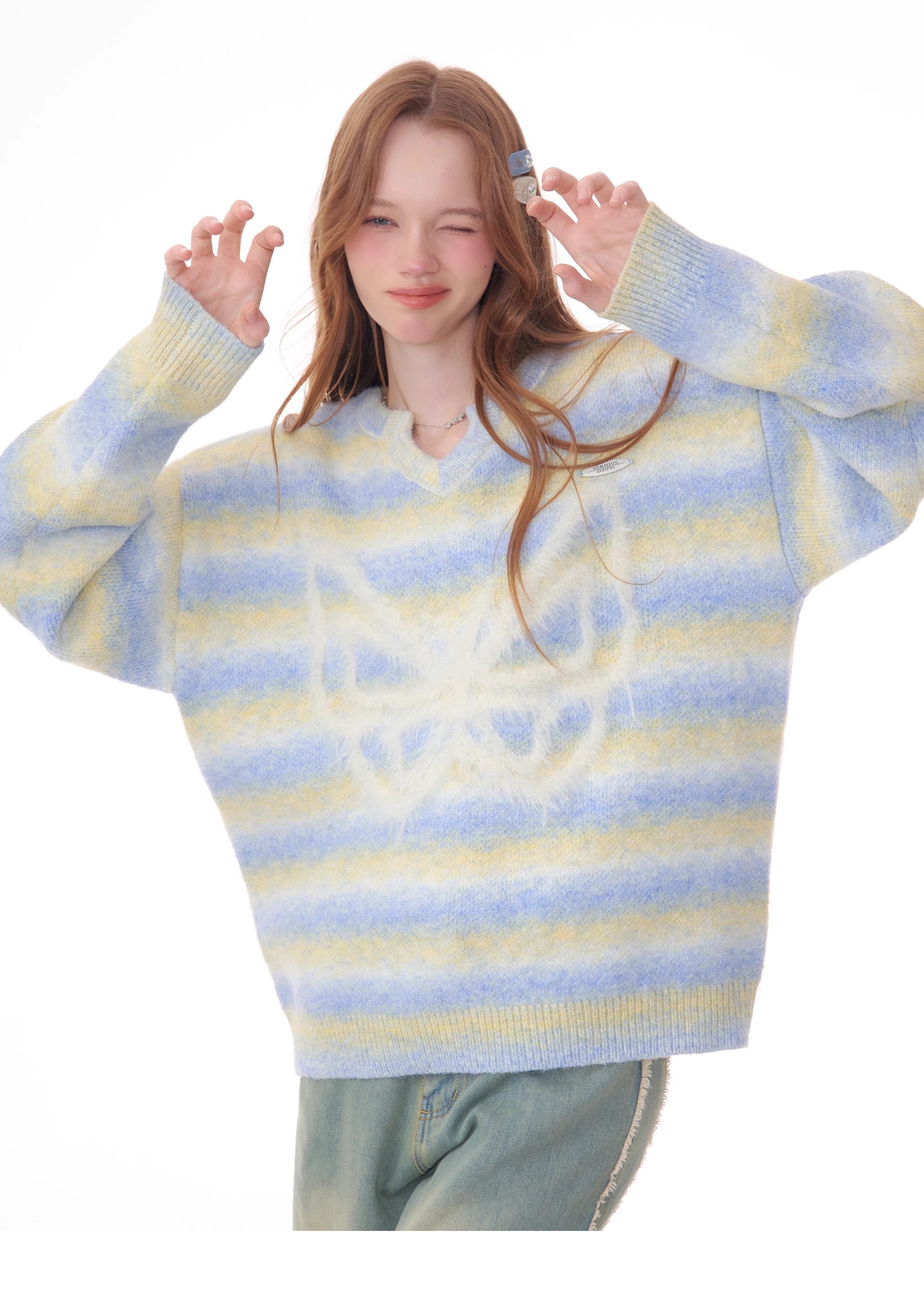 Suéter de mariposa peluda a rayas azules y amarillas, diseño retro suave y grueso para otoño/invierno