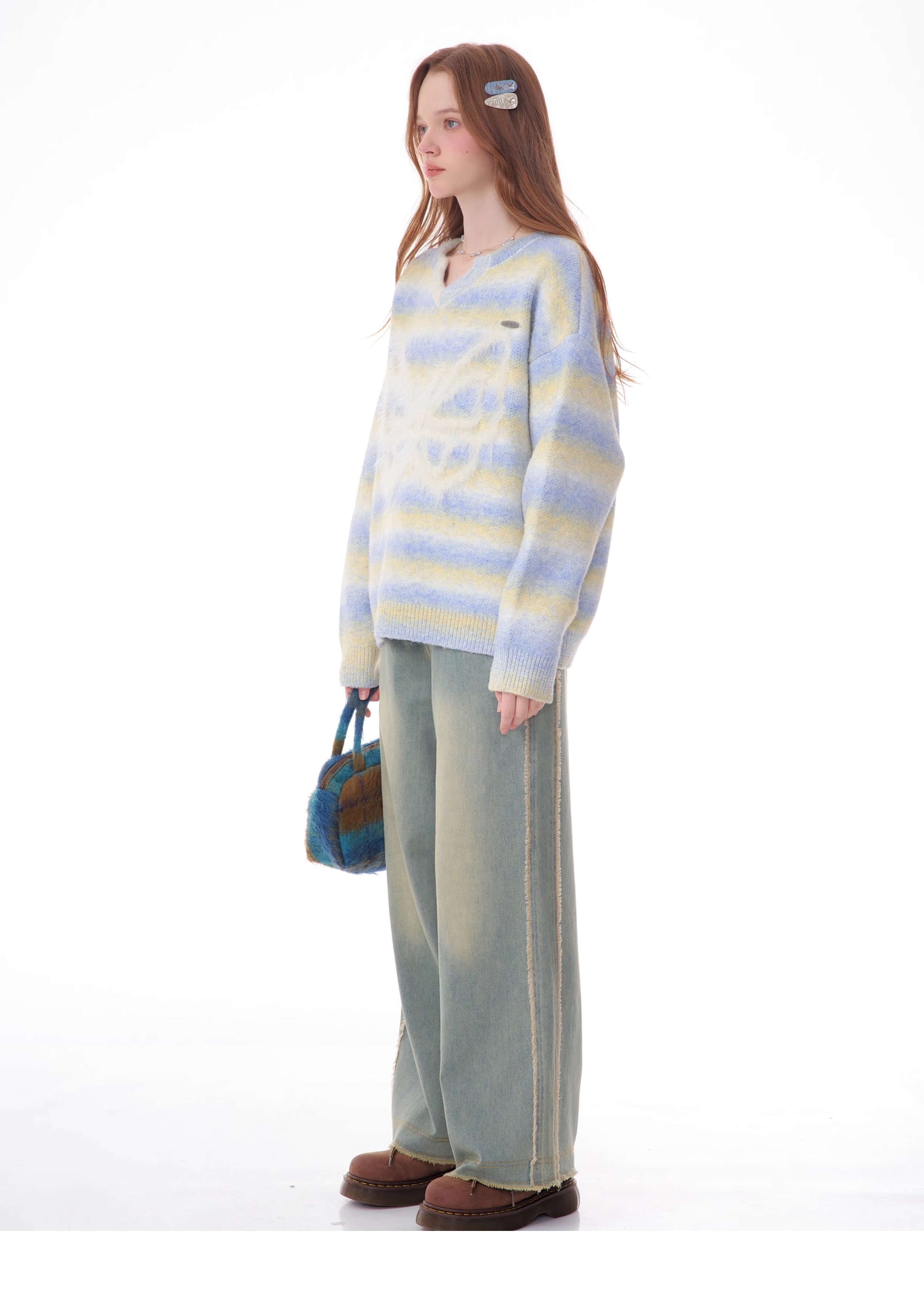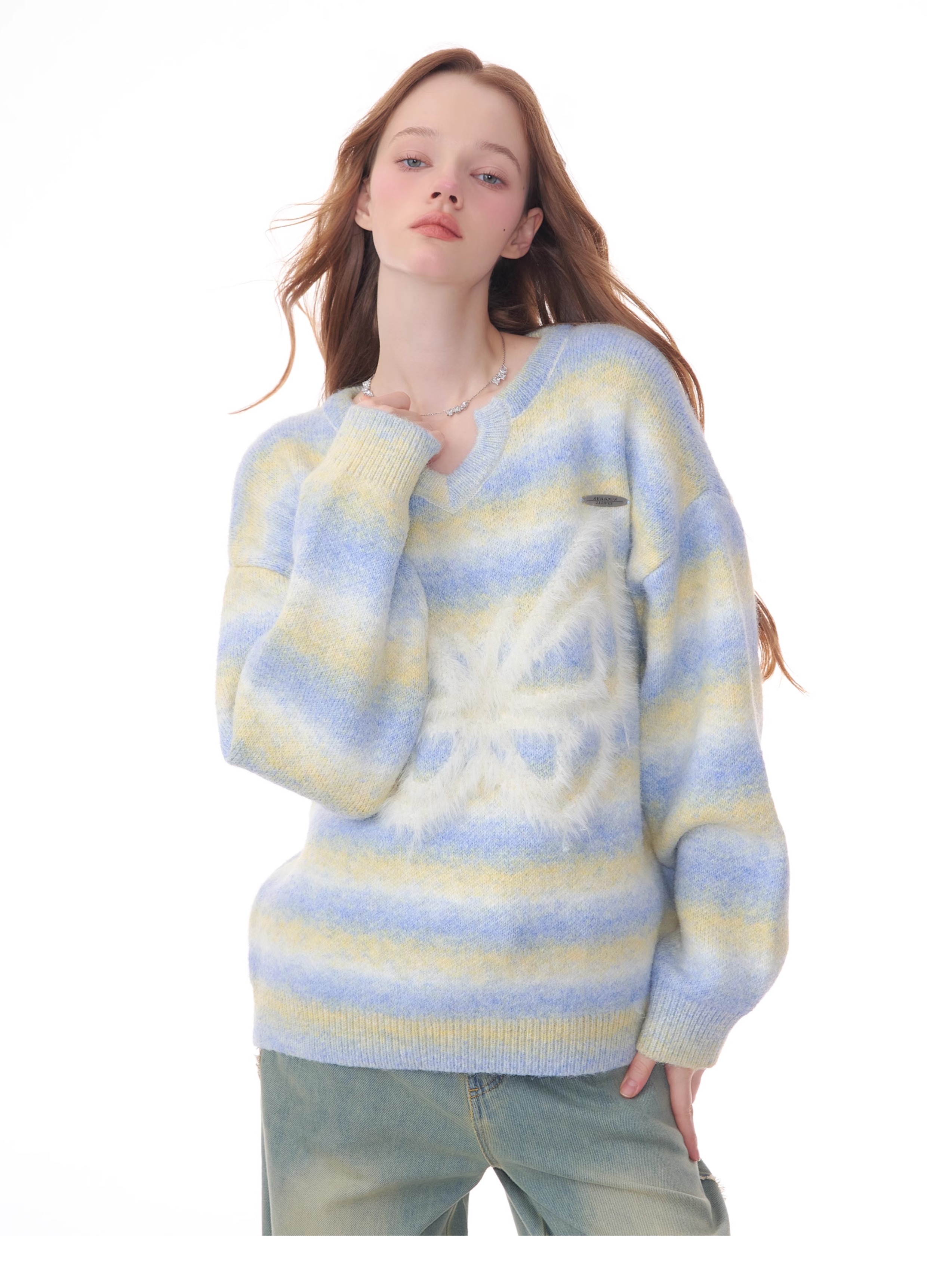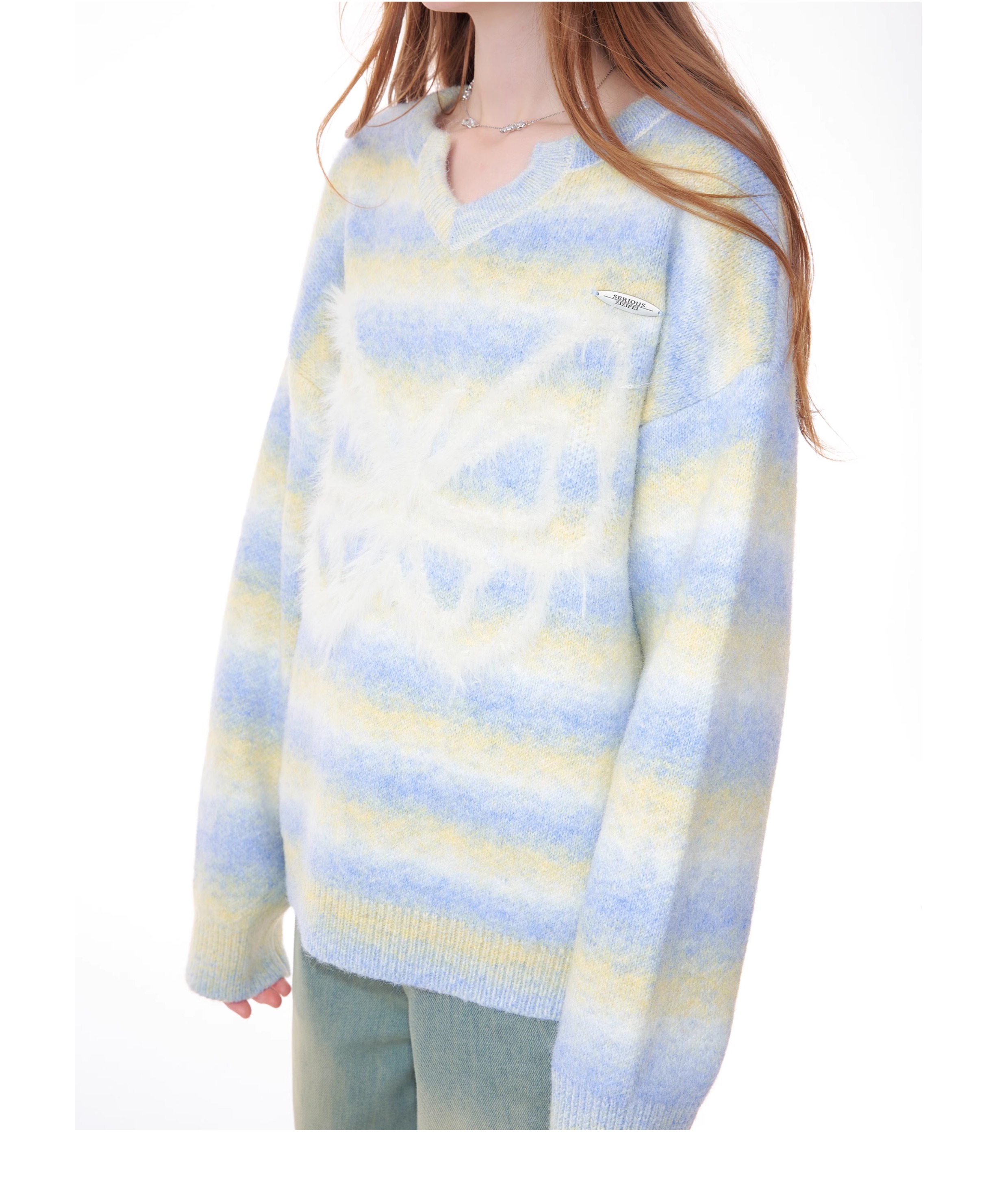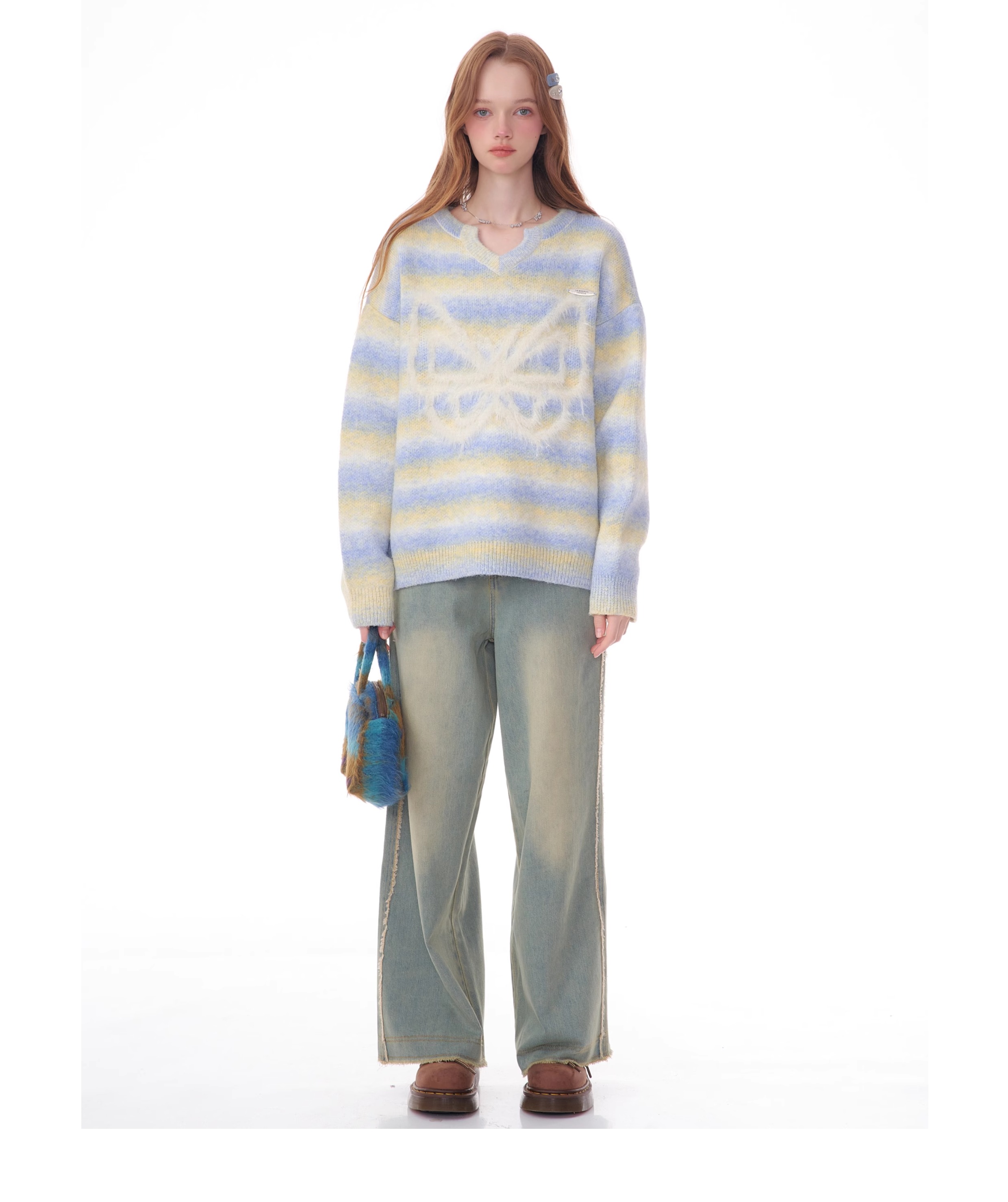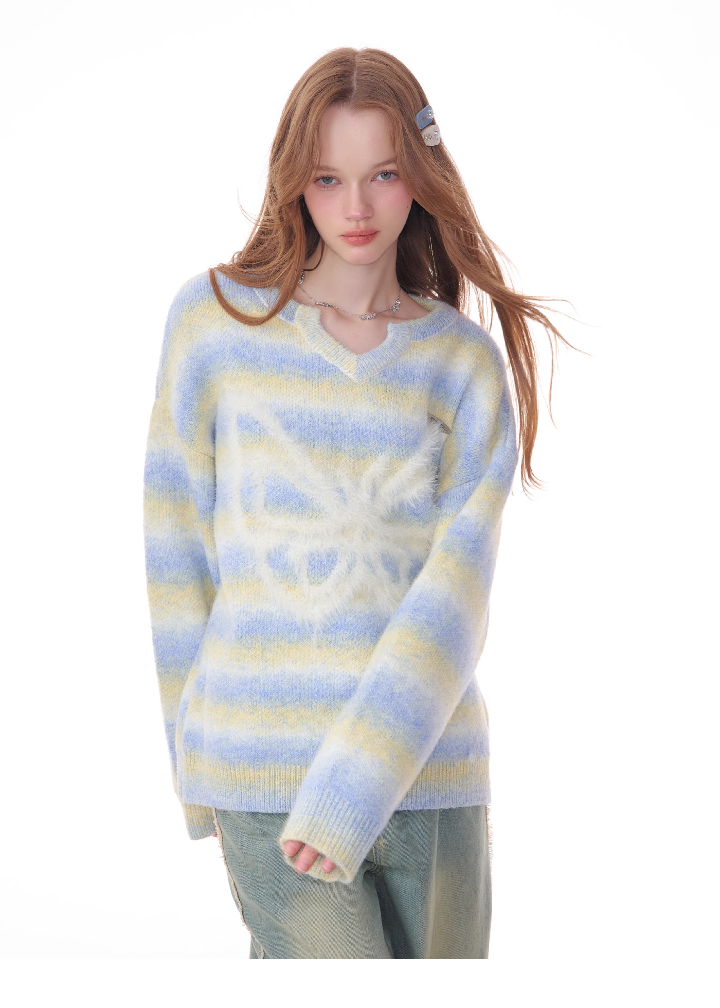 Suéter de mariposa peluda a rayas azules y amarillas, diseño retro suave y grueso para otoño/invierno