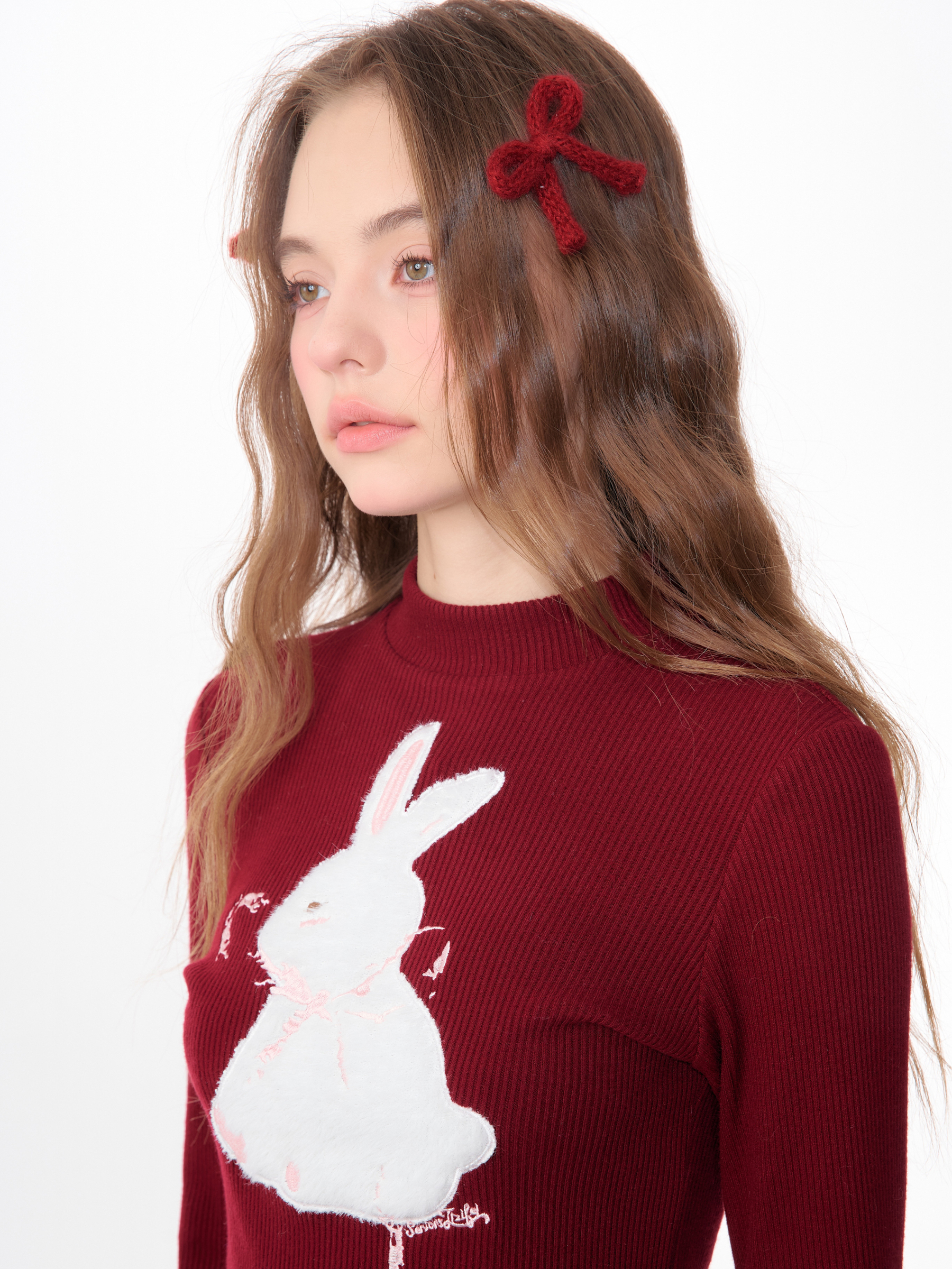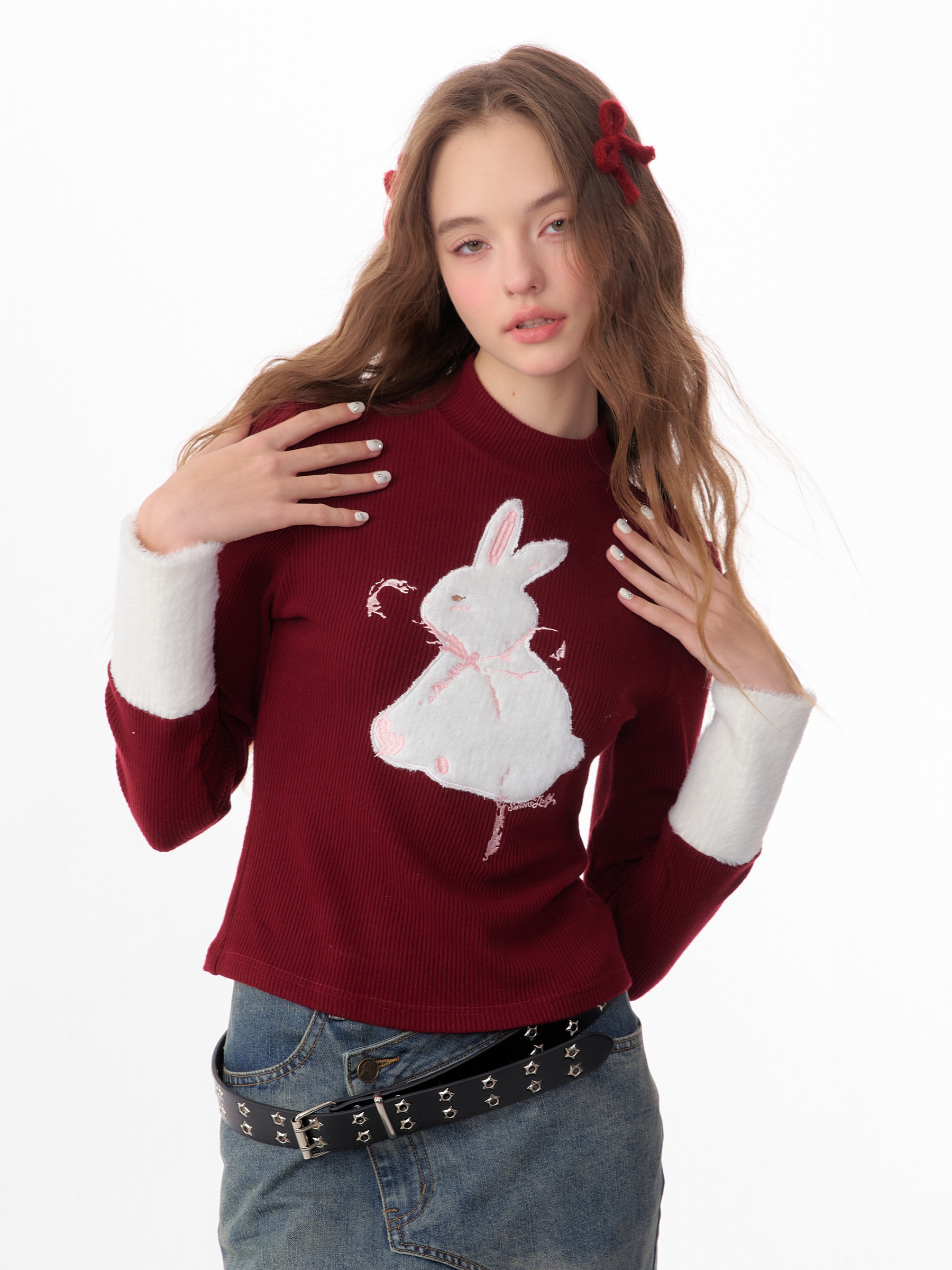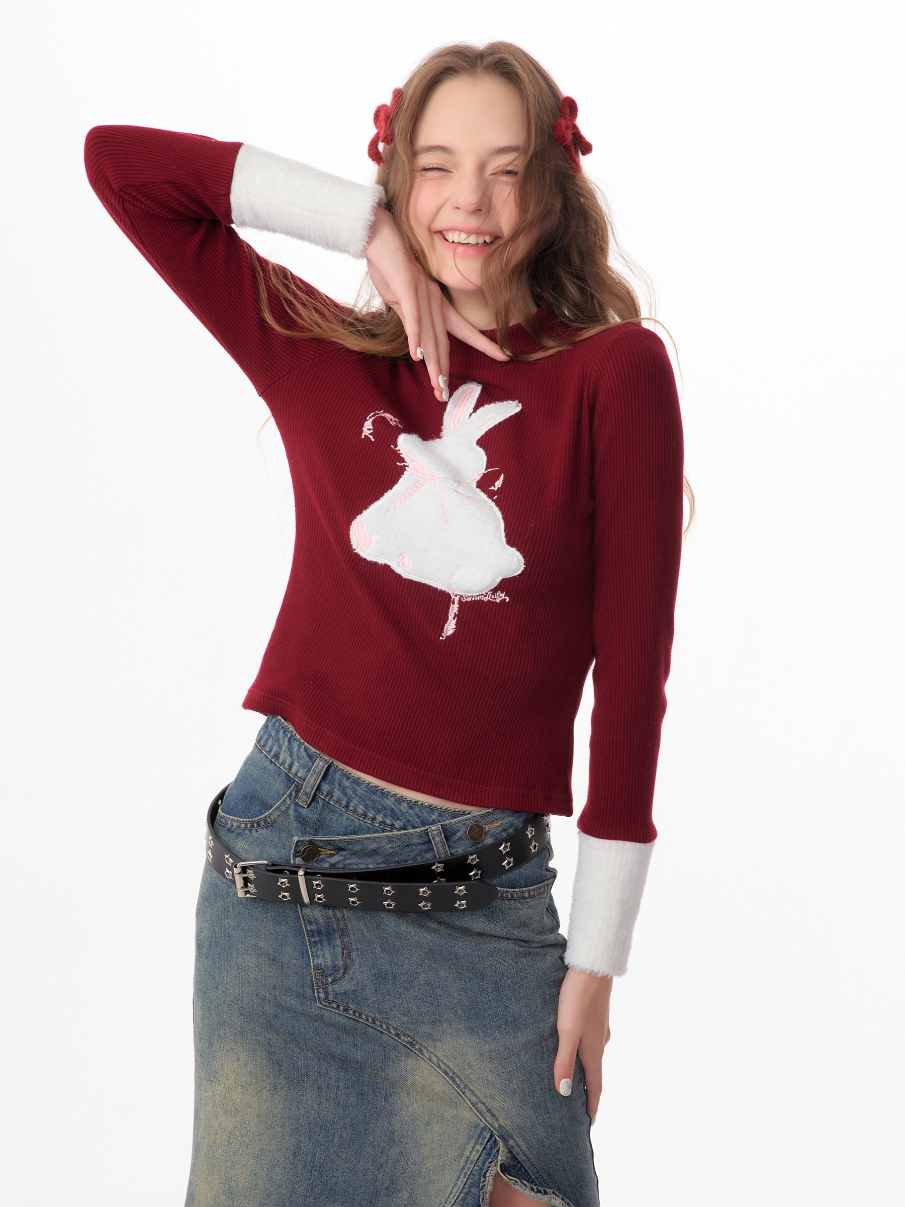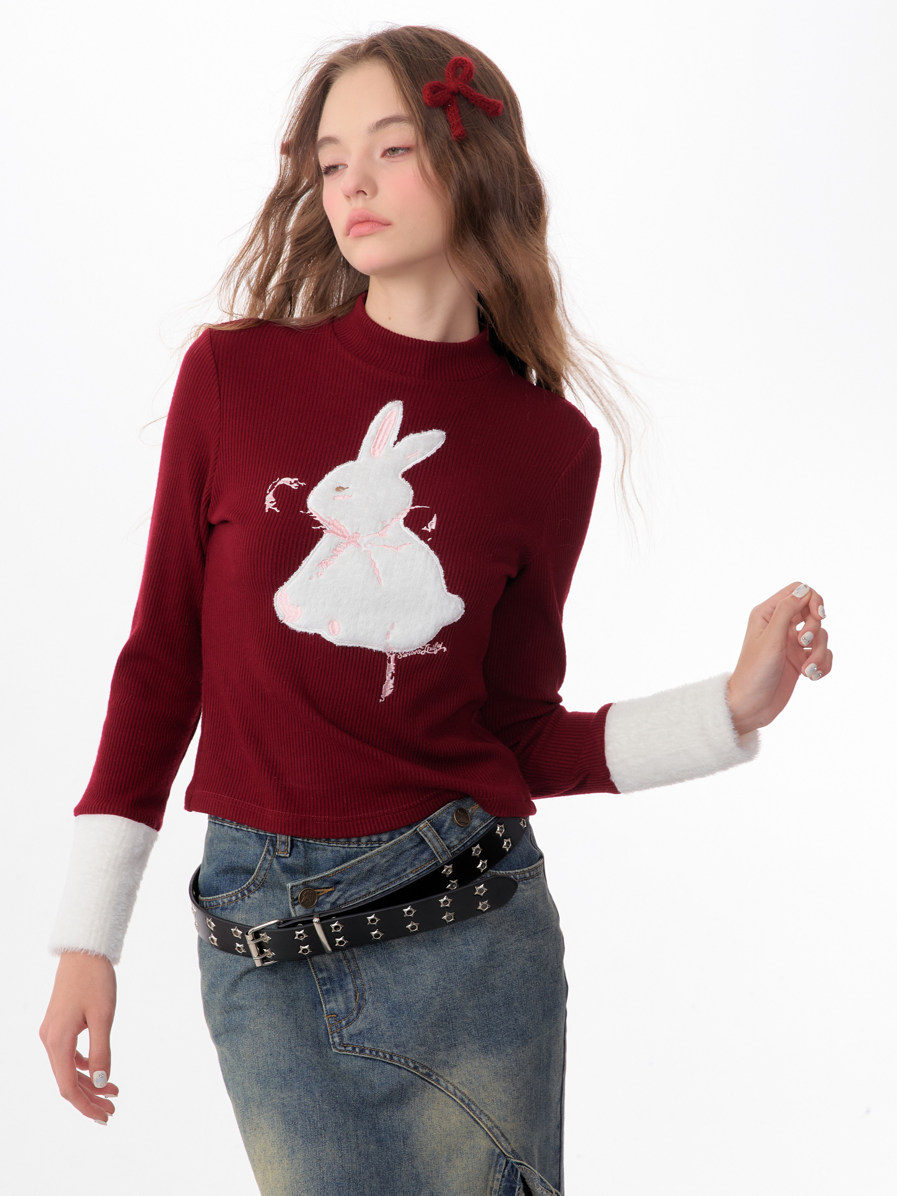 Suéter navideño de conejo de peluche | Capa base retro roja de Año Nuevo para otoño/invierno