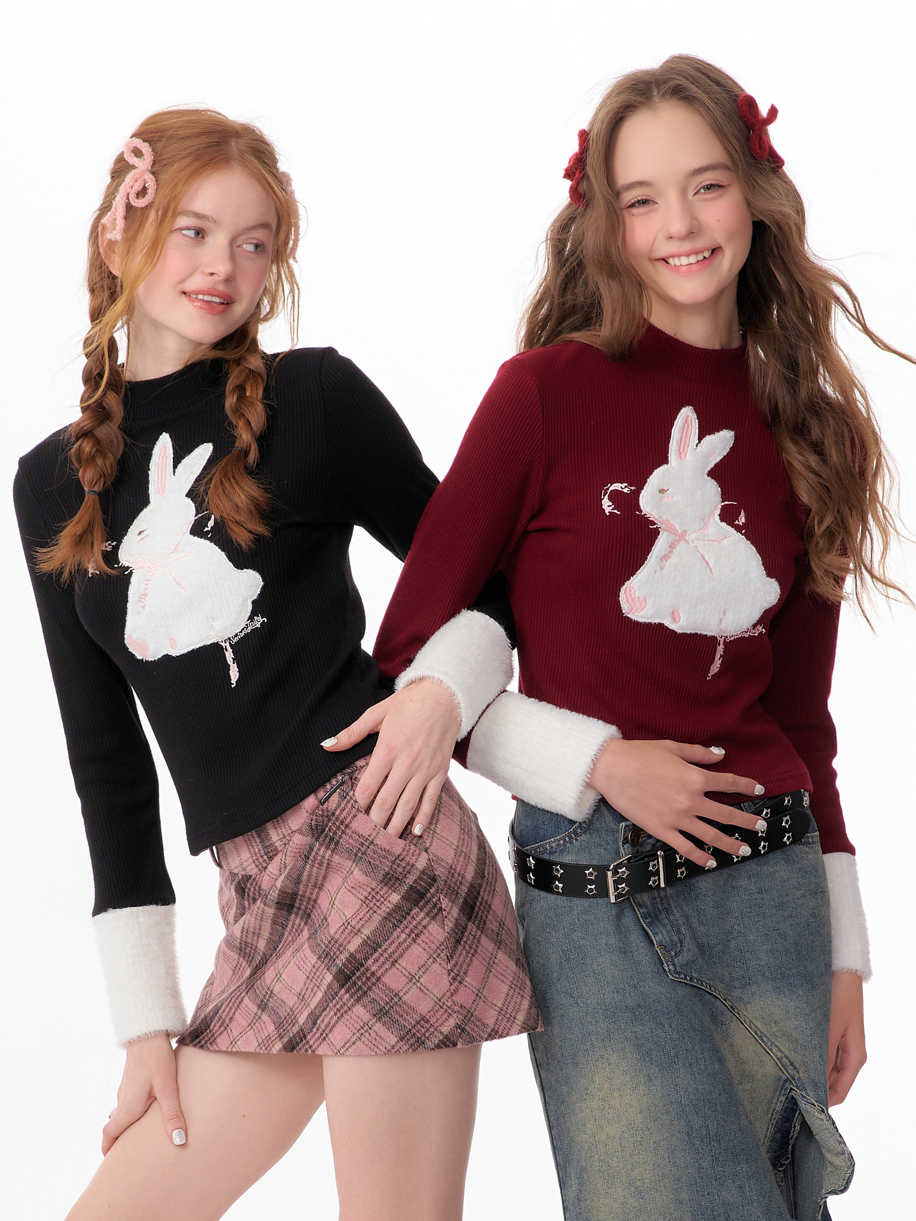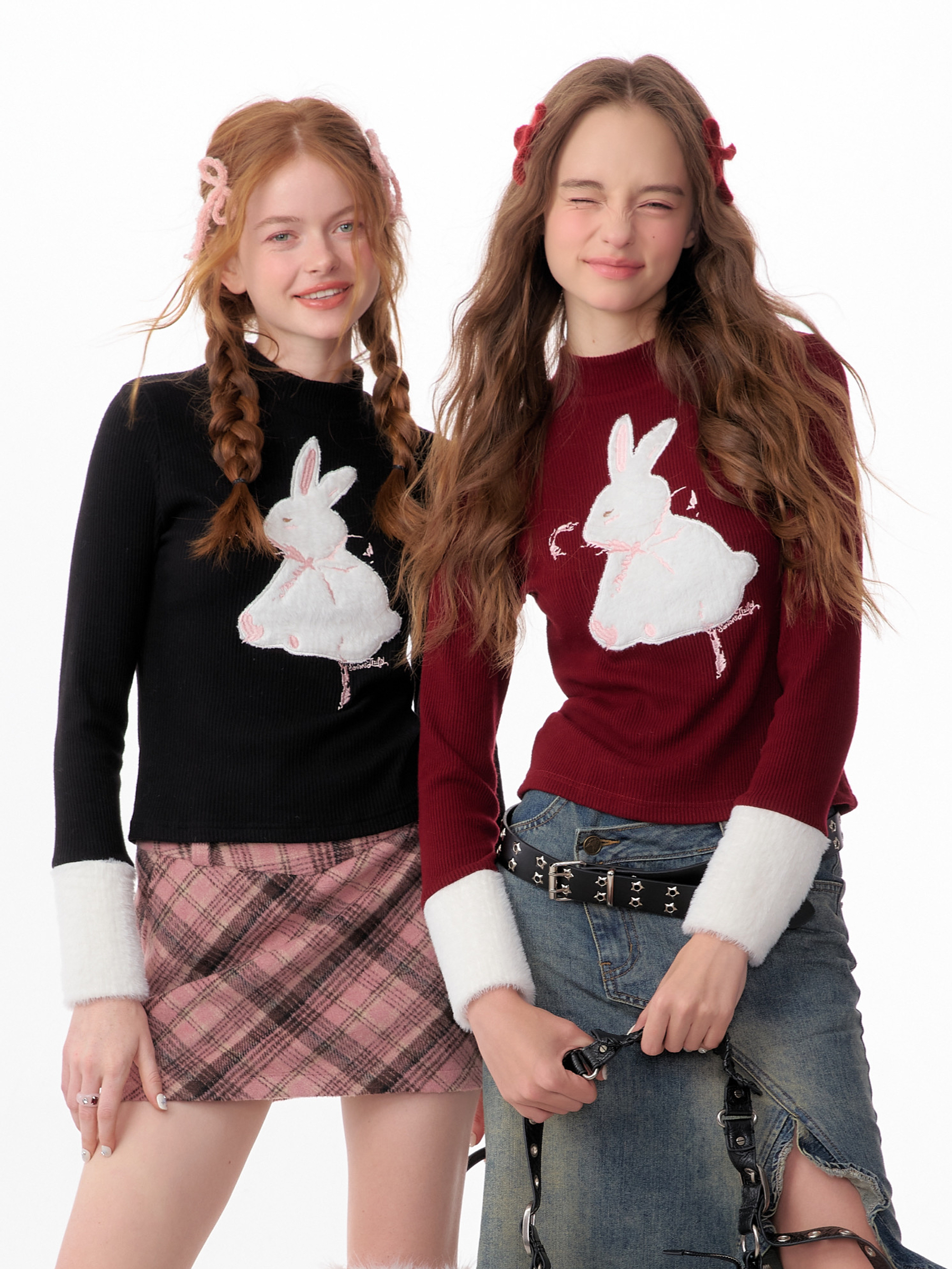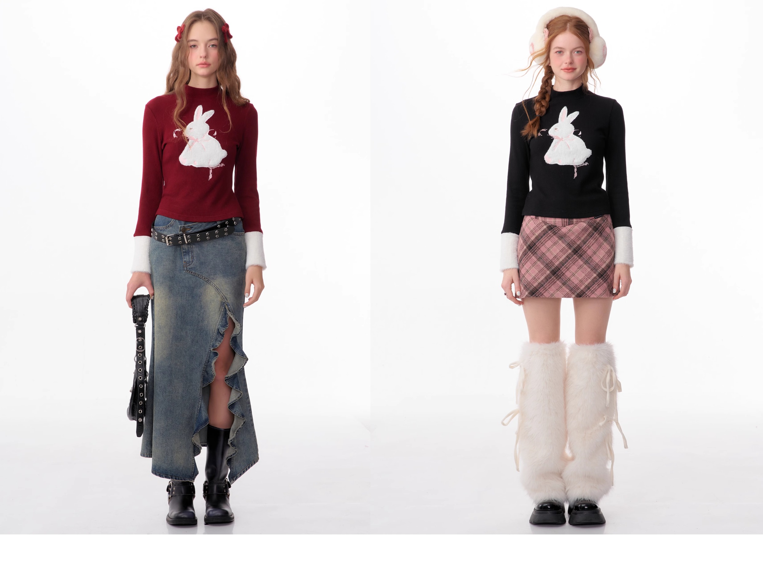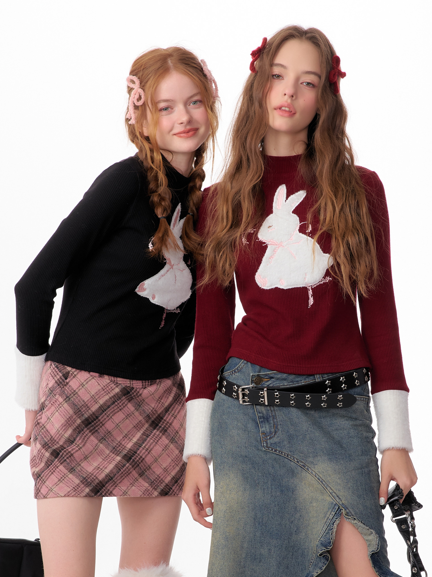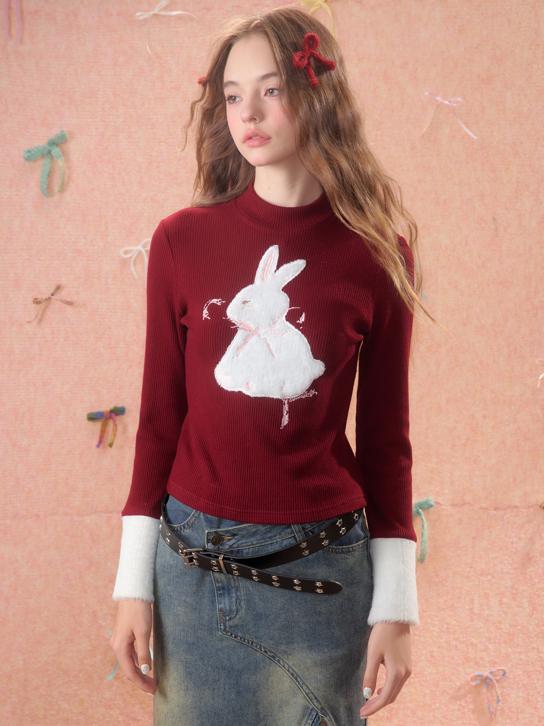 Suéter navideño de conejo de peluche | Capa base retro roja de Año Nuevo para otoño/invierno