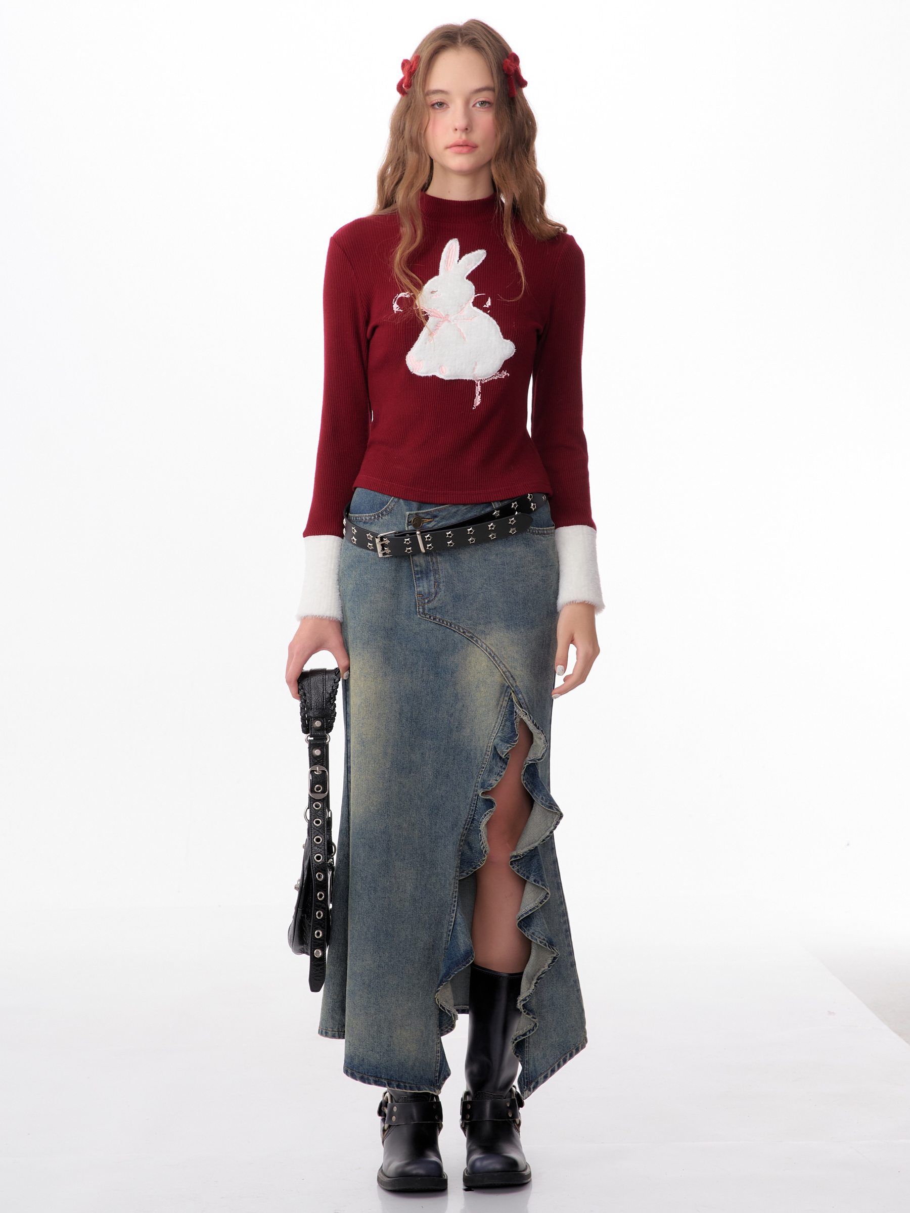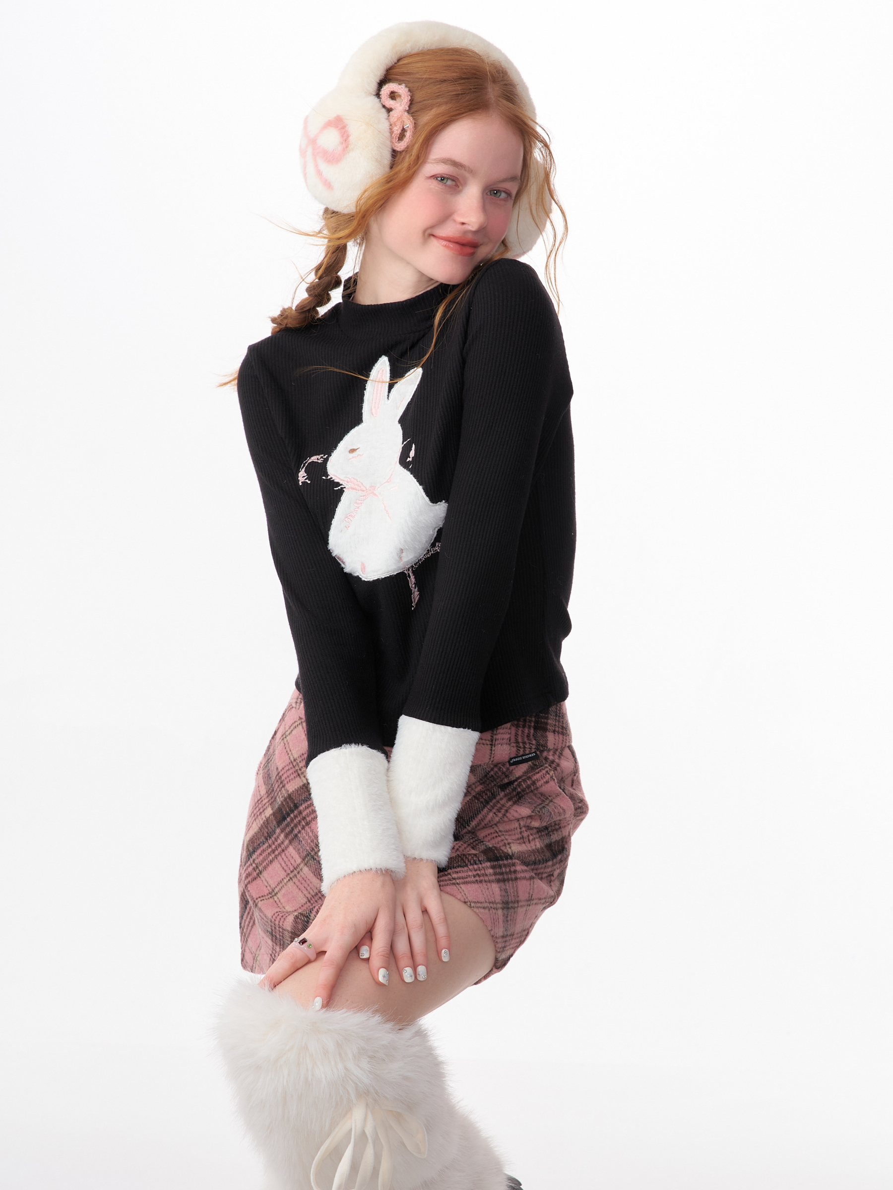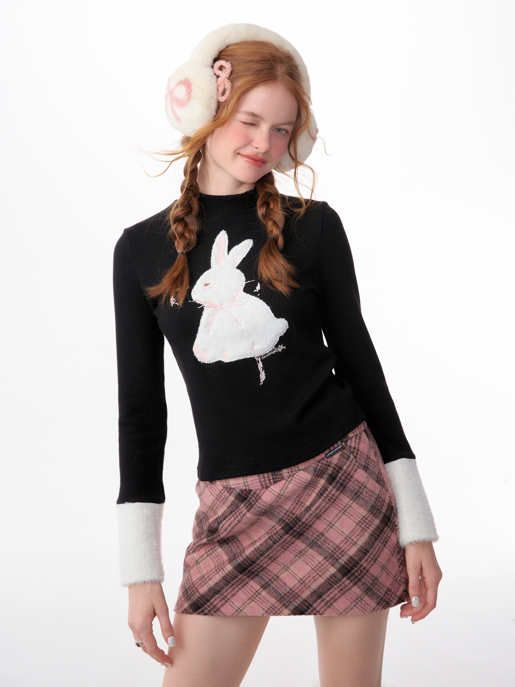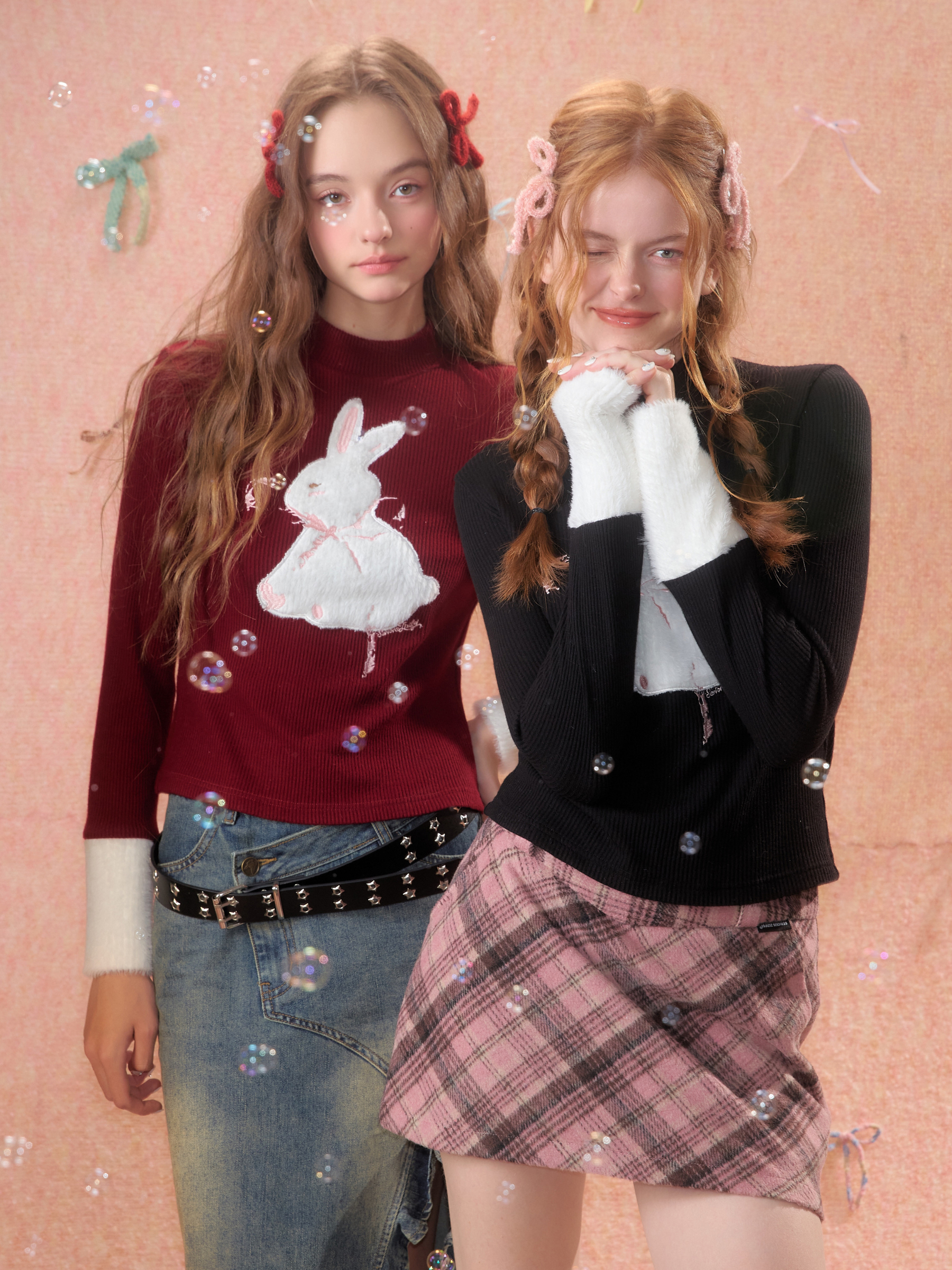 Suéter navideño de conejo de peluche | Capa base retro roja de Año Nuevo para otoño/invierno
