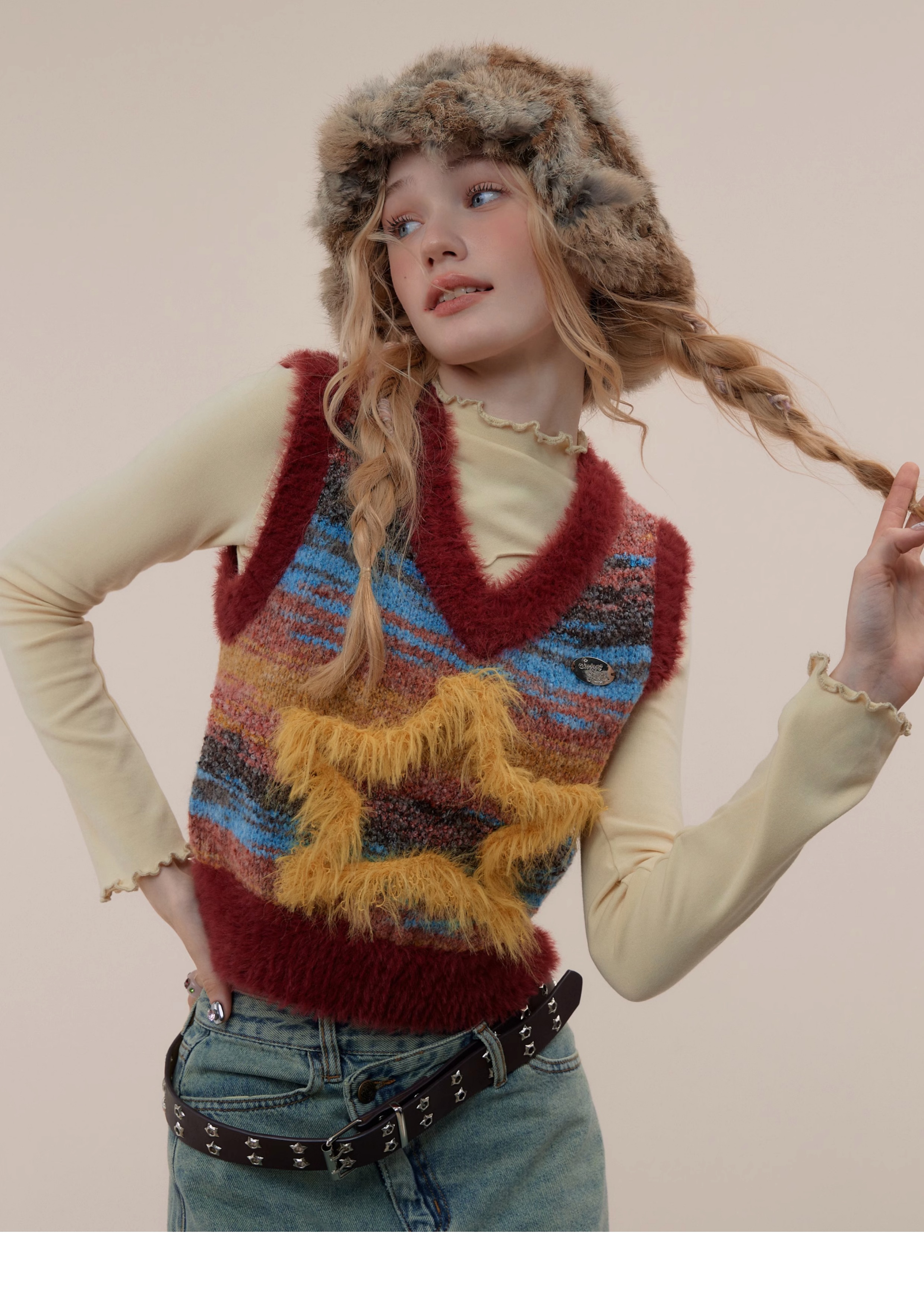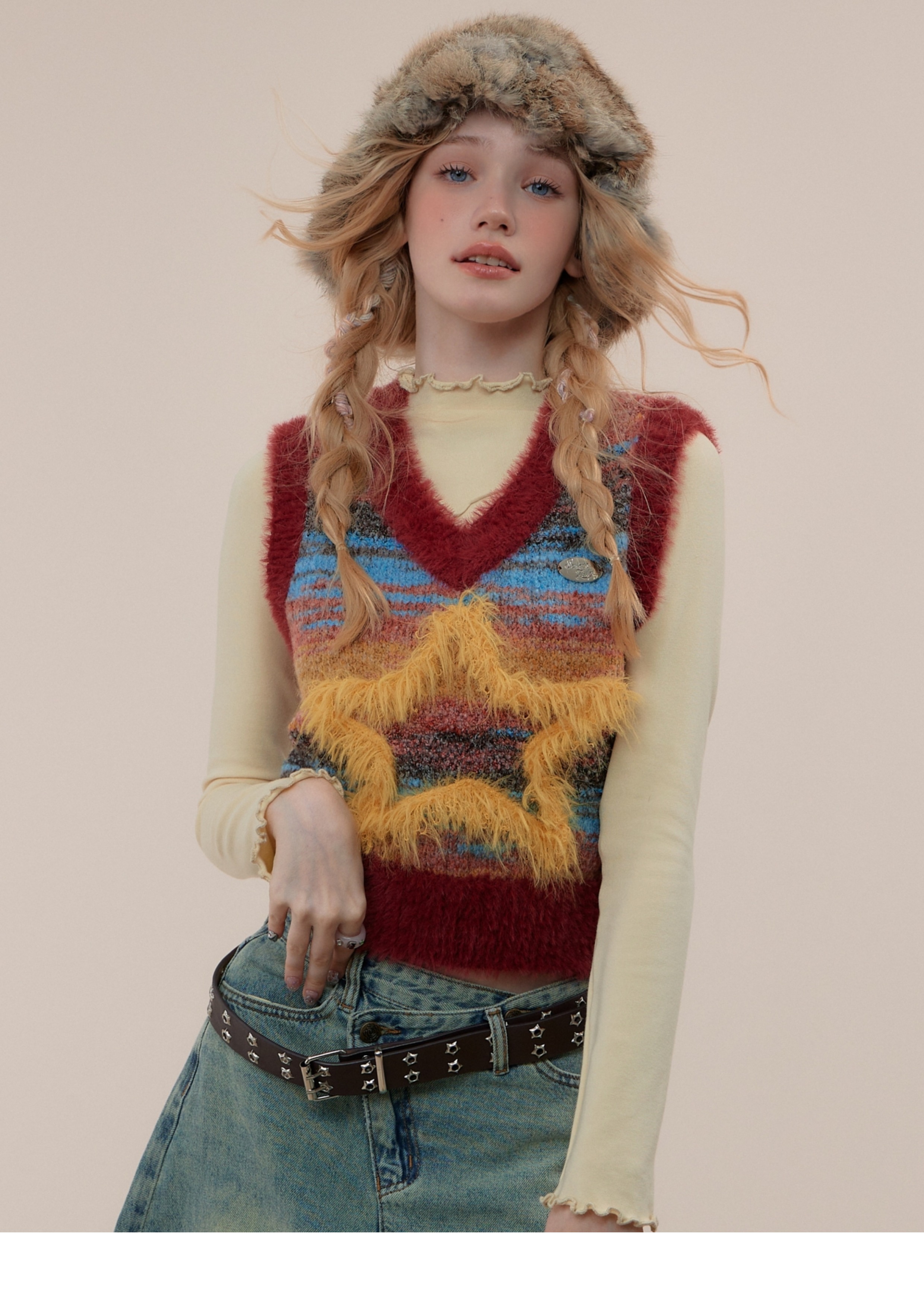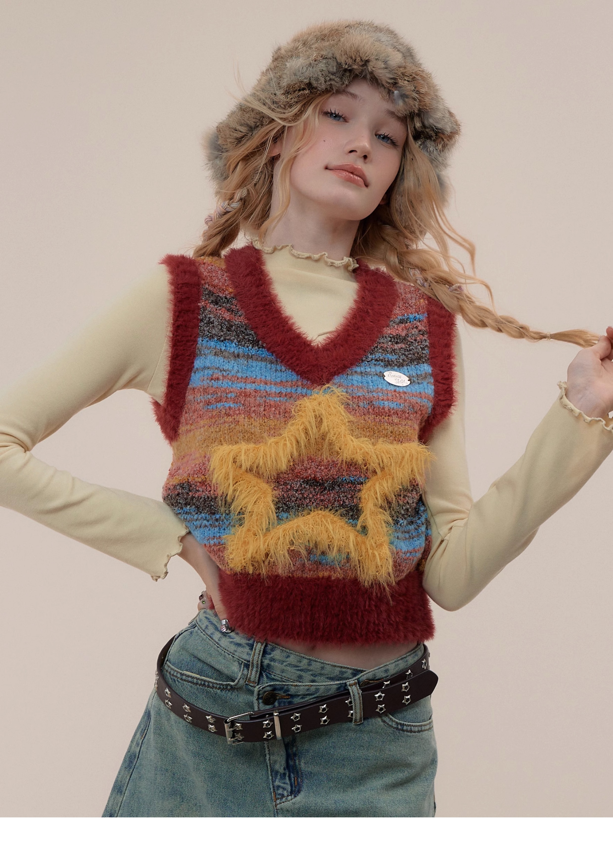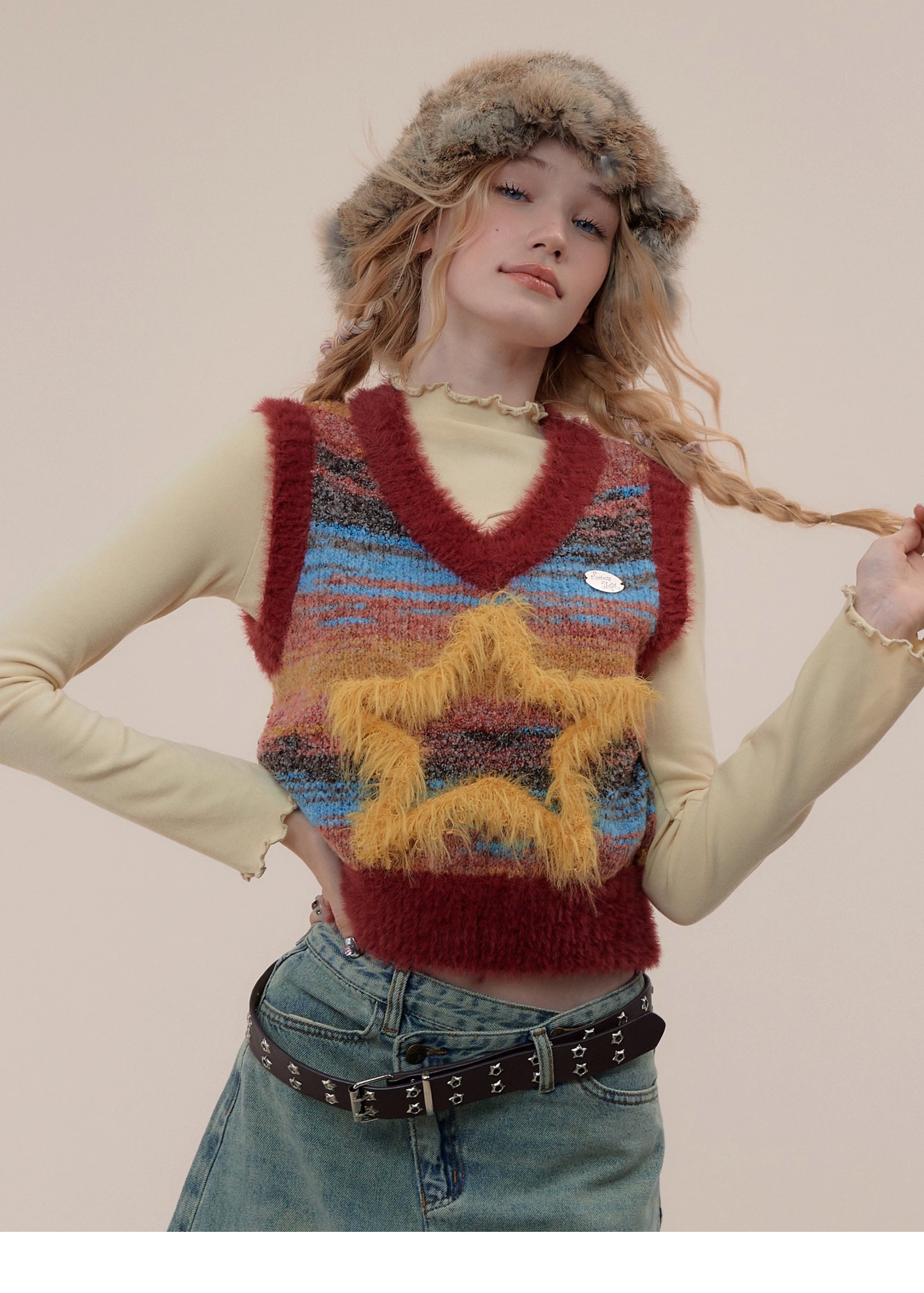 suéter sin mangas con borlas y estrellas, top de punto retro en contraste rojo para otoño/invierno