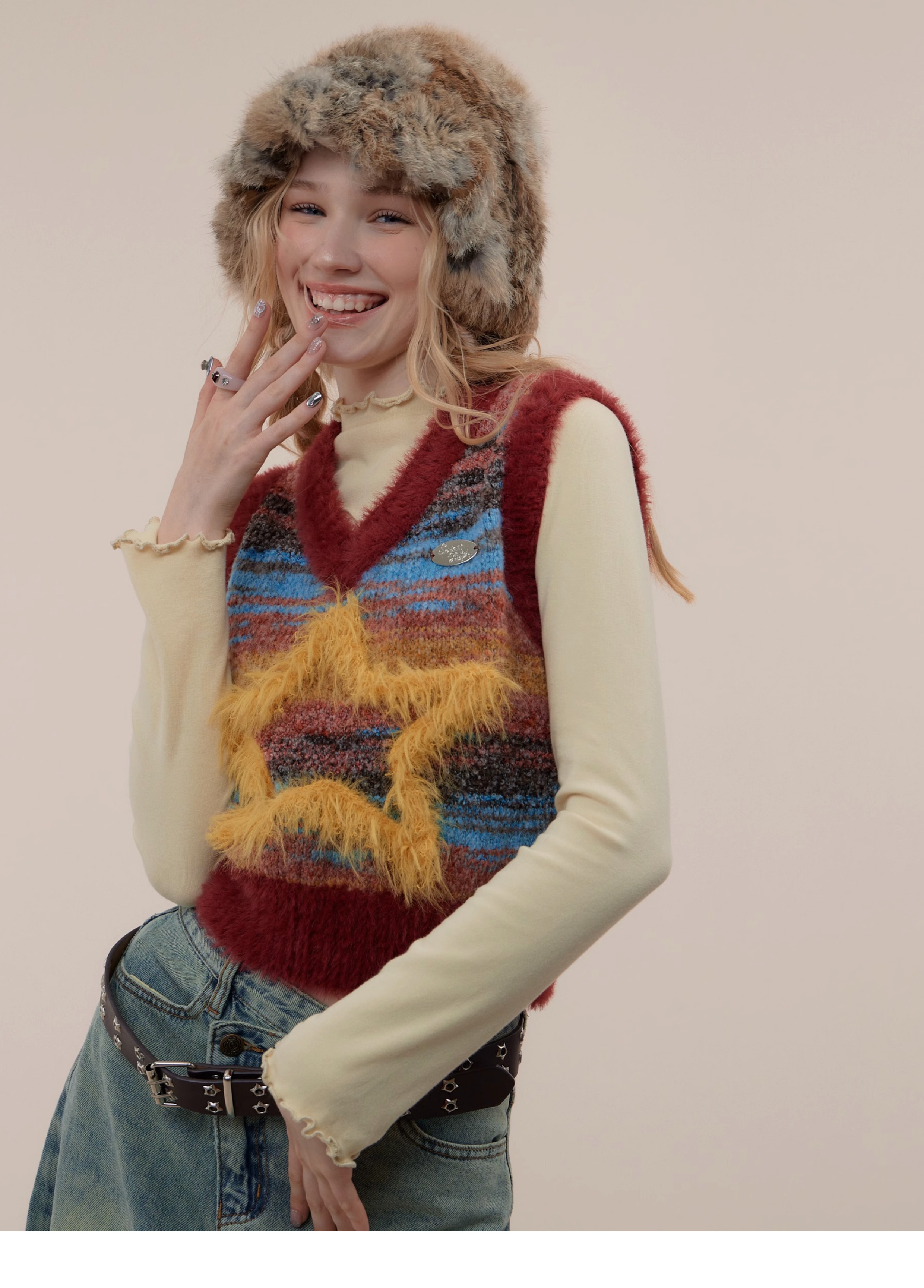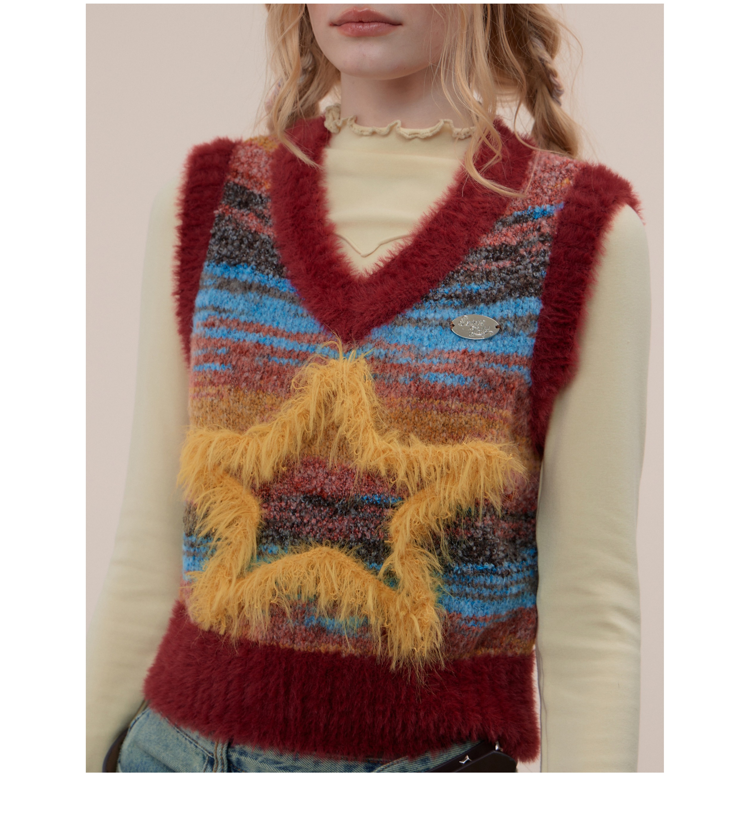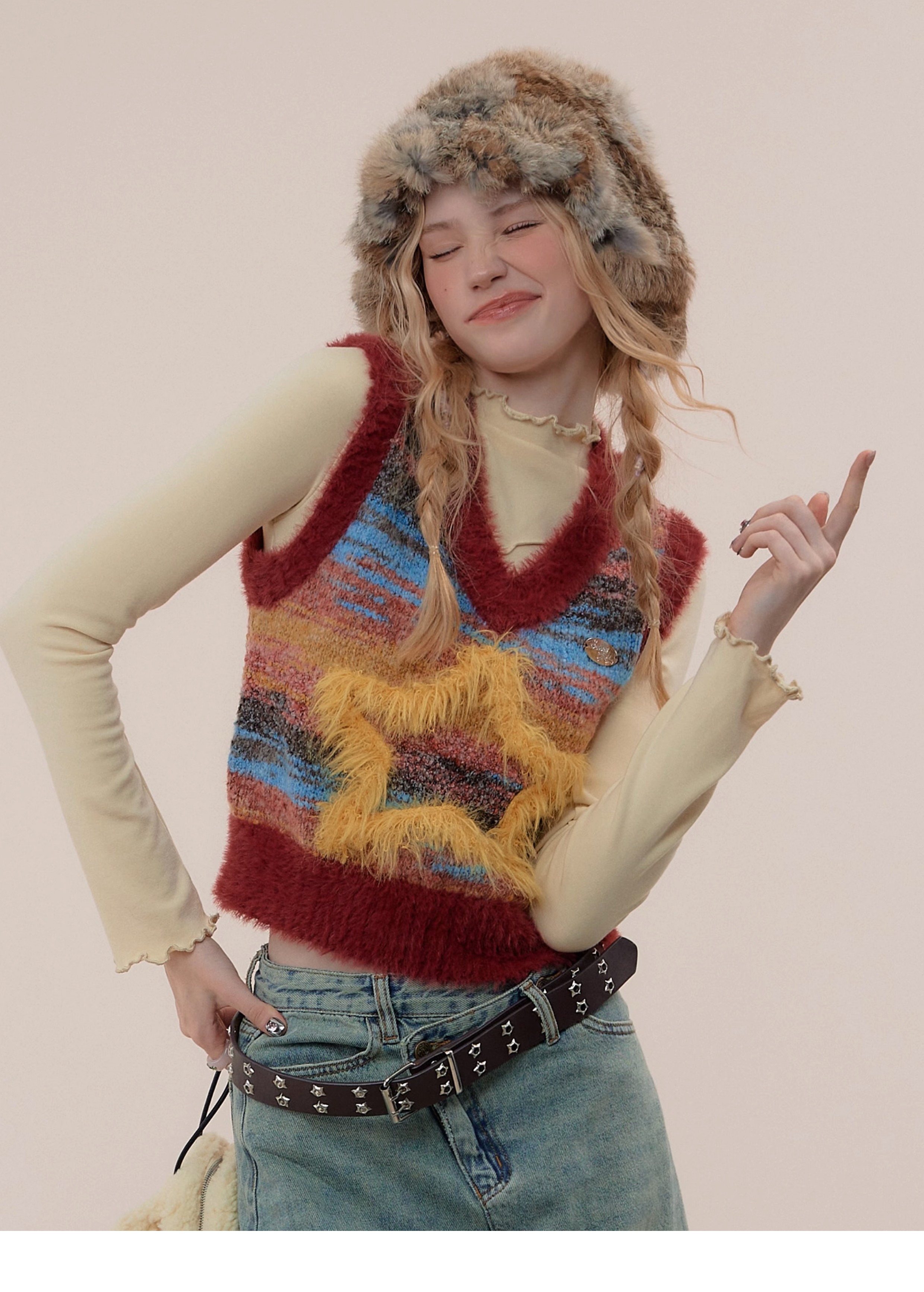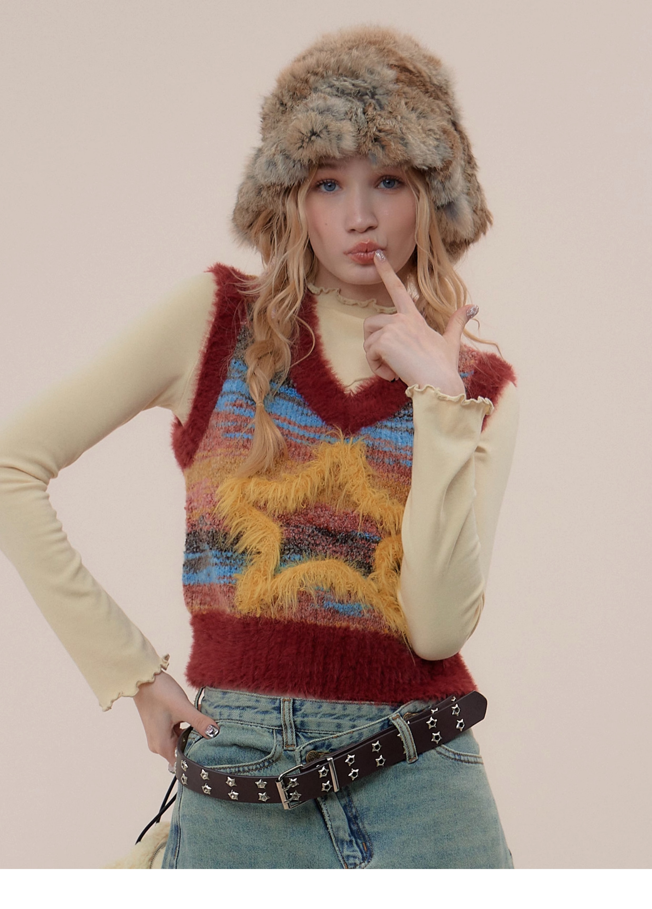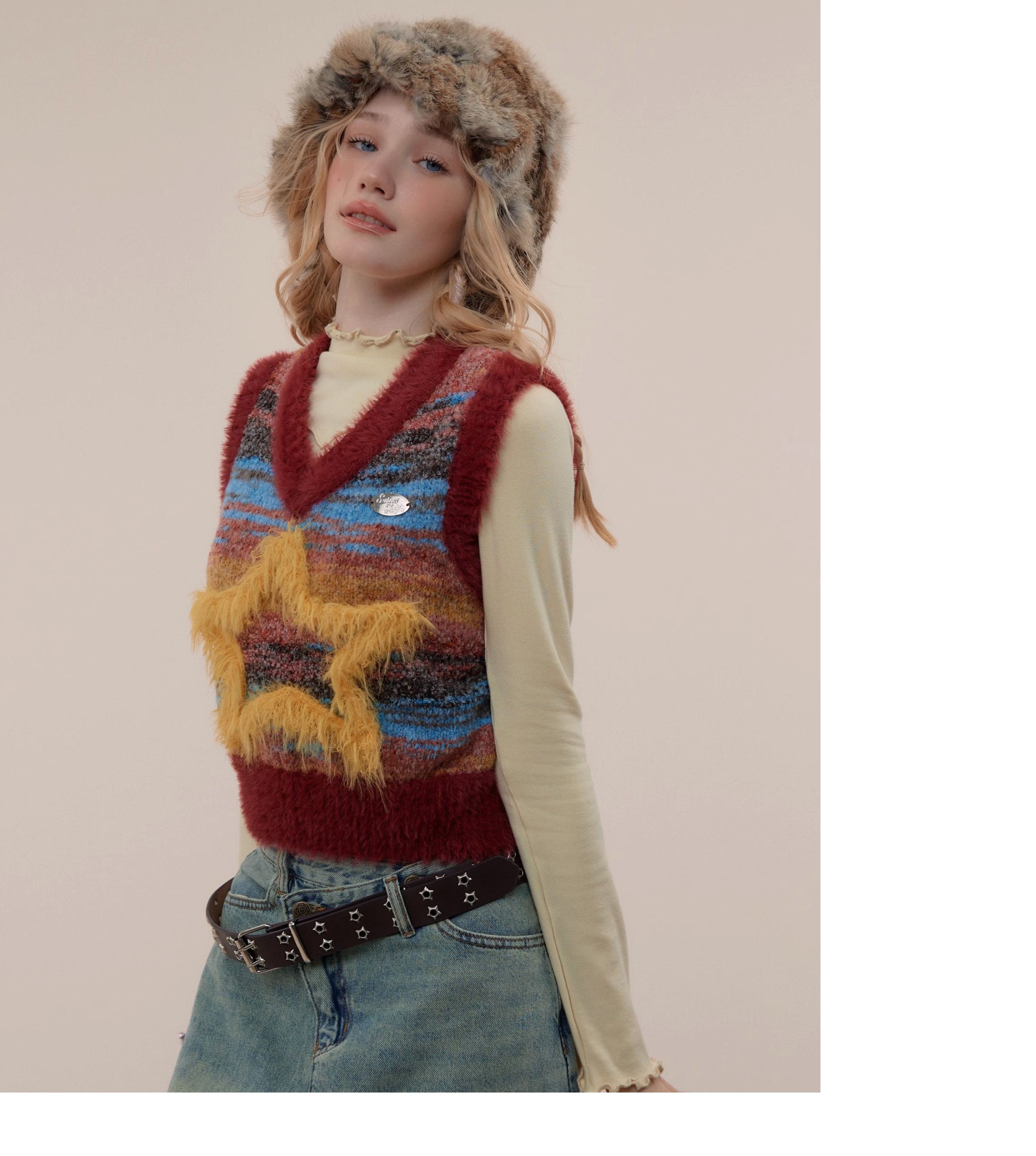 suéter sin mangas con borlas y estrellas, top de punto retro en contraste rojo para otoño/invierno