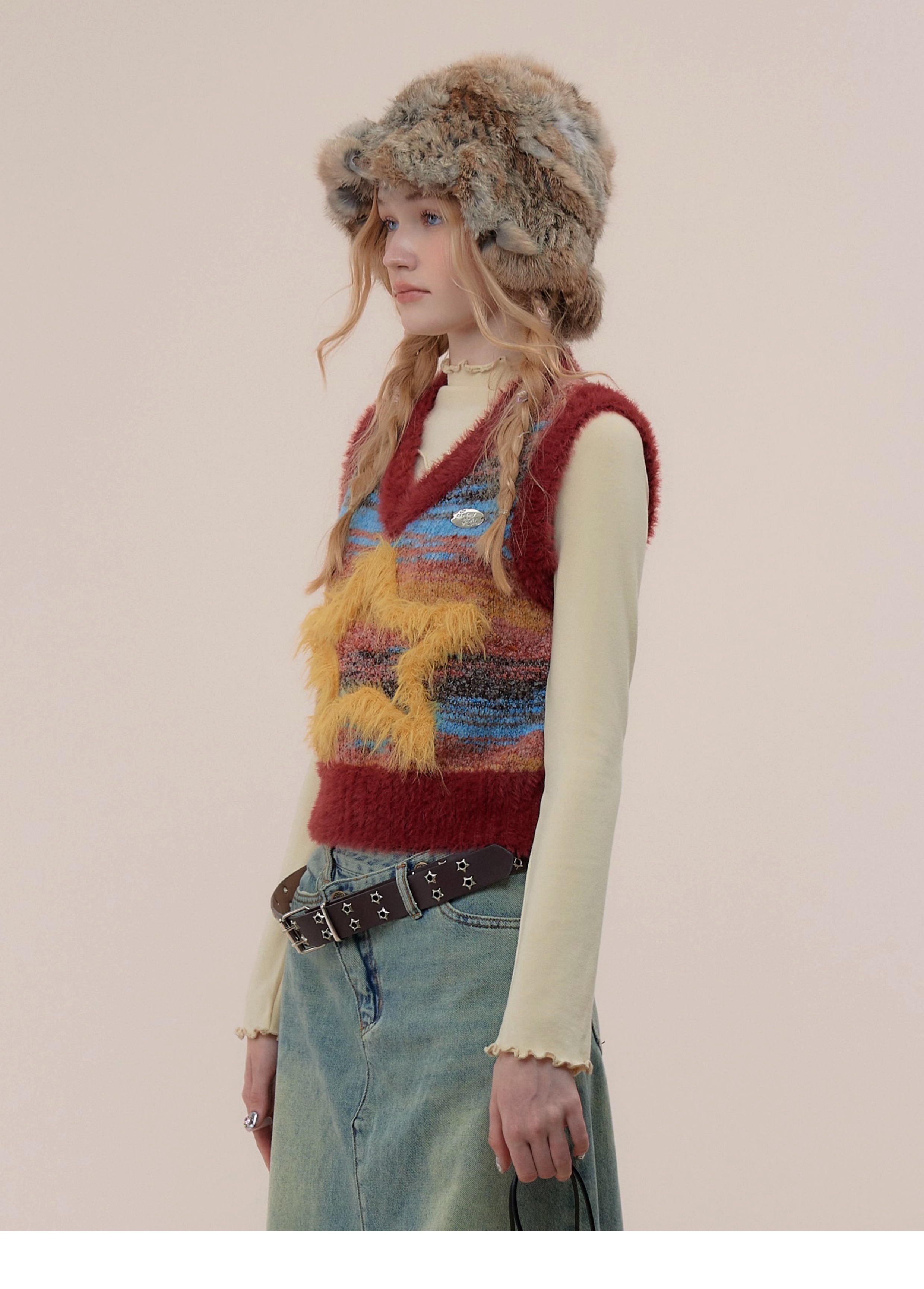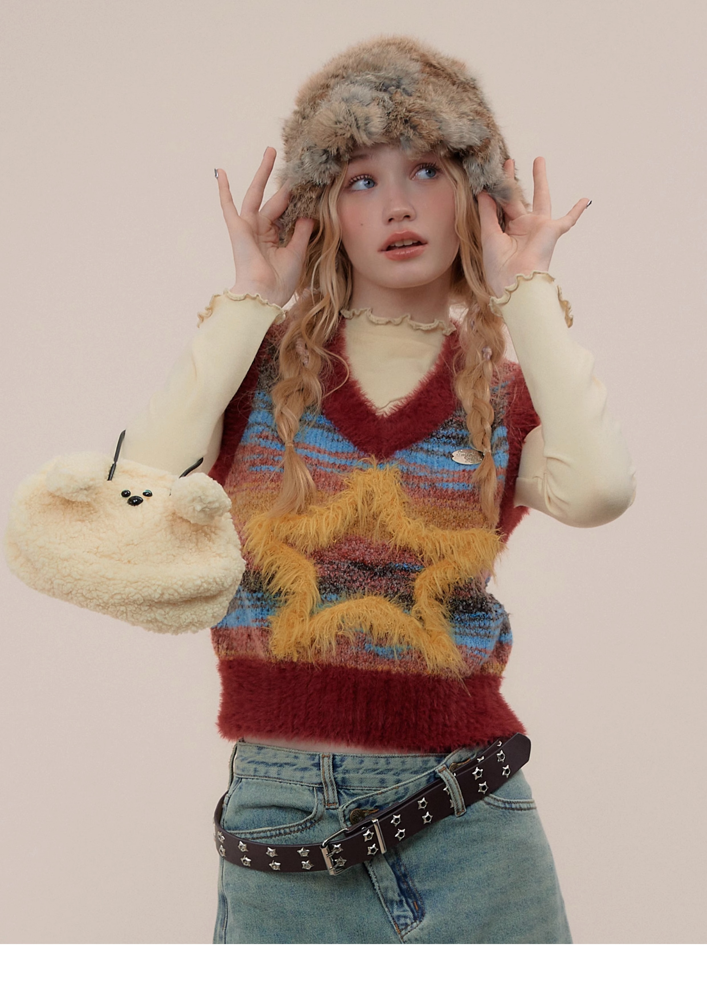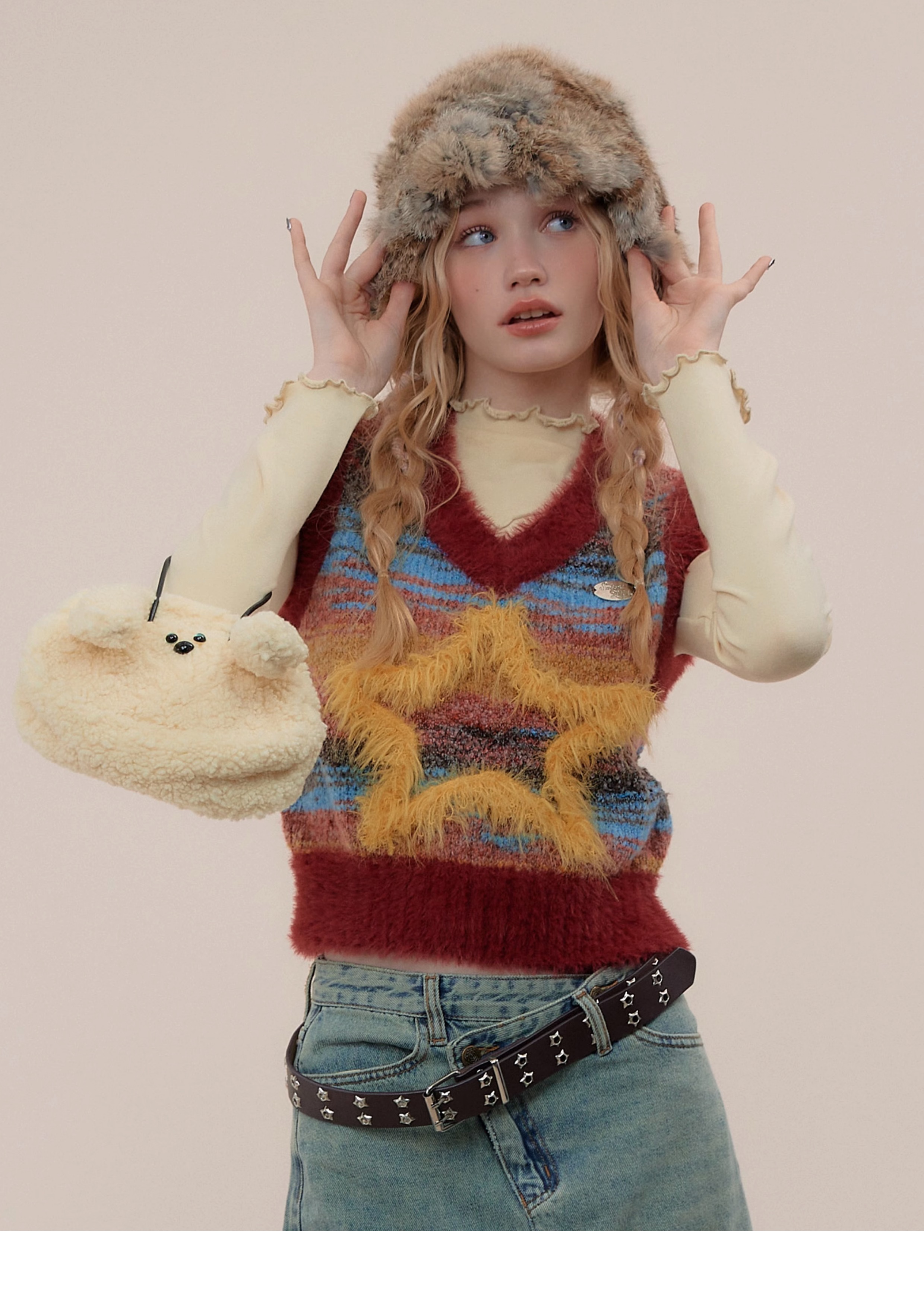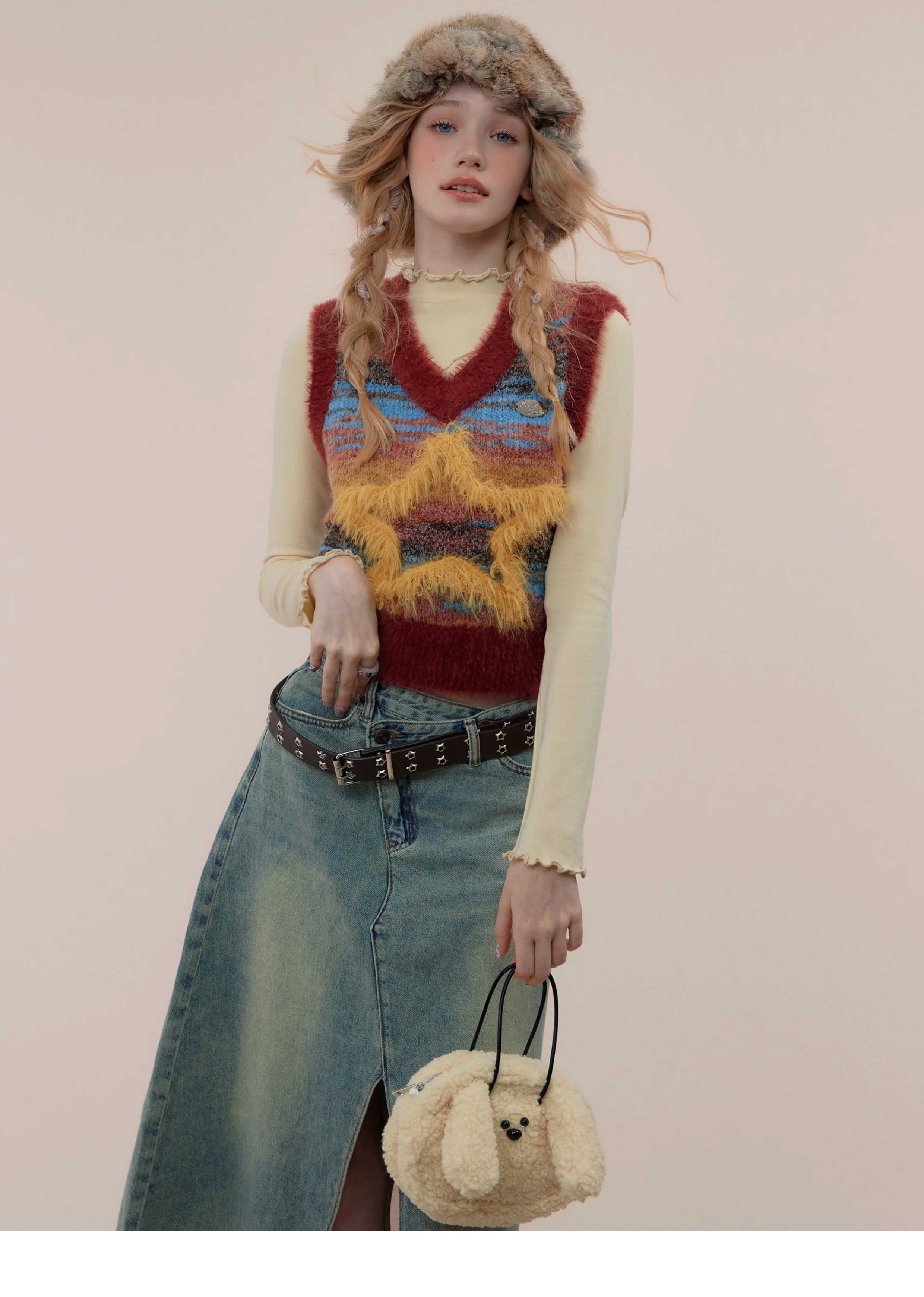 suéter sin mangas con borlas y estrellas, top de punto retro en contraste rojo para otoño/invierno