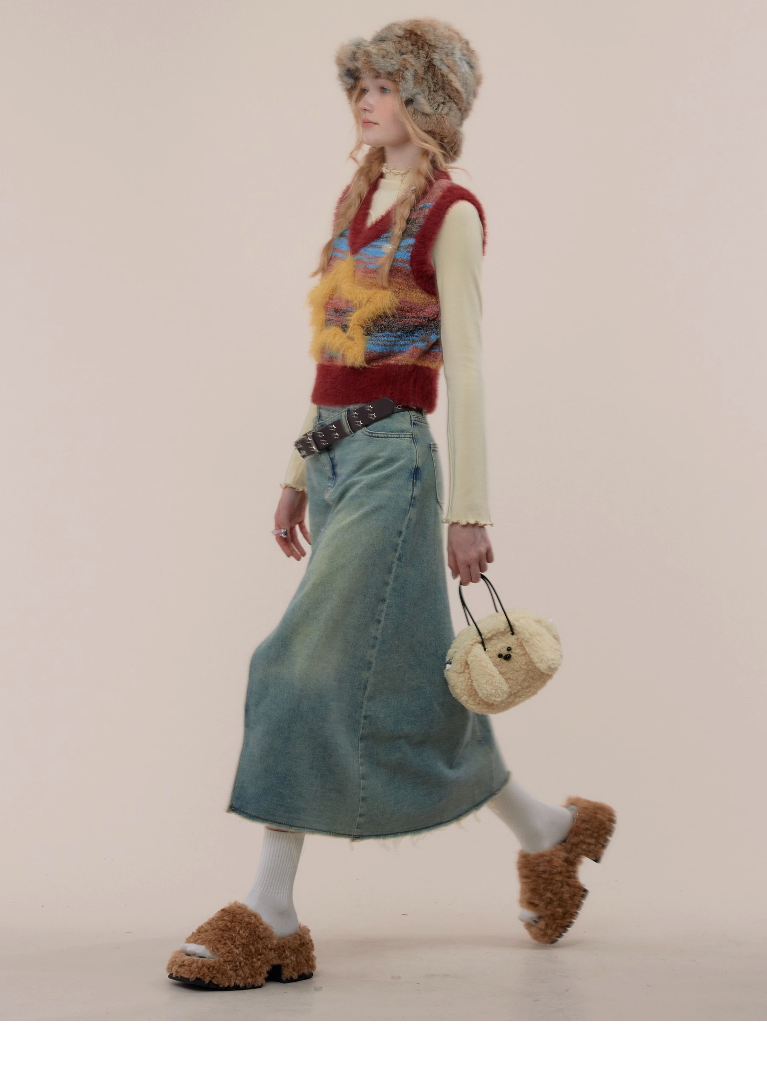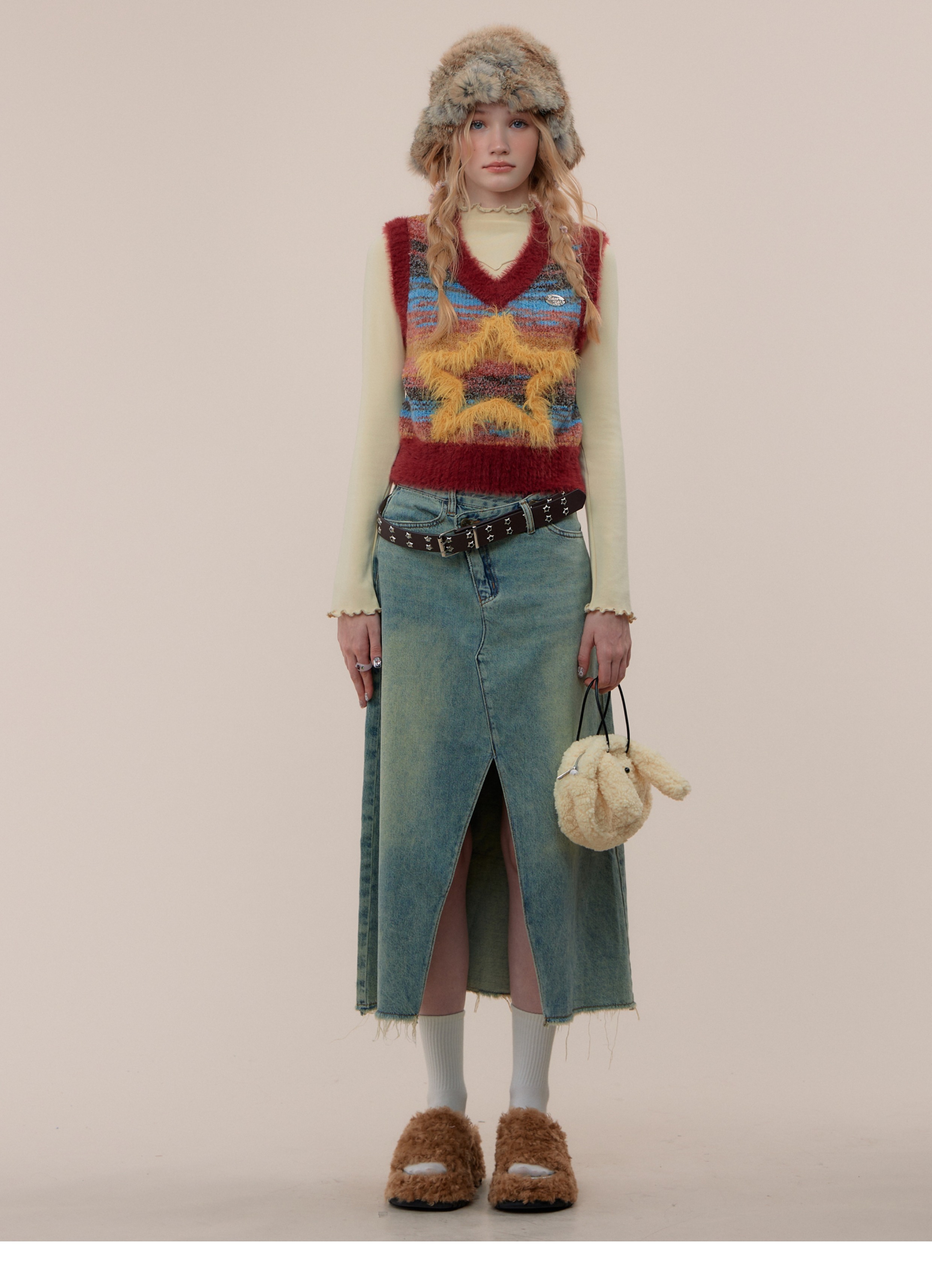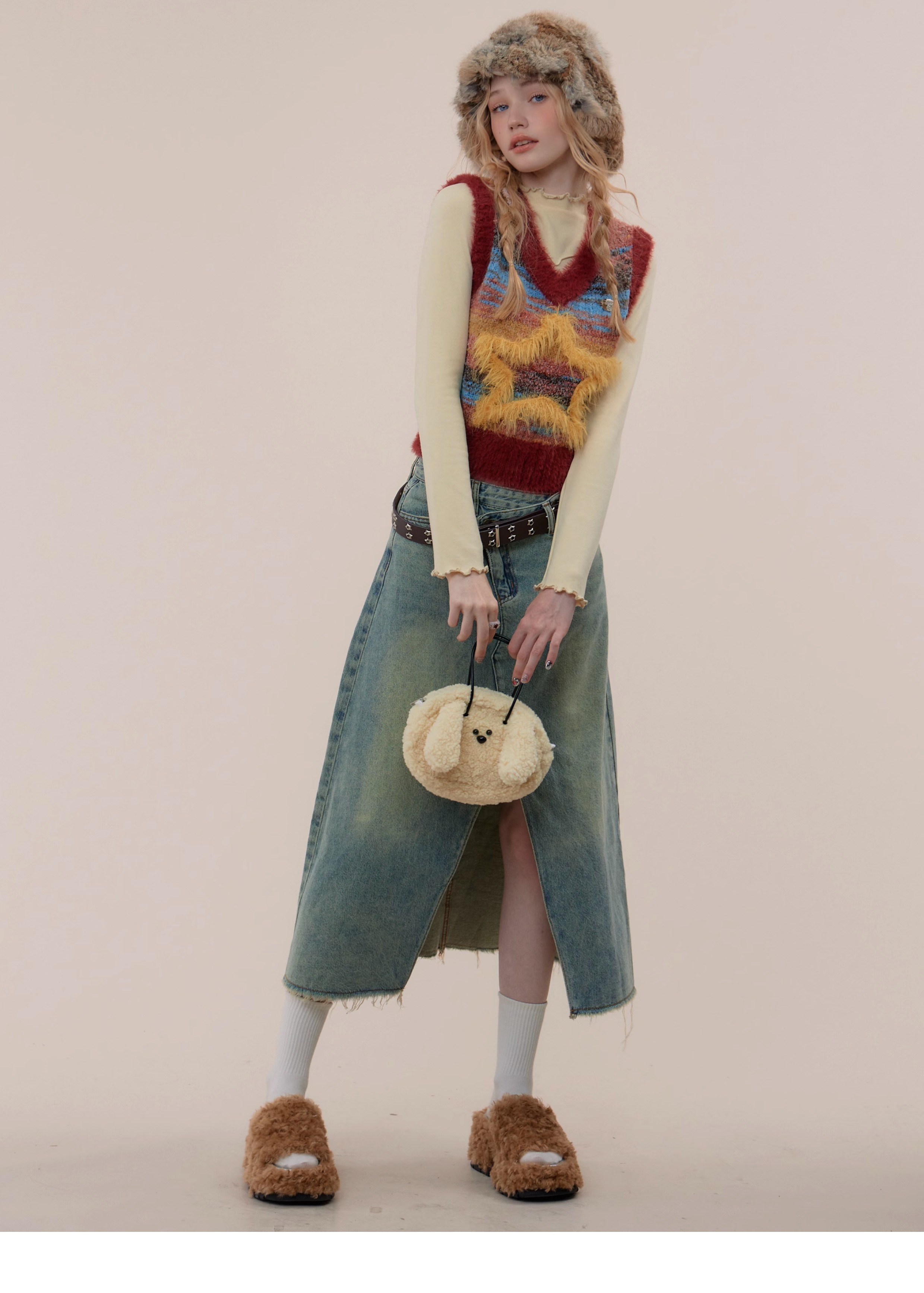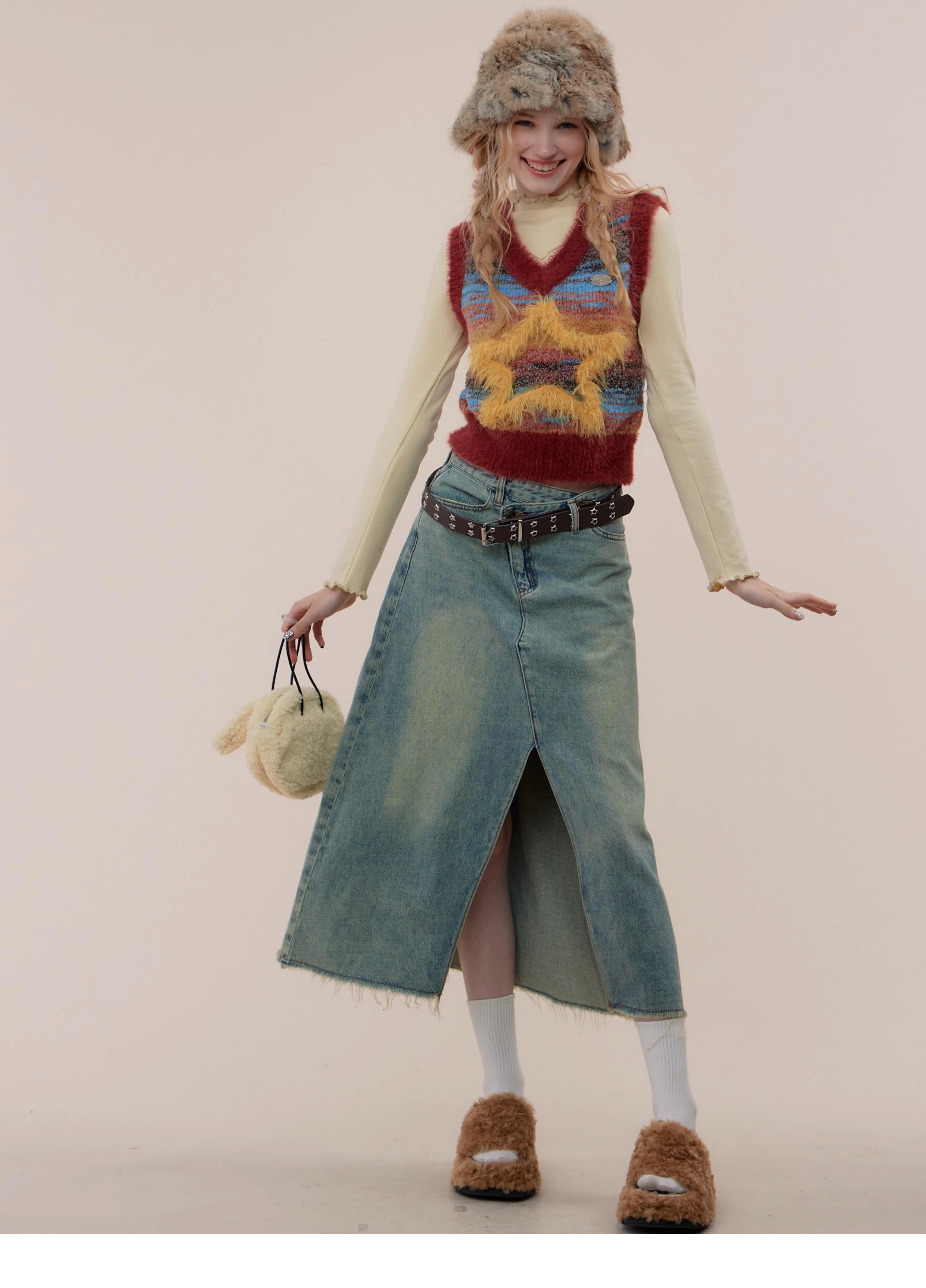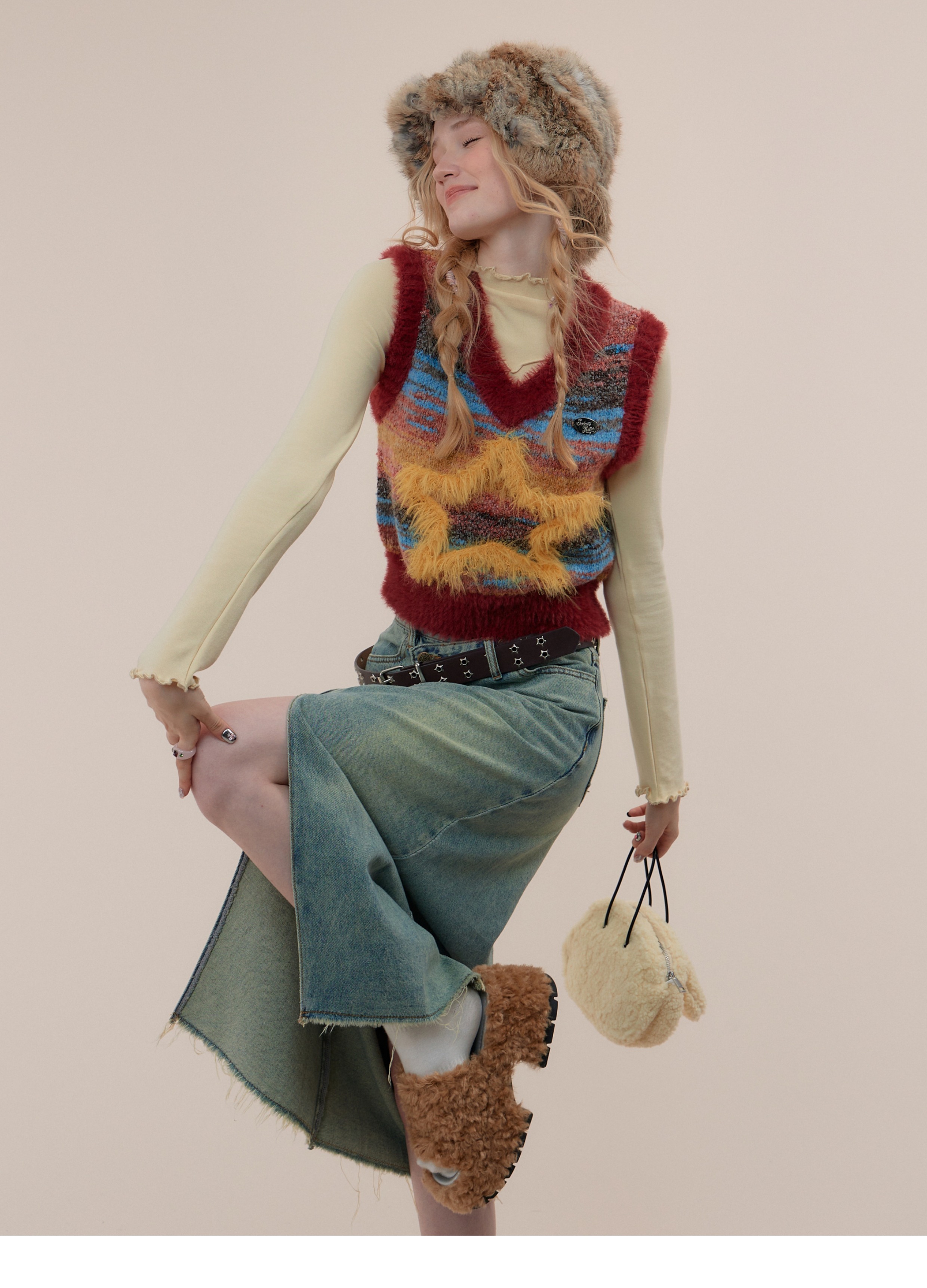 suéter sin mangas con borlas y estrellas, top de punto retro en contraste rojo para otoño/invierno