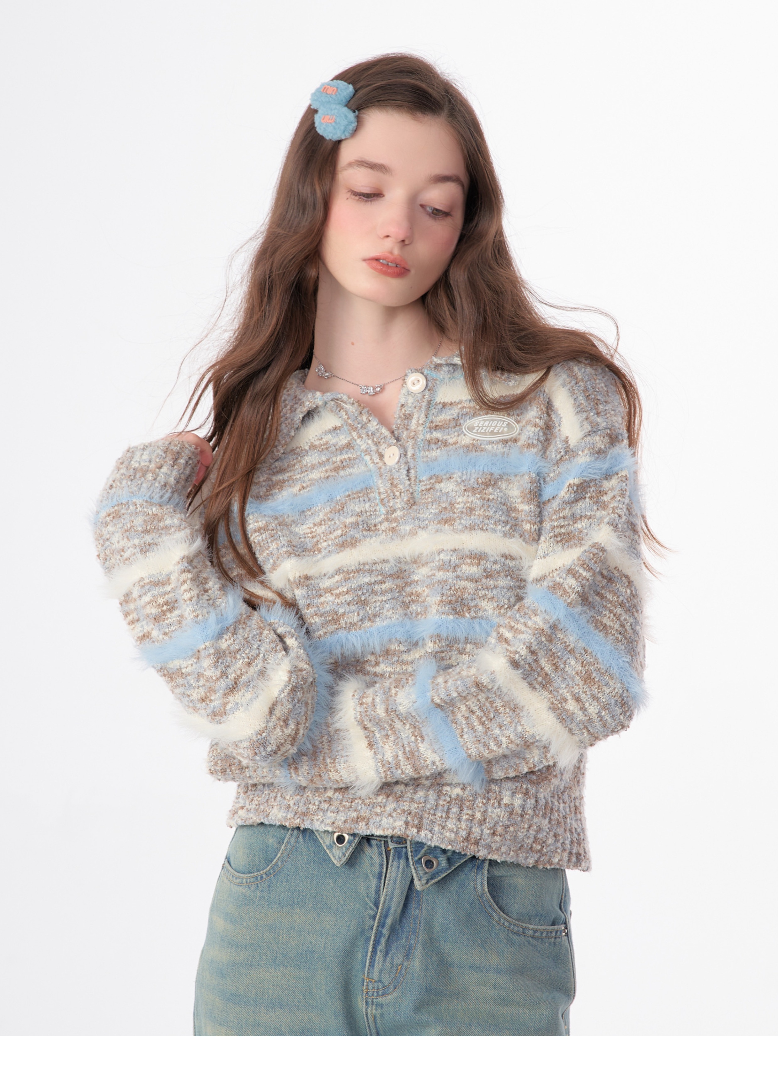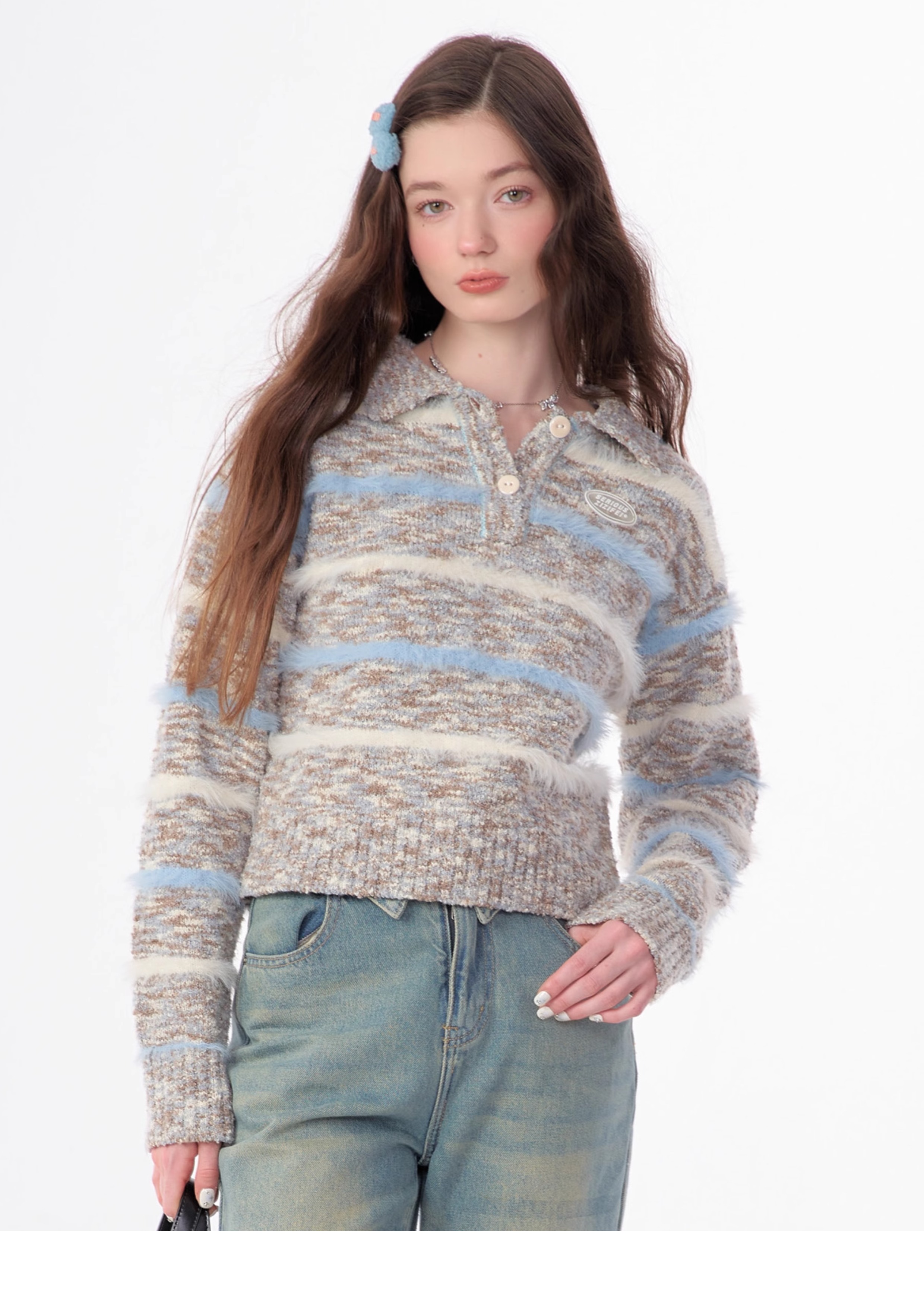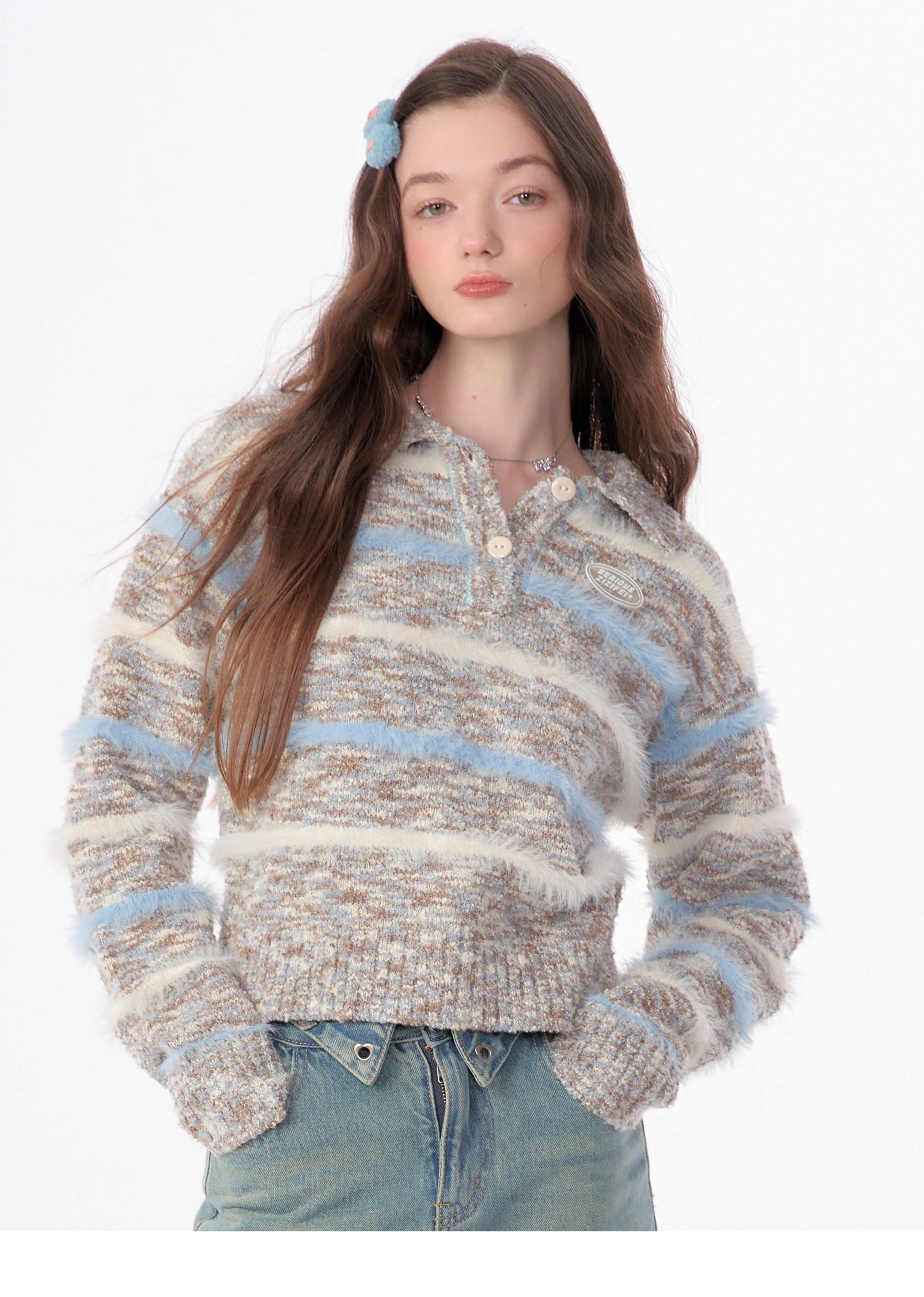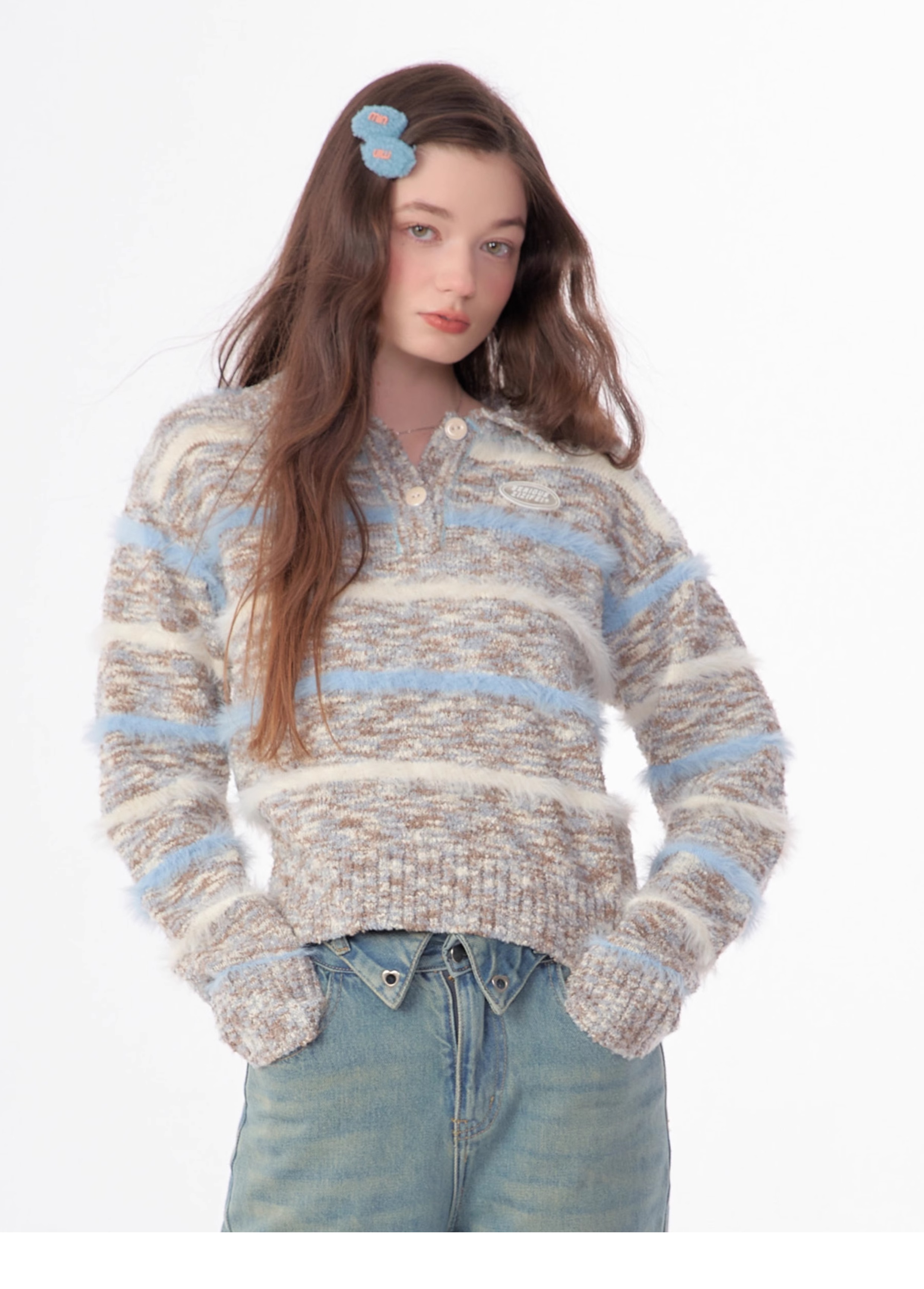 Suéter tipo polo a rayas en contraste | Sudadera con capucha retro de alta gama estilo perezoso para otoño/invierno