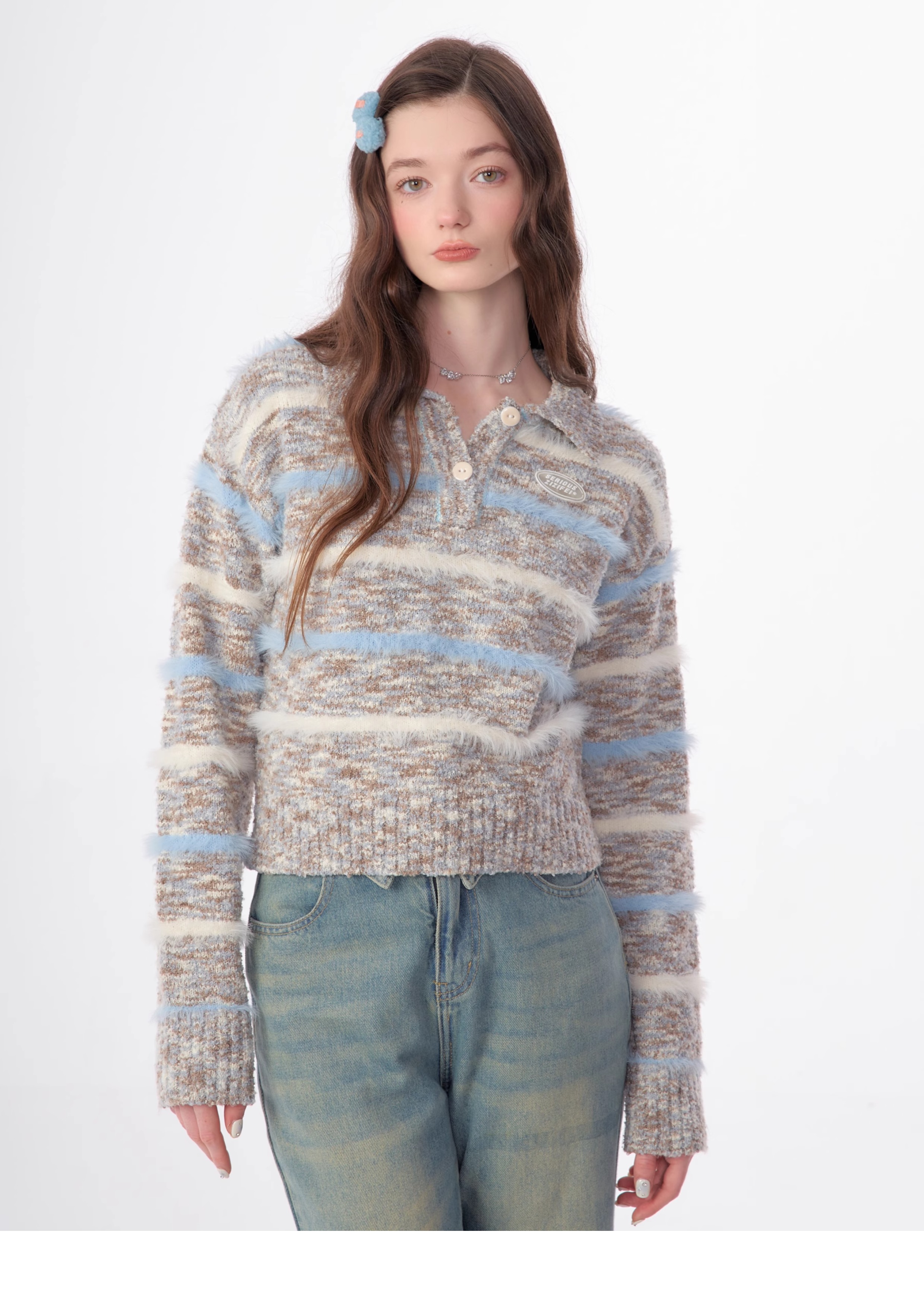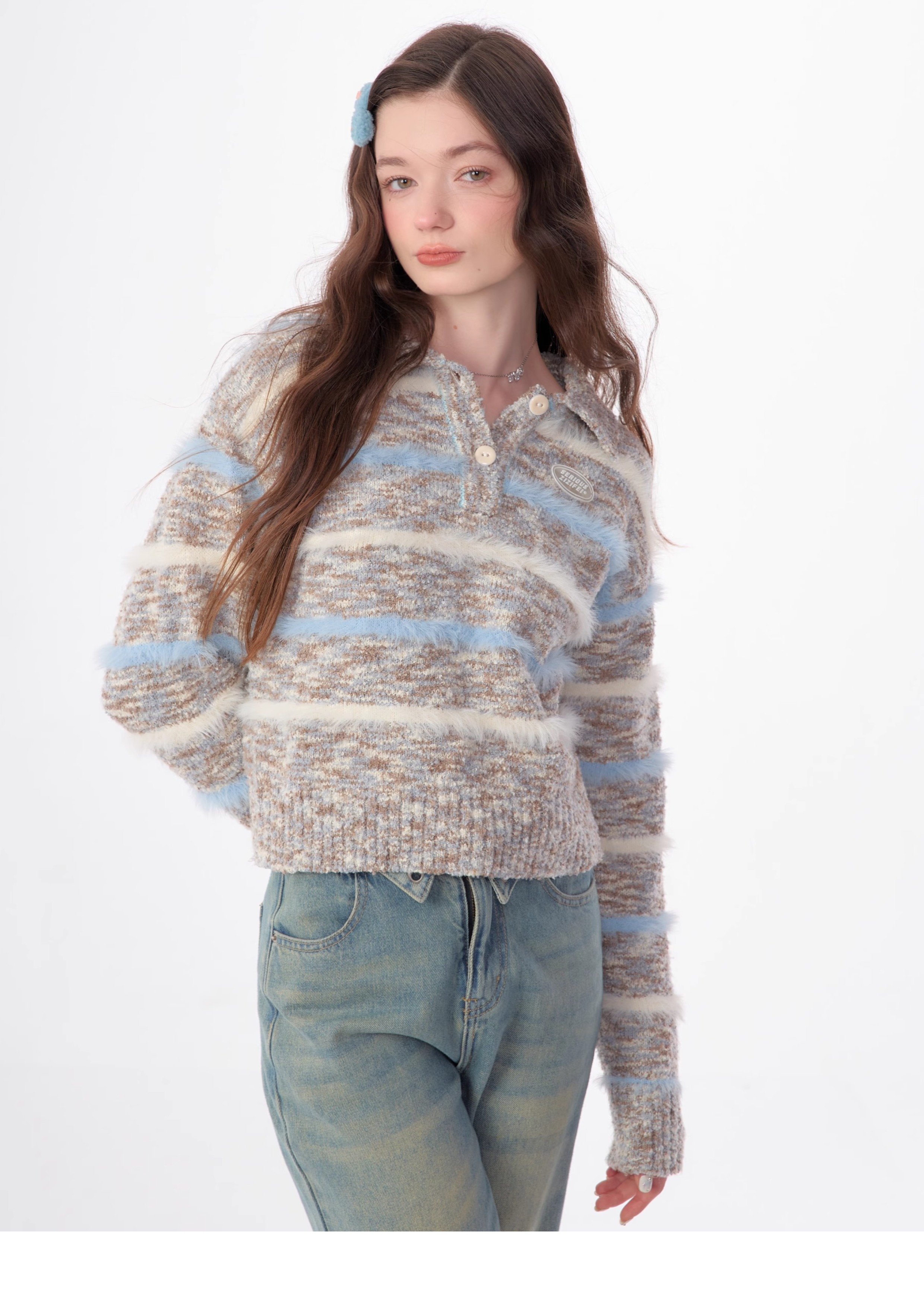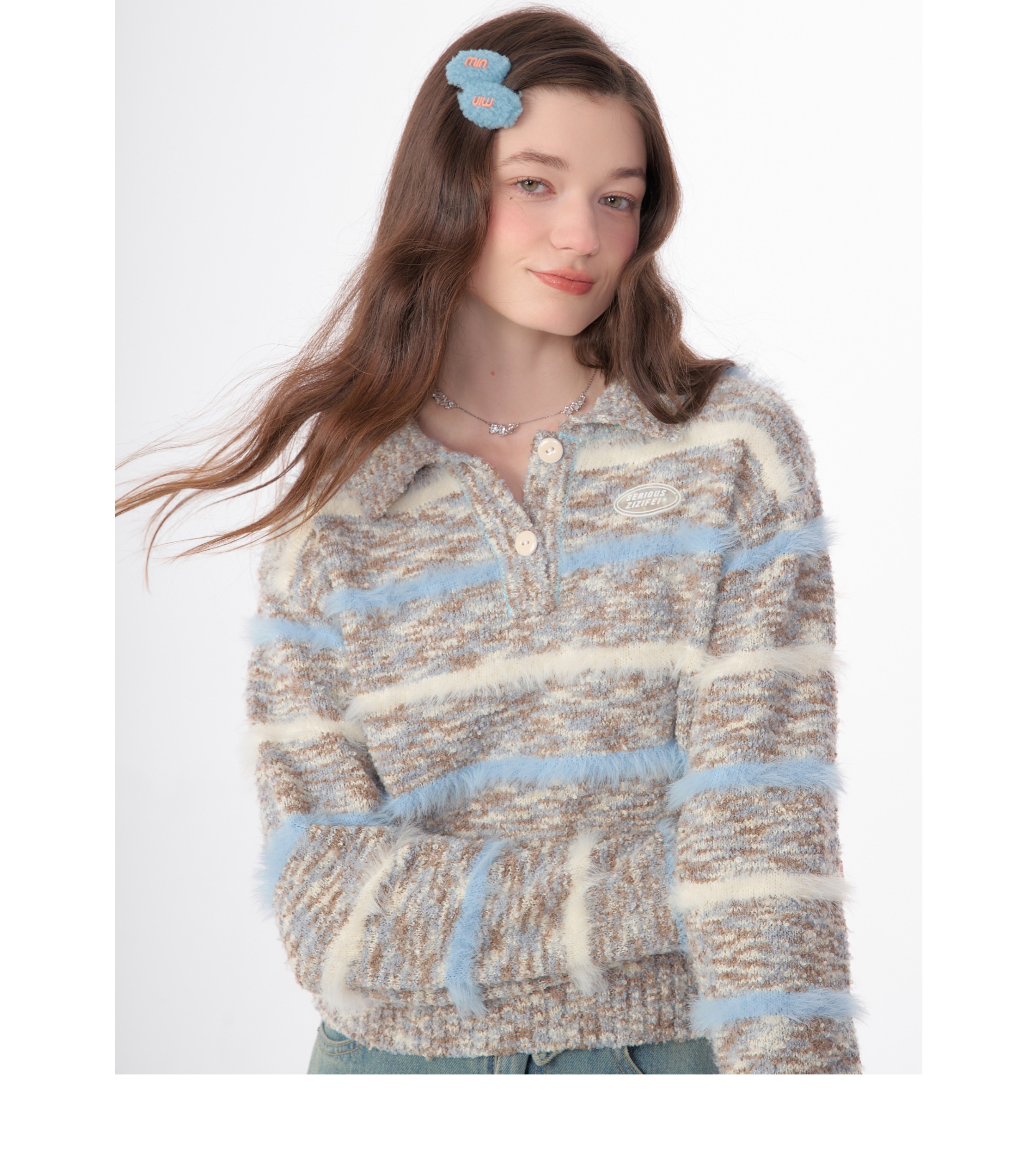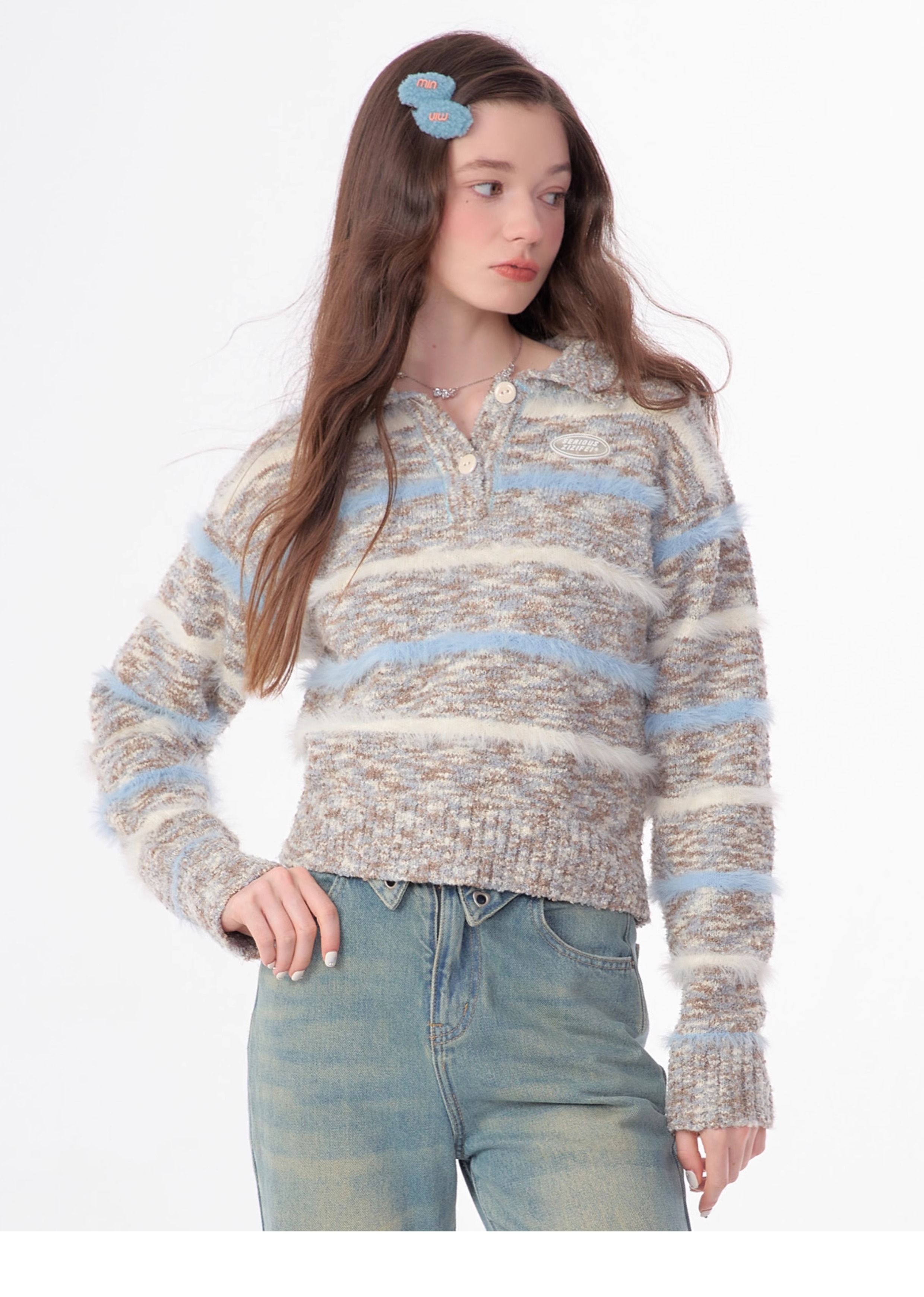Suéter tipo polo a rayas en contraste | Sudadera con capucha retro de alta gama estilo perezoso para otoño/invierno