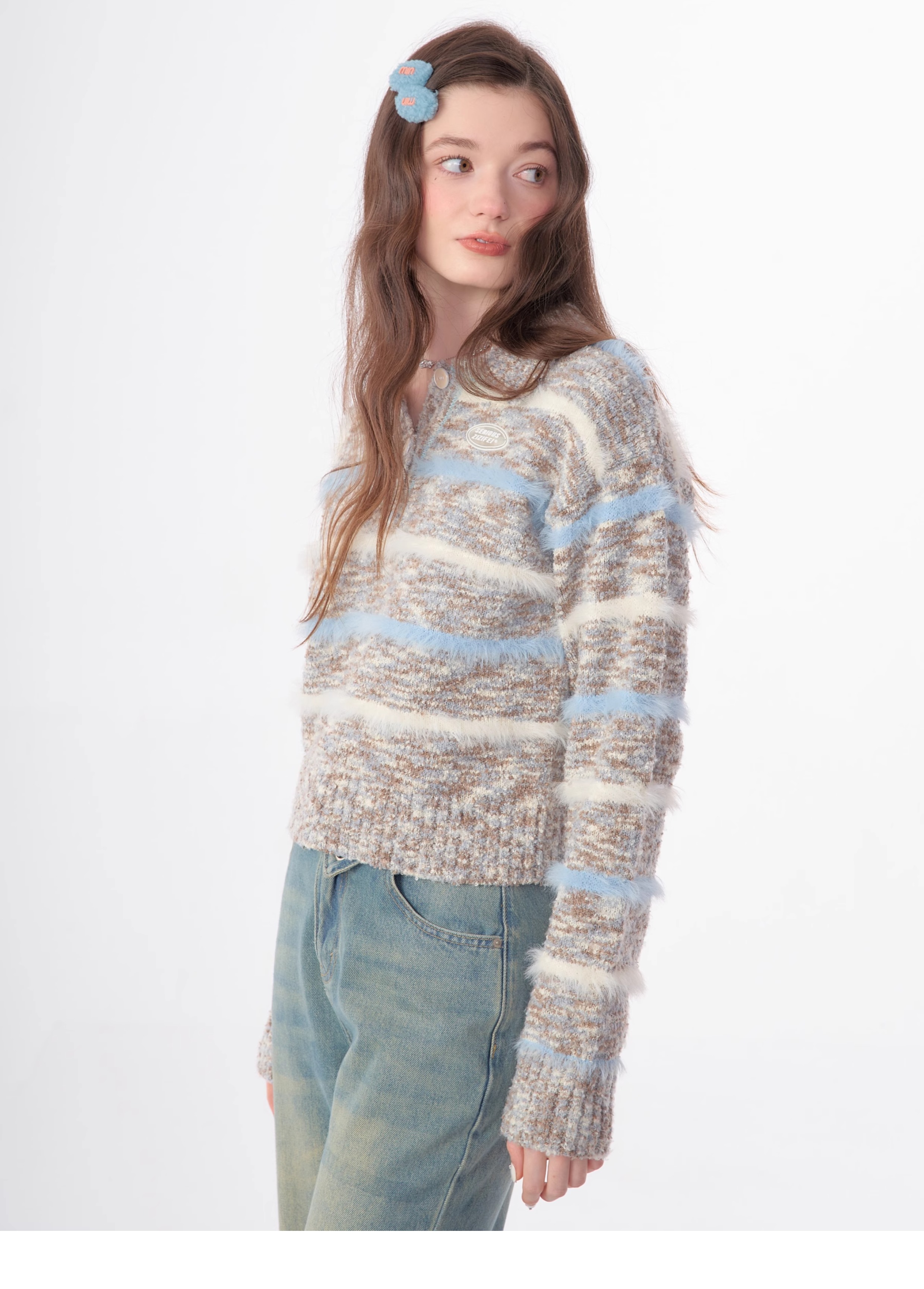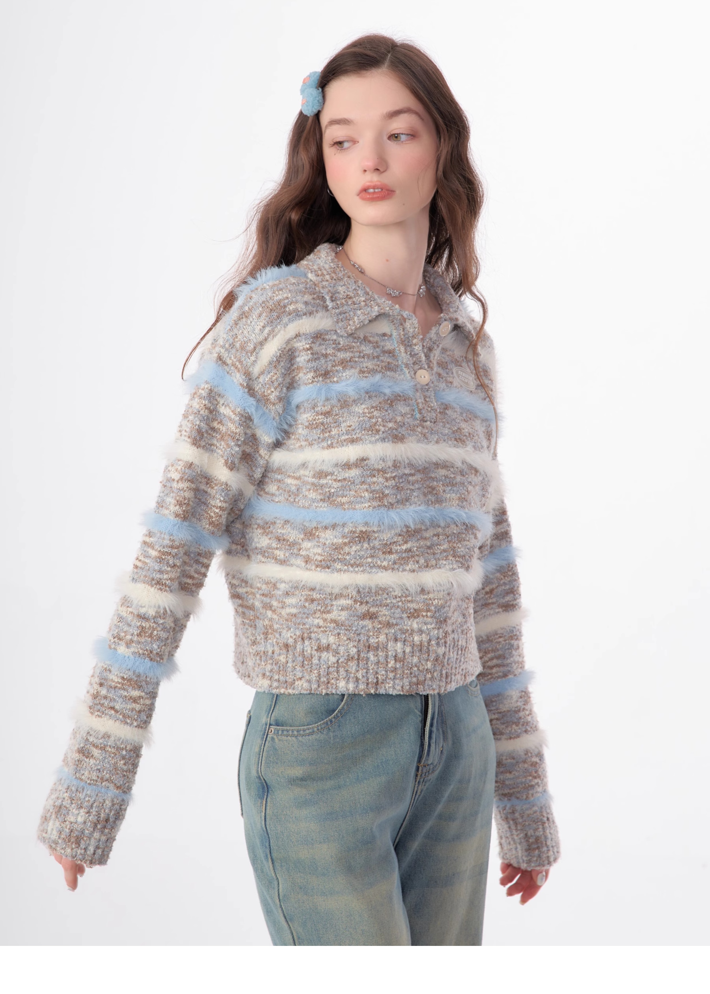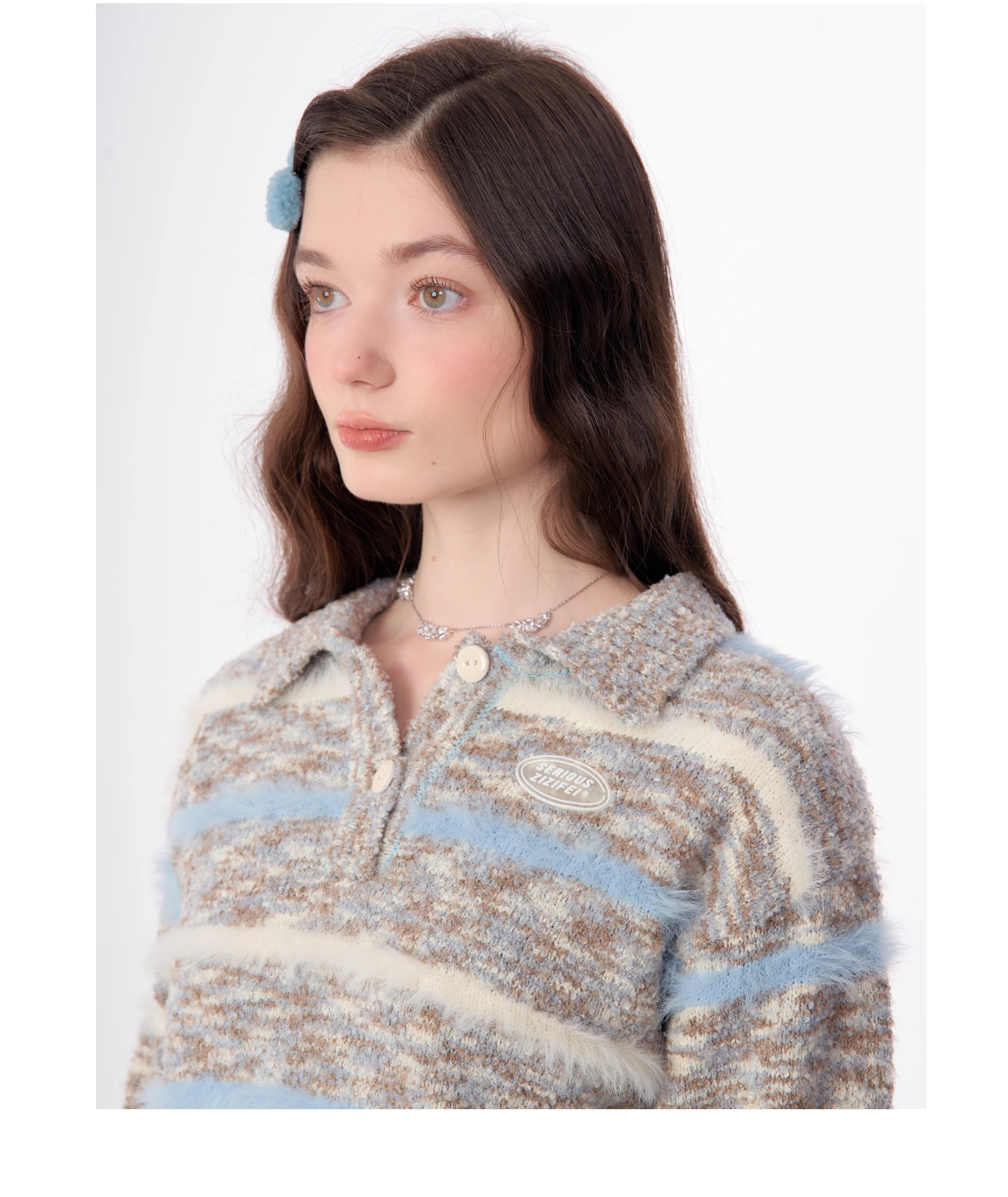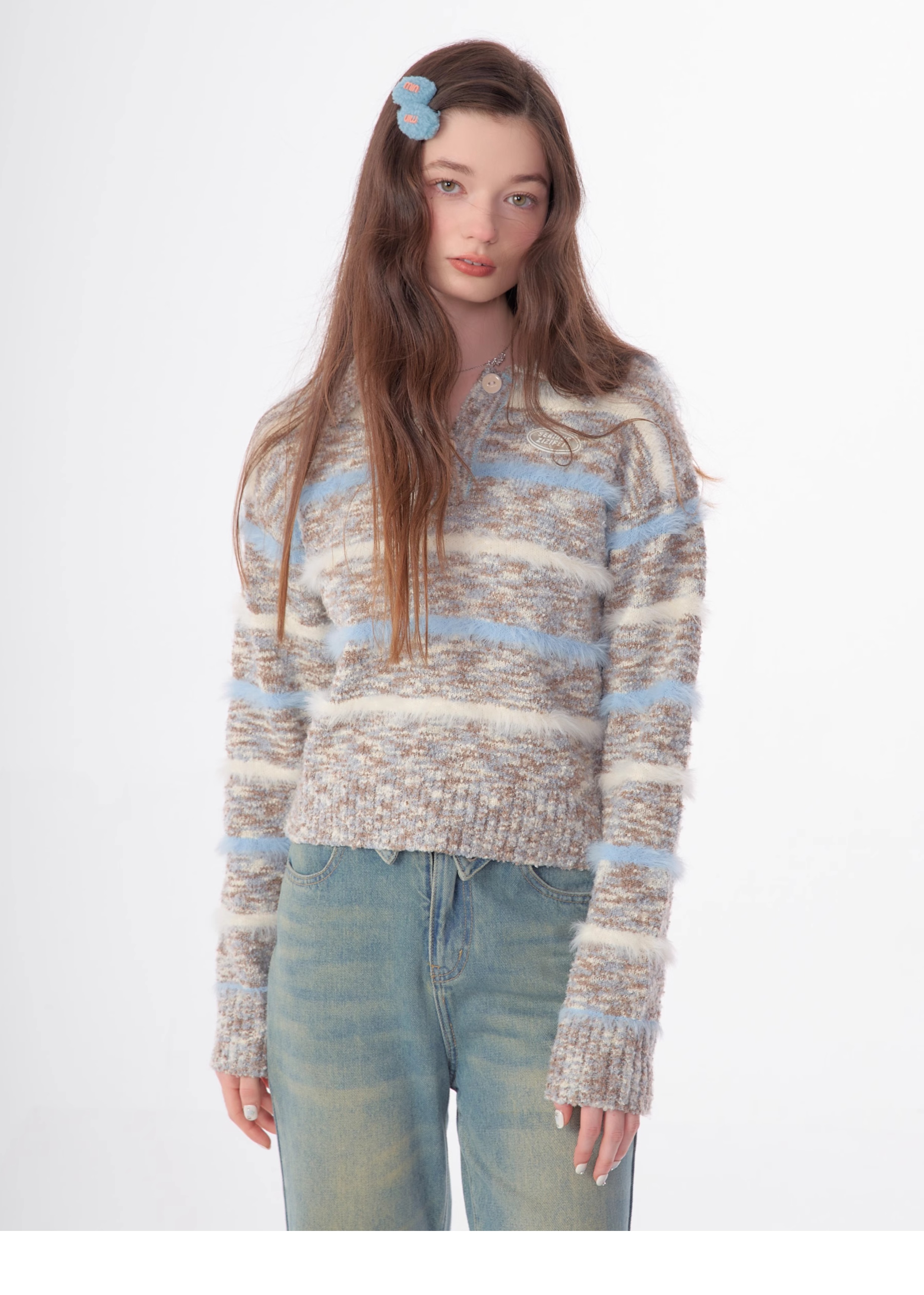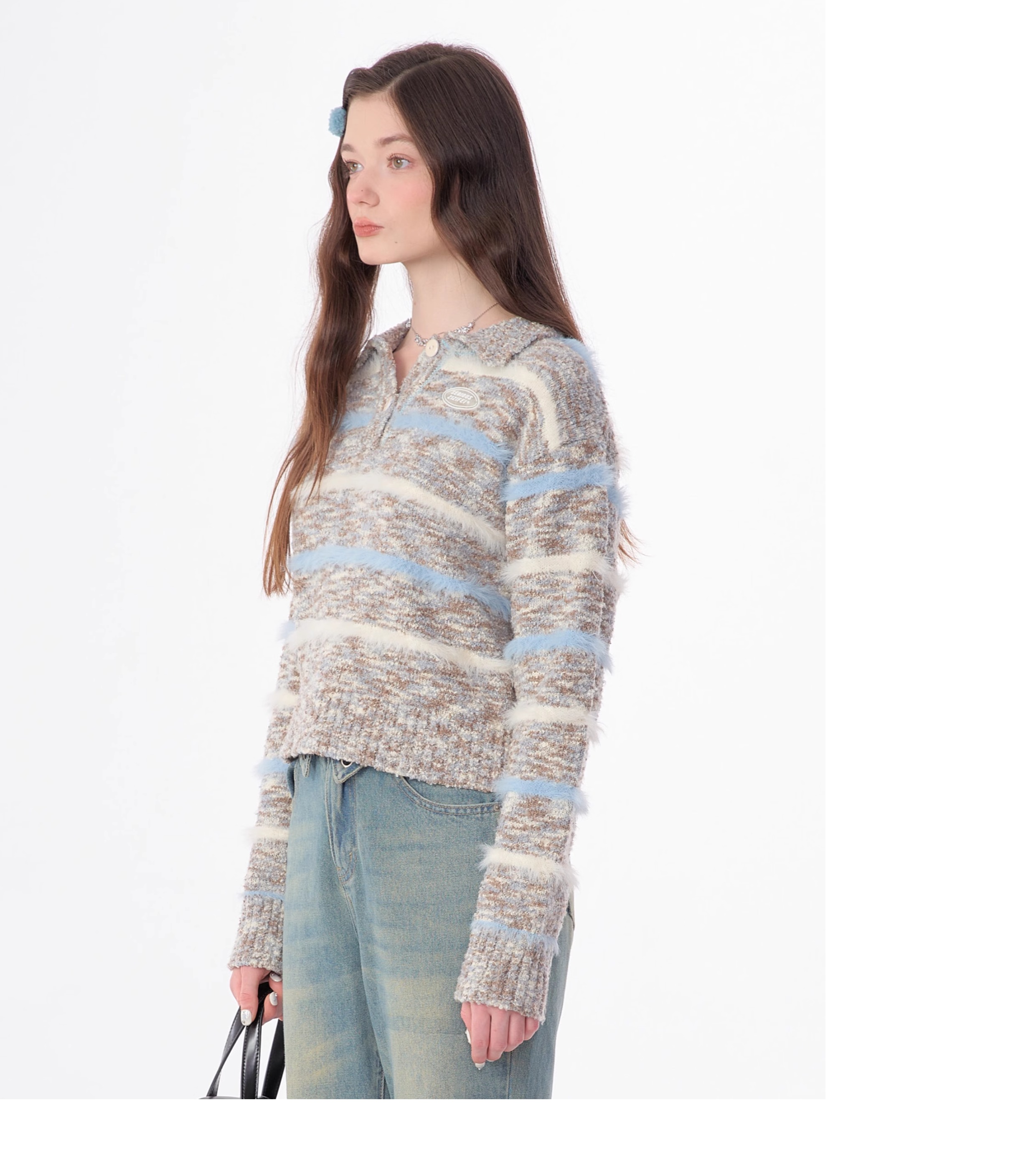 Suéter tipo polo a rayas en contraste | Sudadera con capucha retro de alta gama estilo perezoso para otoño/invierno