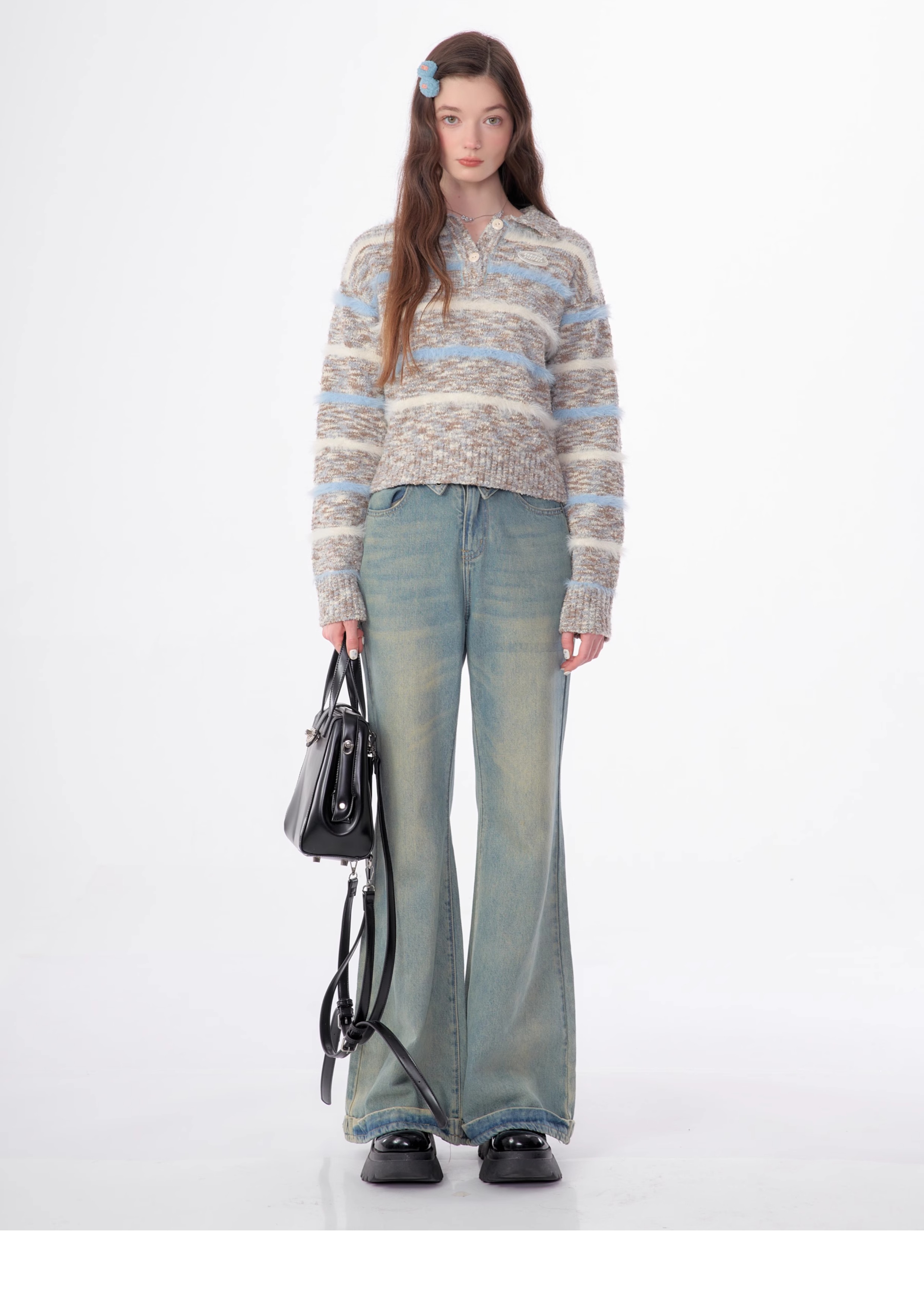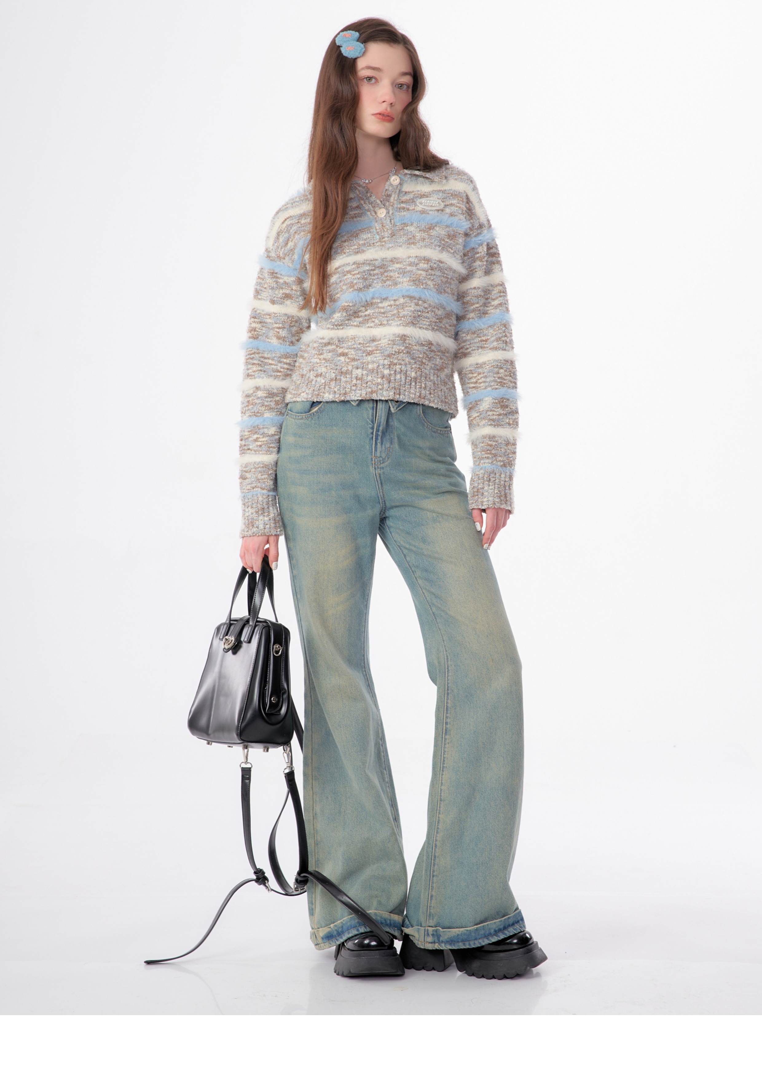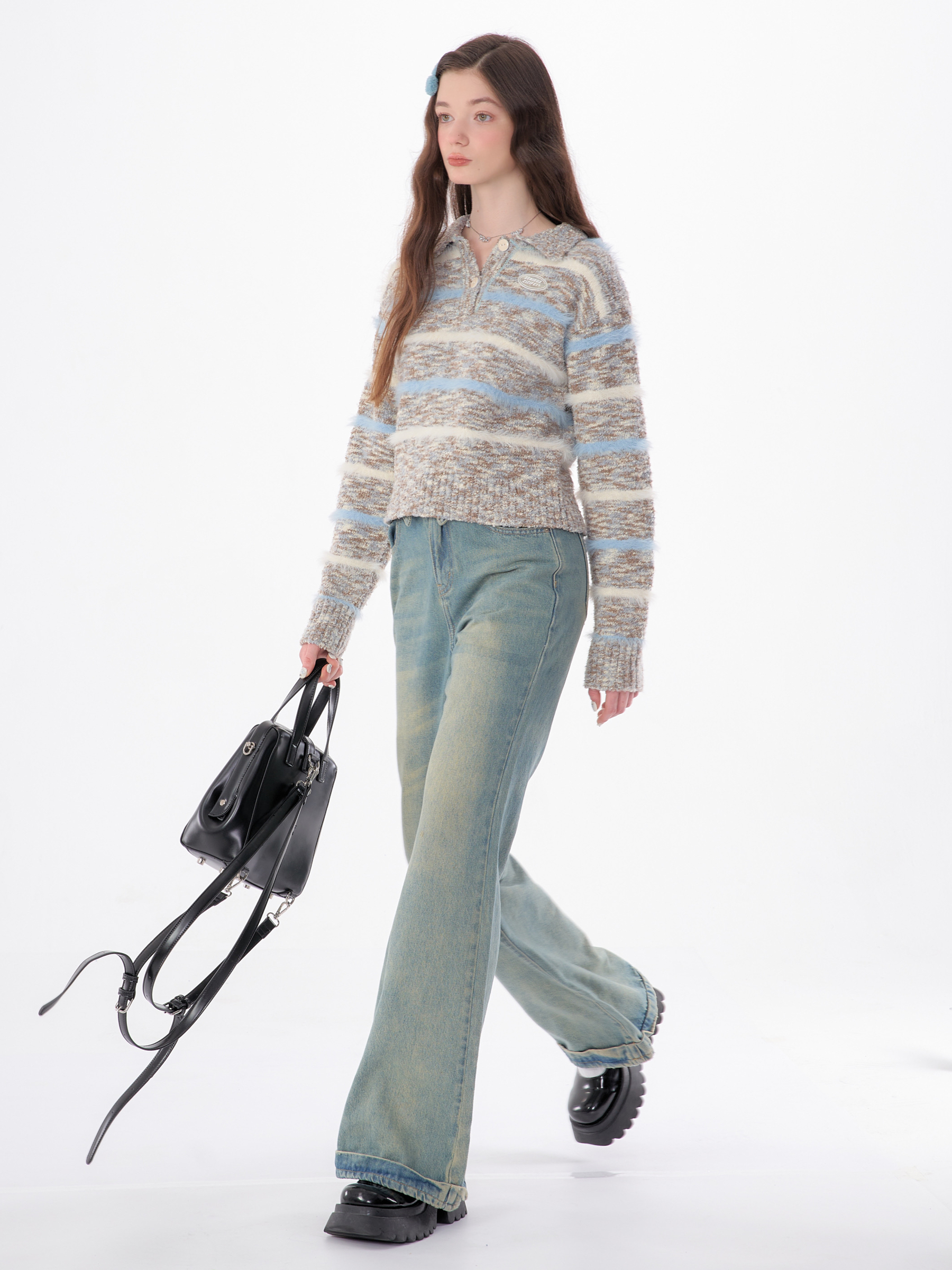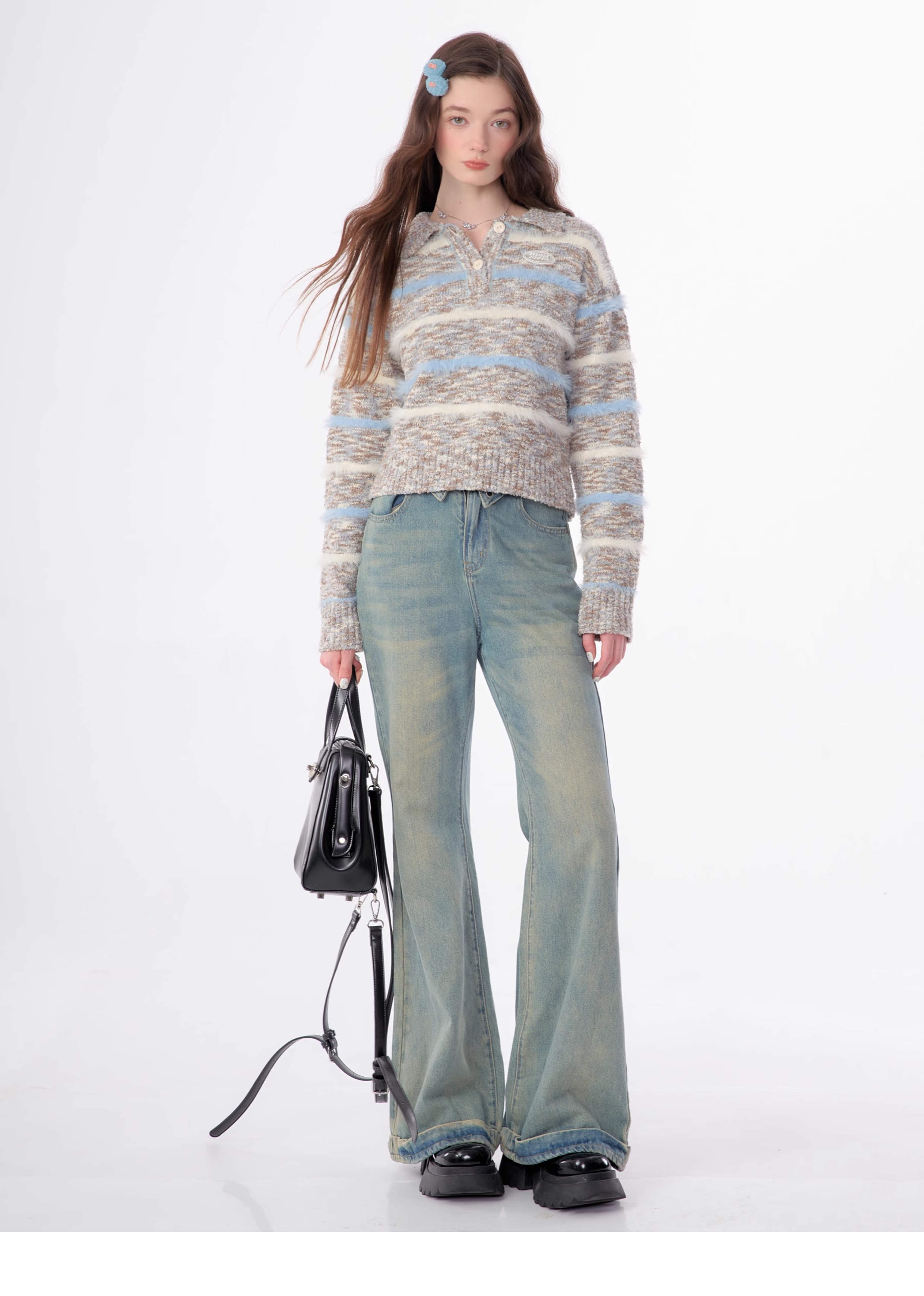 Suéter tipo polo a rayas en contraste | Sudadera con capucha retro de alta gama estilo perezoso para otoño/invierno