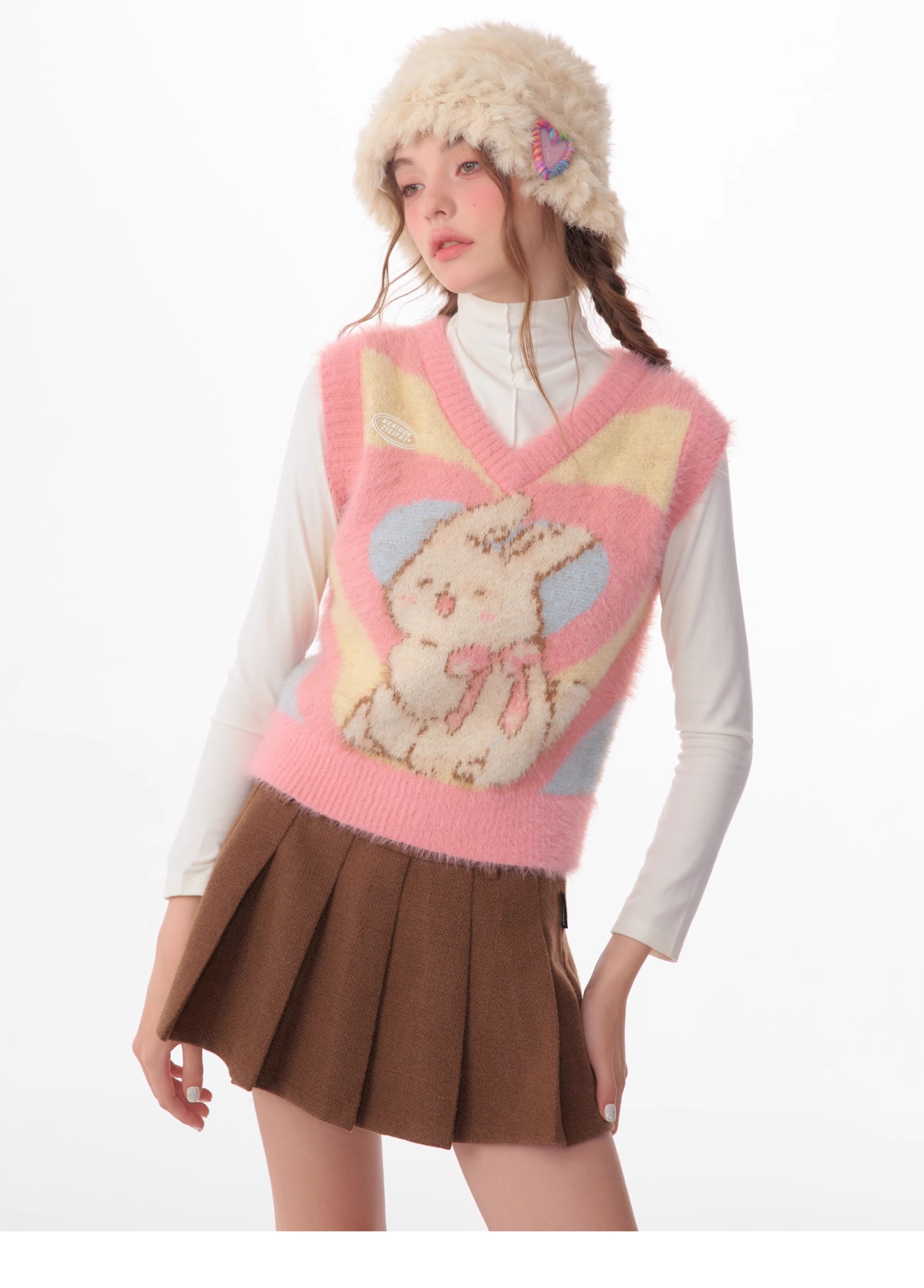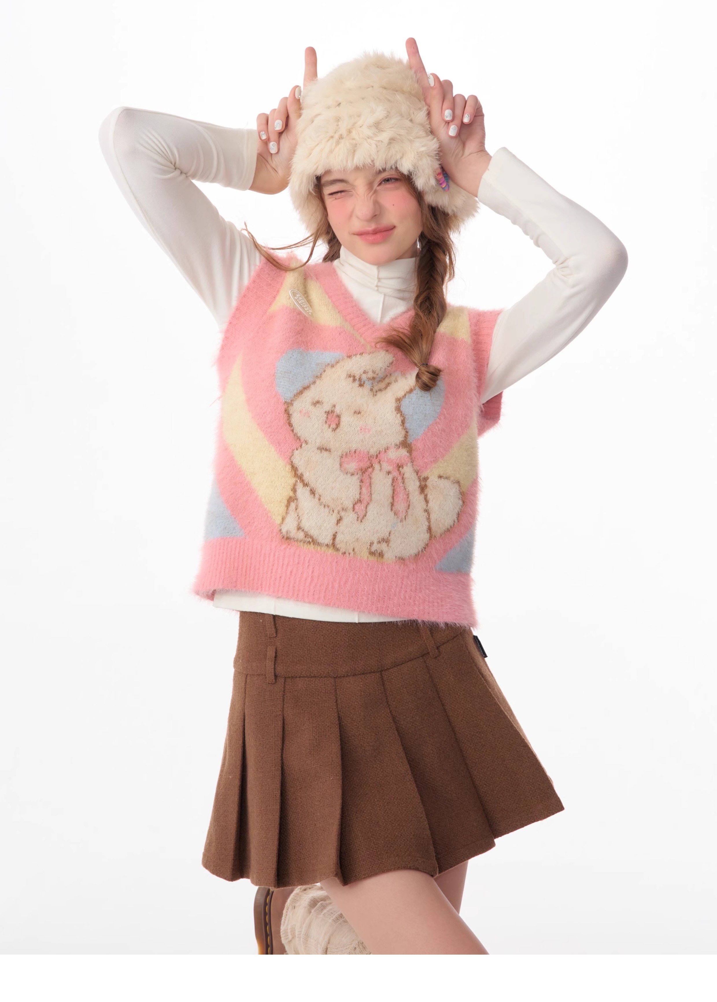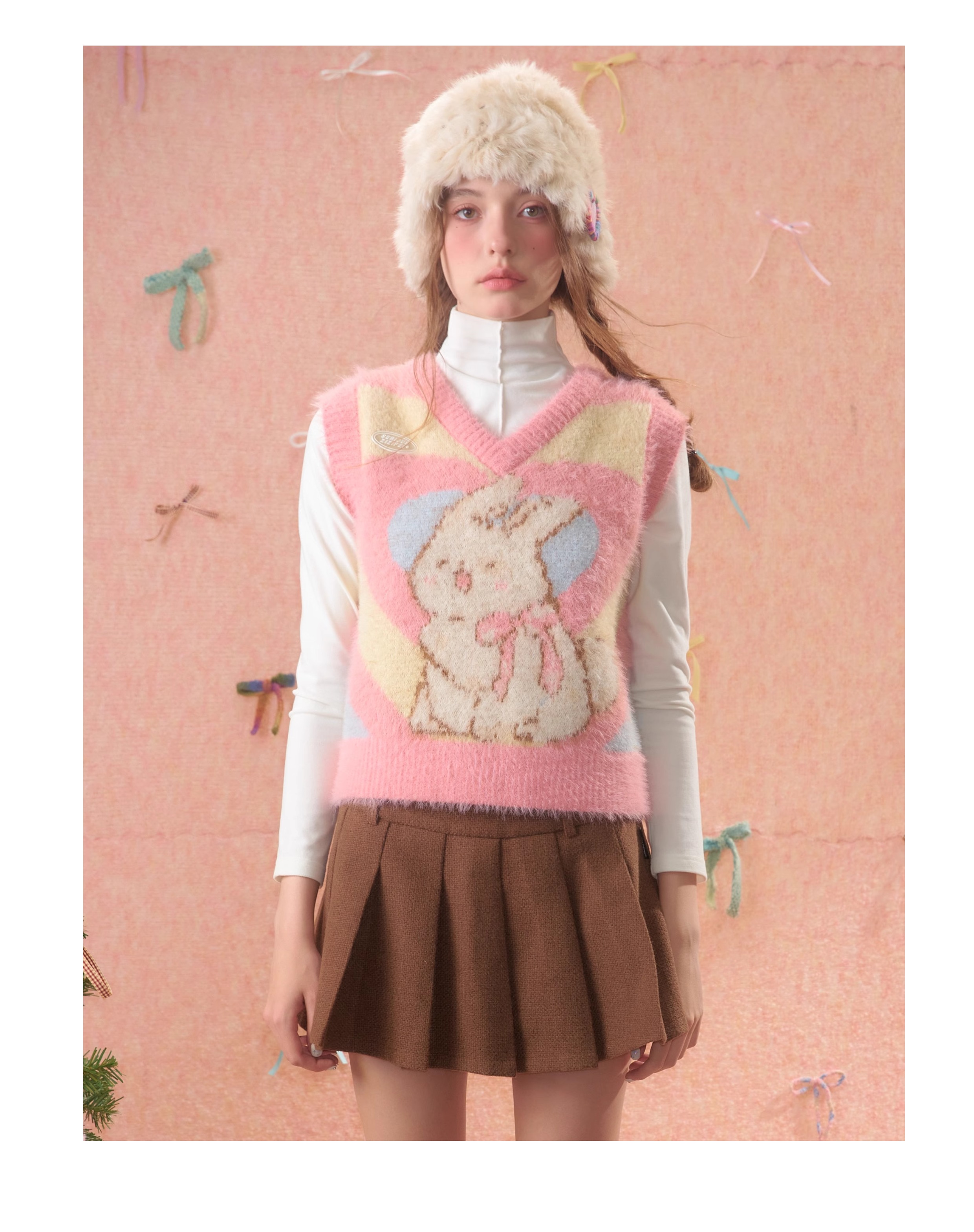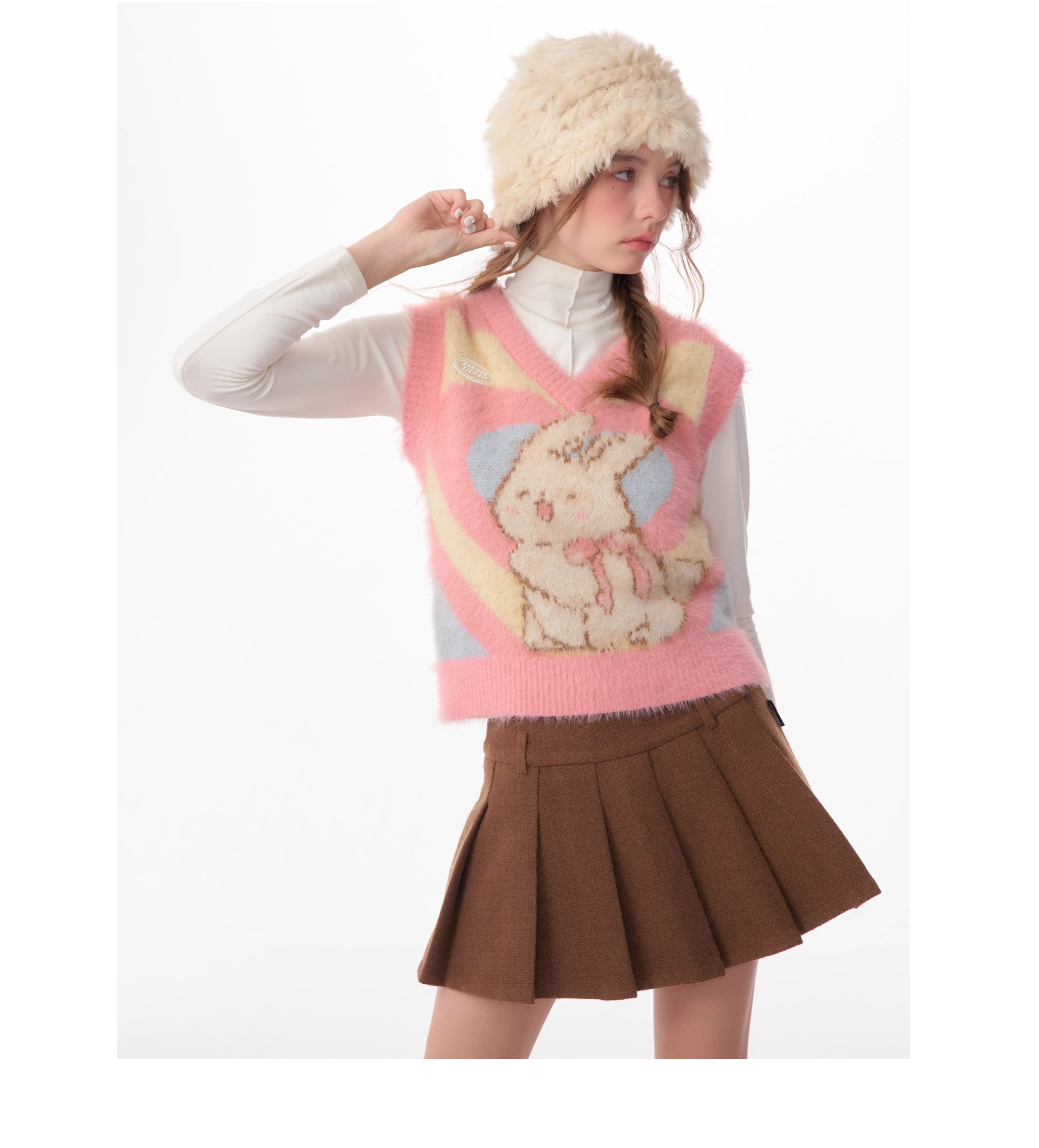 Camiseta sin mangas de punto Pink Rabbit Love | Suéter retro con cuello en V para otoño/invierno