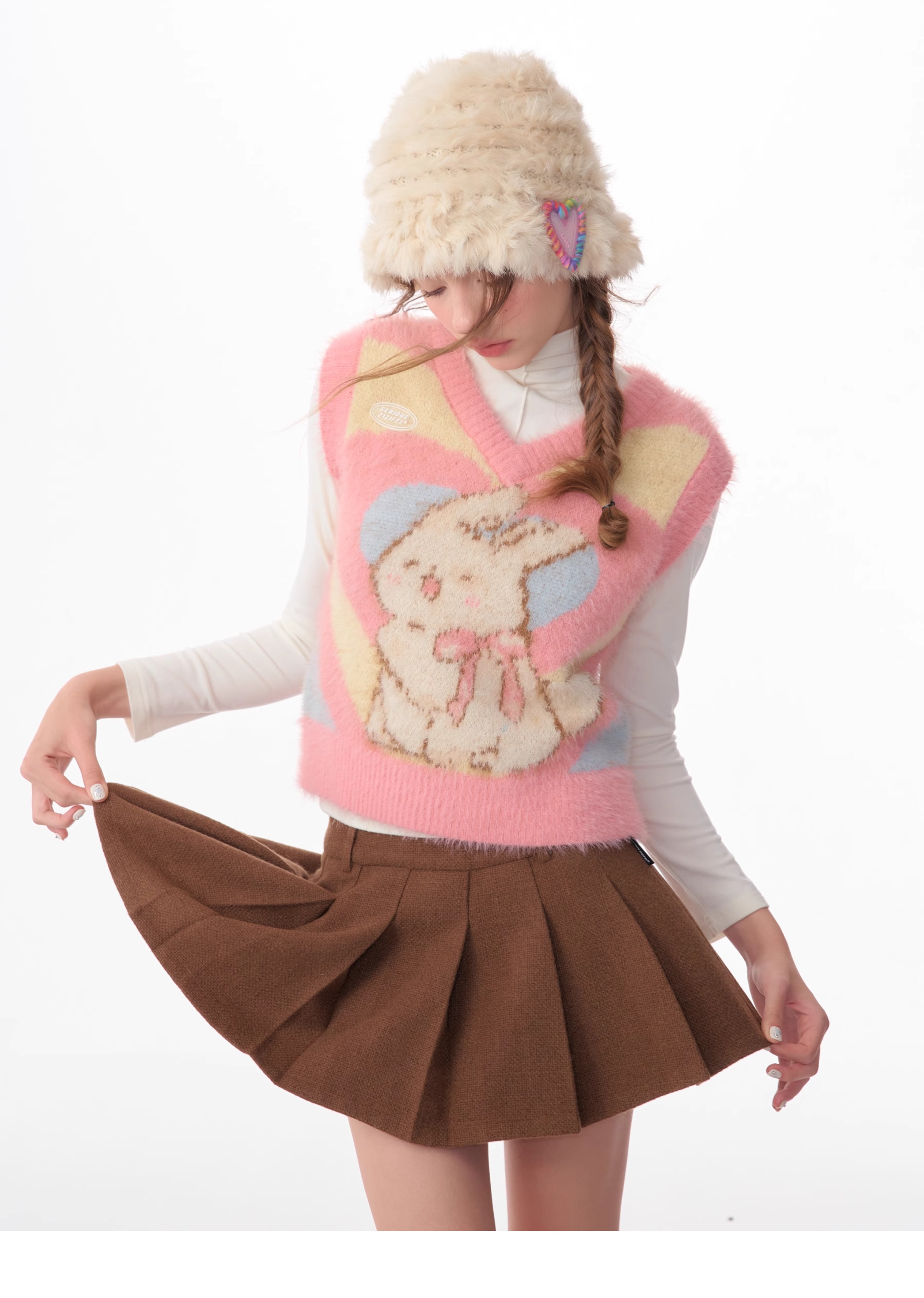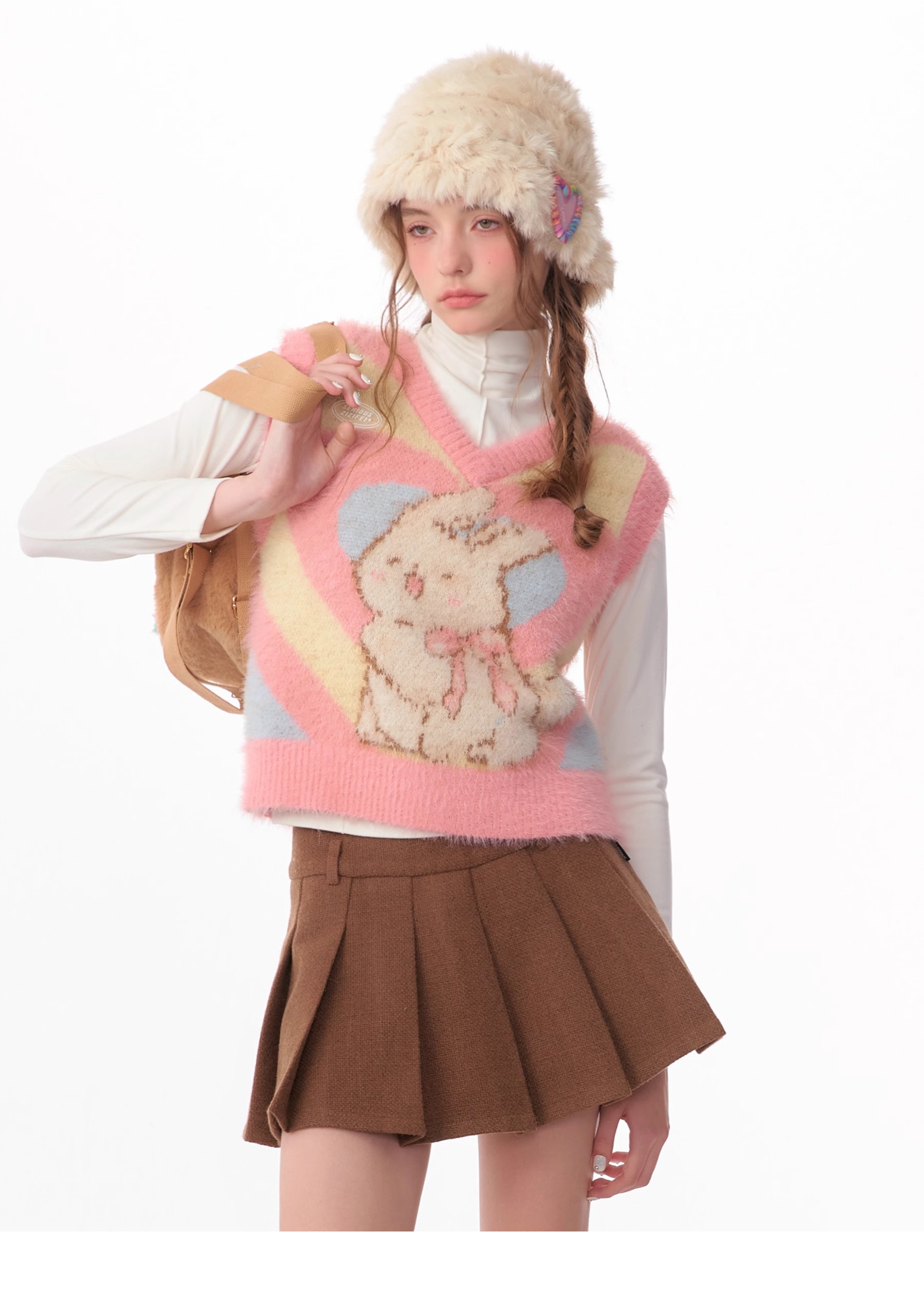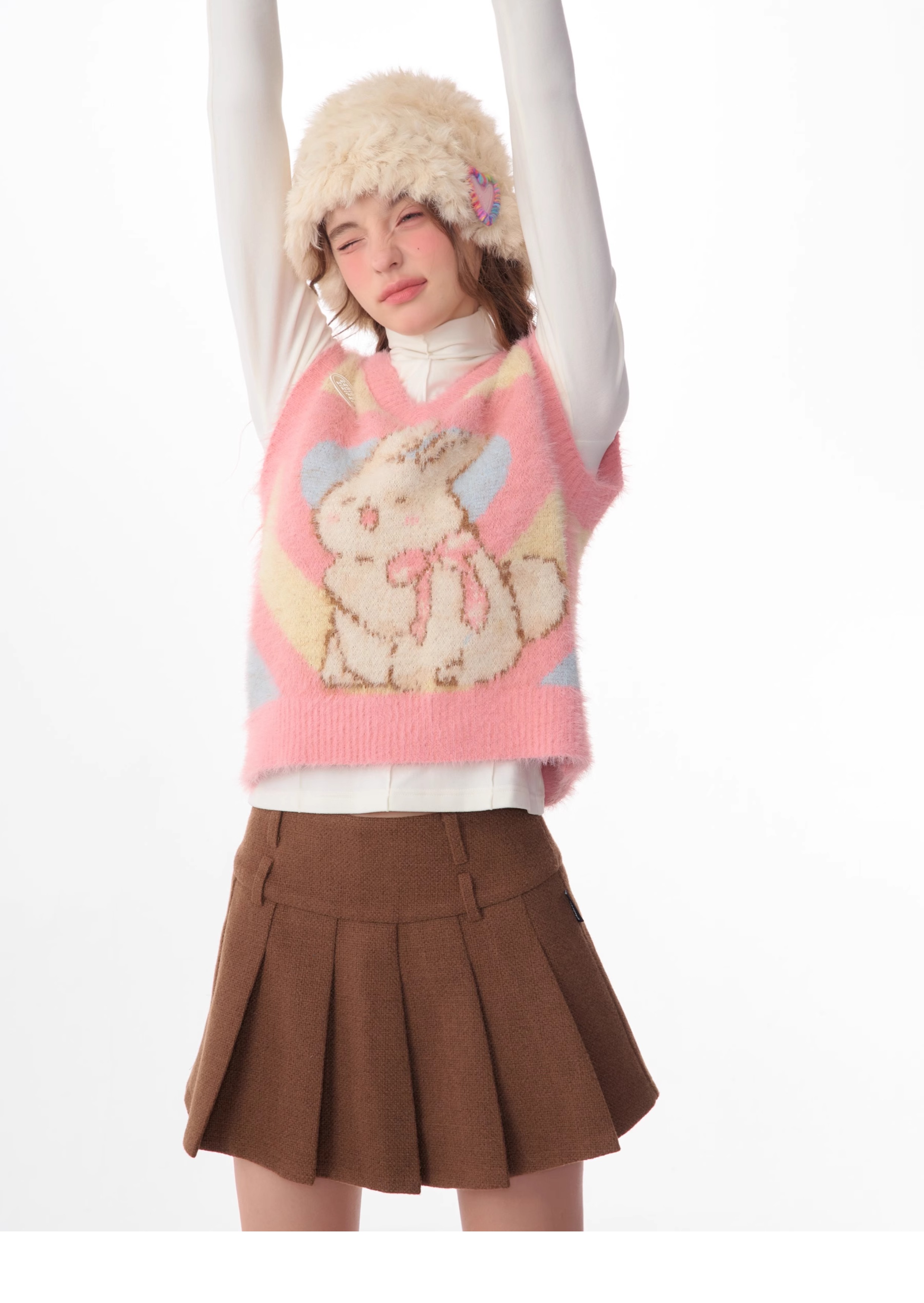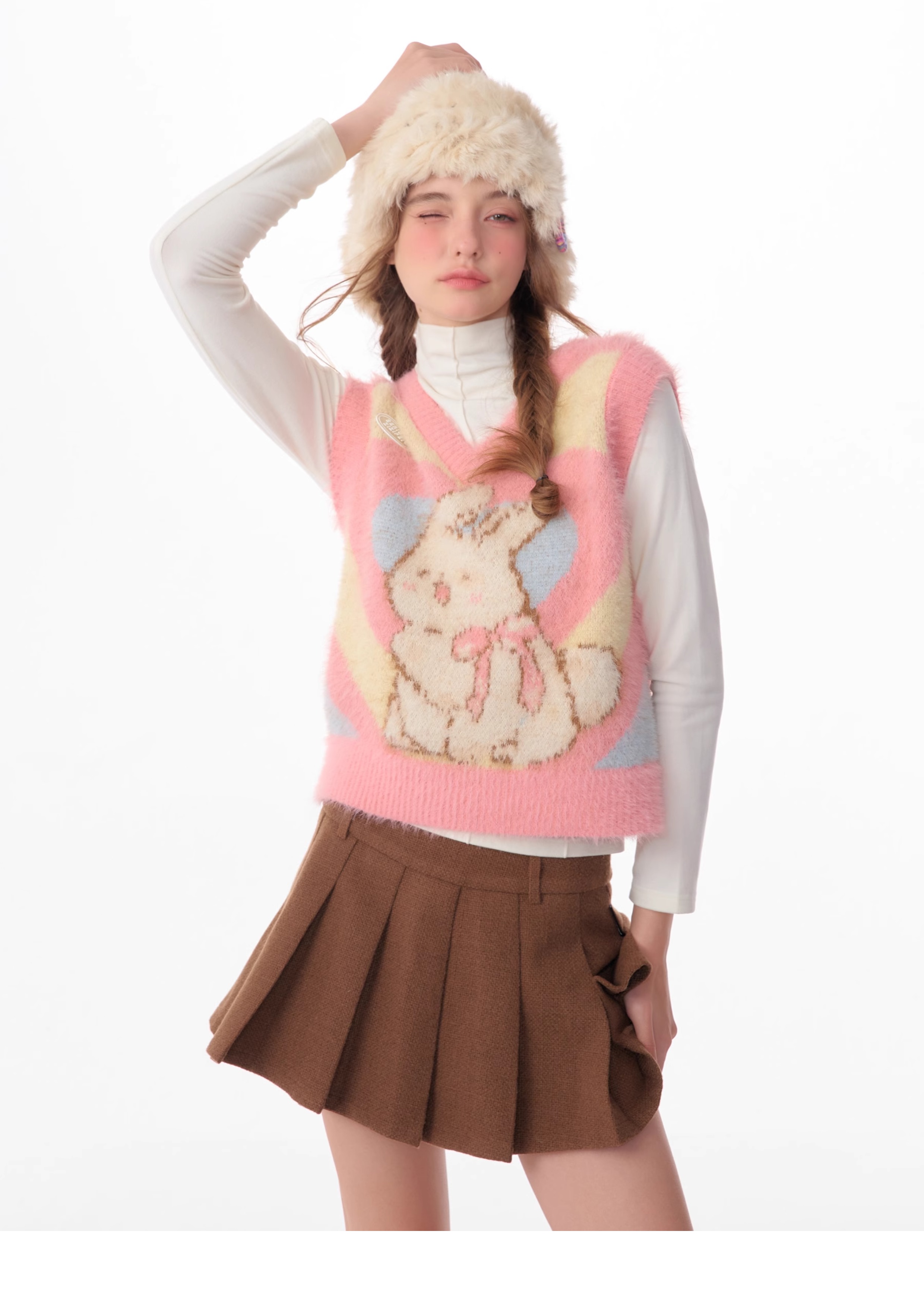 Camiseta sin mangas de punto Pink Rabbit Love | Suéter retro con cuello en V para otoño/invierno