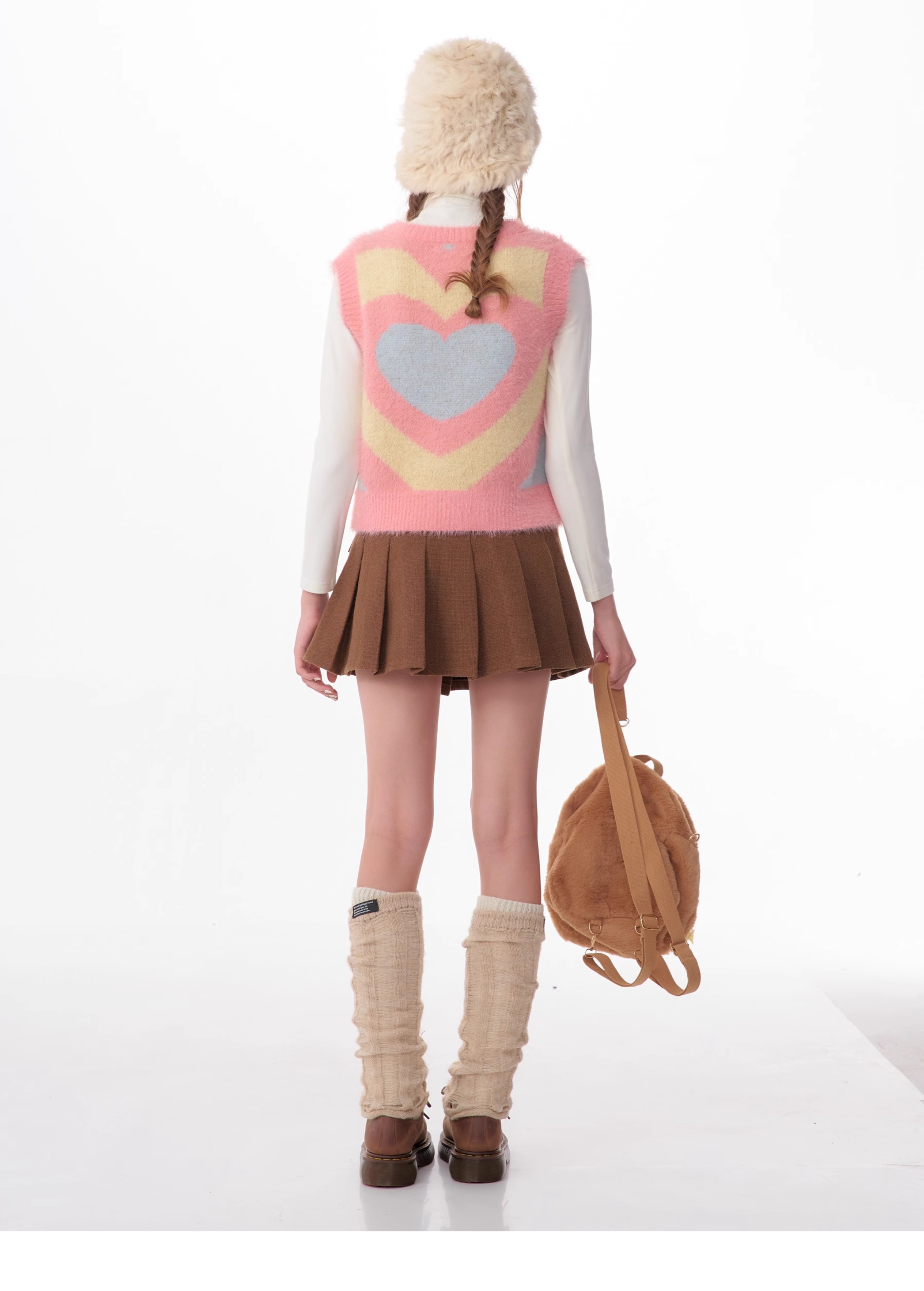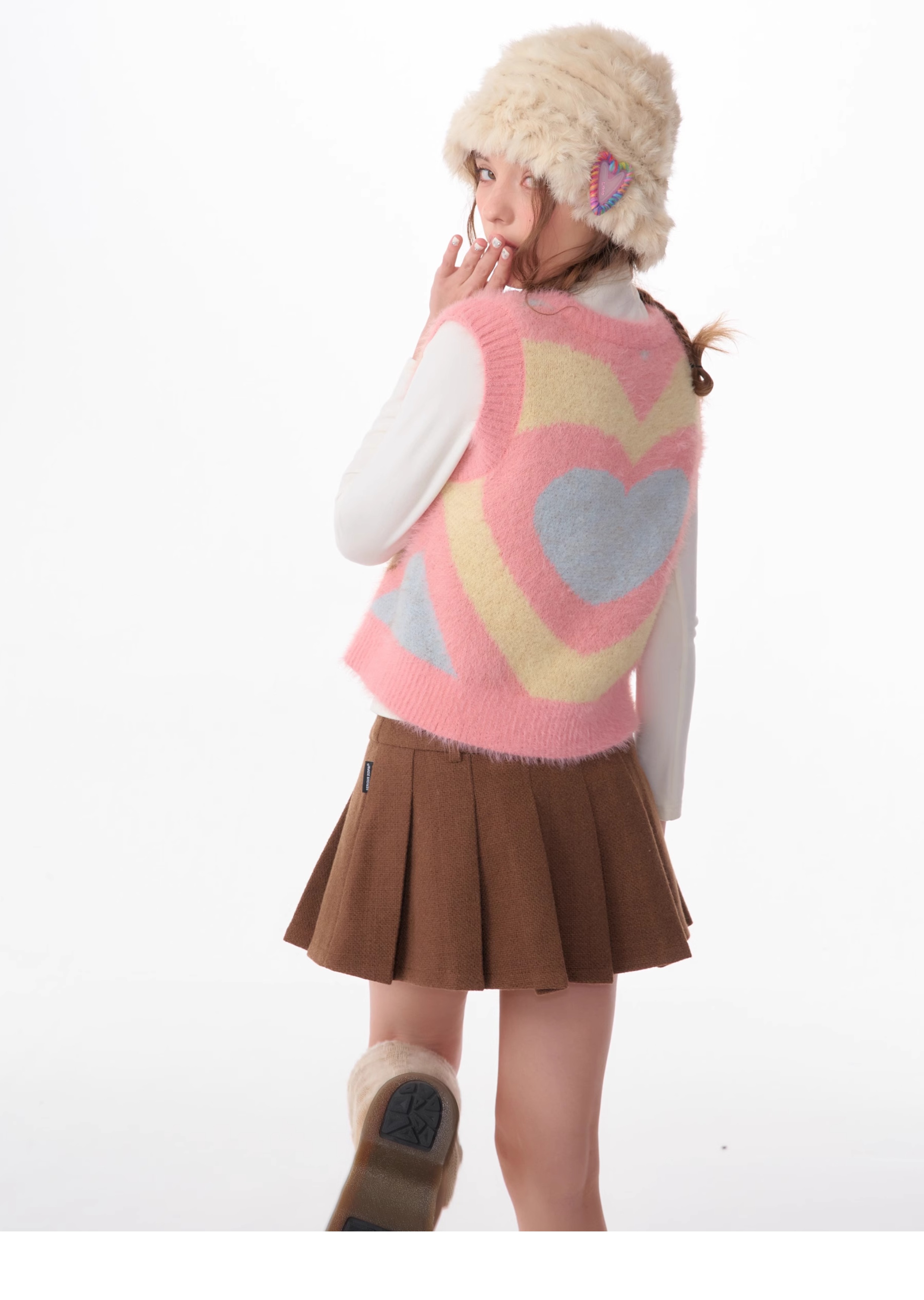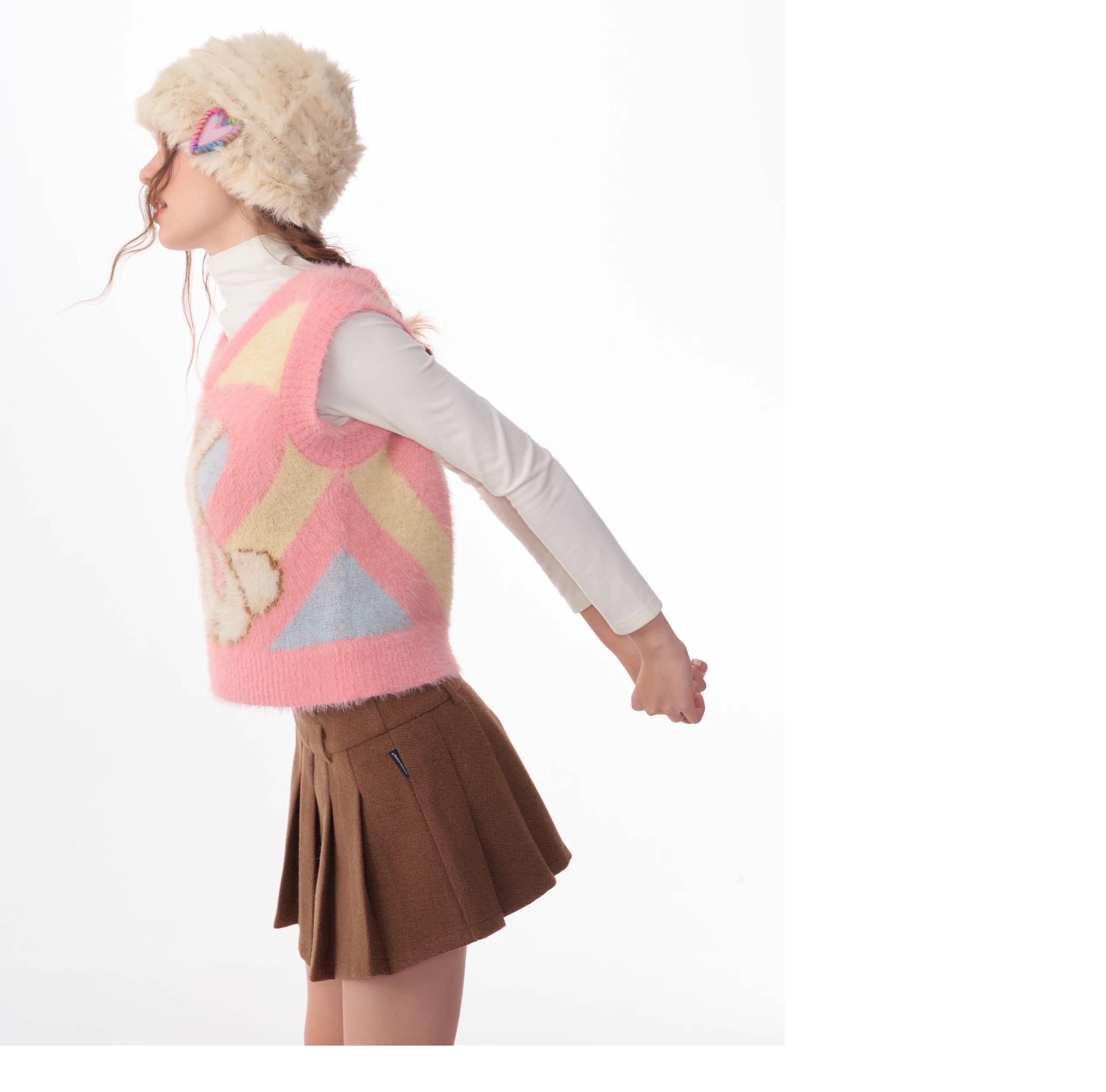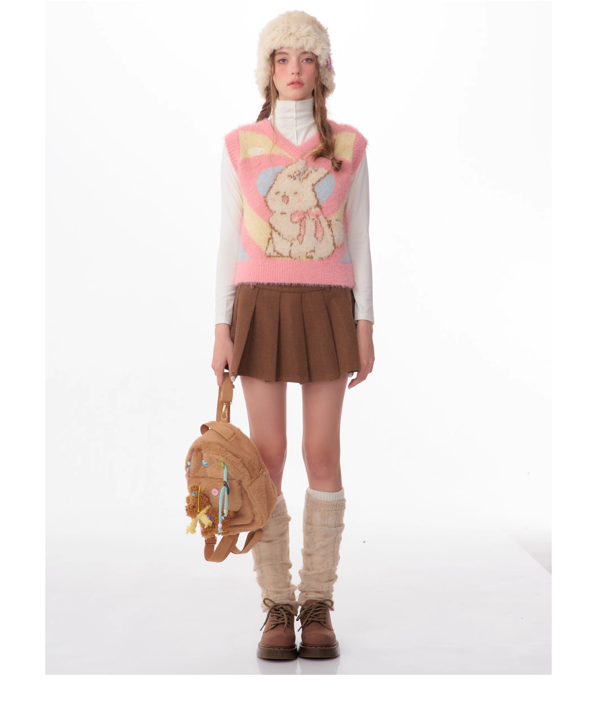 Camiseta sin mangas de punto Pink Rabbit Love | Suéter retro con cuello en V para otoño/invierno