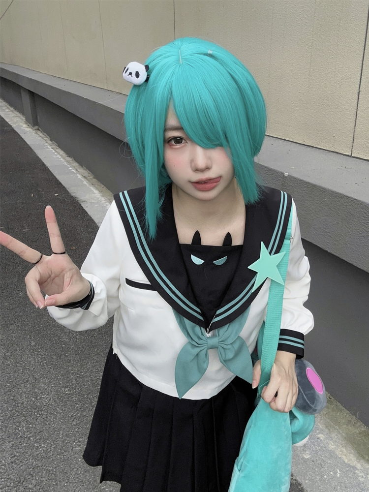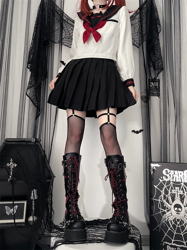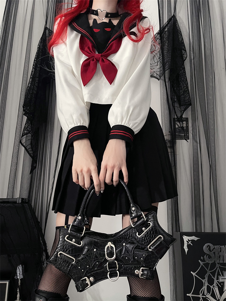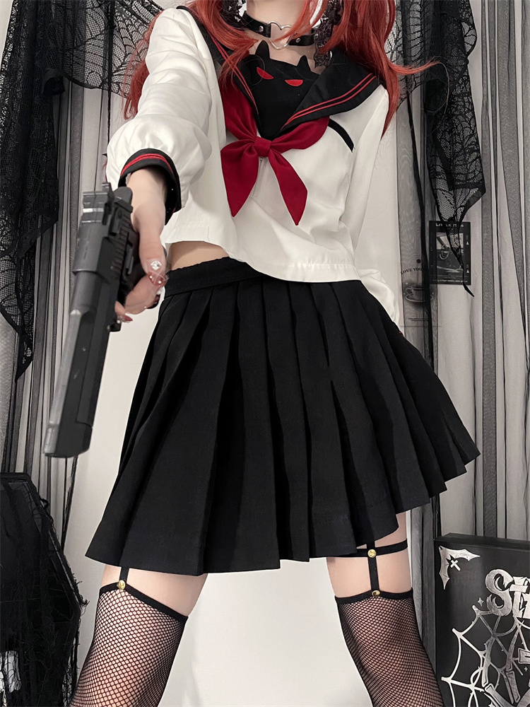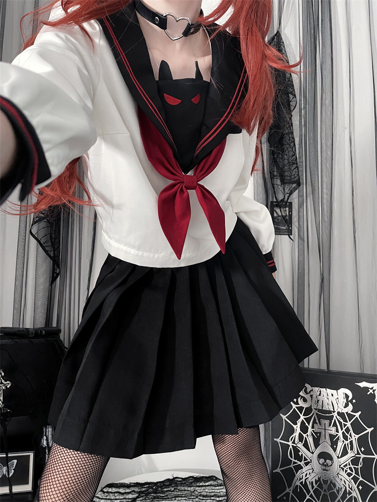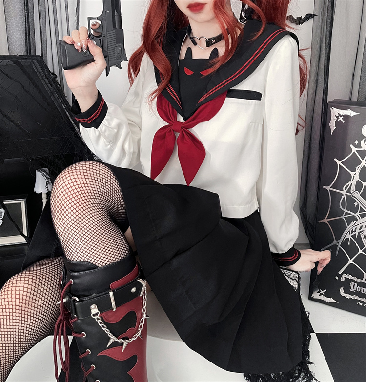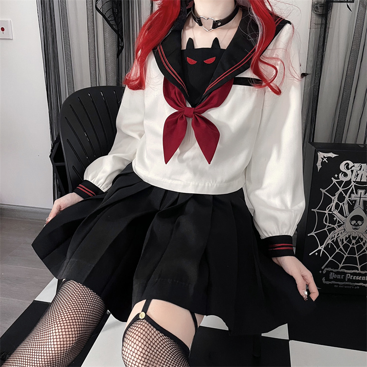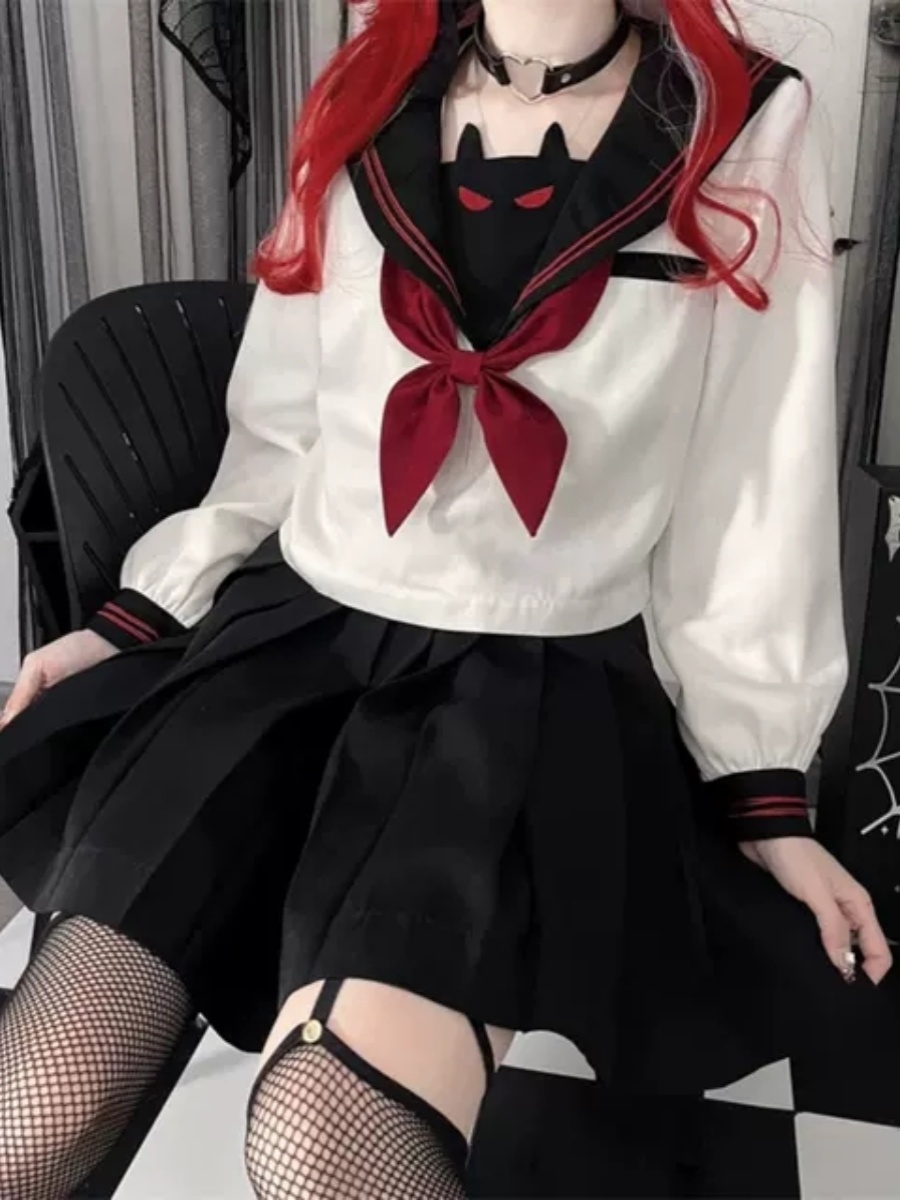 JK Uniform with Little Demon Embroidery Long-Sleeve Top