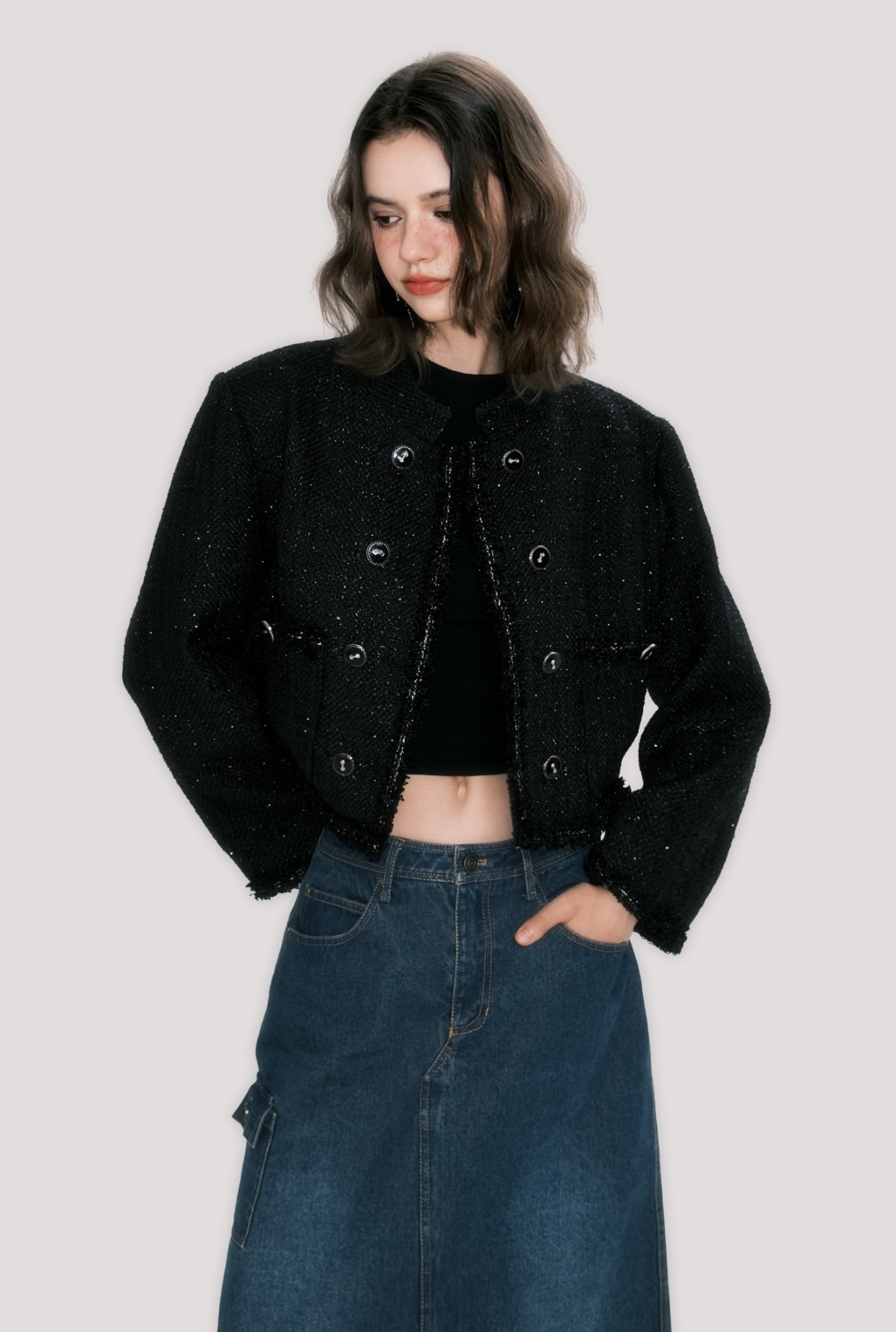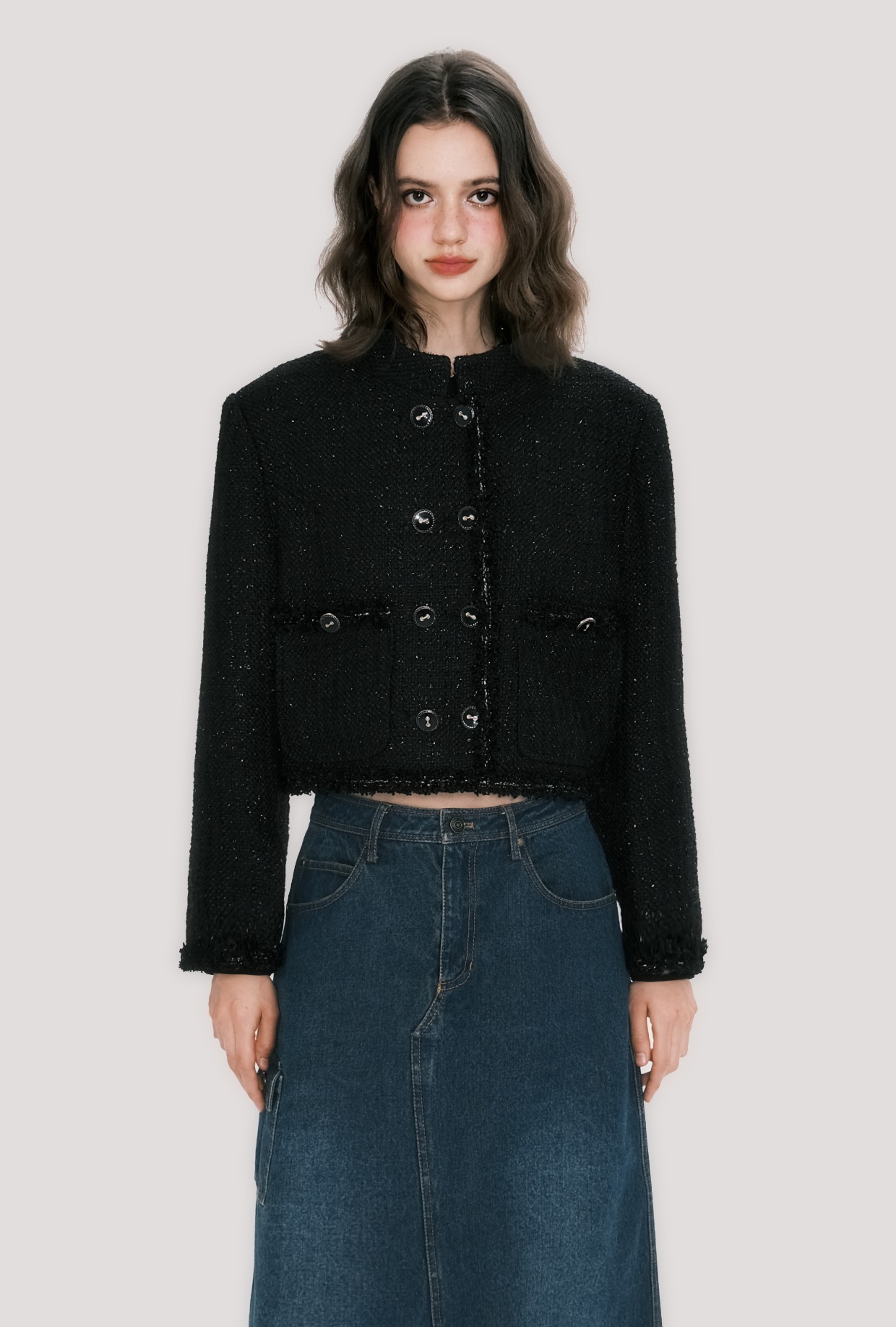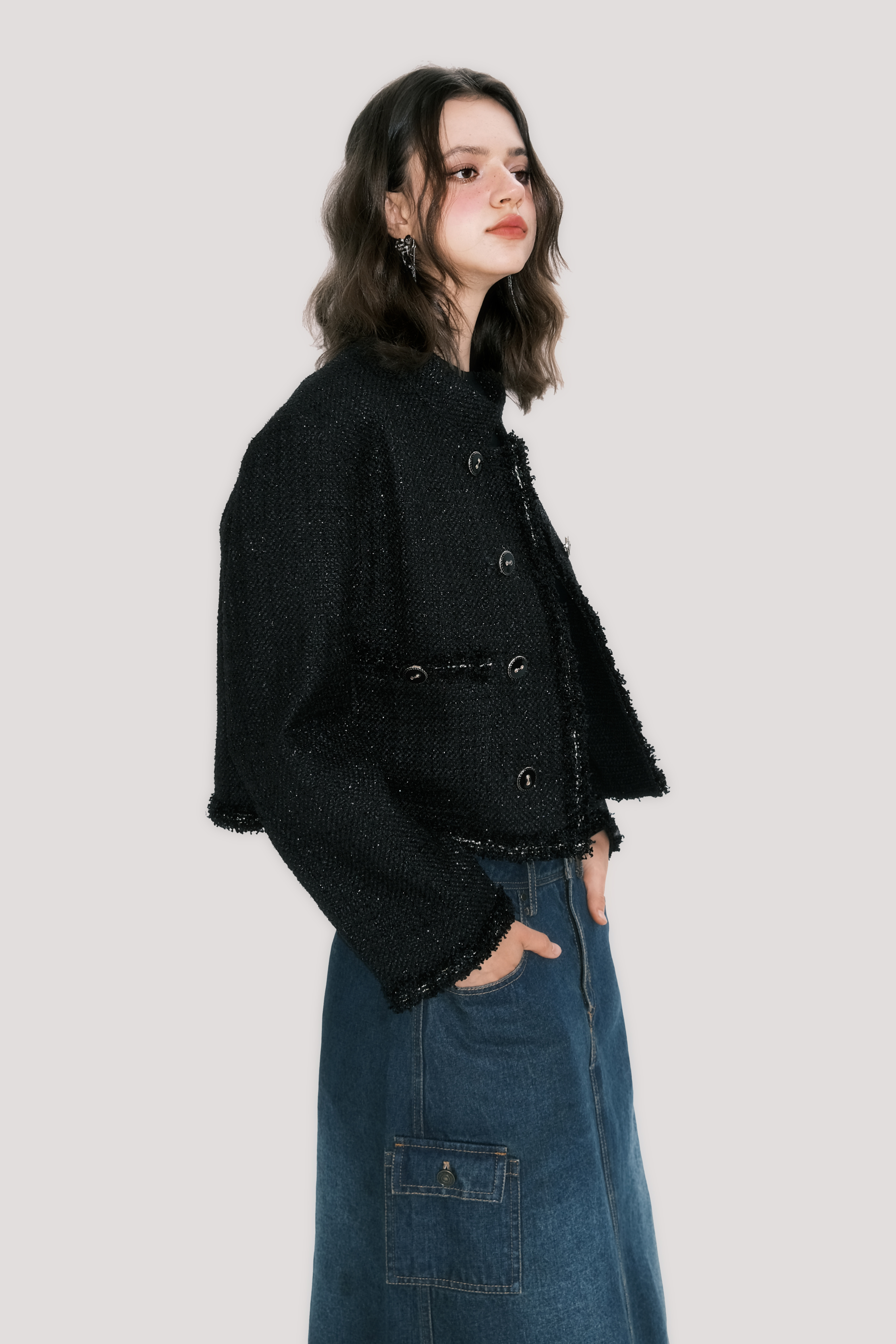 Abrigo corto con cuello dorado negro de Sassy Miss