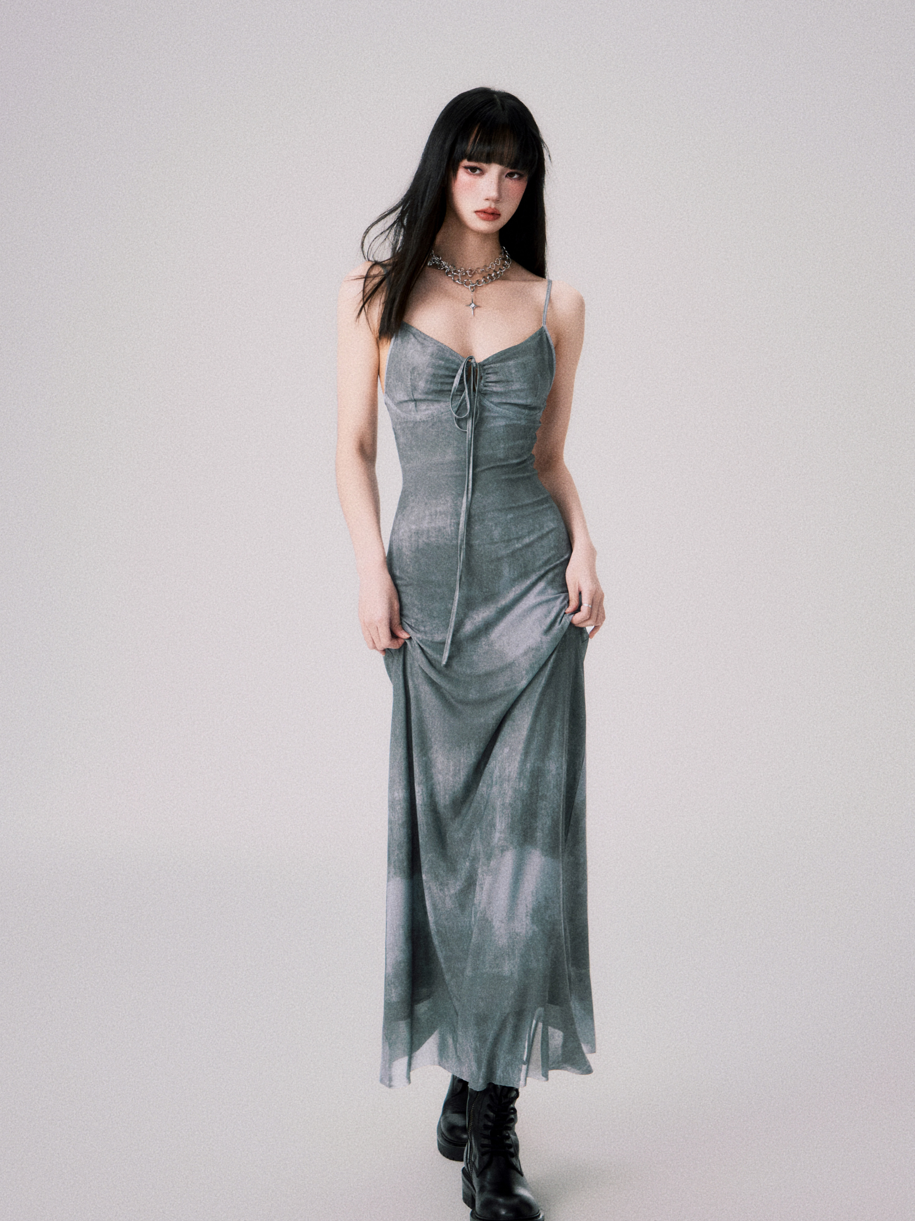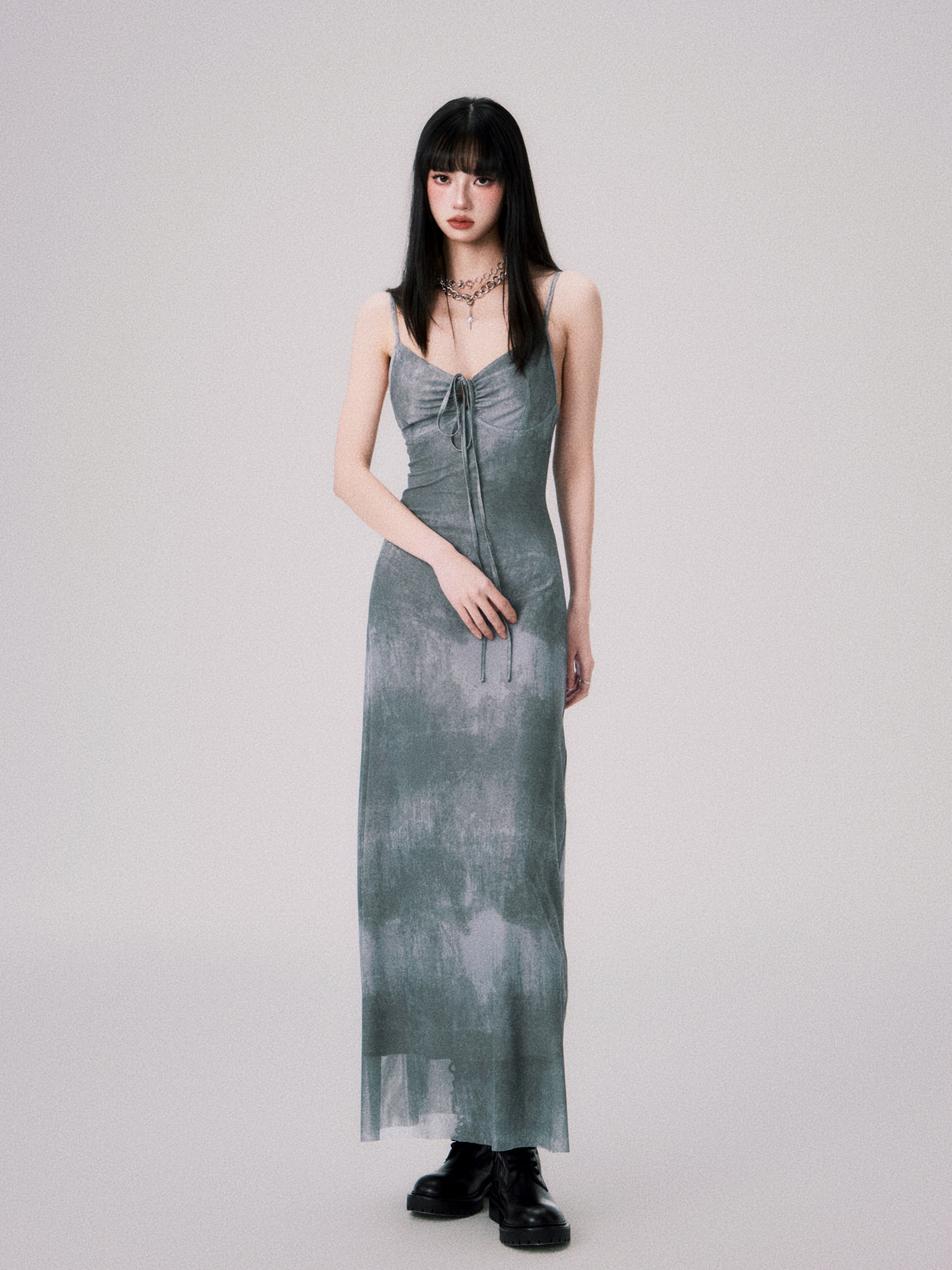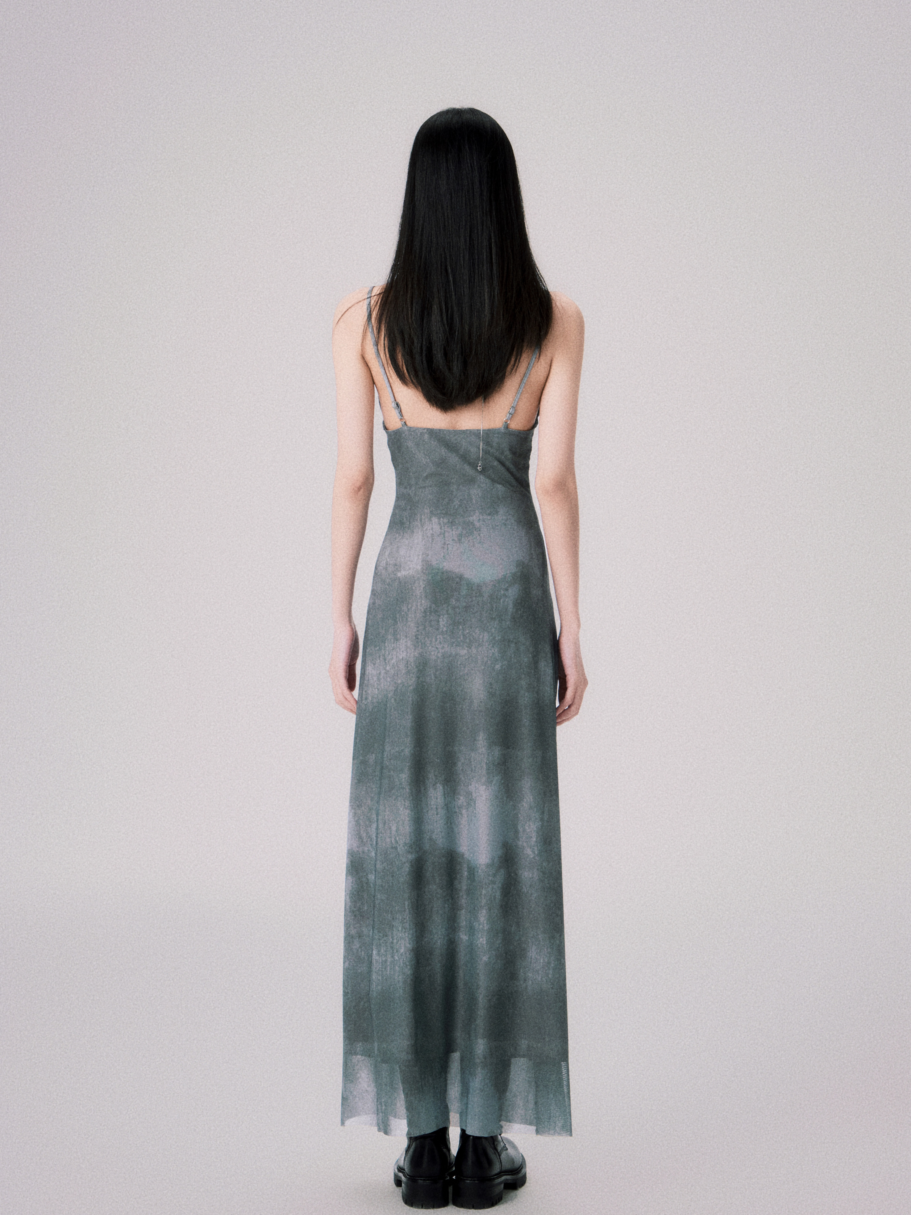Vintage Tie-Dye Grey Green Mesh Stretch Slip Dress