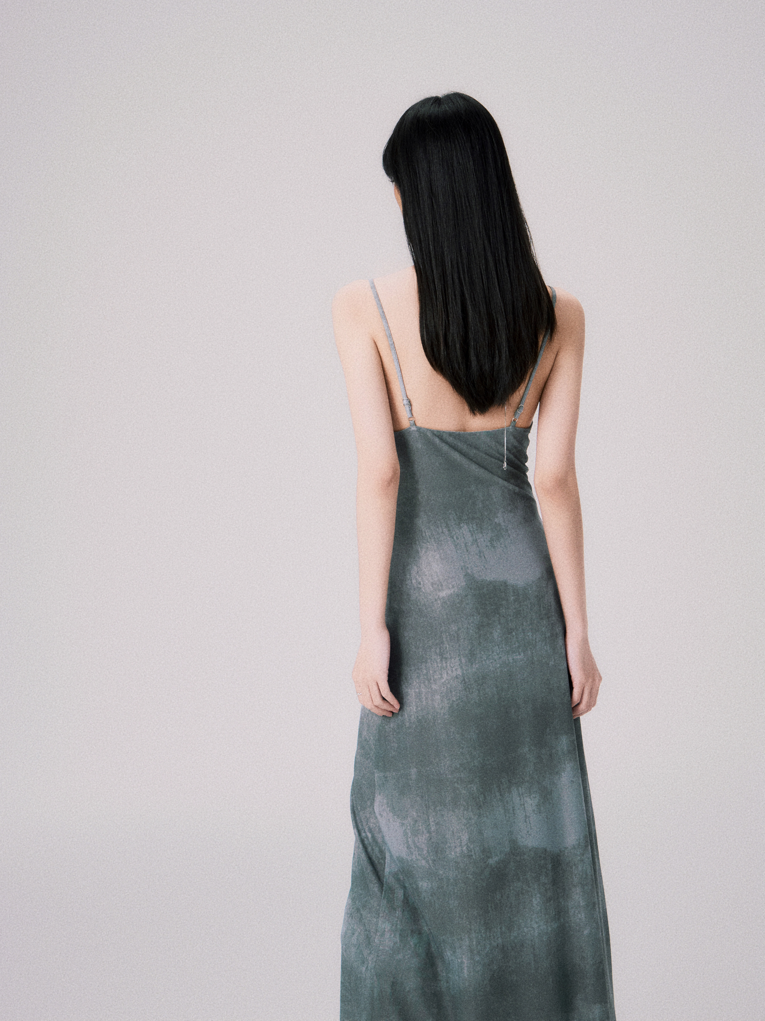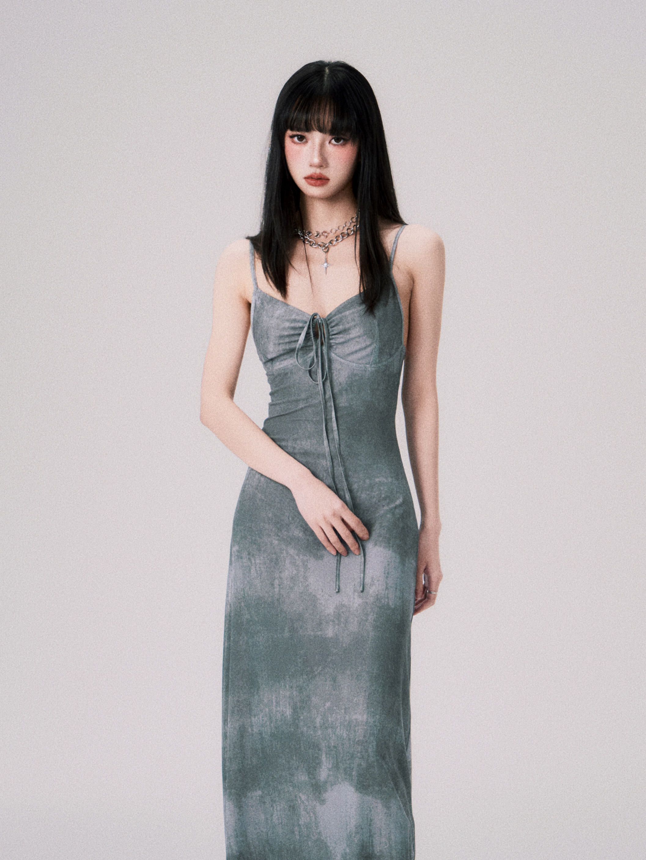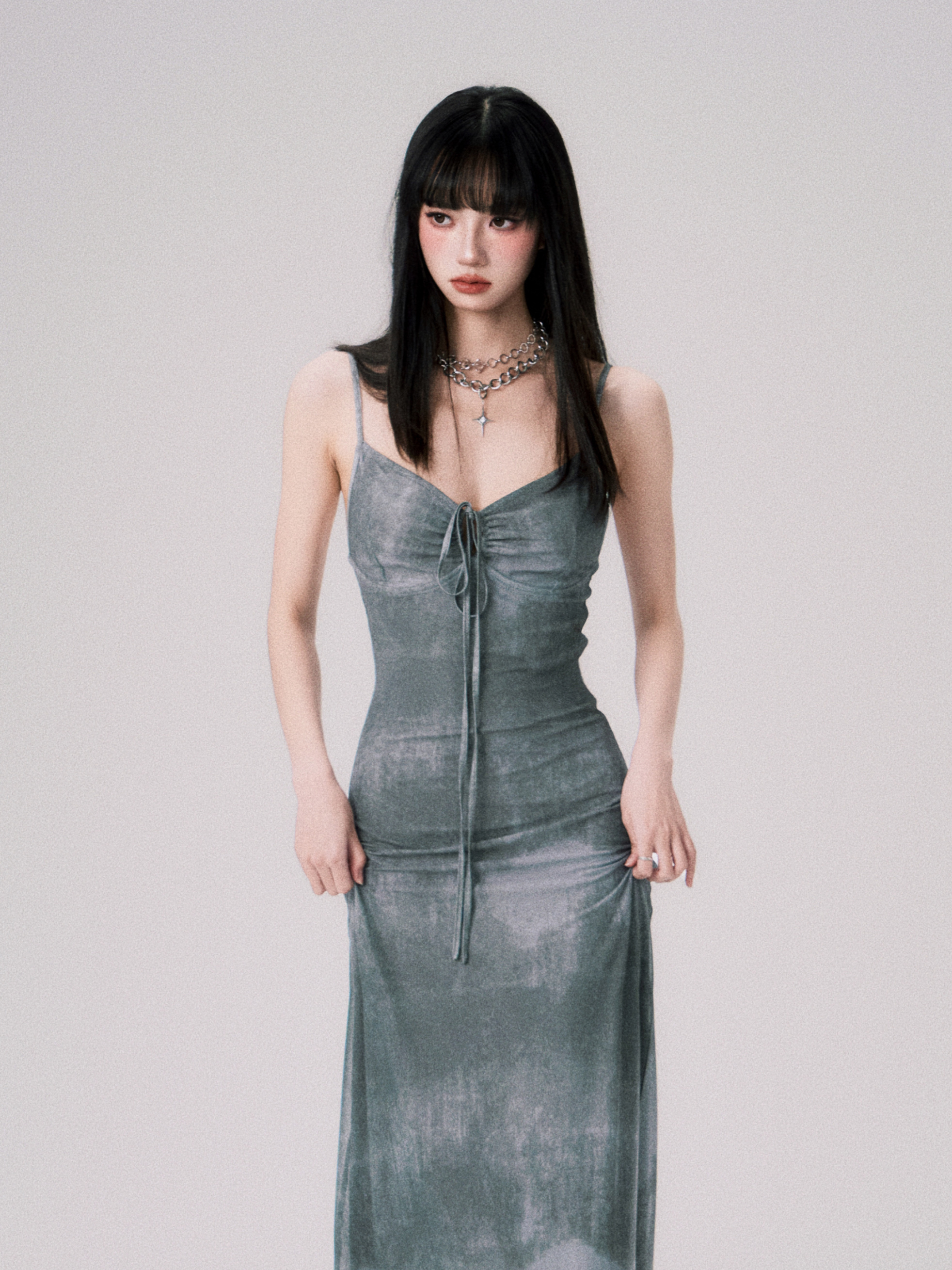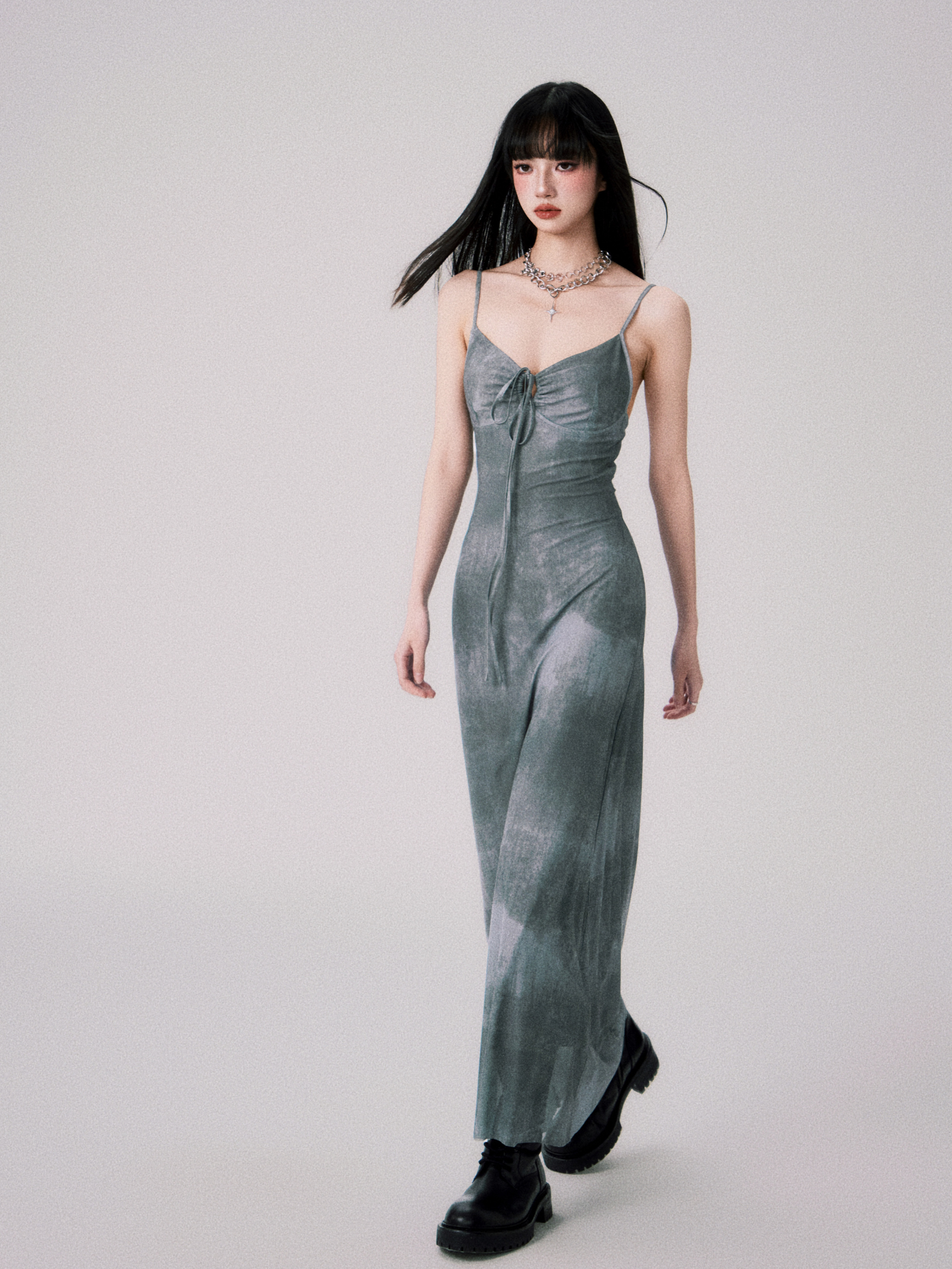 Vintage Tie-Dye Grey Green Mesh Stretch Slip Dress