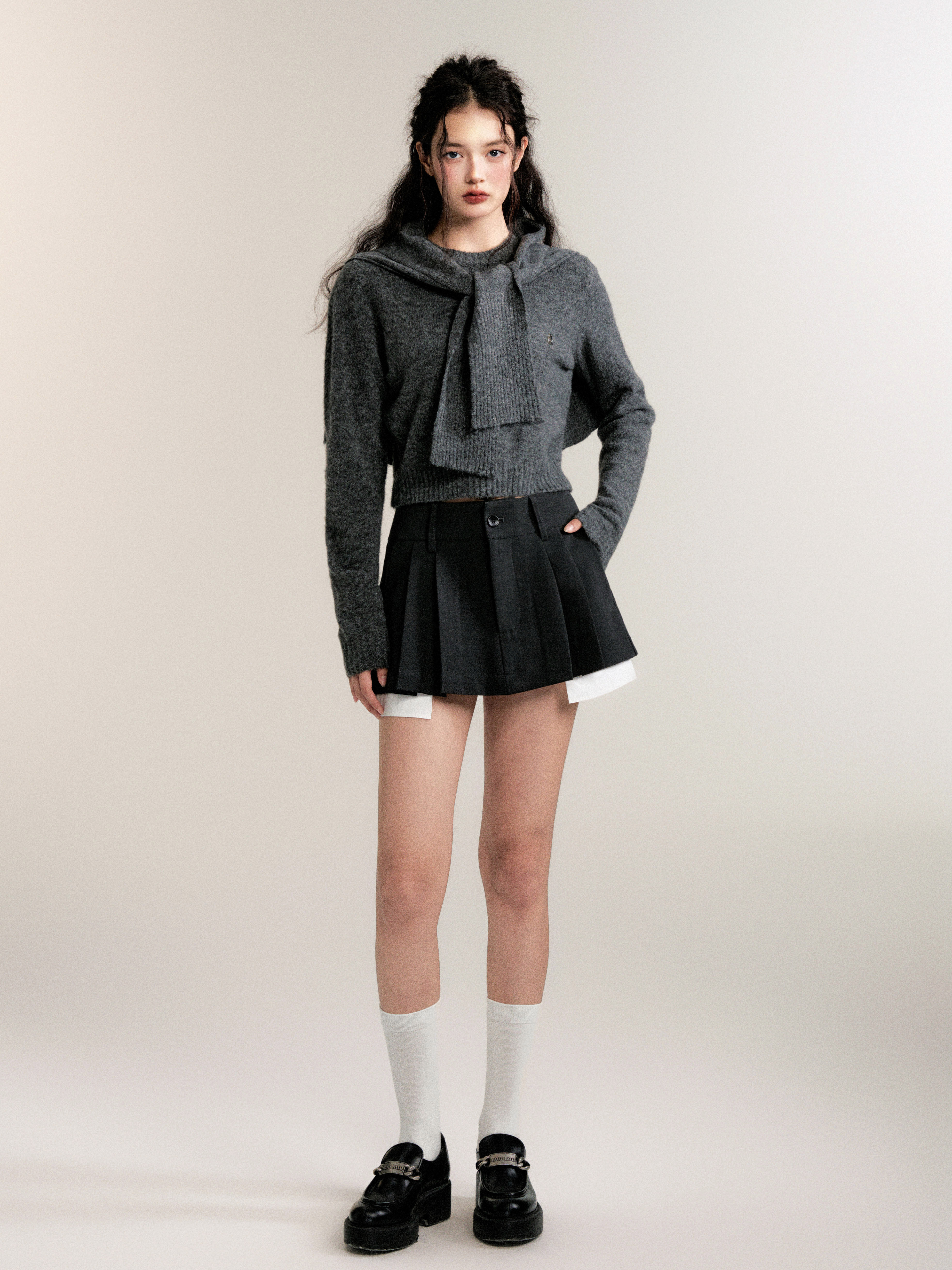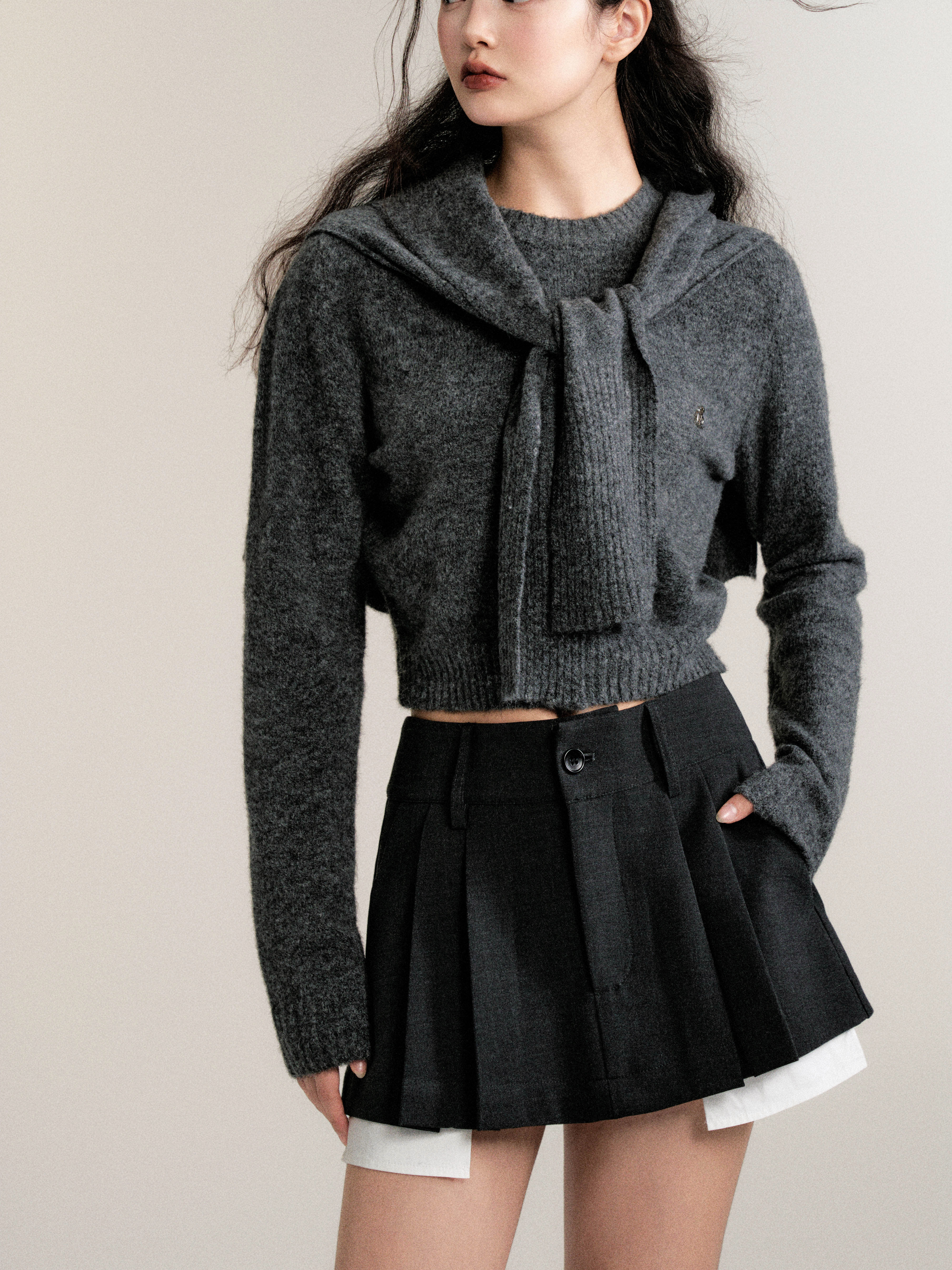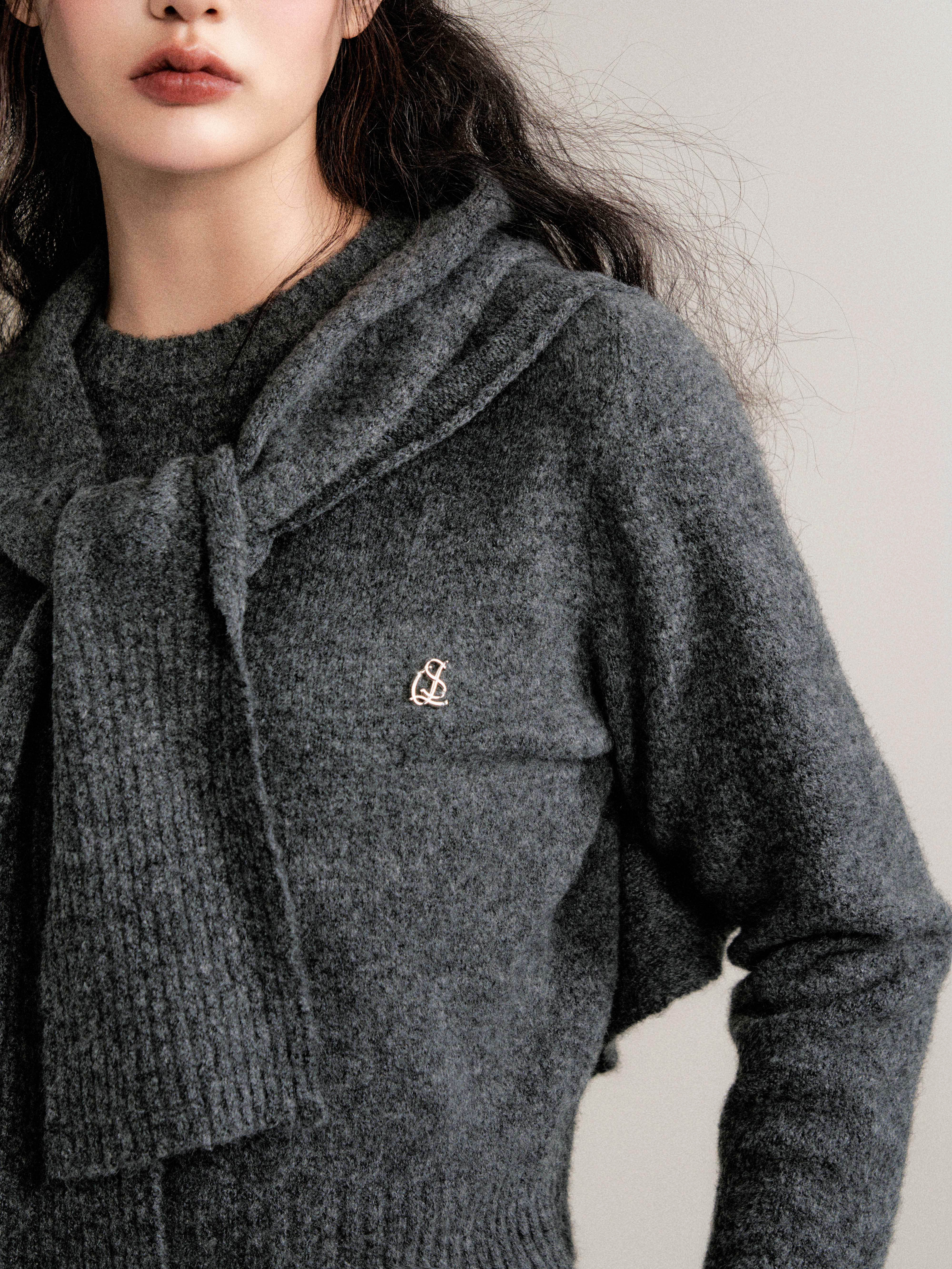 Premium Gray Belt Scarf Wool Sweater with Elegant Design