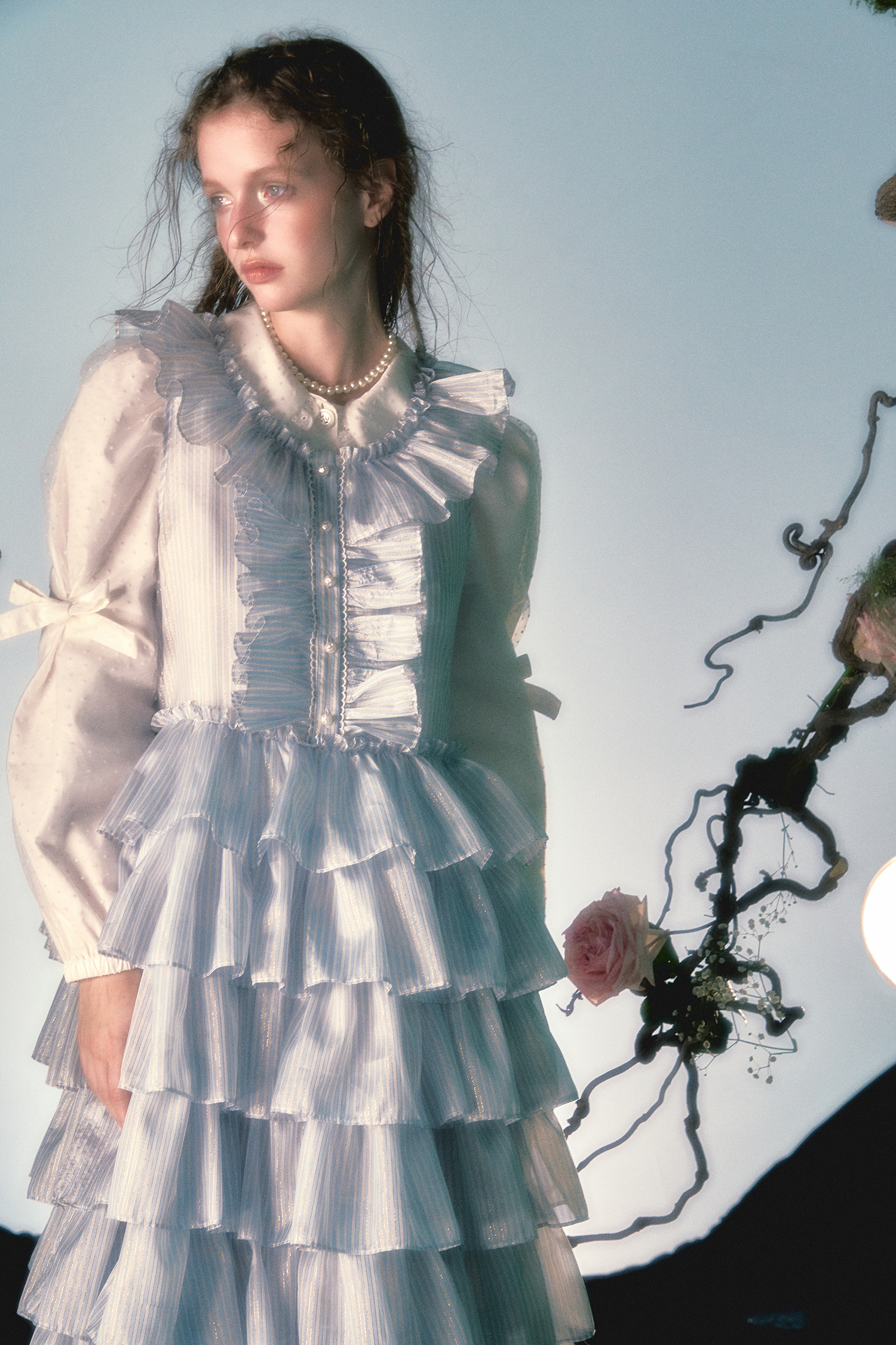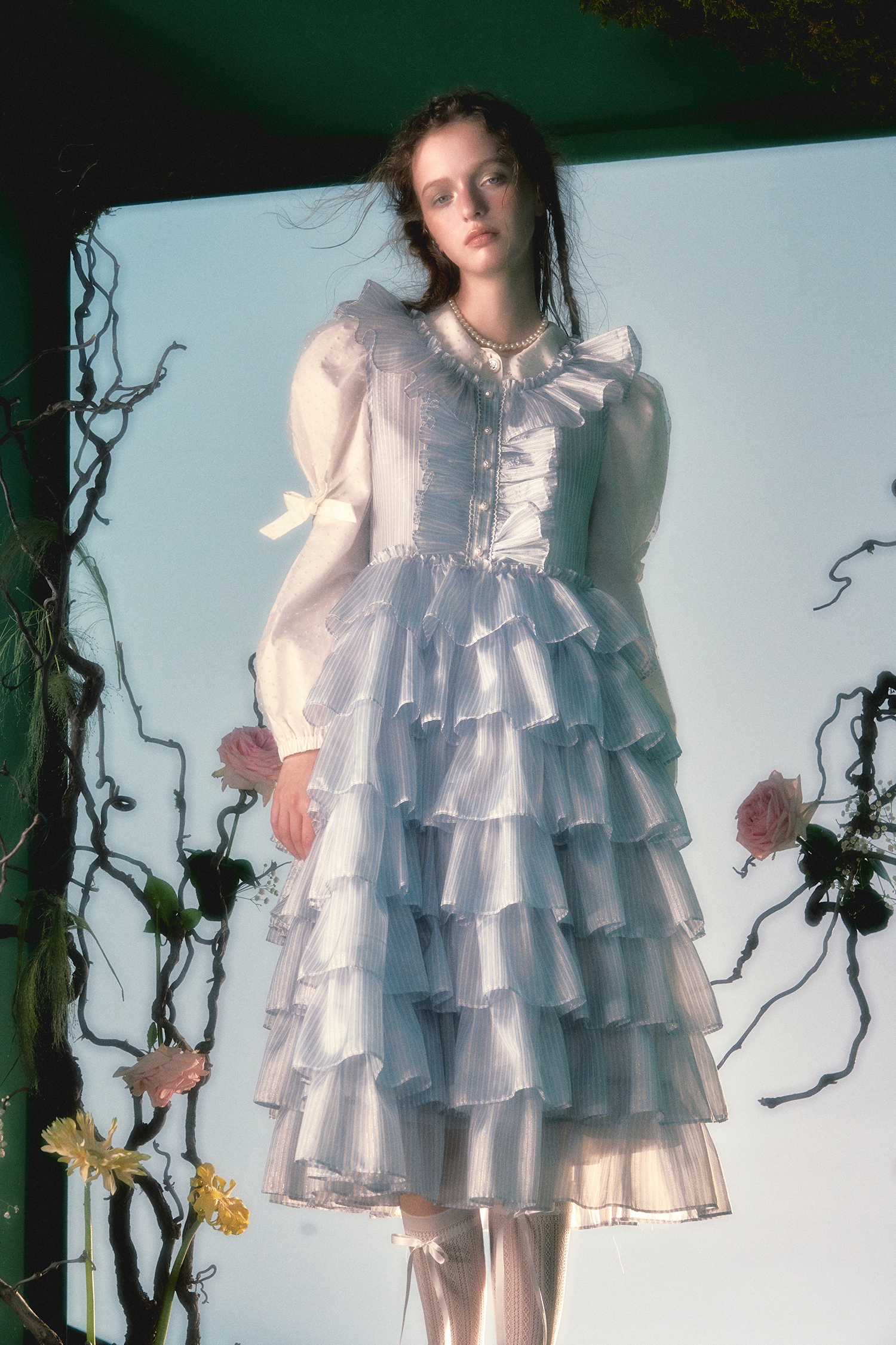 Diseño original Azul Blanco Raya vertical Cuello de encaje Falda larga de pastel Vestido sin mangas esponjoso