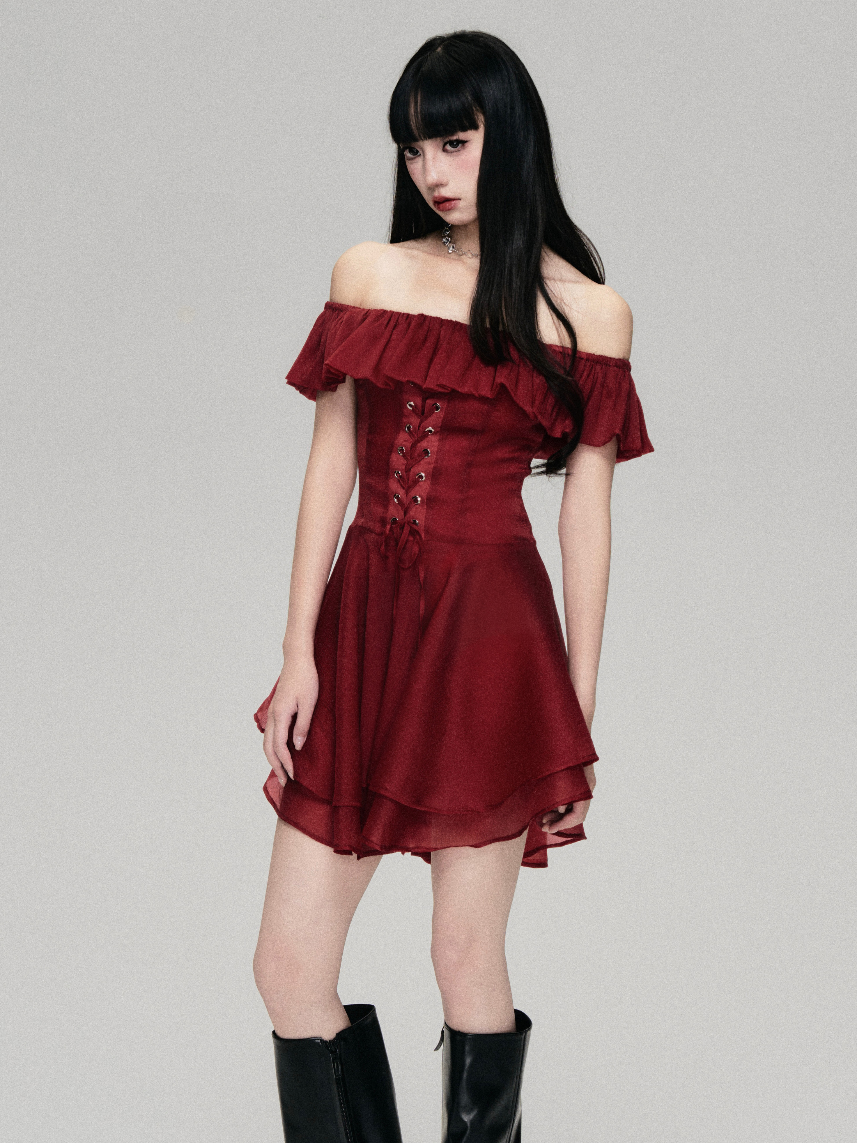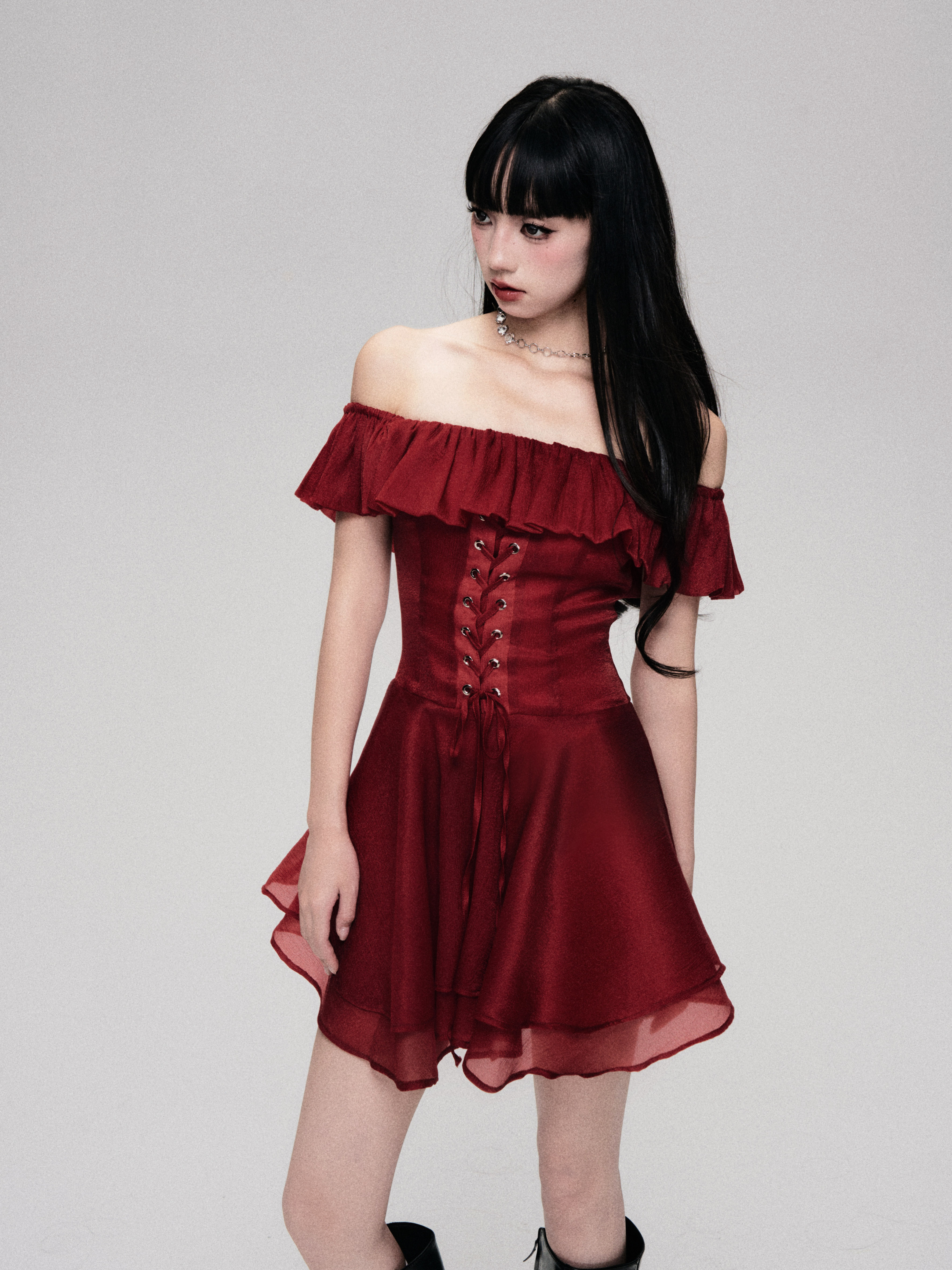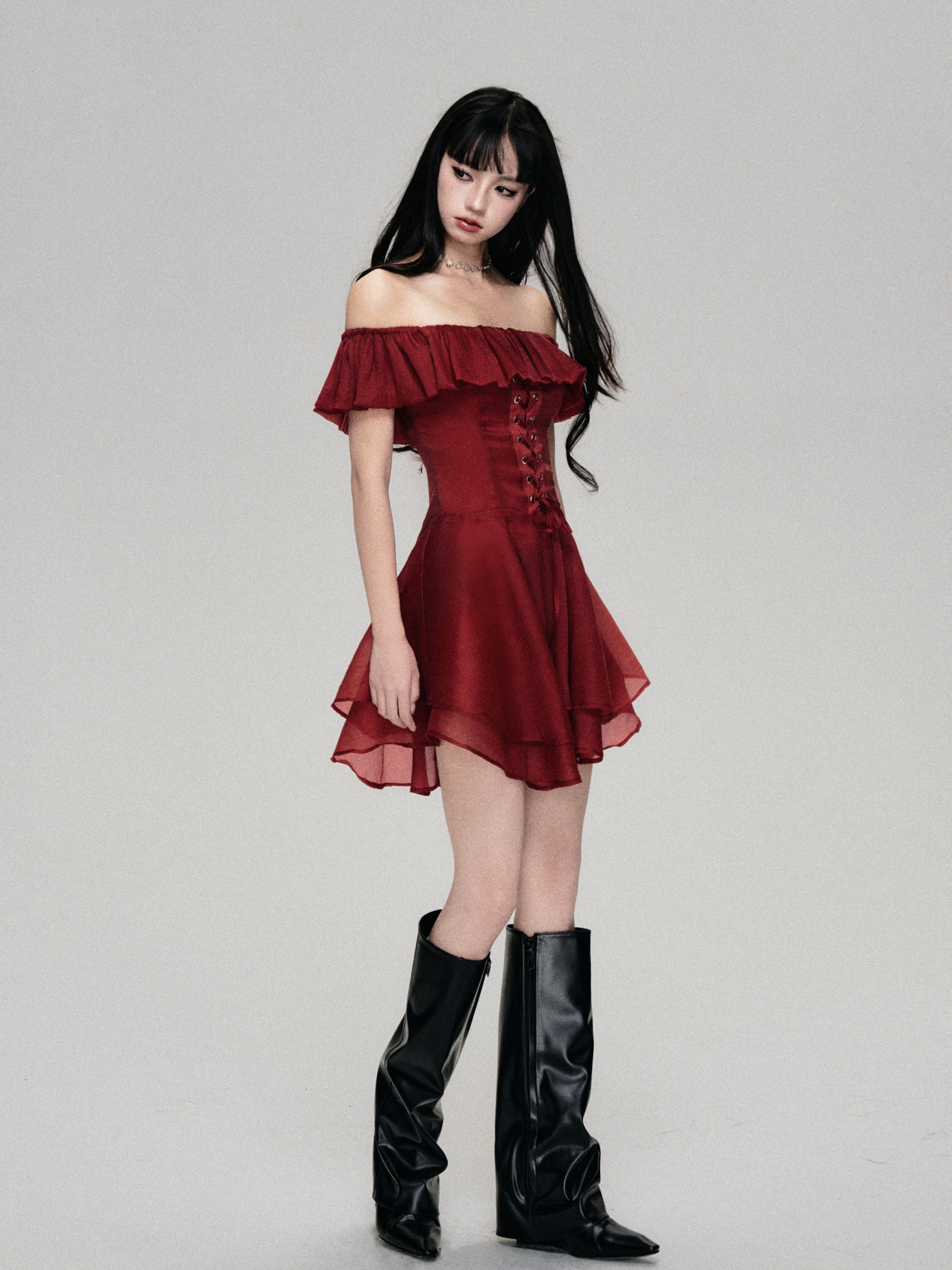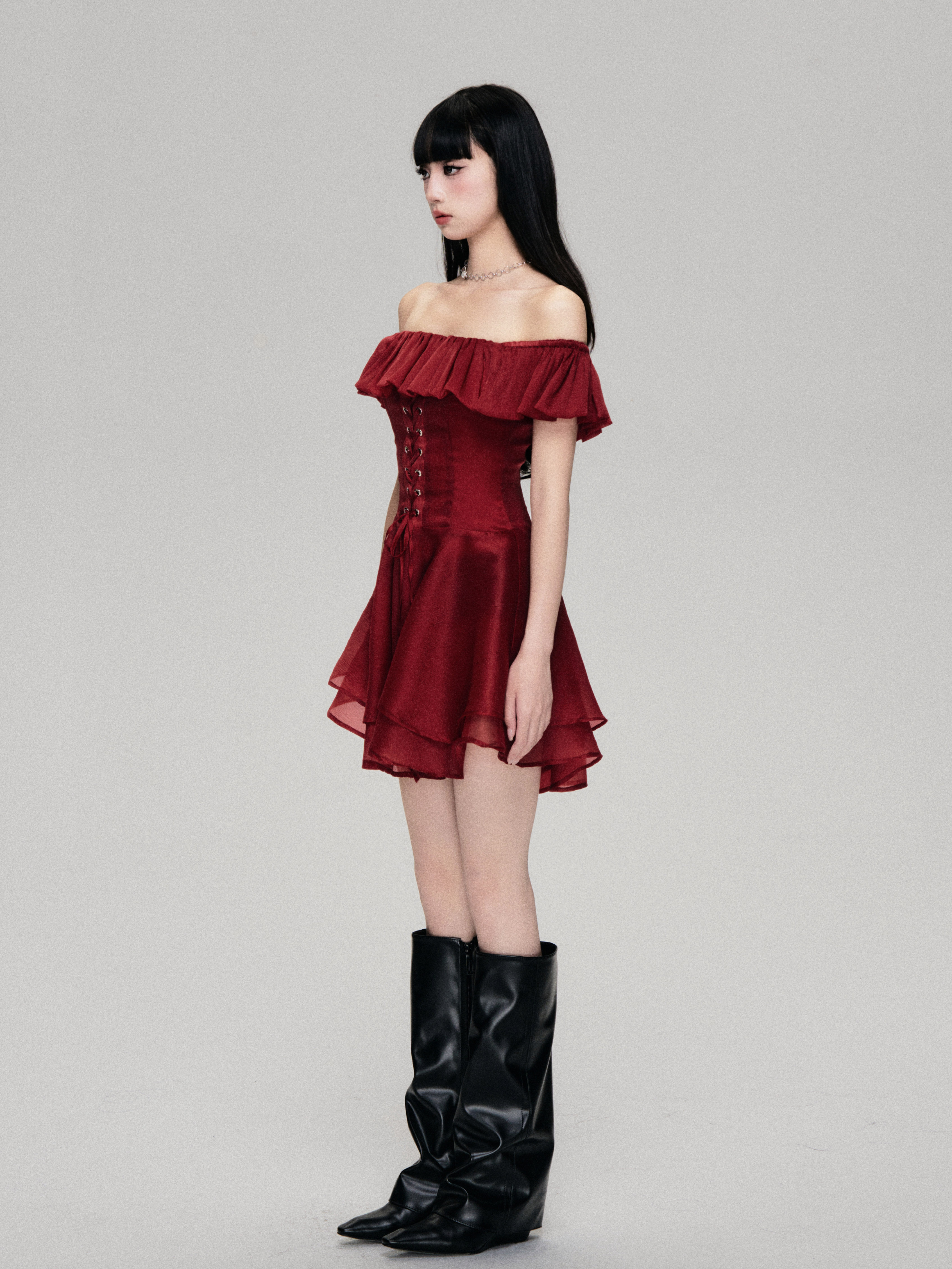 Red Rose Lace-Up Waist One-Shoulder Haute Couture Dress