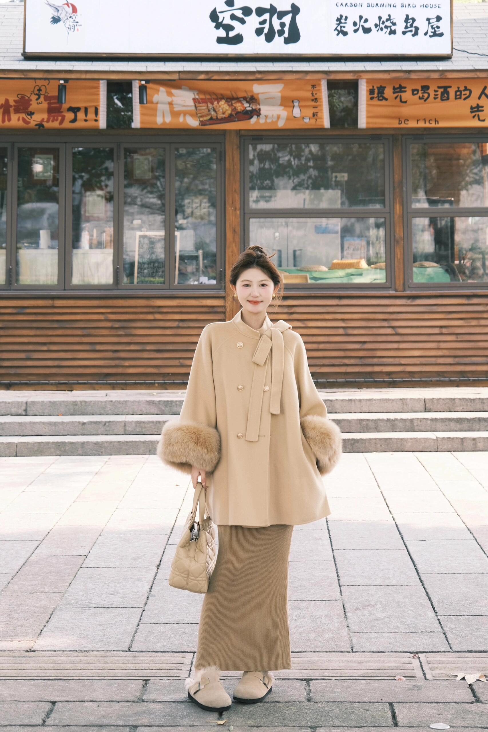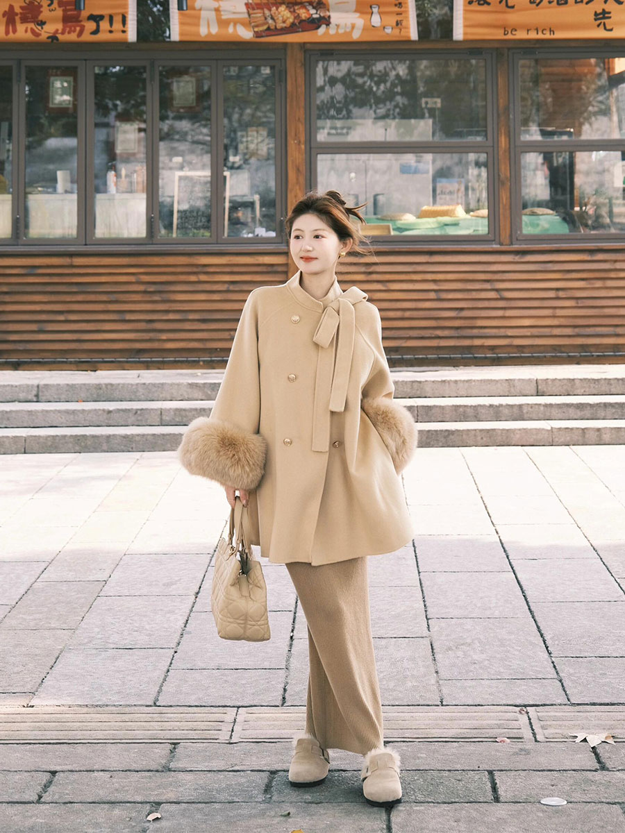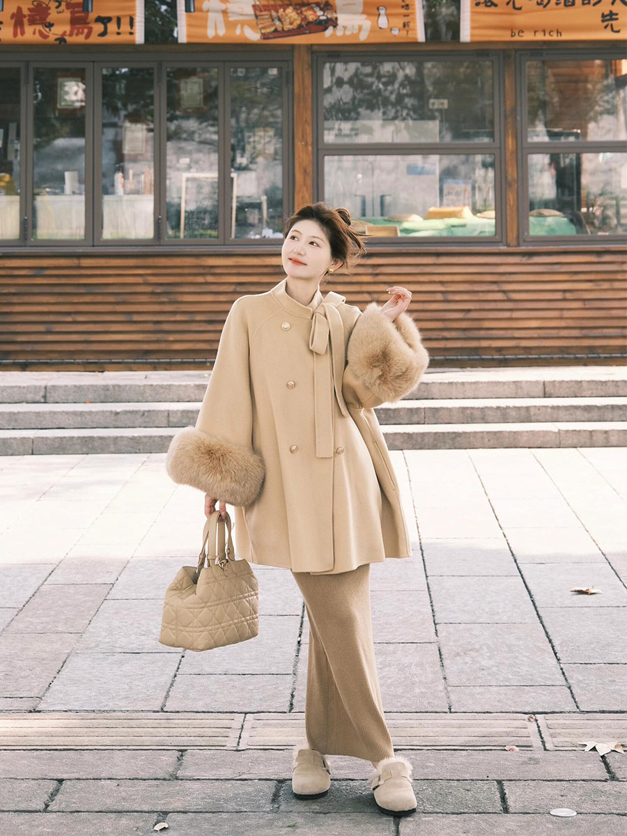 Reversible Cashmere Cape – Luxe Gold Bow-Detail Woolen Jacket