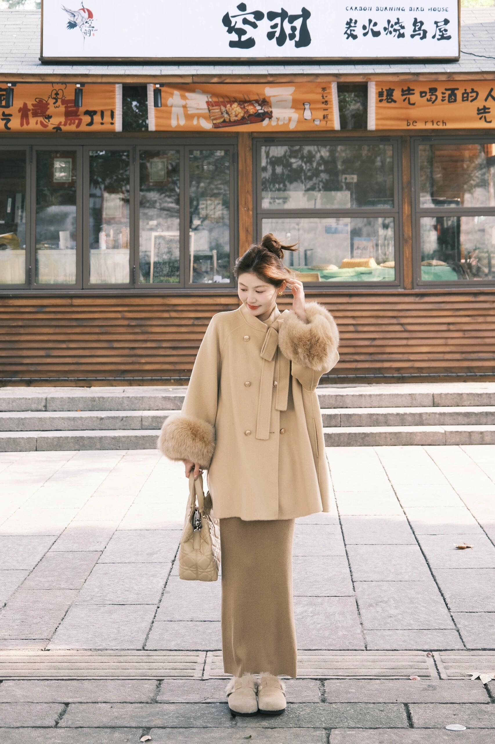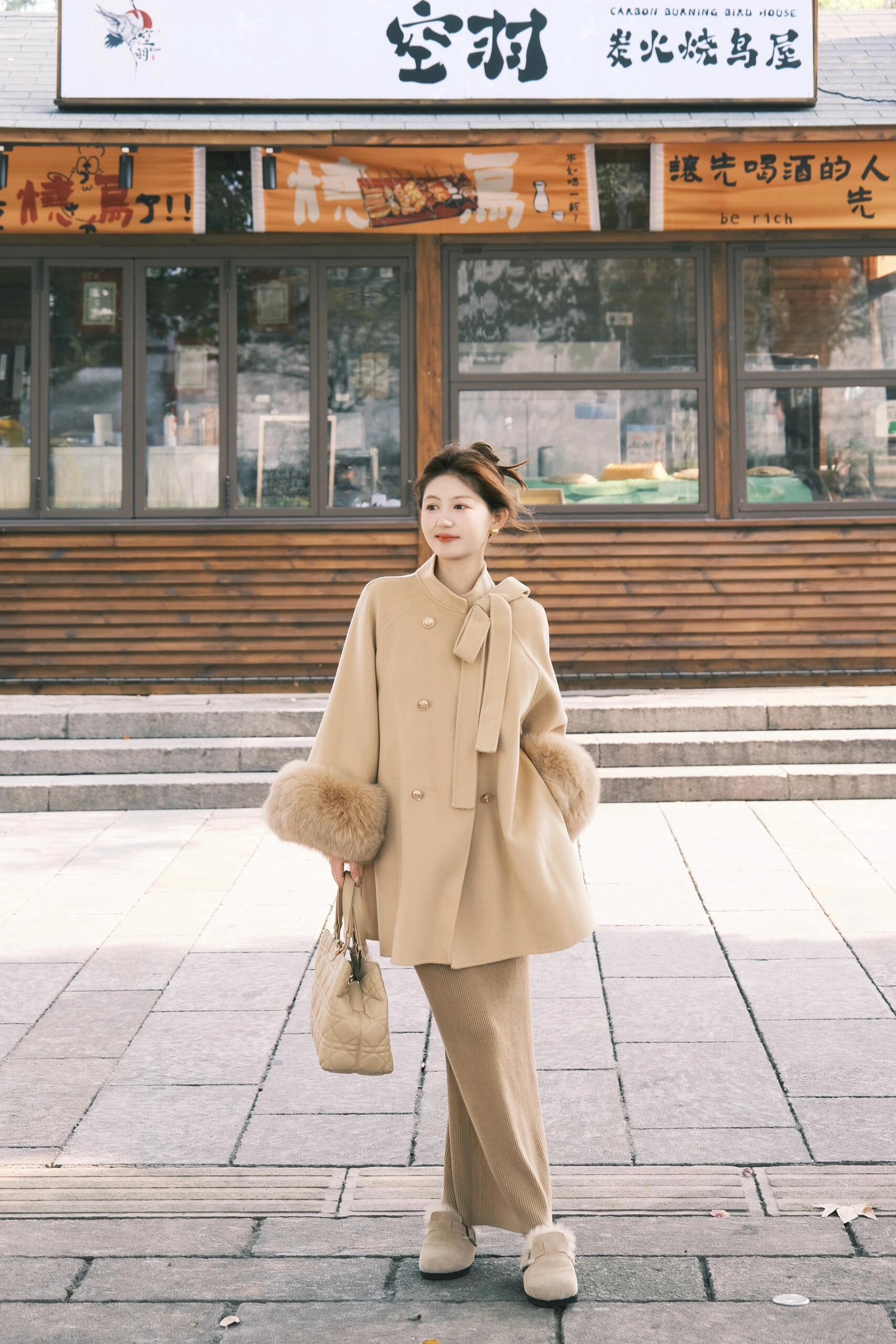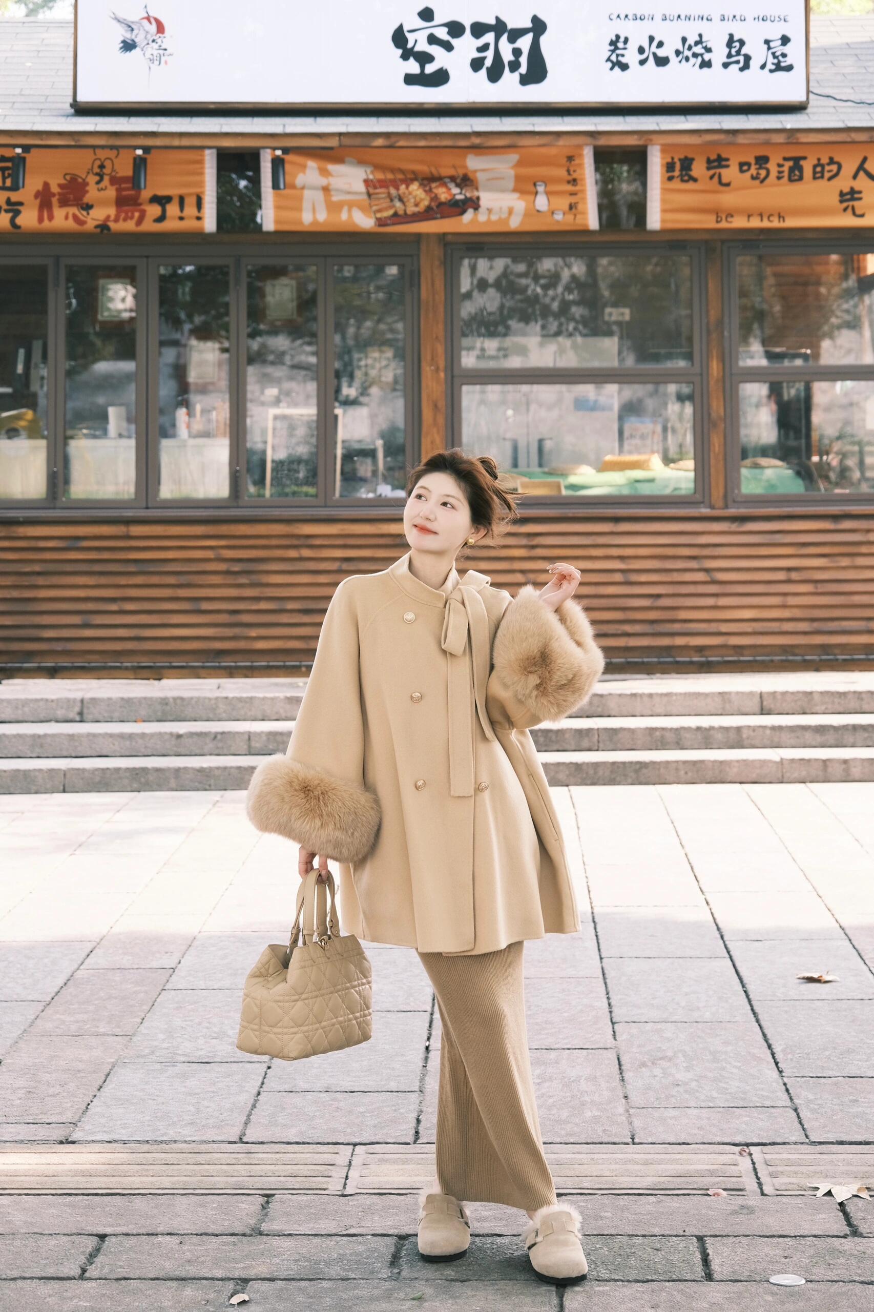 Reversible Cashmere Cape – Luxe Gold Bow-Detail Woolen Jacket