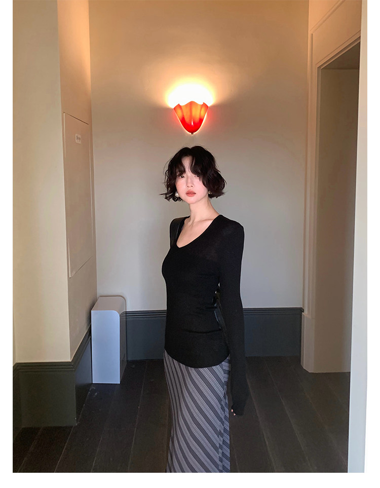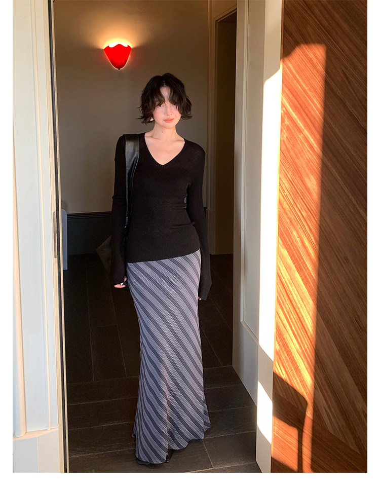 Slanted Stripe High-Waist Slim Long Skirt – Hong Kong Retro Autumn Style