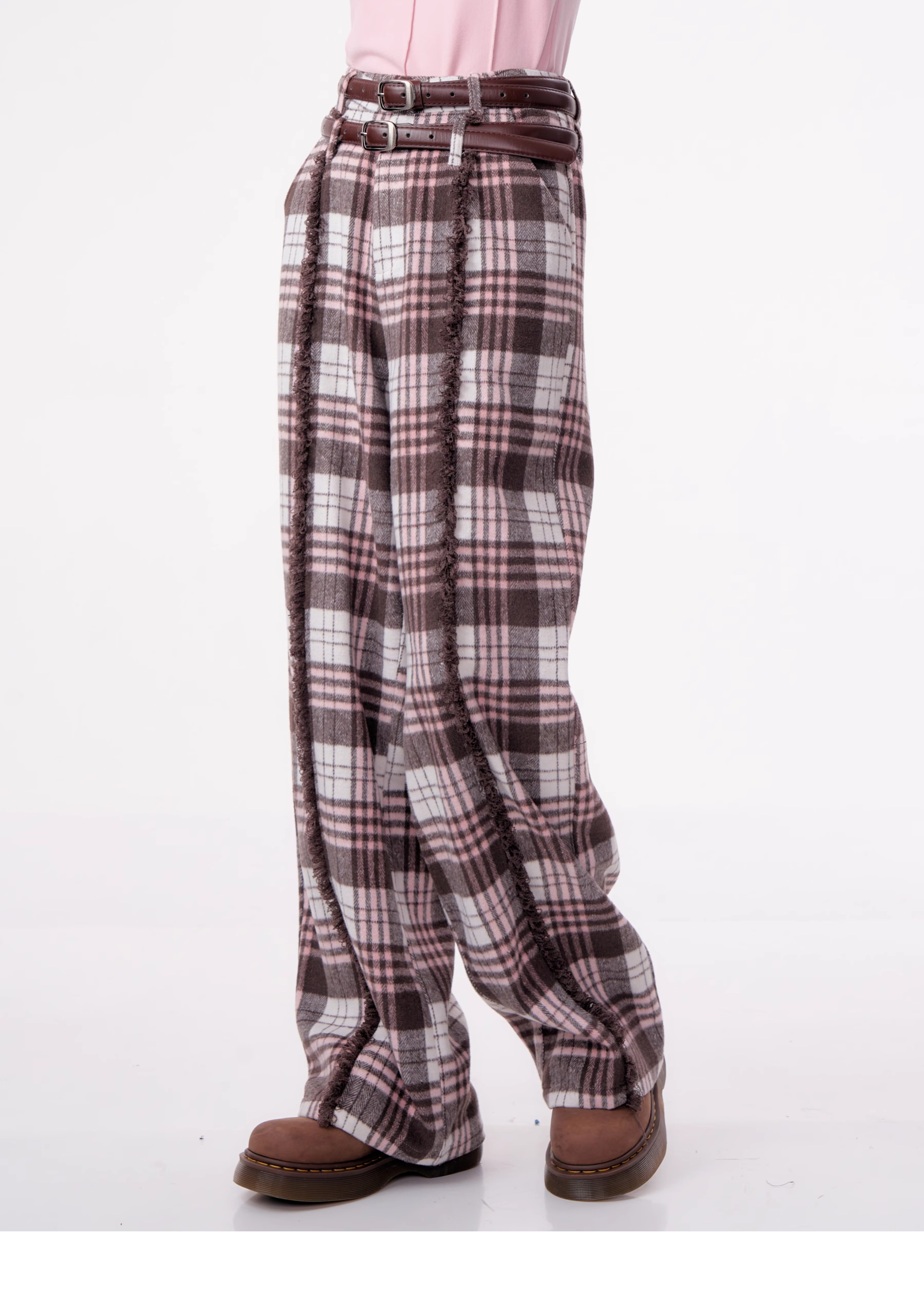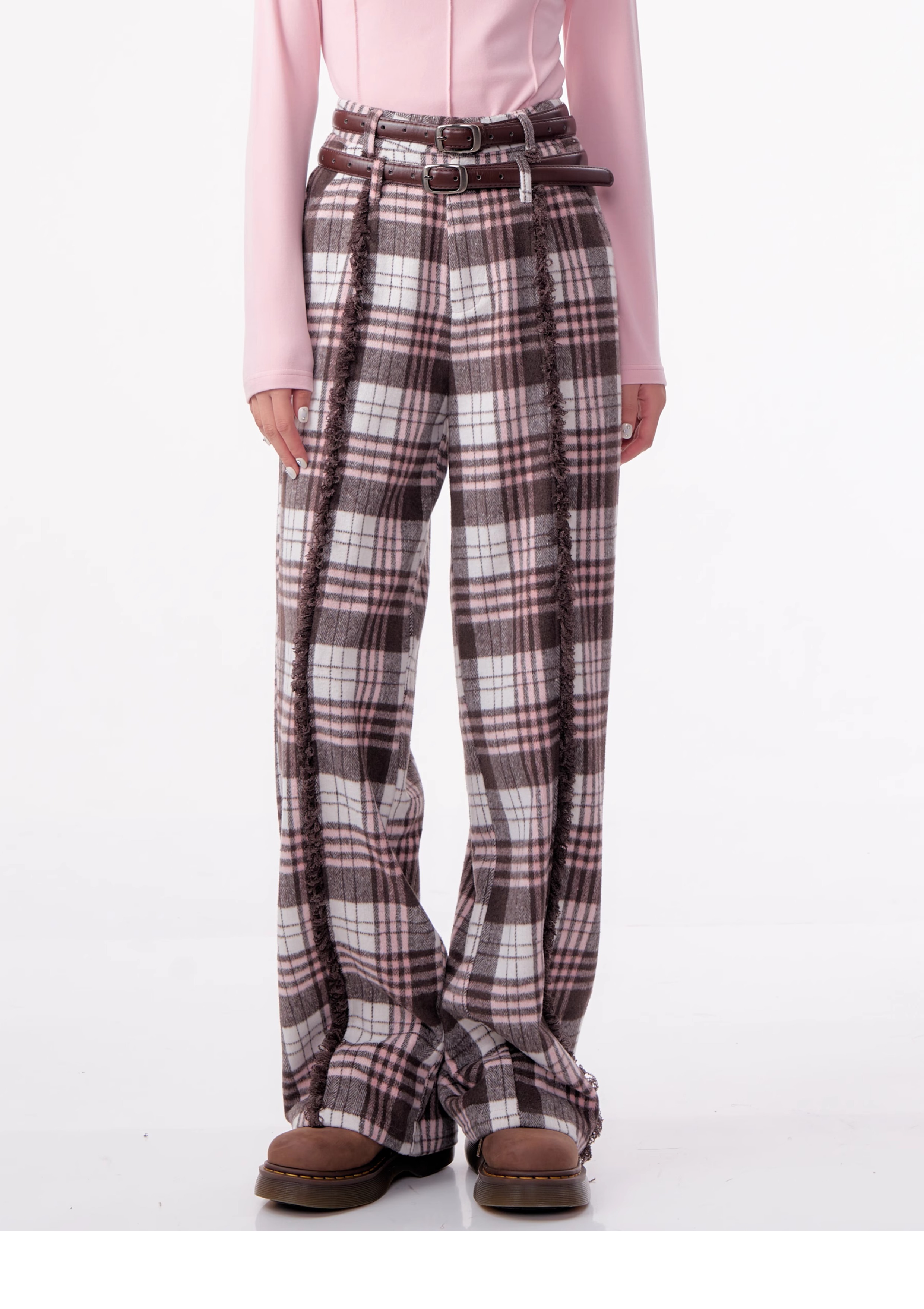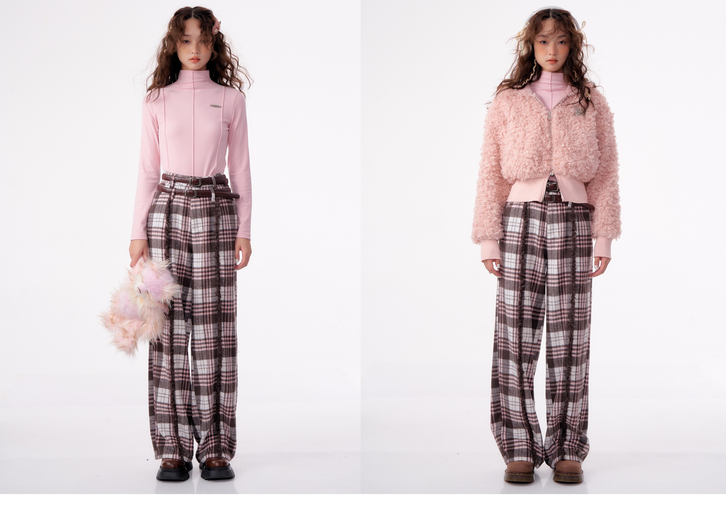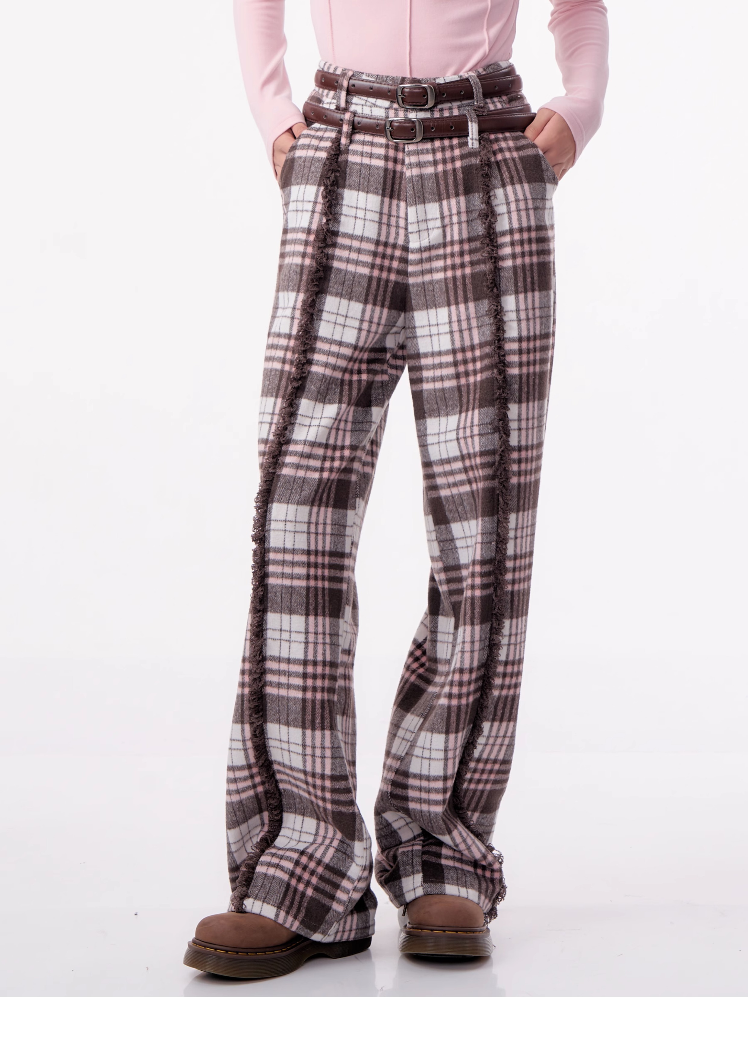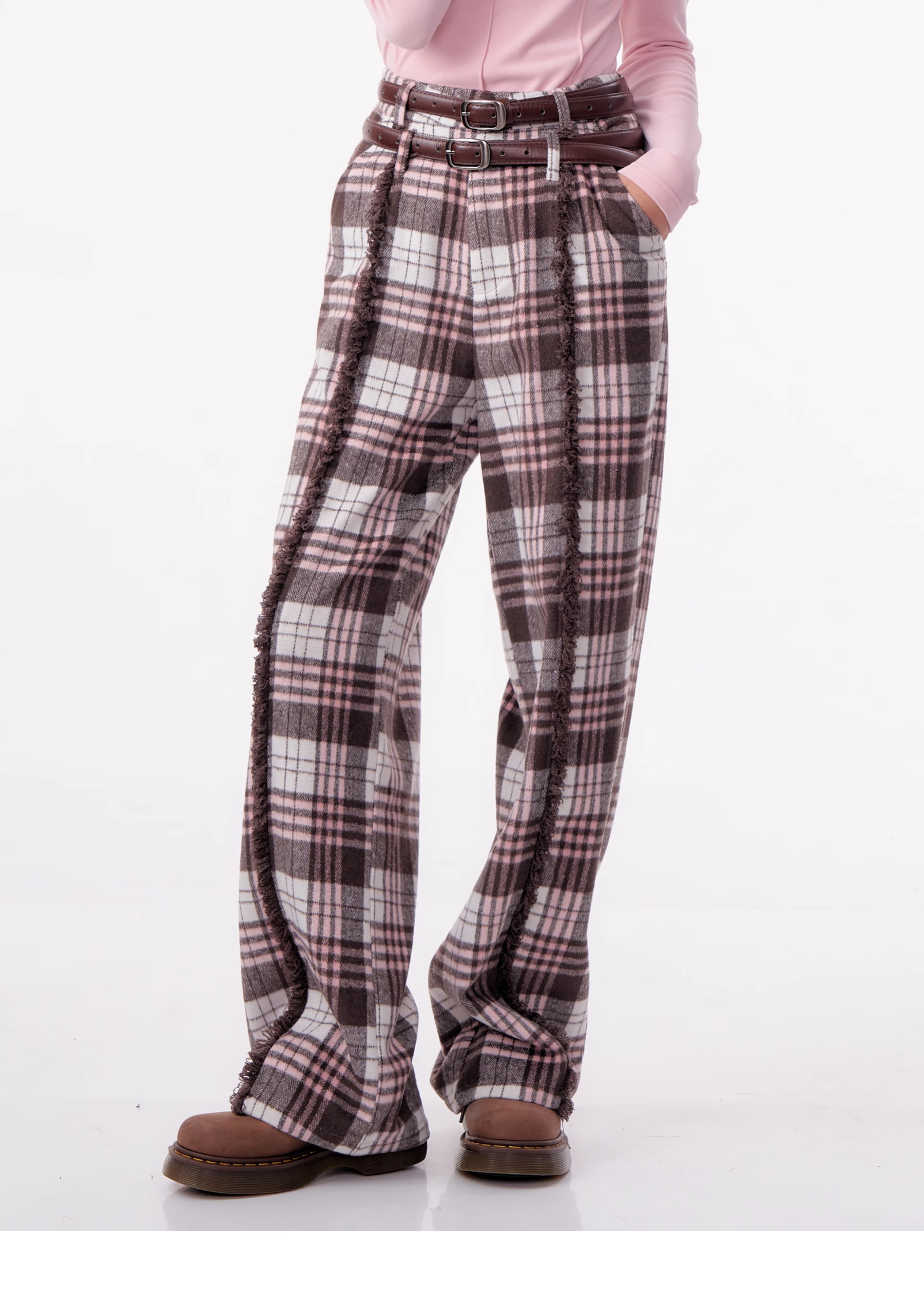 Pantalon en laine à carreaux marron rétro | Taille haute, jambes larges, style automne/hiver