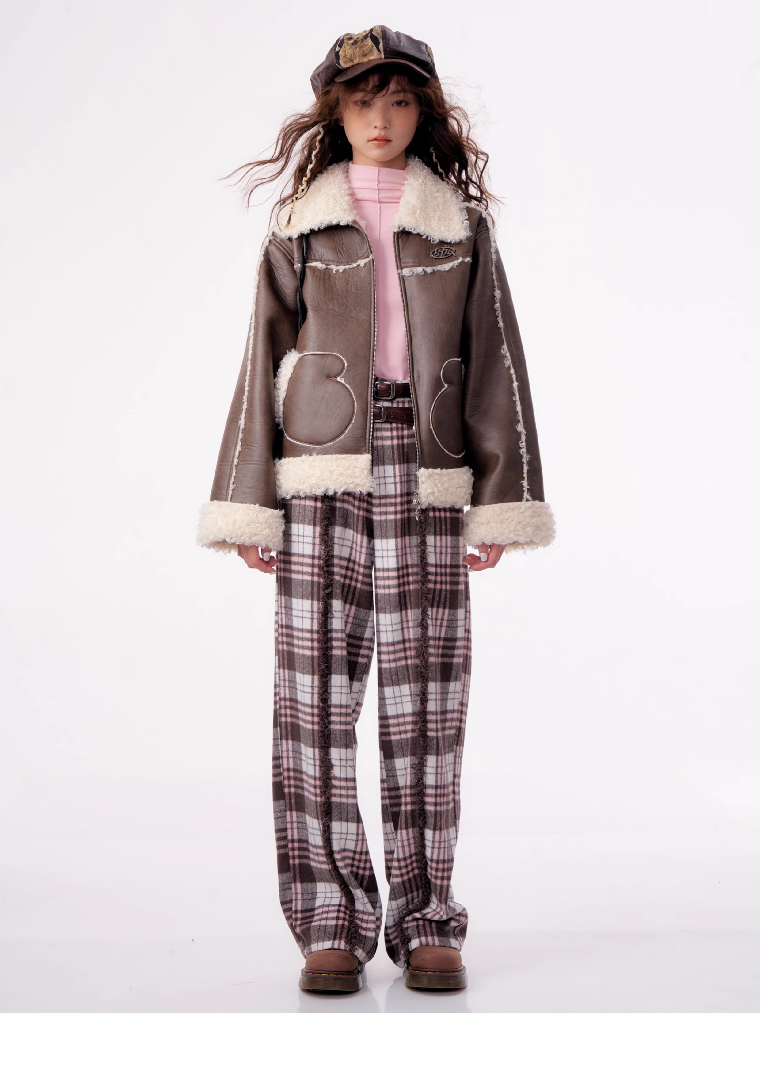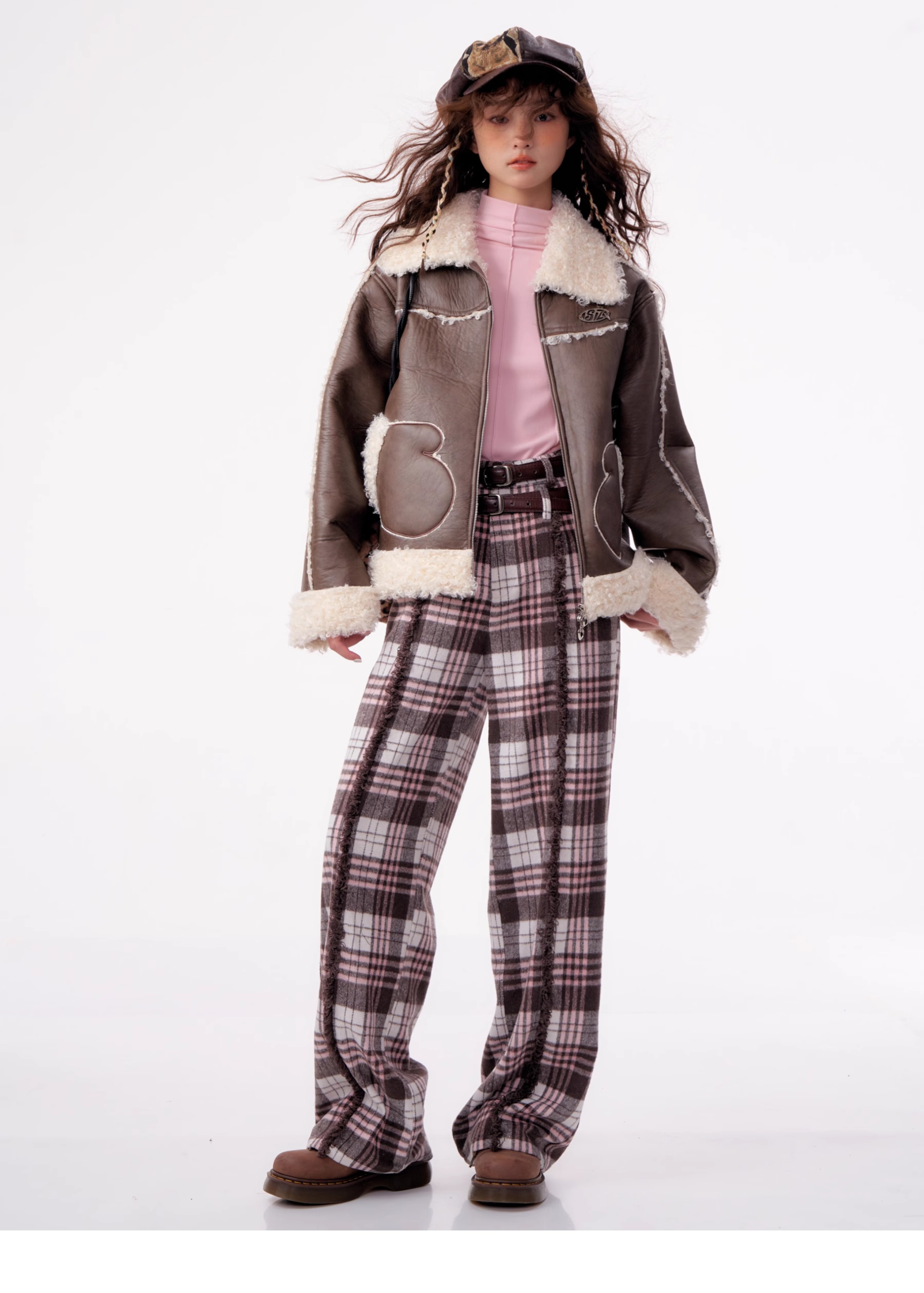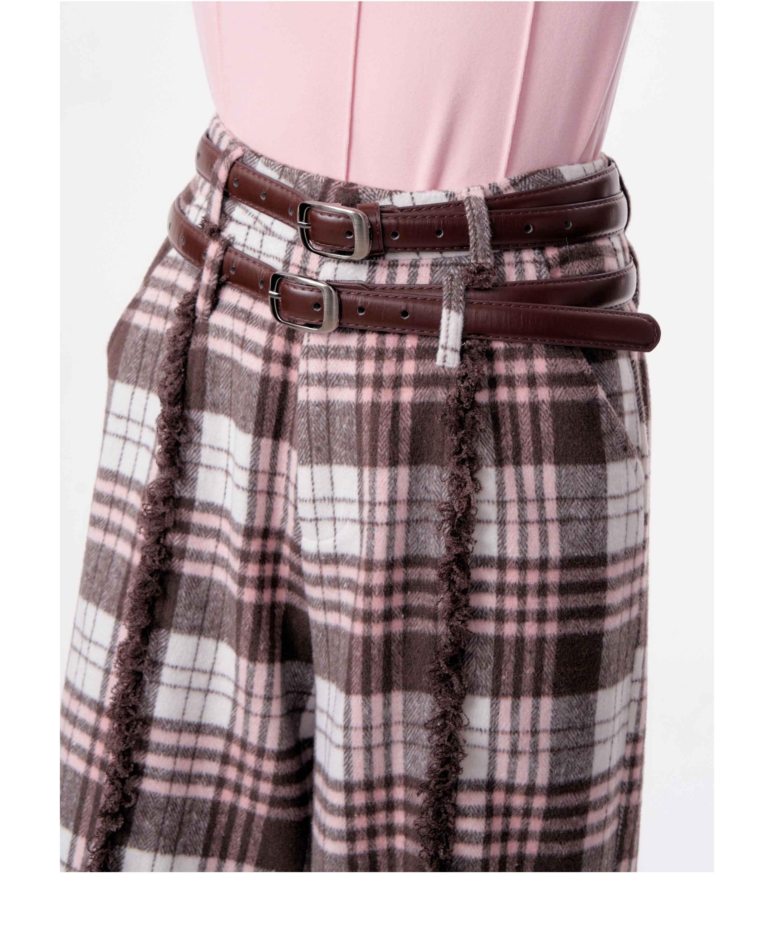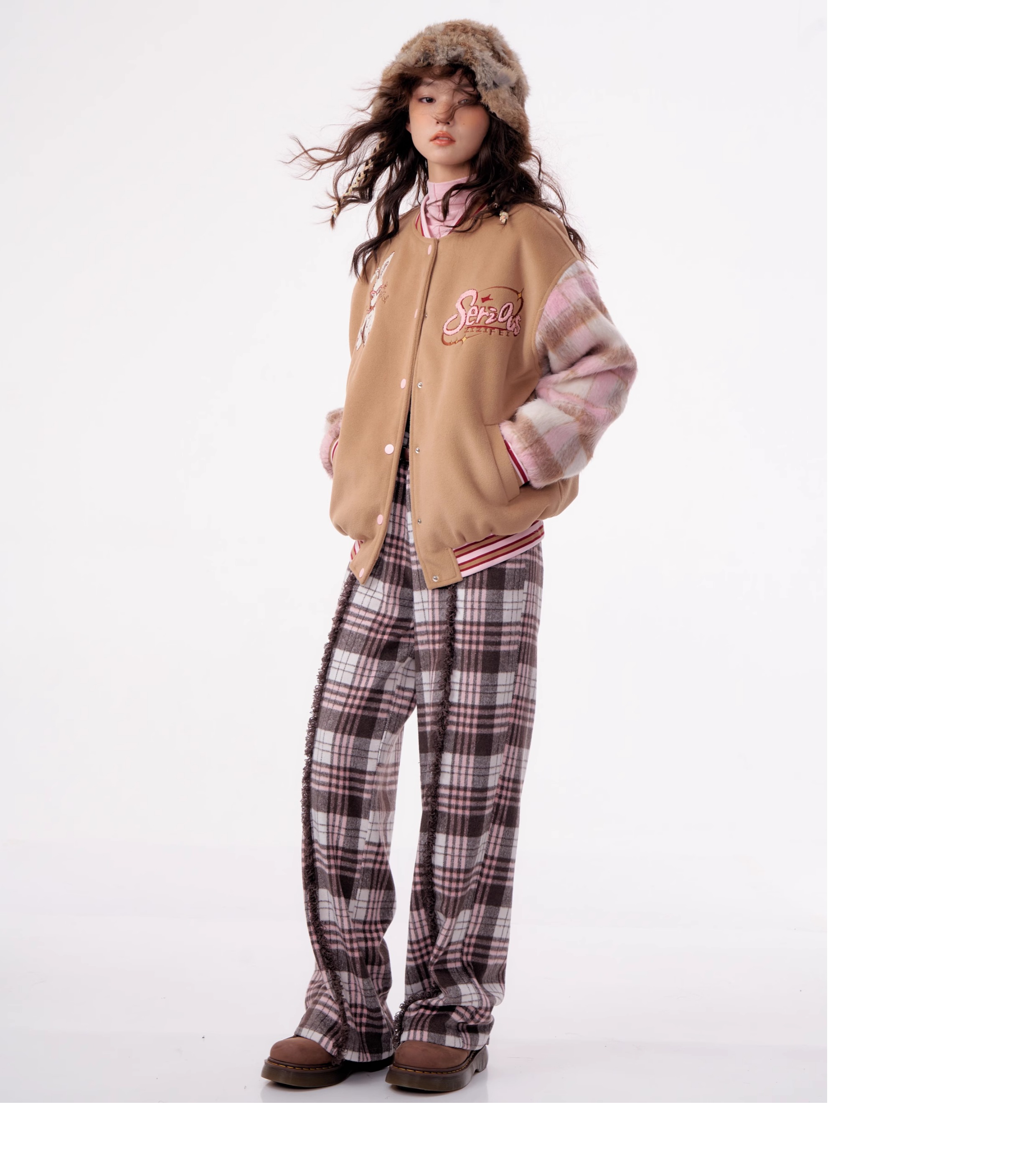 Pantalon en laine à carreaux marron rétro | Taille haute, jambes larges, style automne/hiver