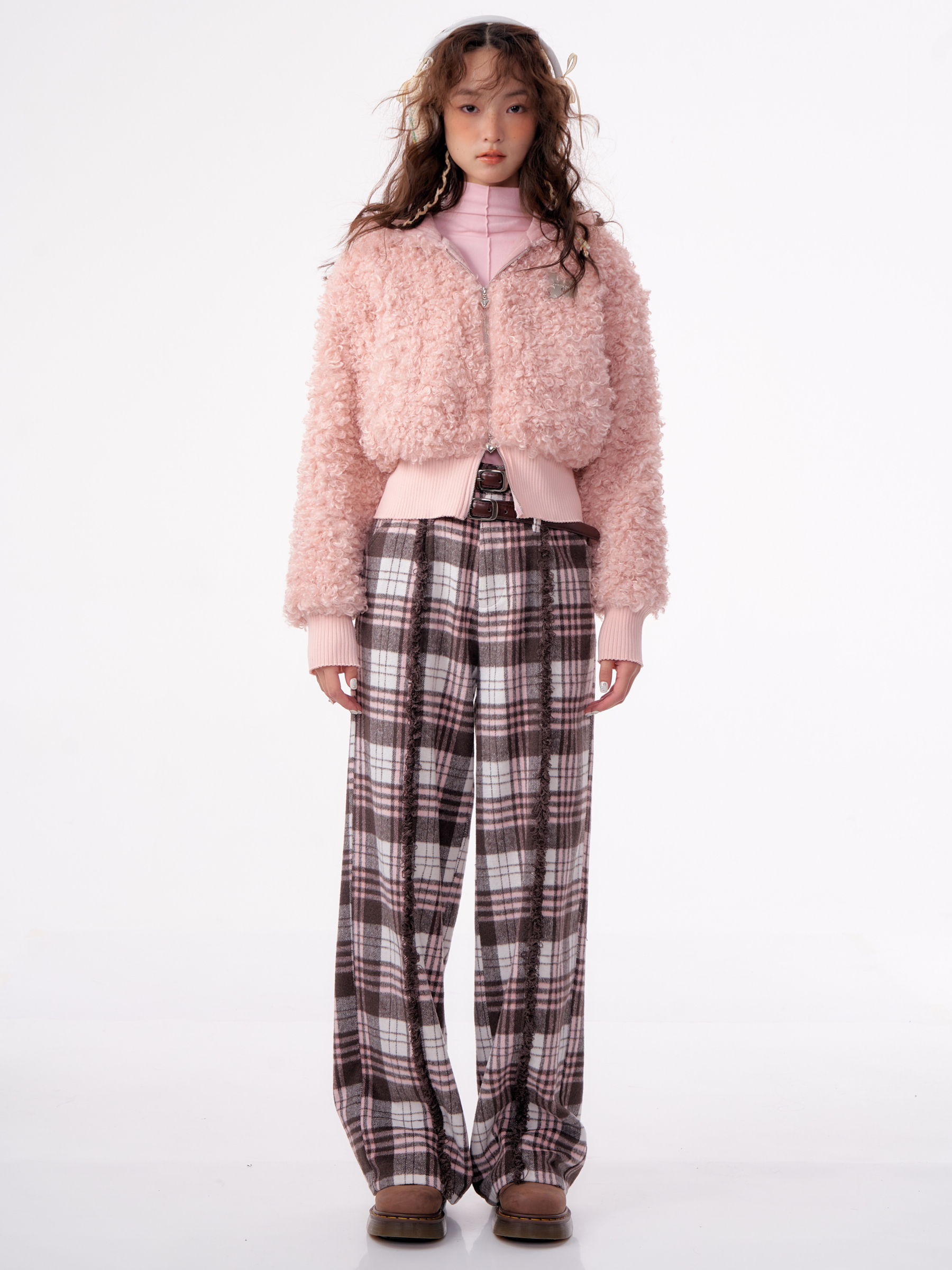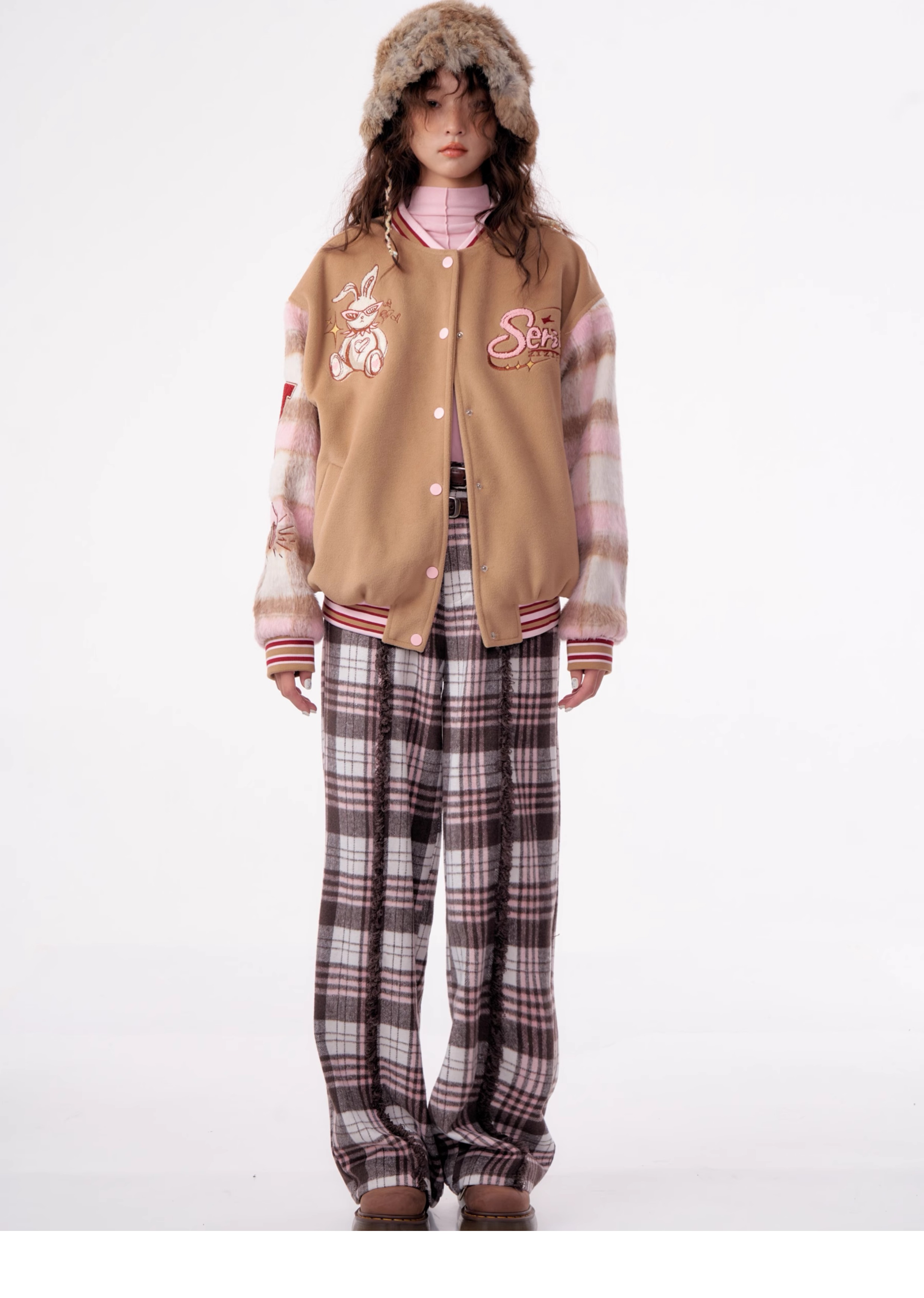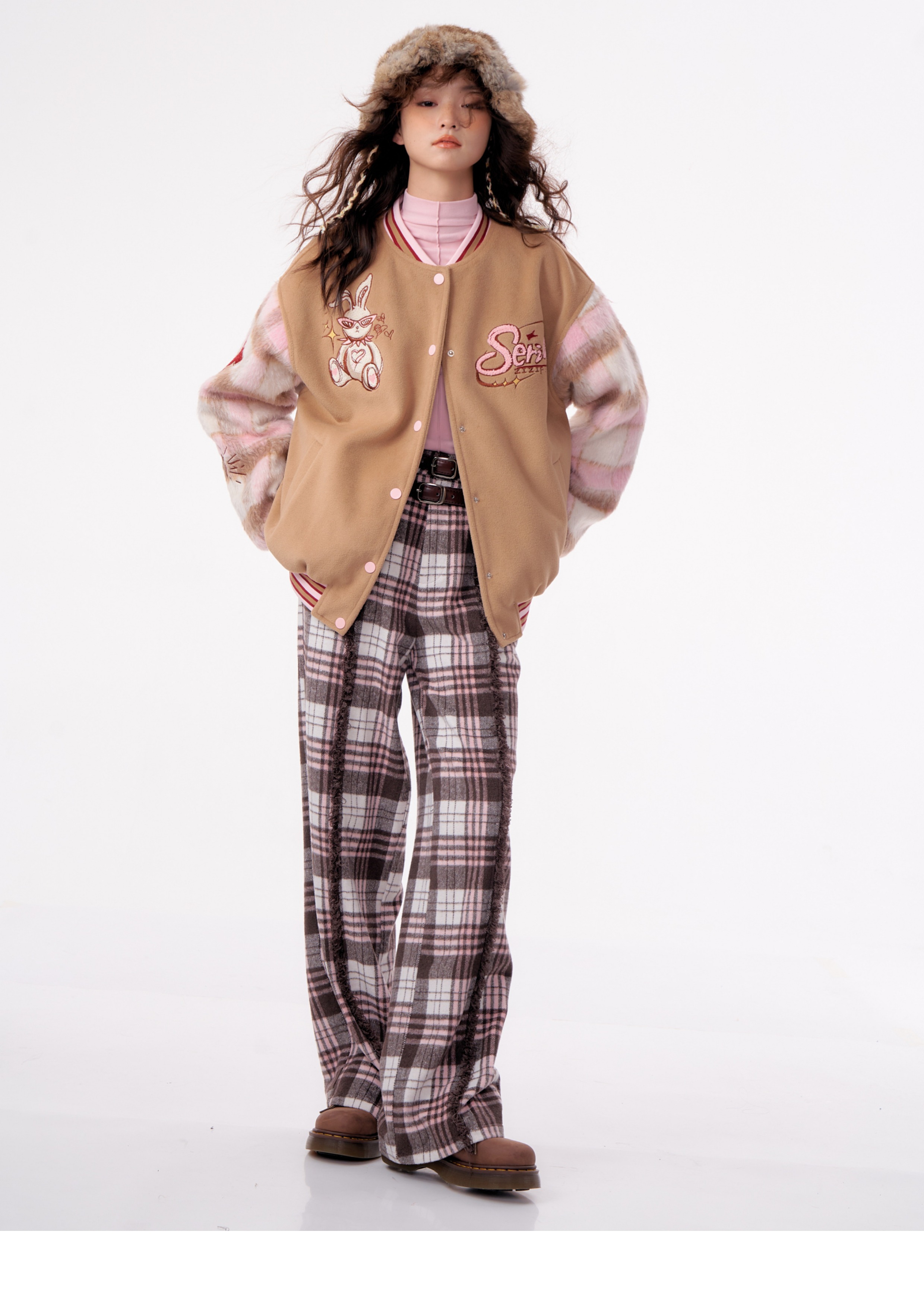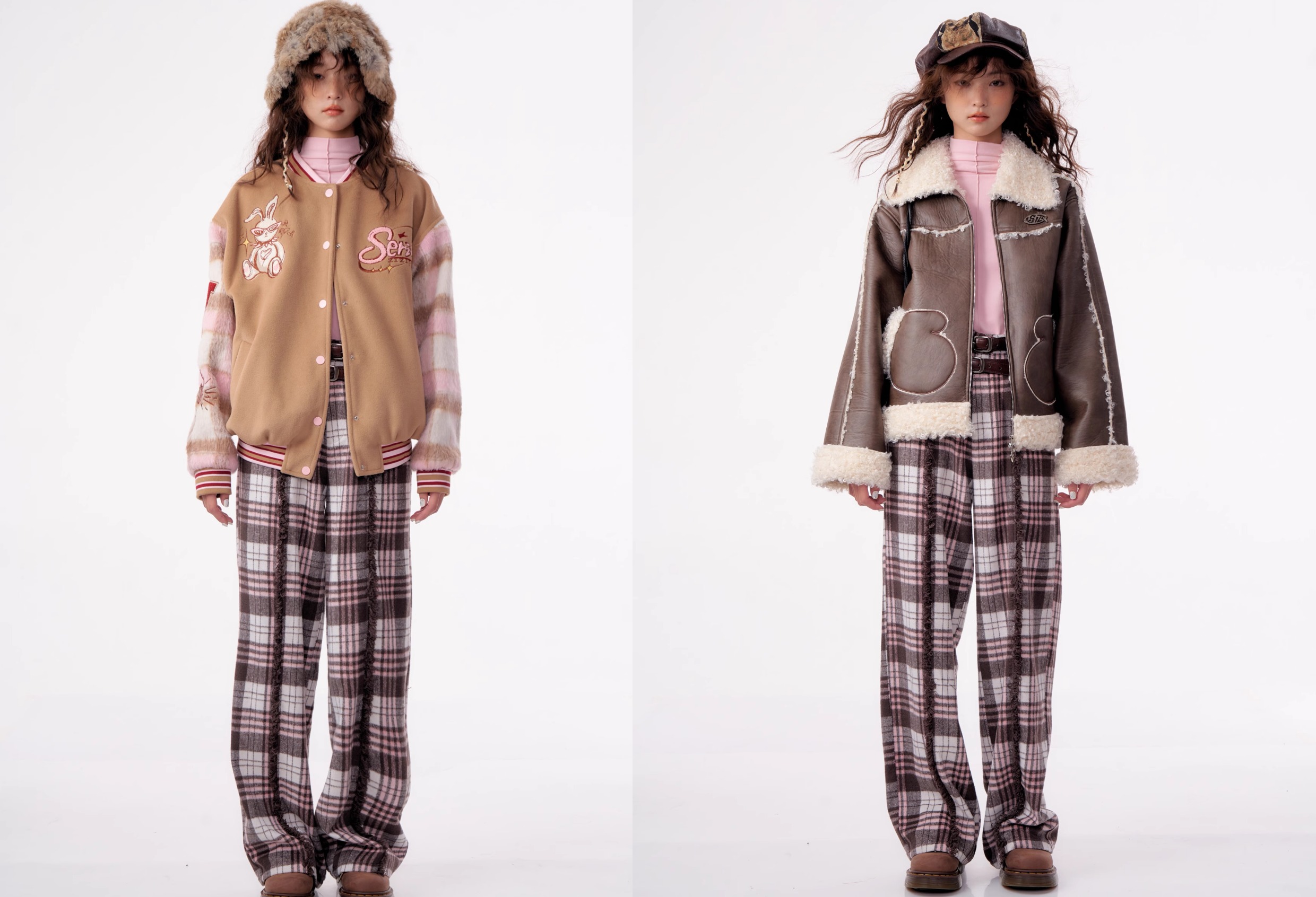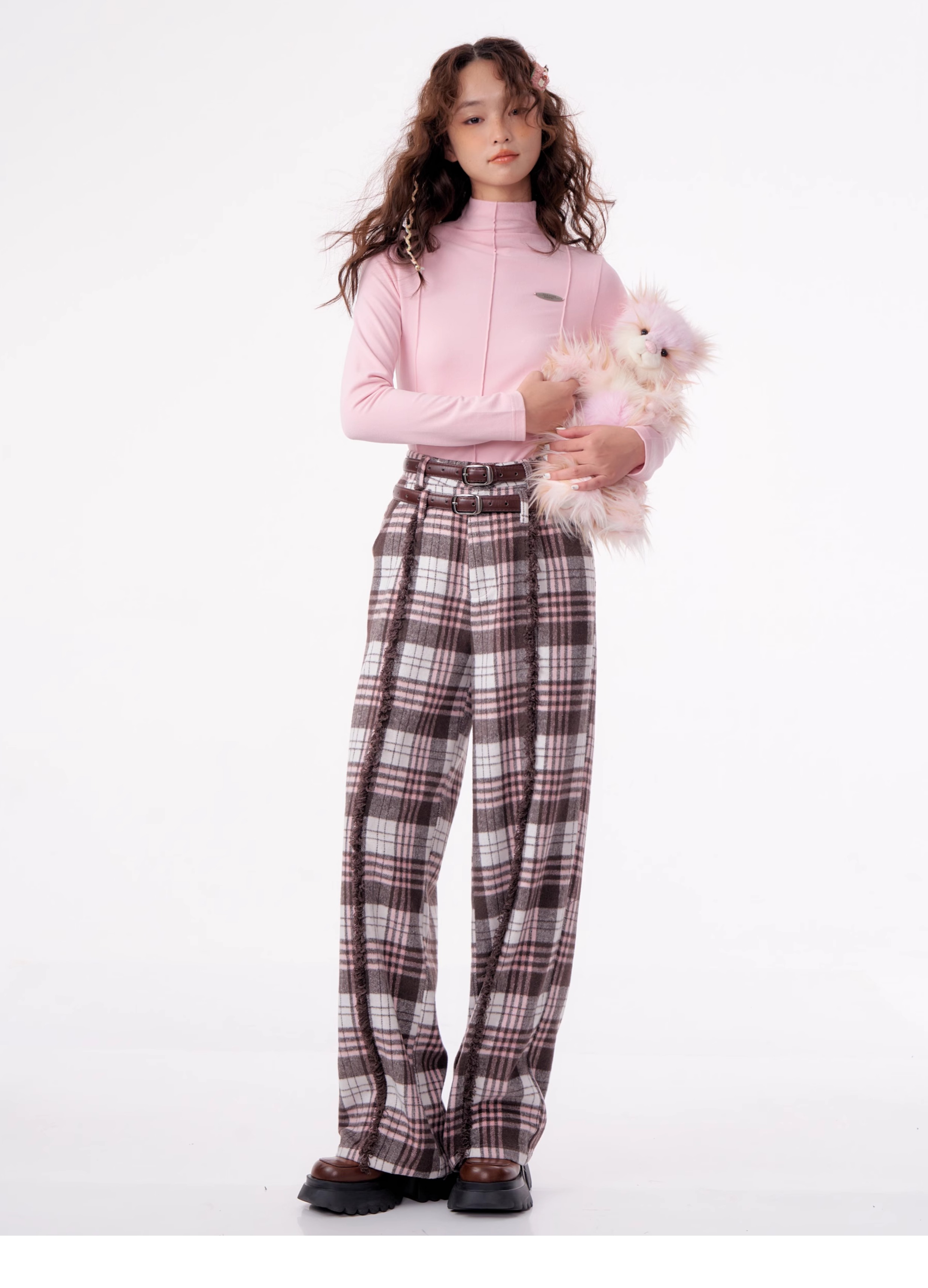 Pantalon en laine à carreaux marron rétro | Taille haute, jambes larges, style automne/hiver