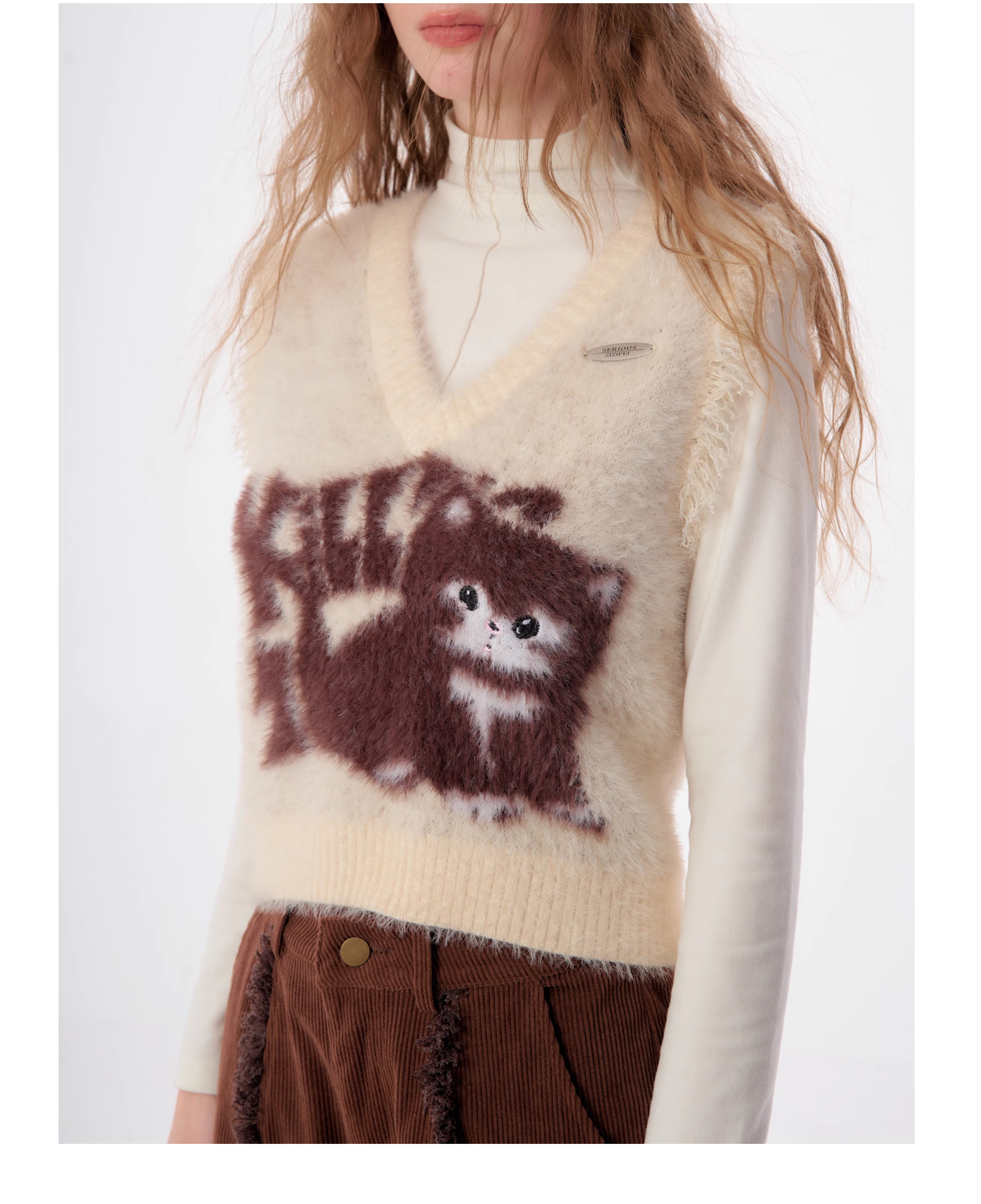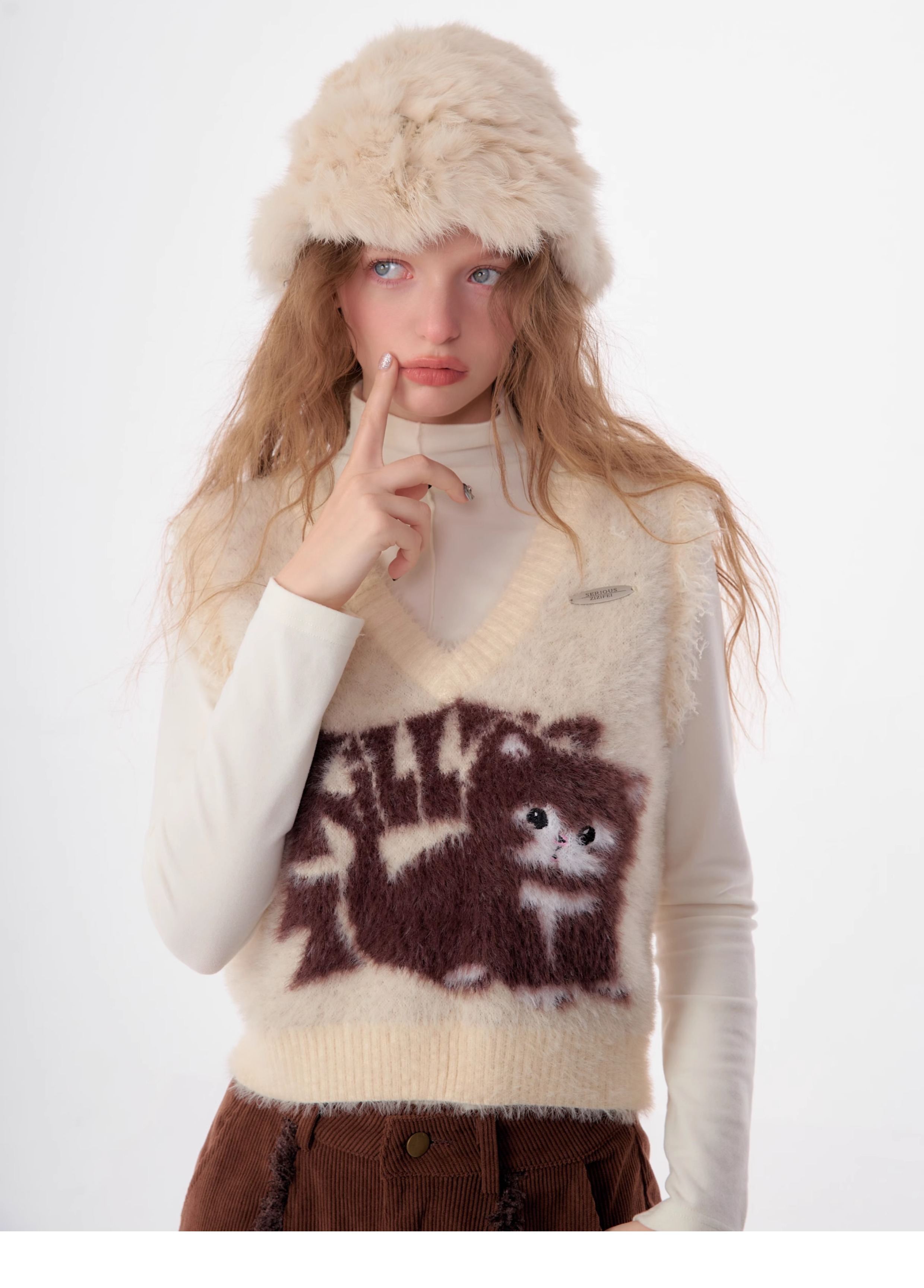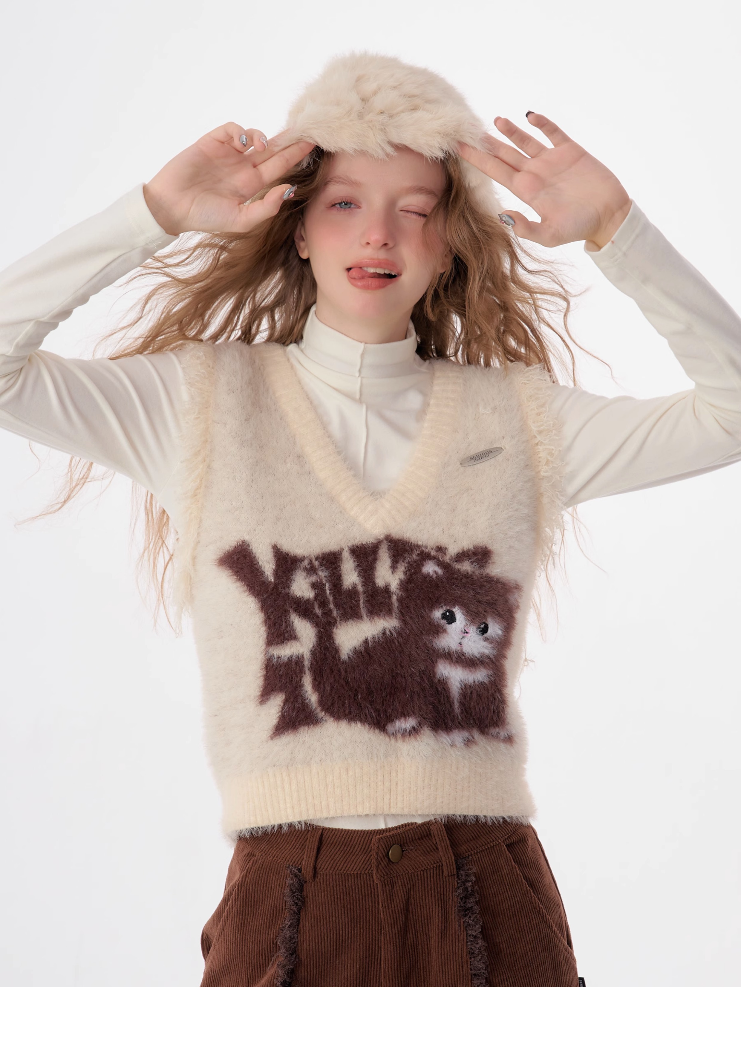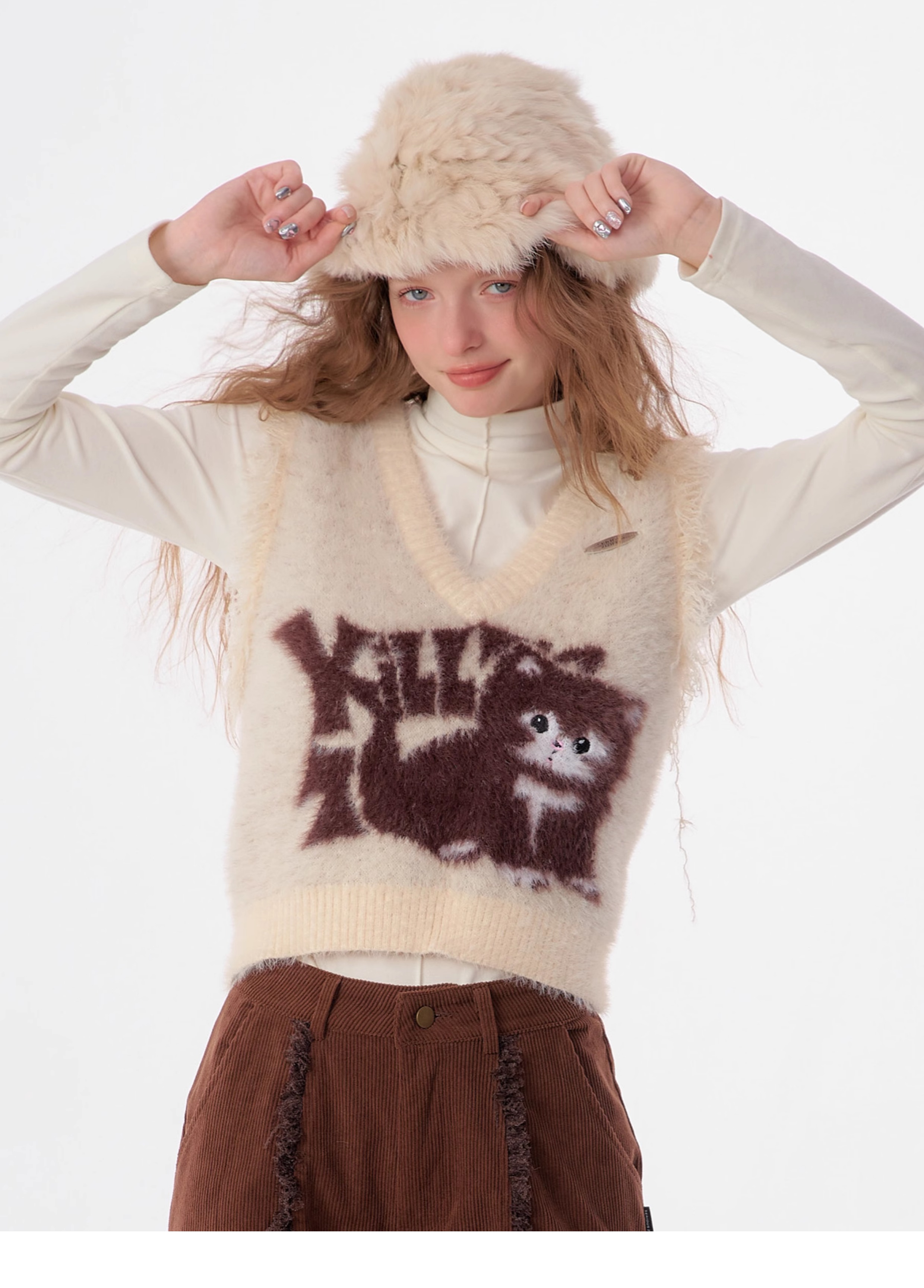 Gilet pull à pompon à motif de chat | Gilet tricoté rétro abricot à col en v pour l'automne/hiver