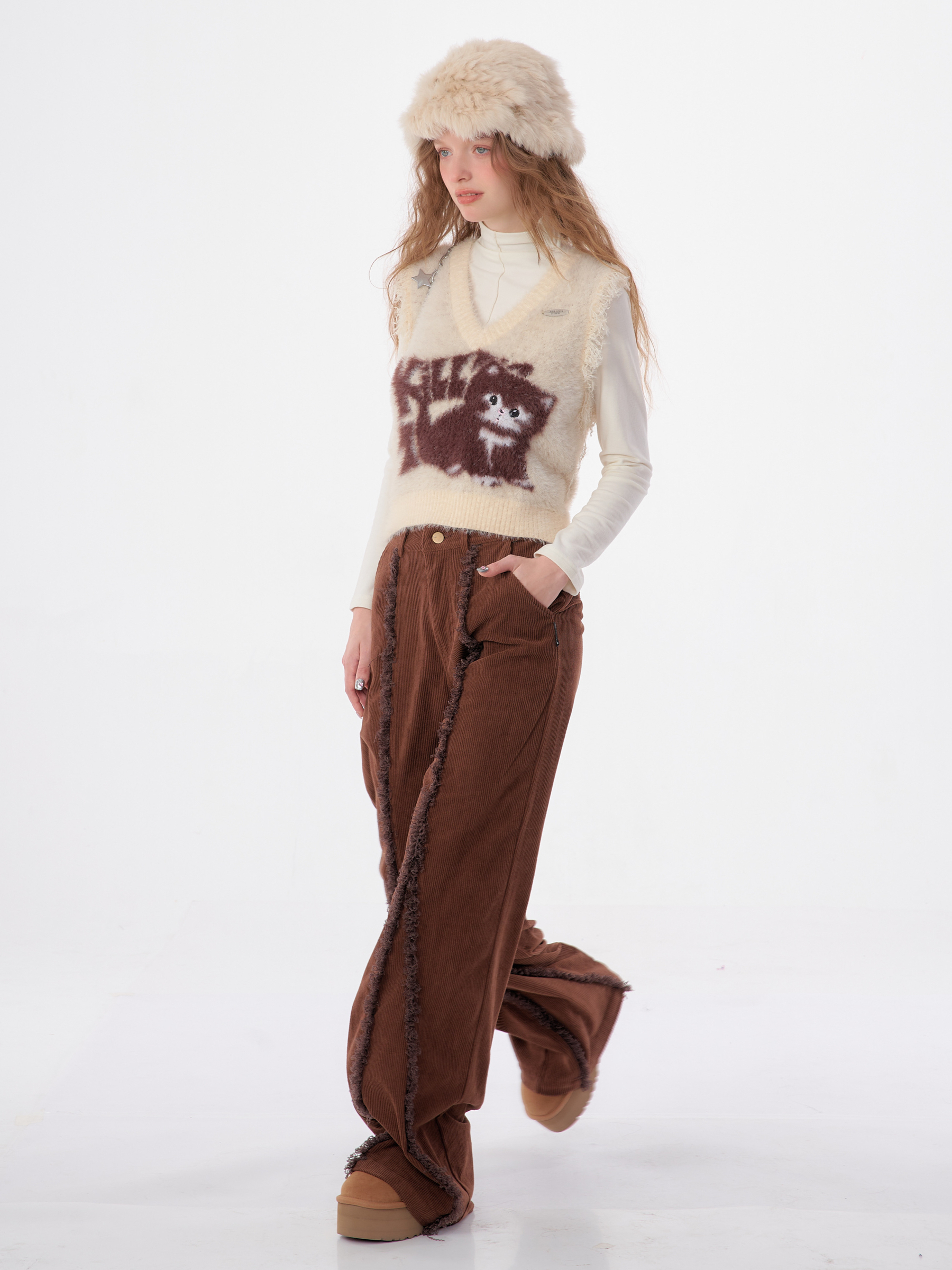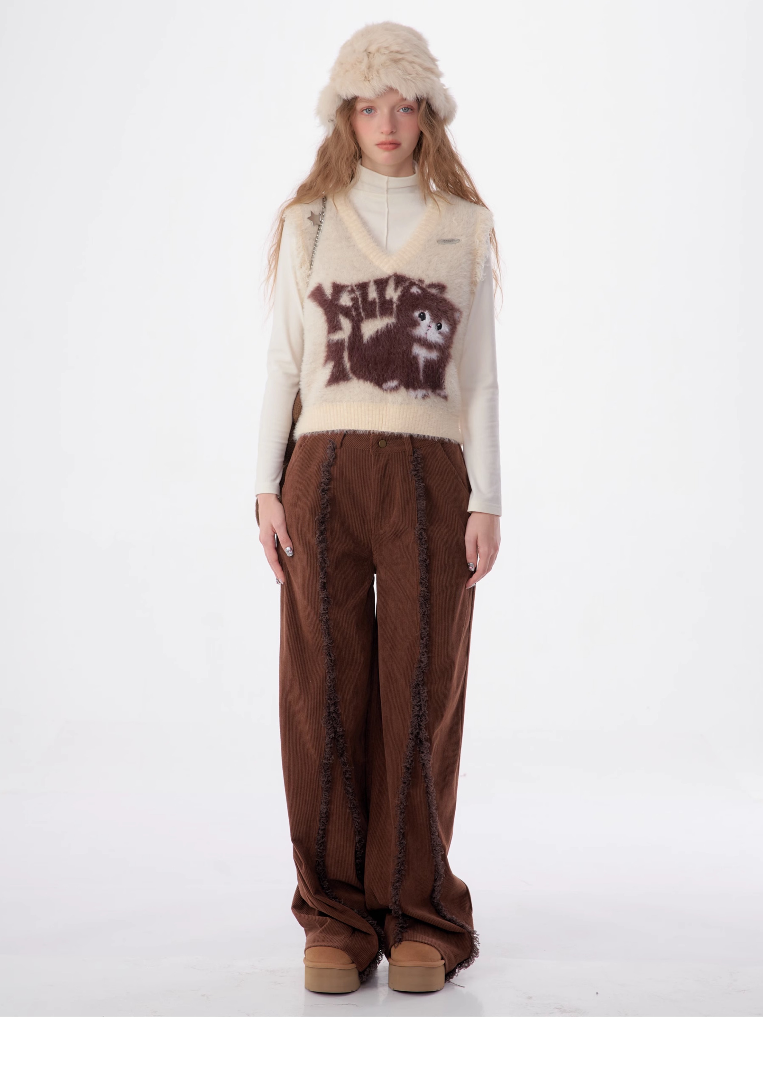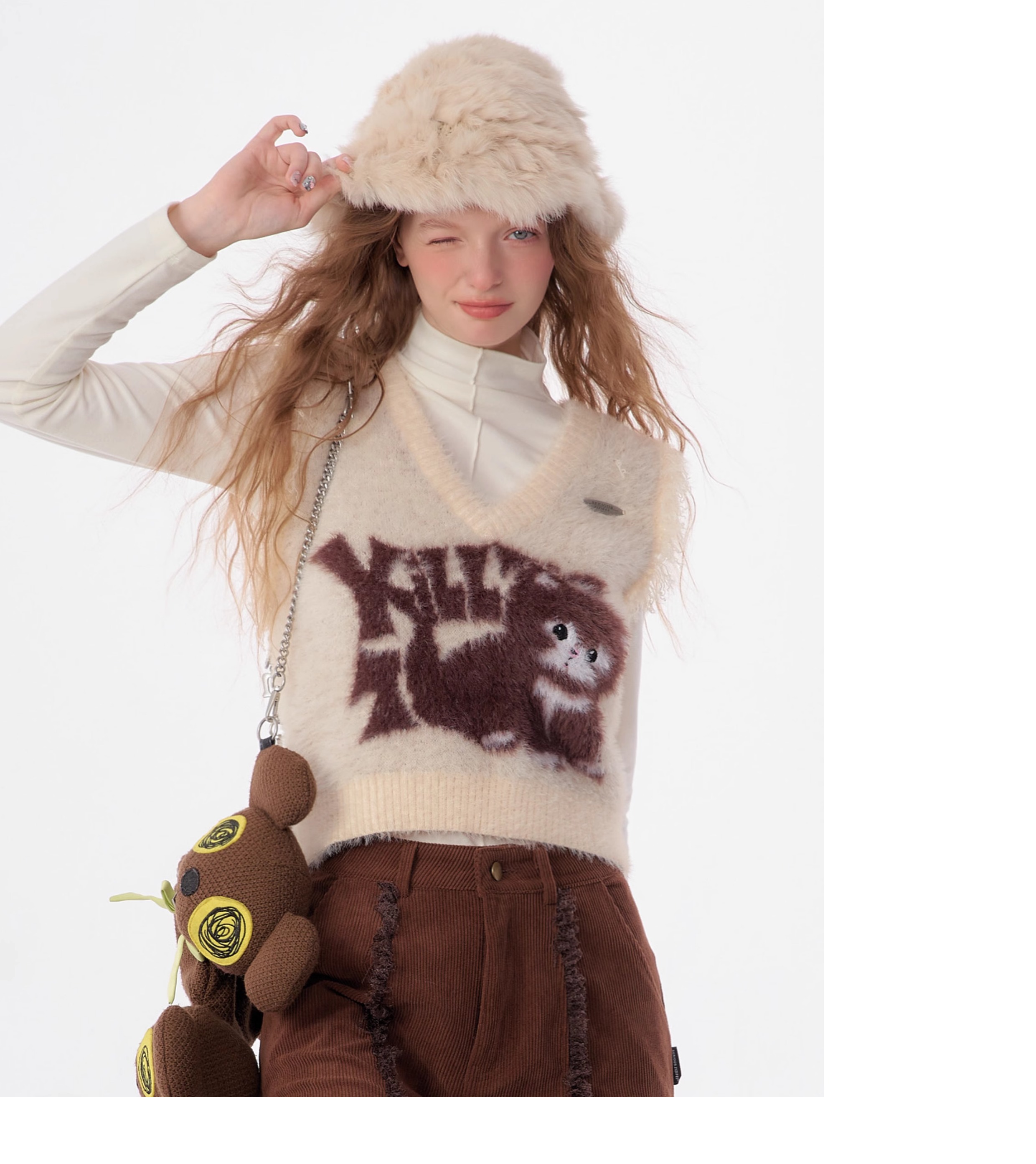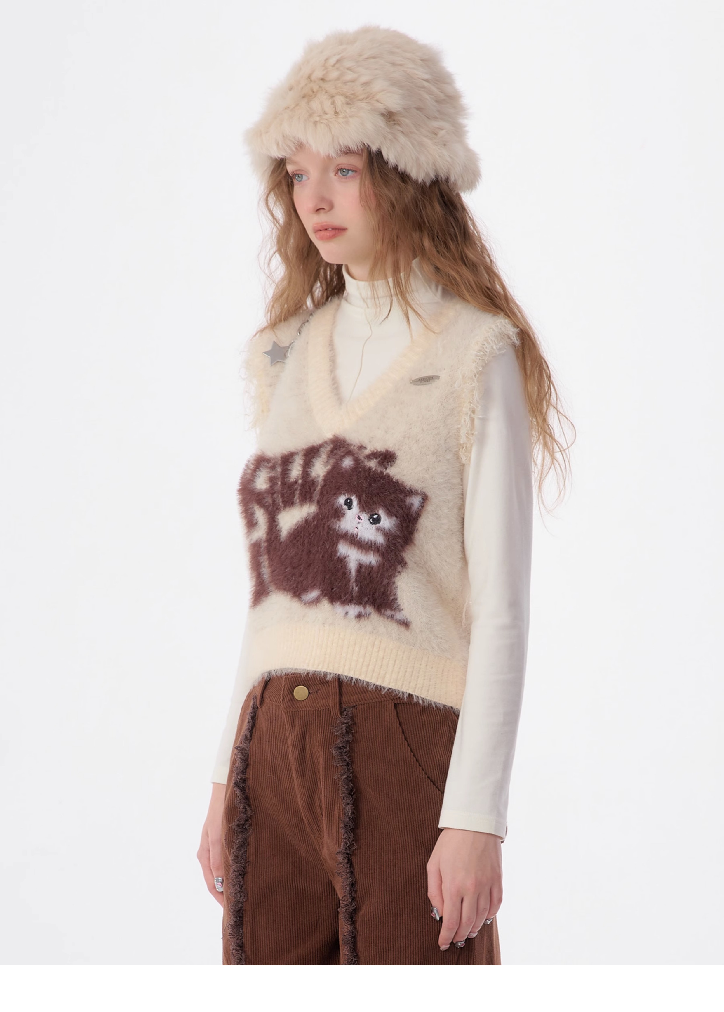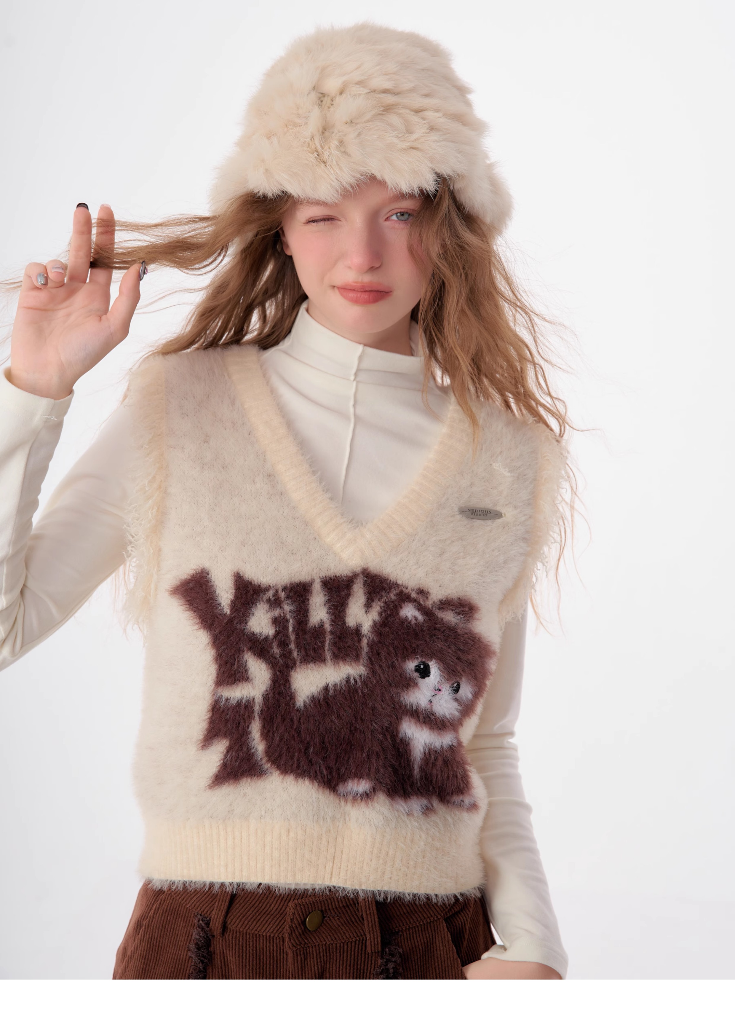Gilet pull à pompon à motif de chat | Gilet tricoté rétro abricot à col en v pour l'automne/hiver