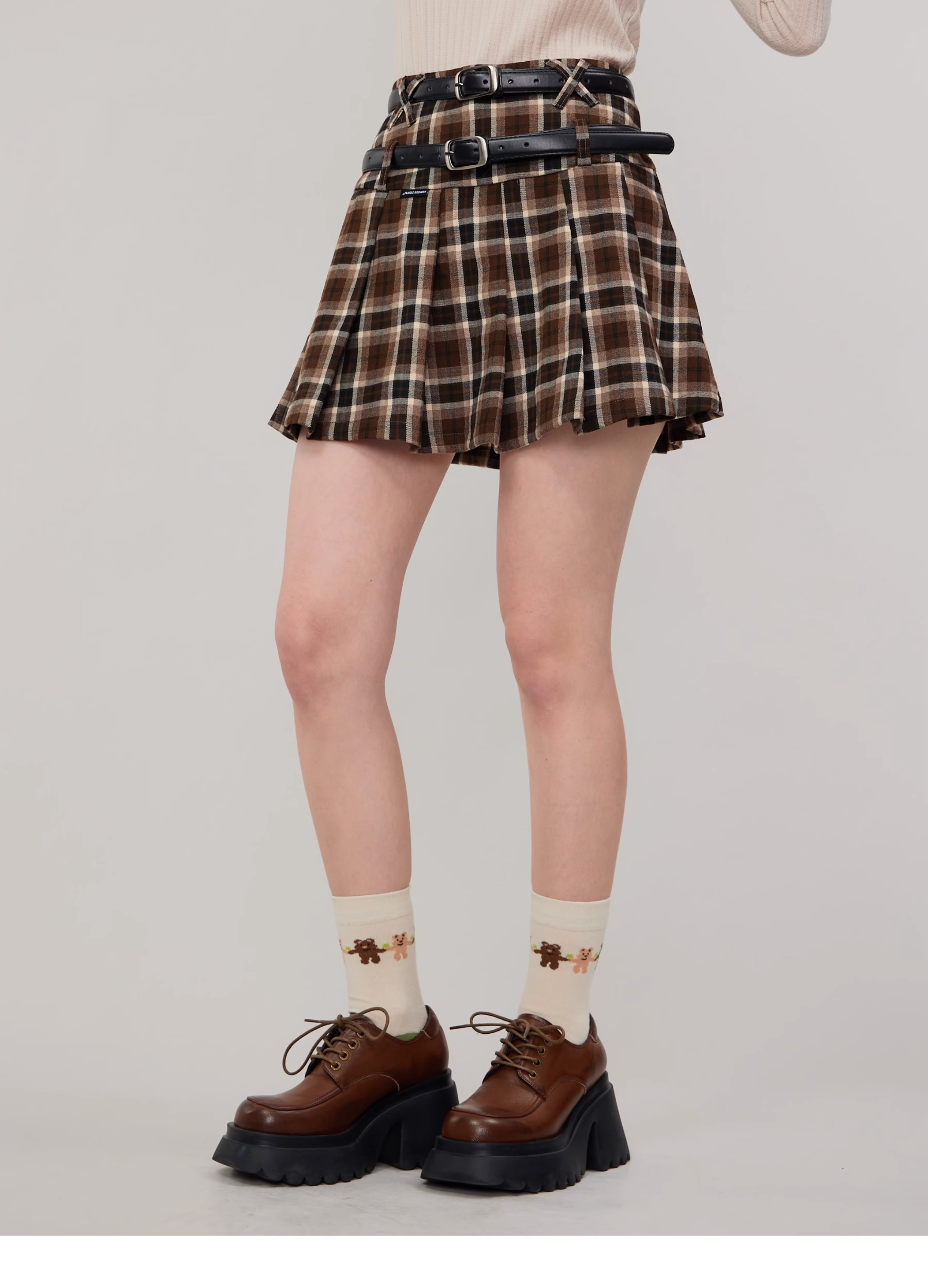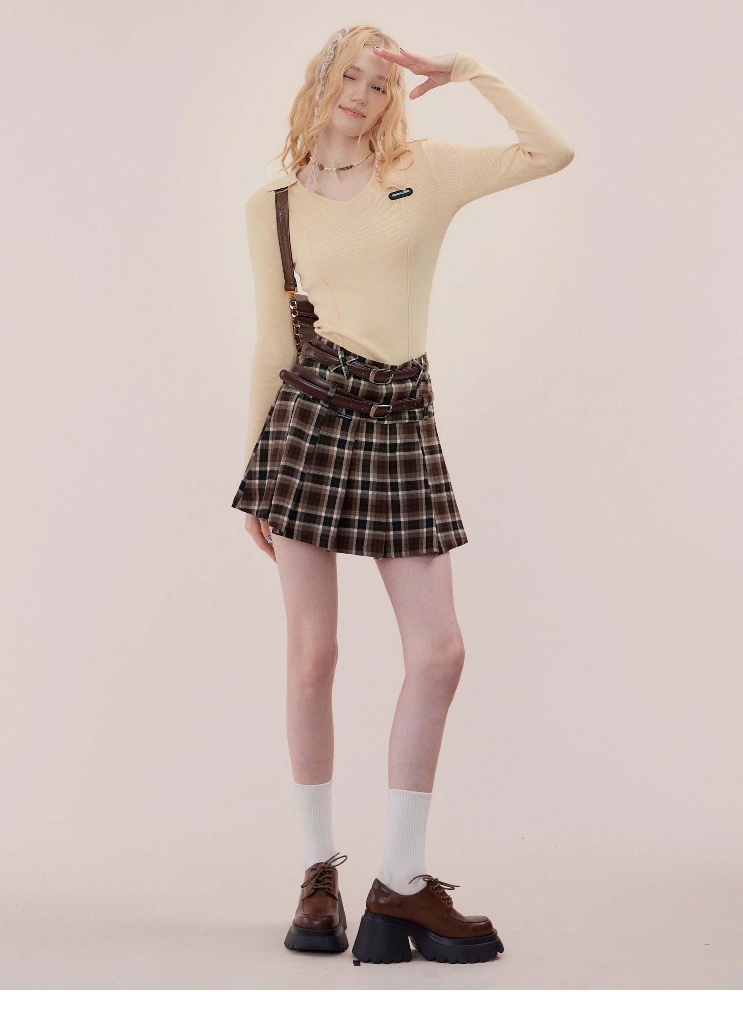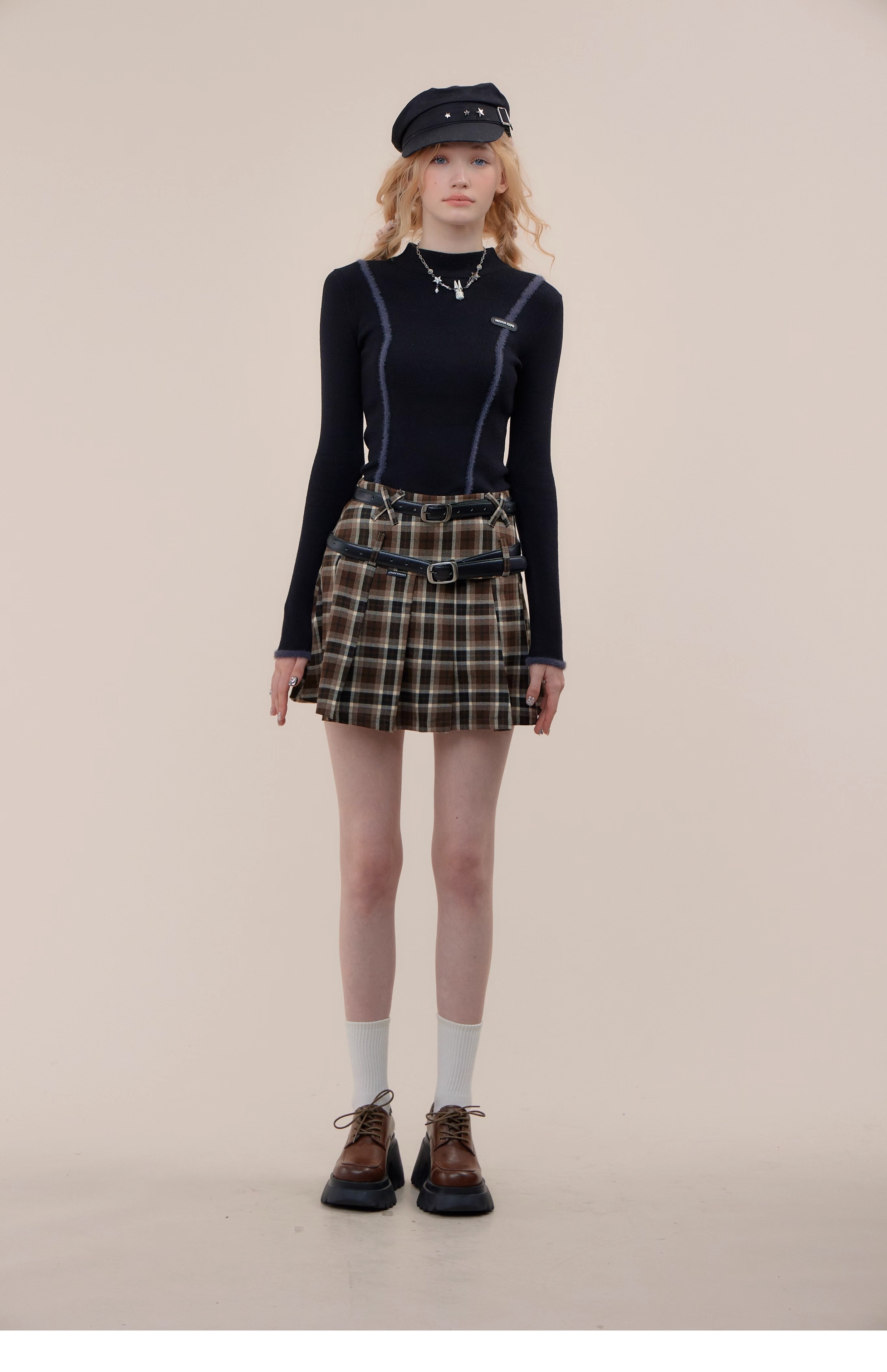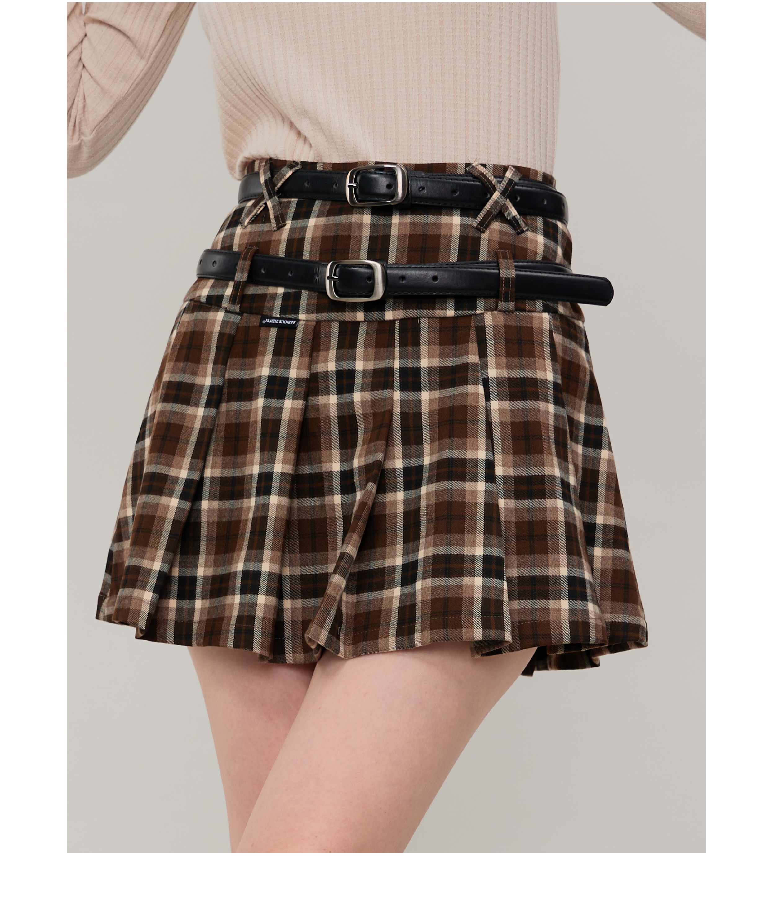 Jupe trapèze à carreaux marron | Taille haute, coupe ajustée, Design plissé rétro pour l'automne/hiver