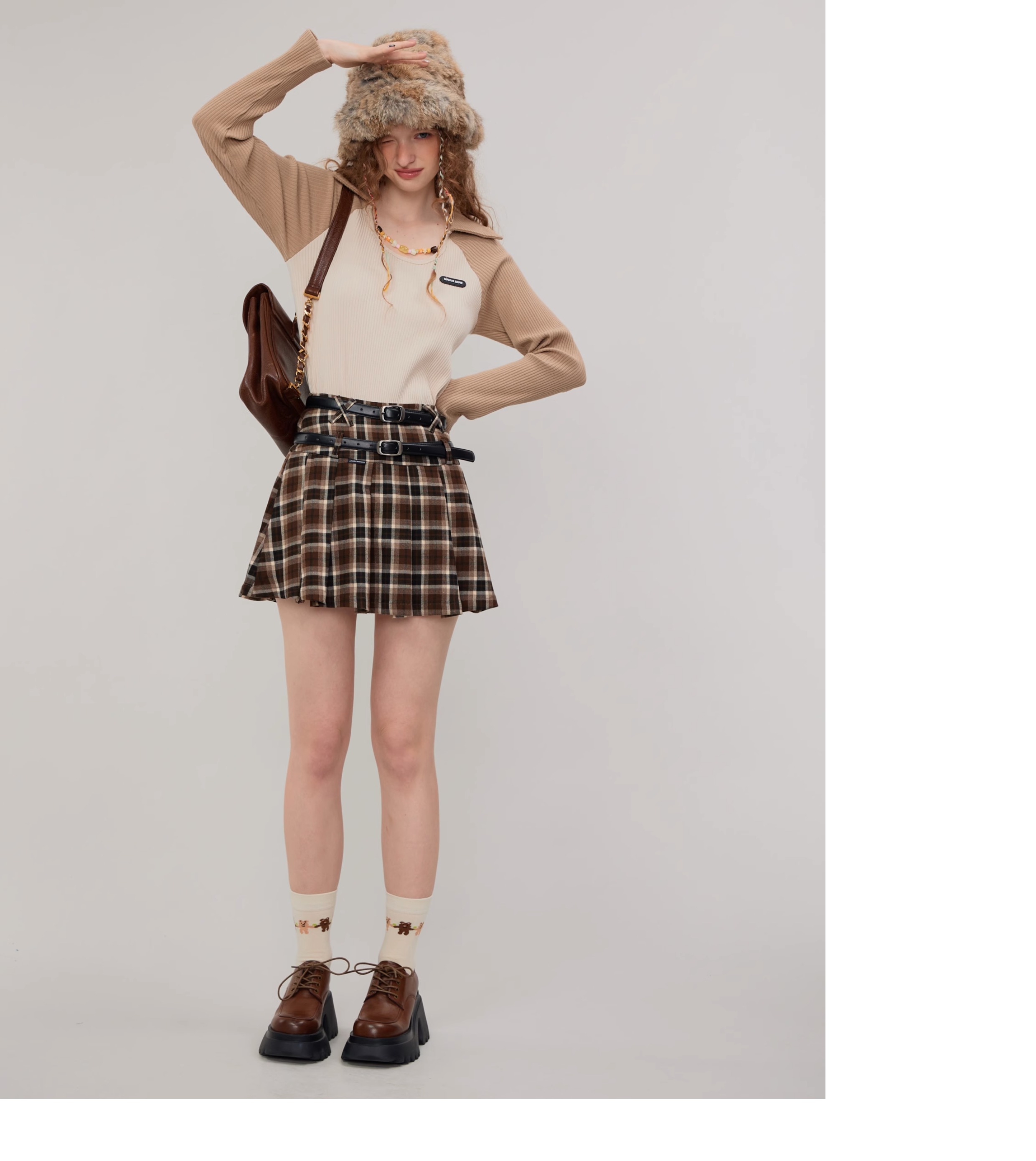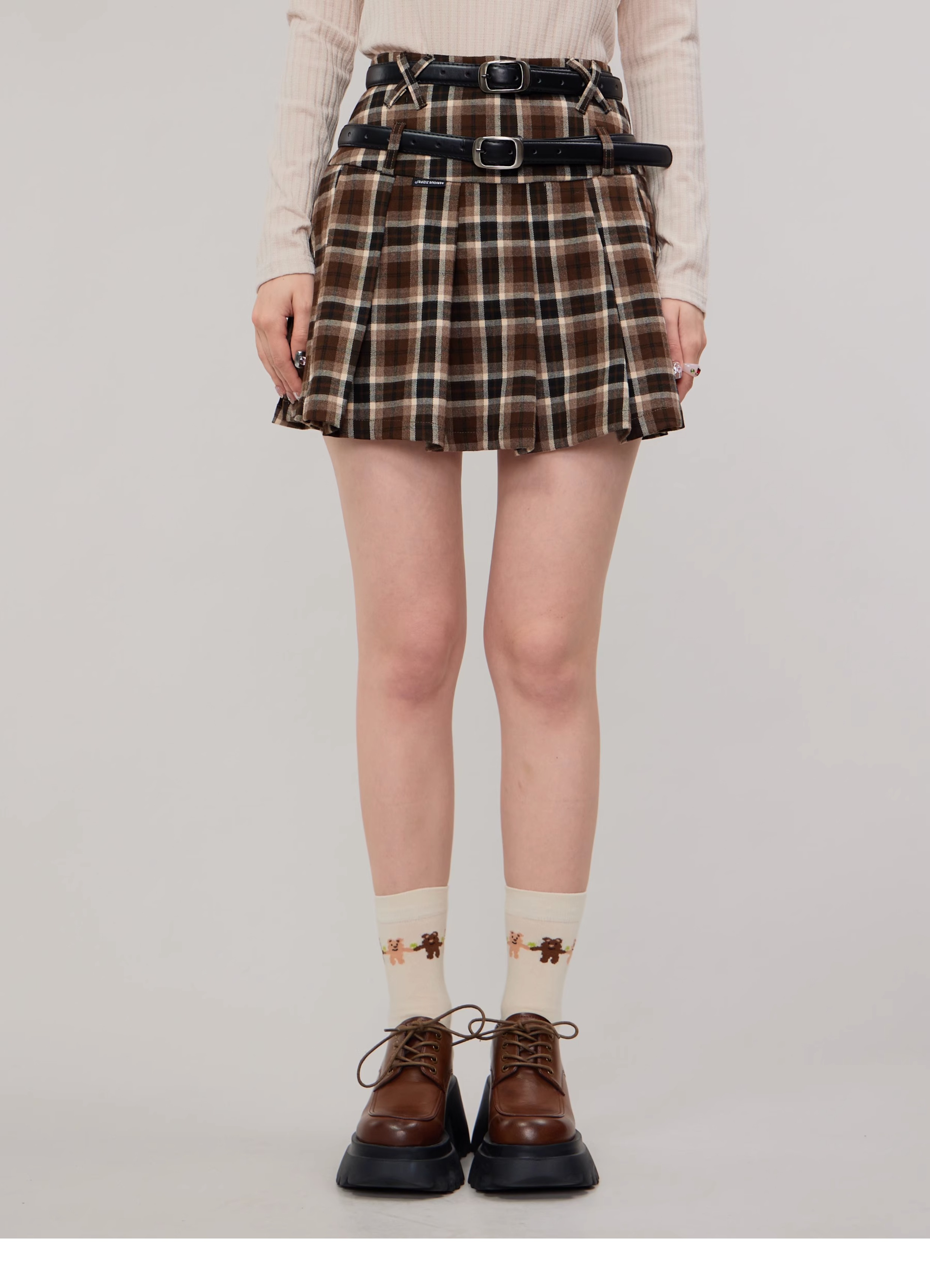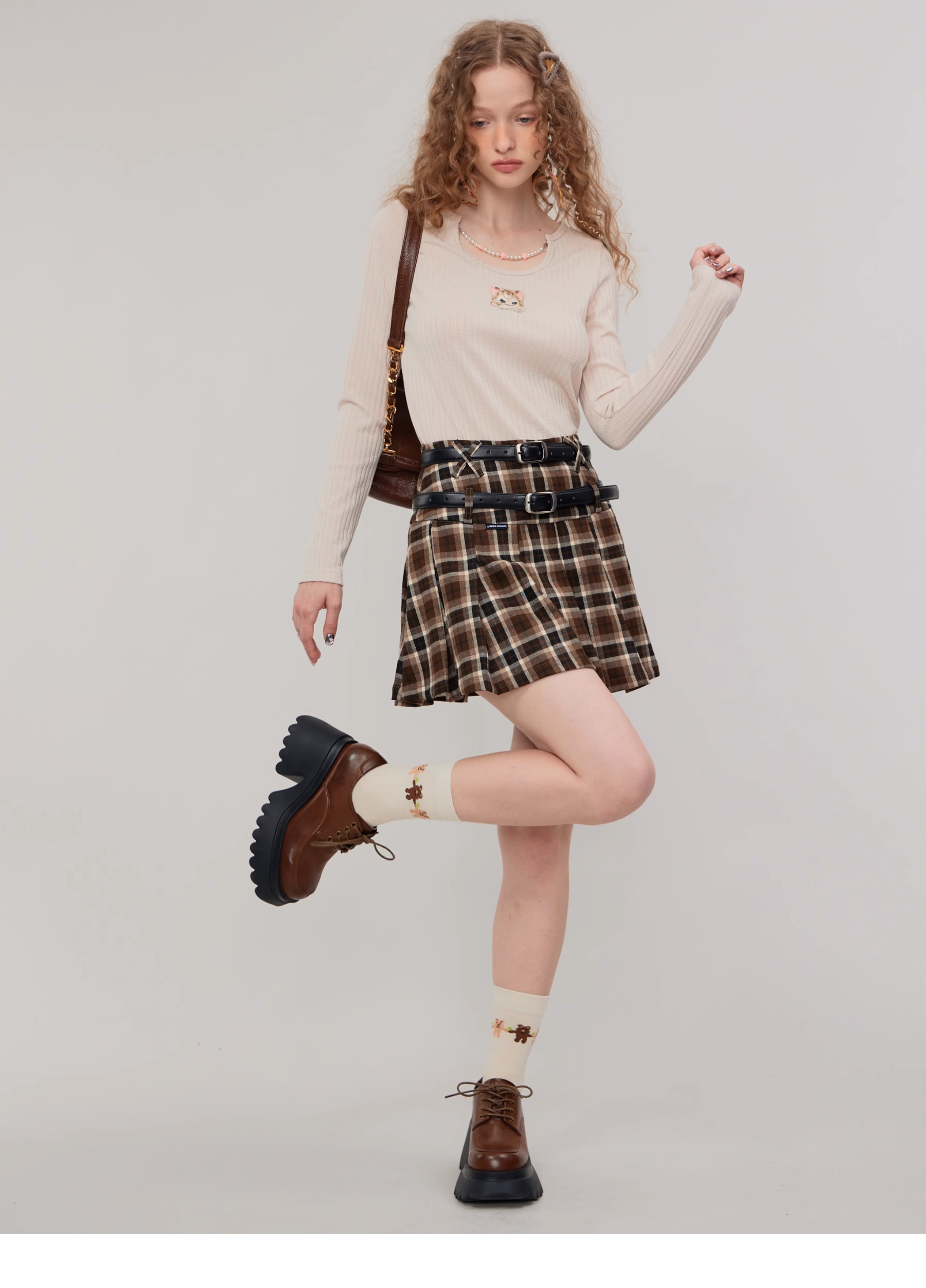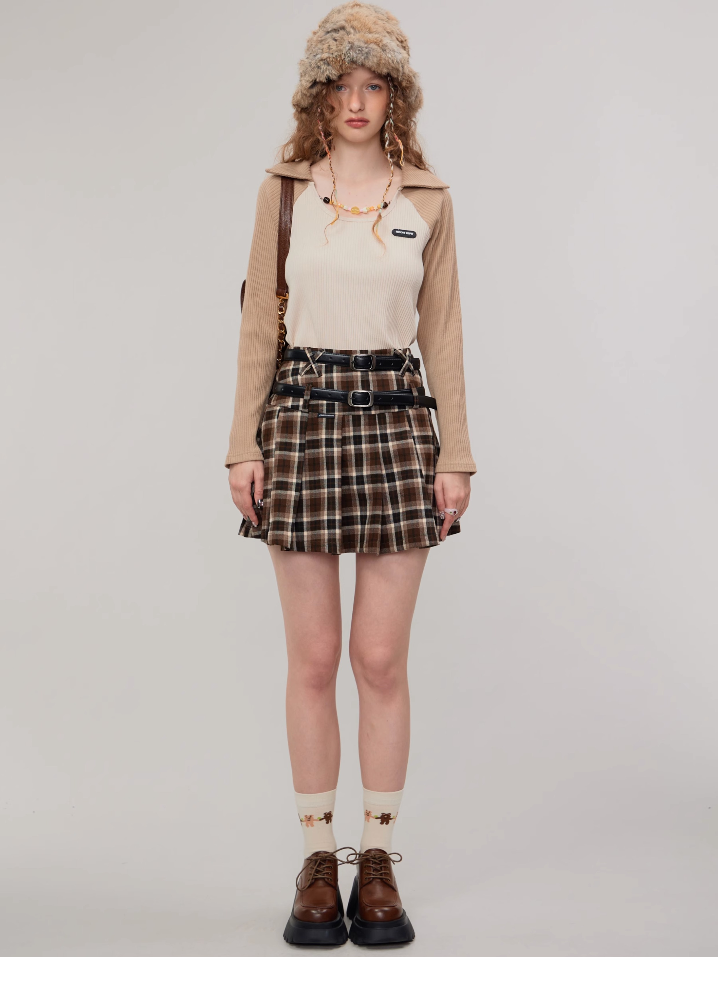 Jupe trapèze à carreaux marron | Taille haute, coupe ajustée, Design plissé rétro pour l'automne/hiver