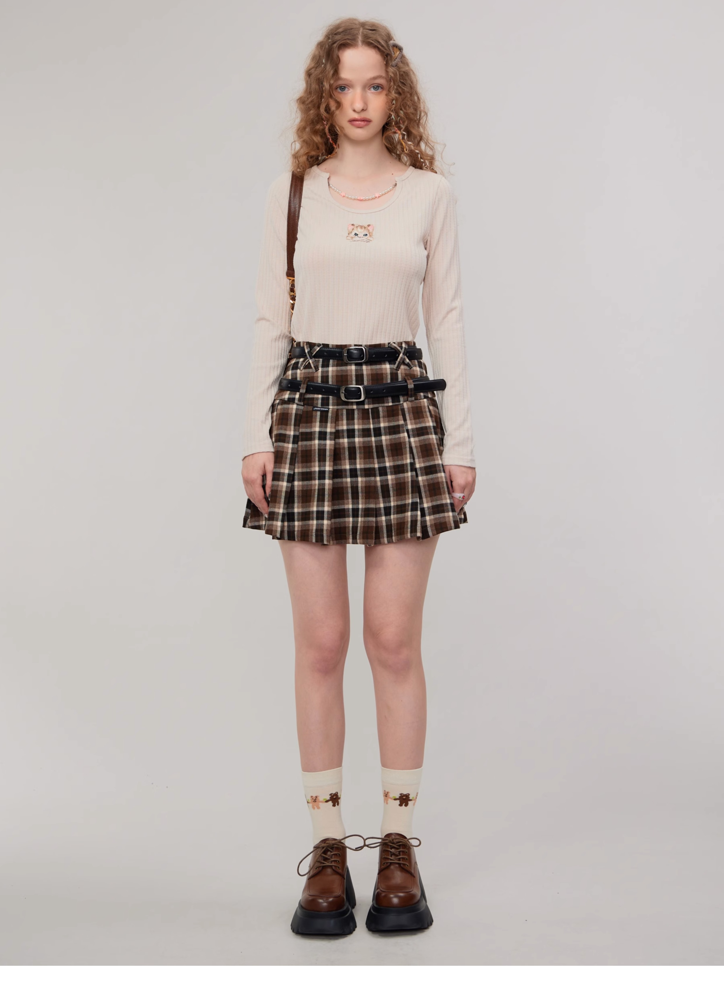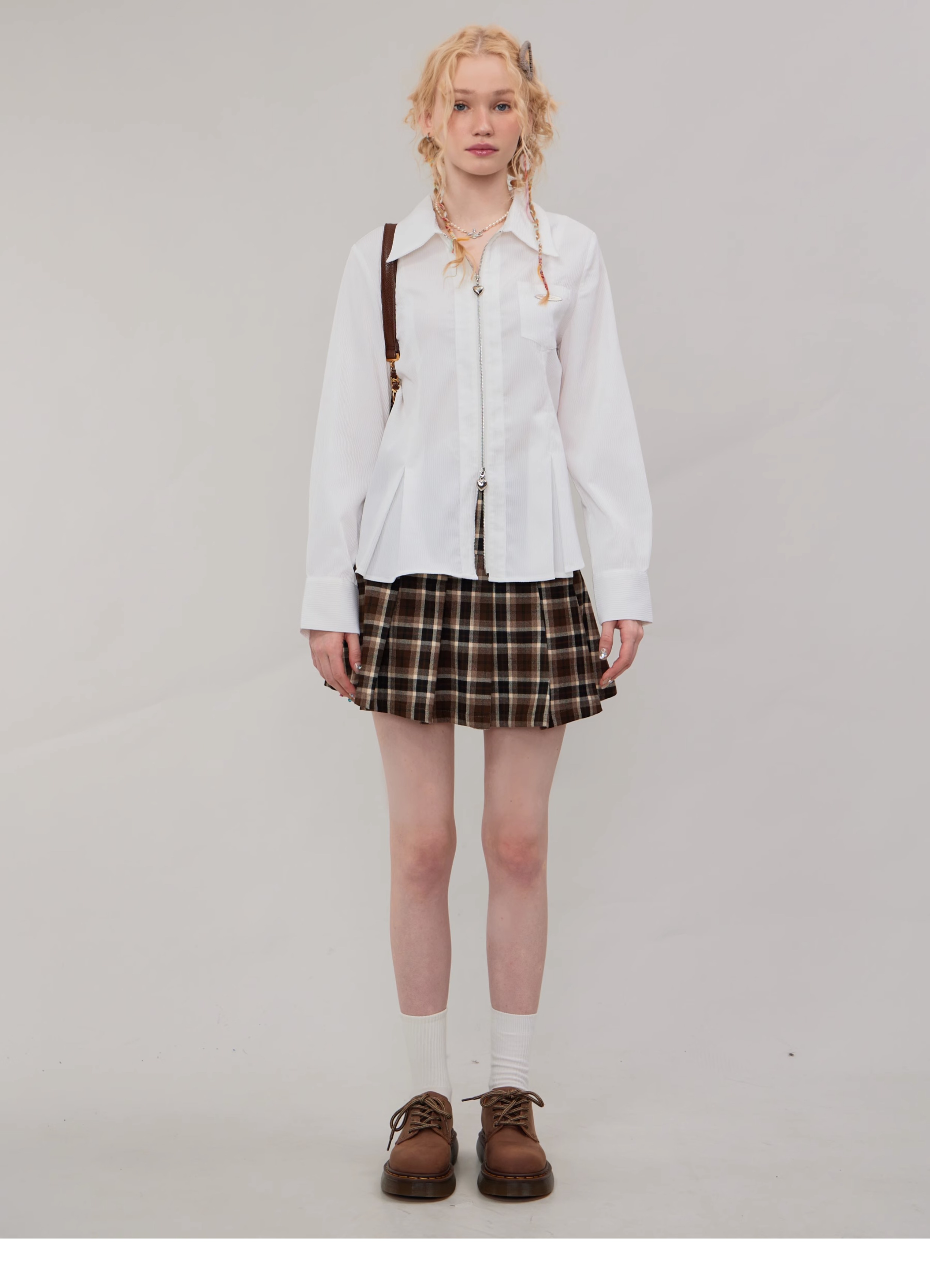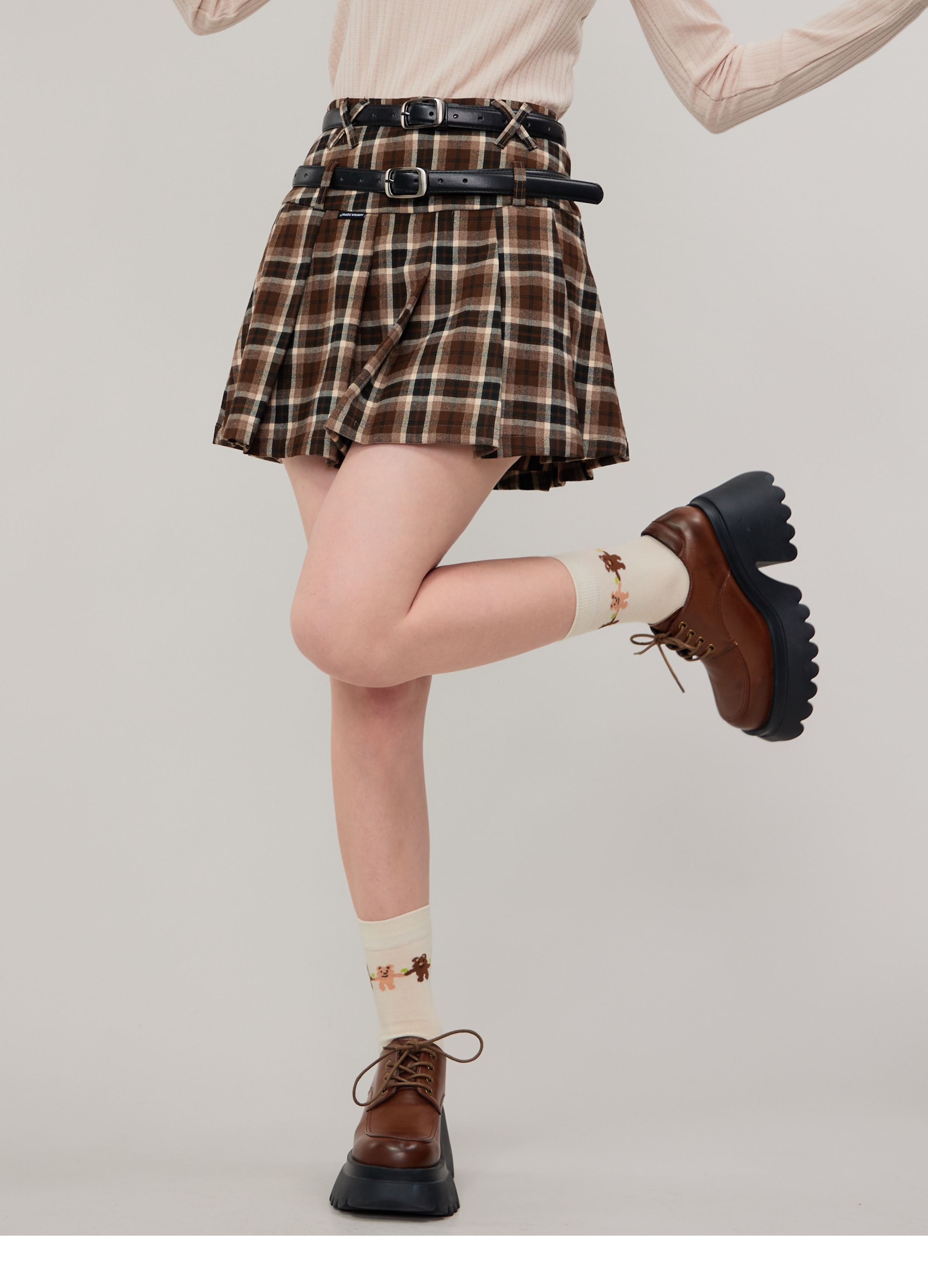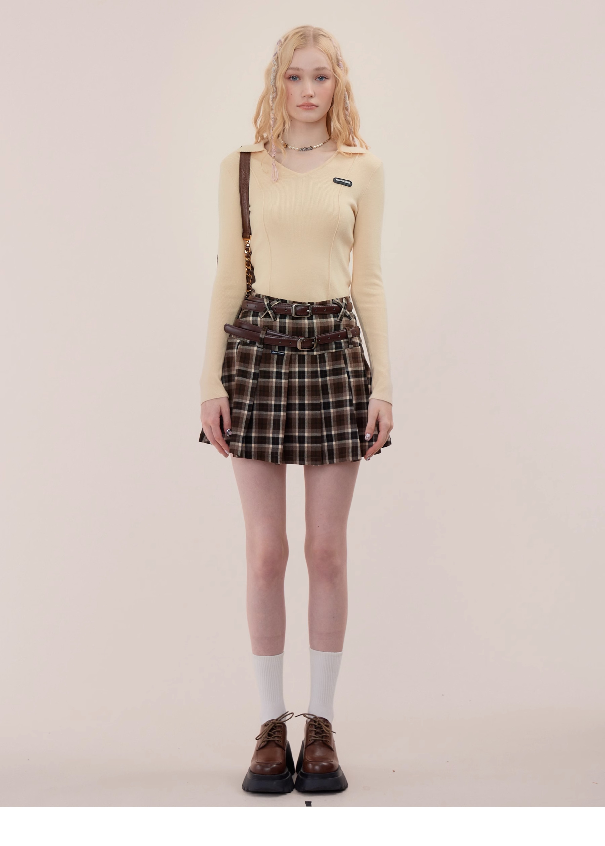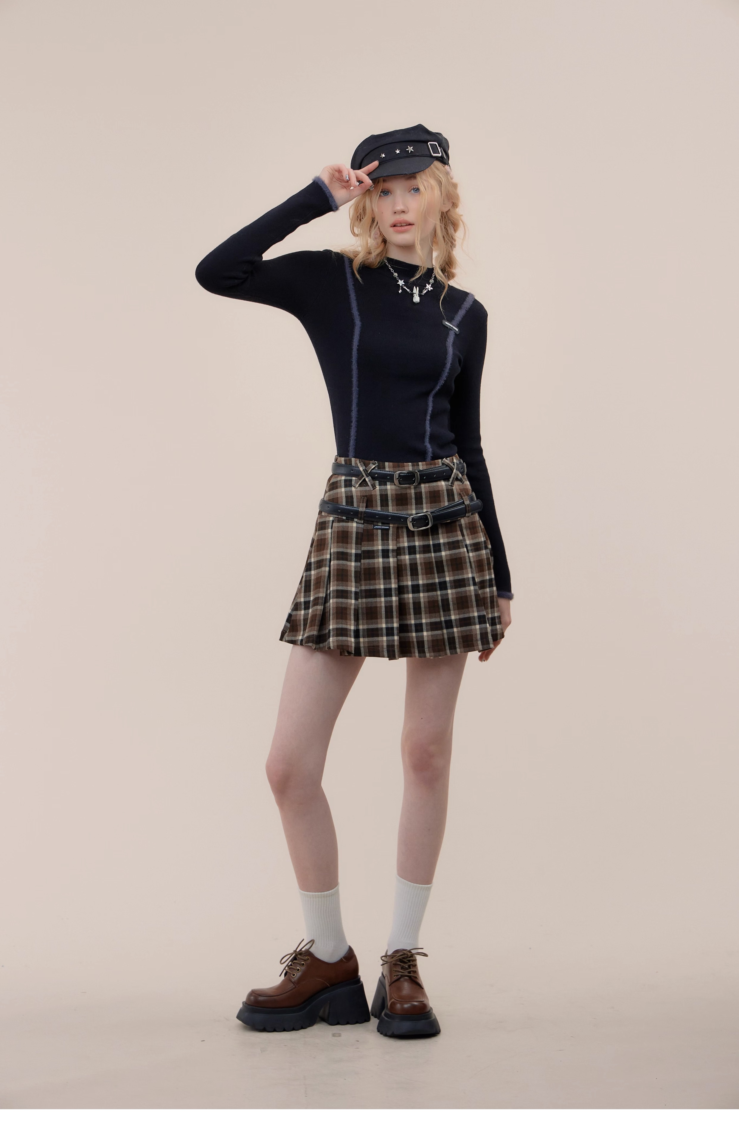 Jupe trapèze à carreaux marron | Taille haute, coupe ajustée, Design plissé rétro pour l'automne/hiver