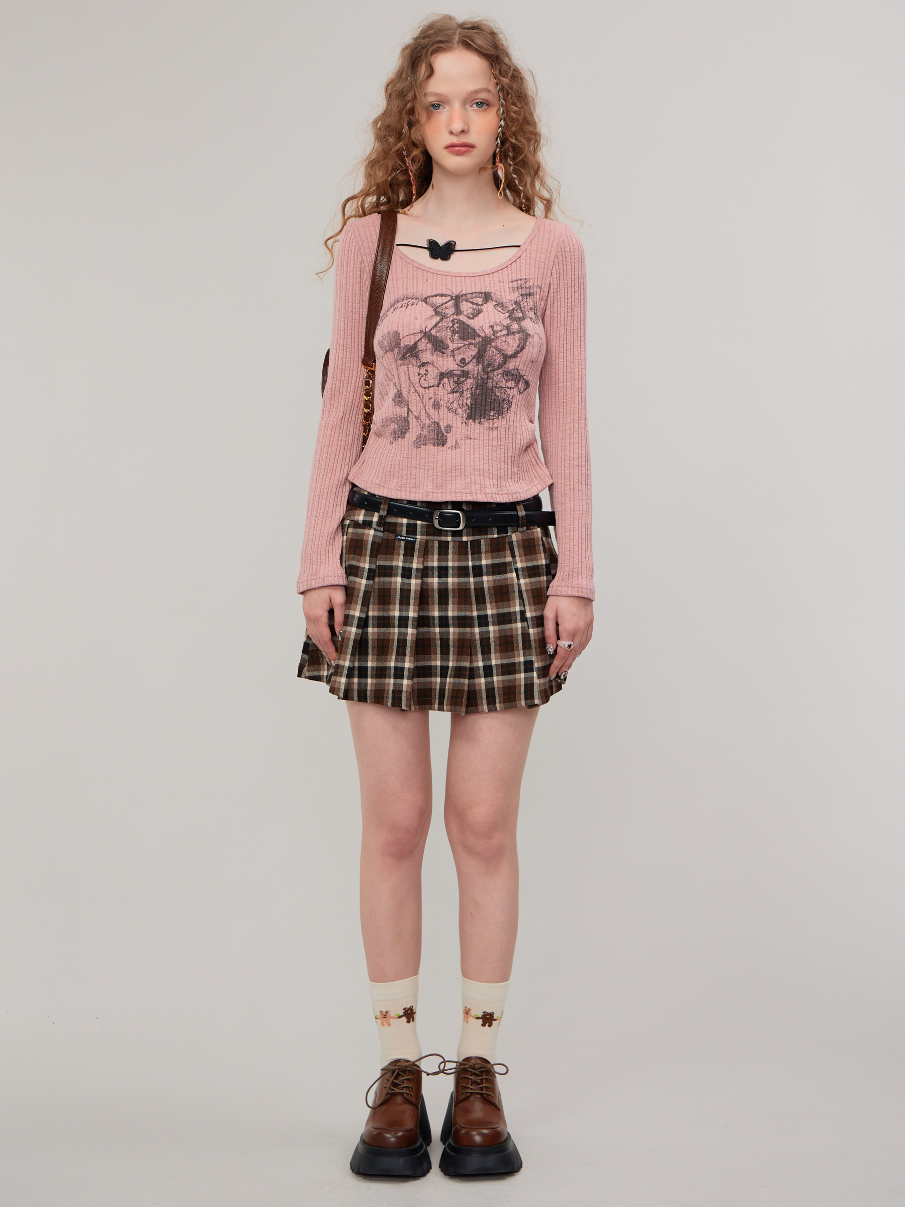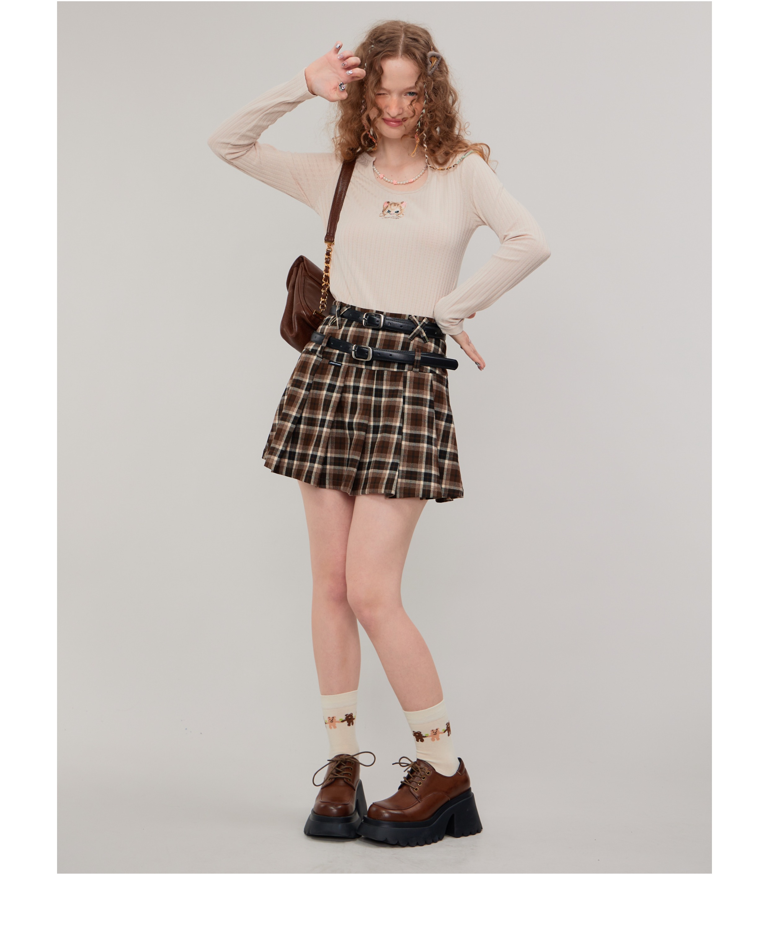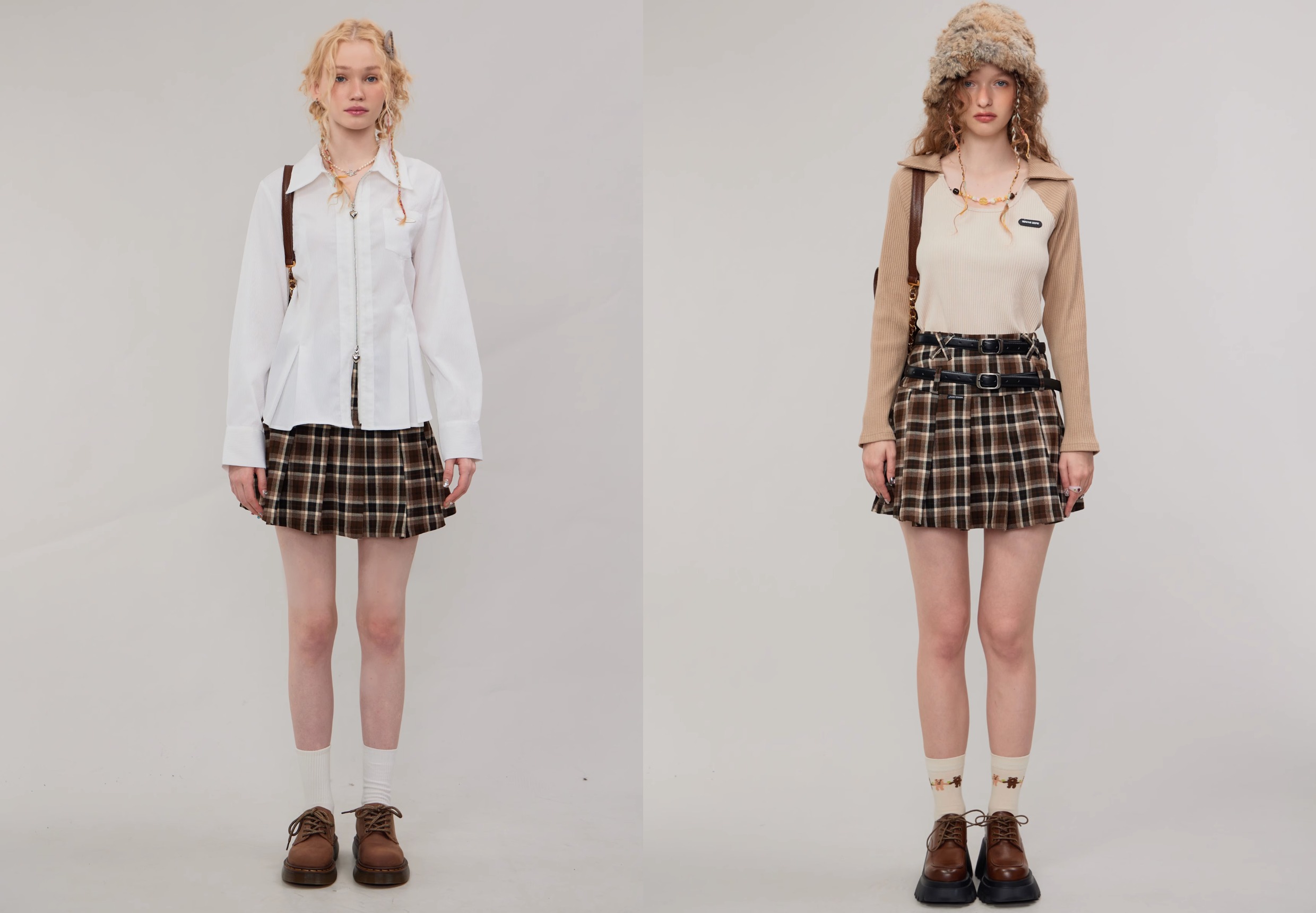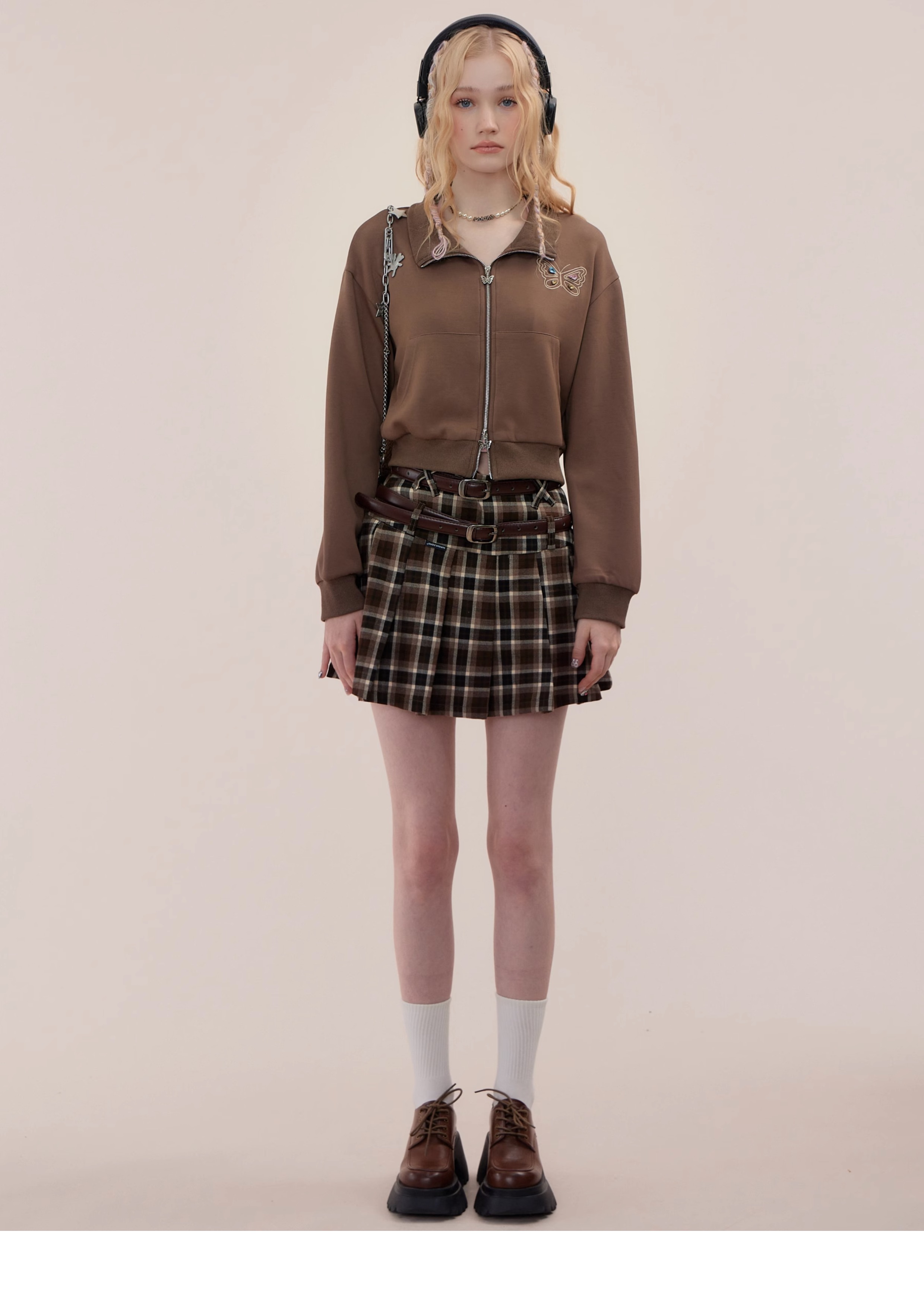 Jupe trapèze à carreaux marron | Taille haute, coupe ajustée, Design plissé rétro pour l'automne/hiver