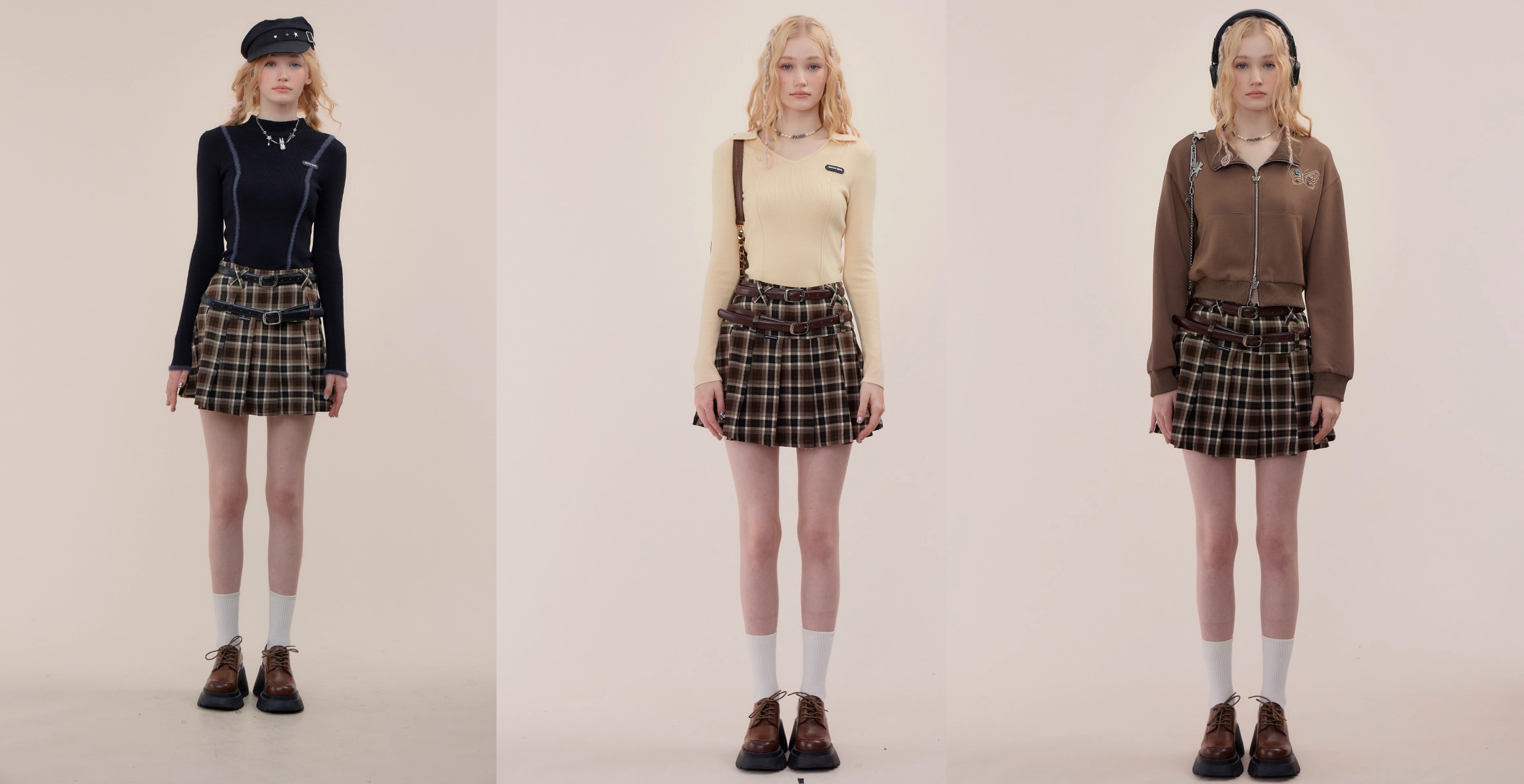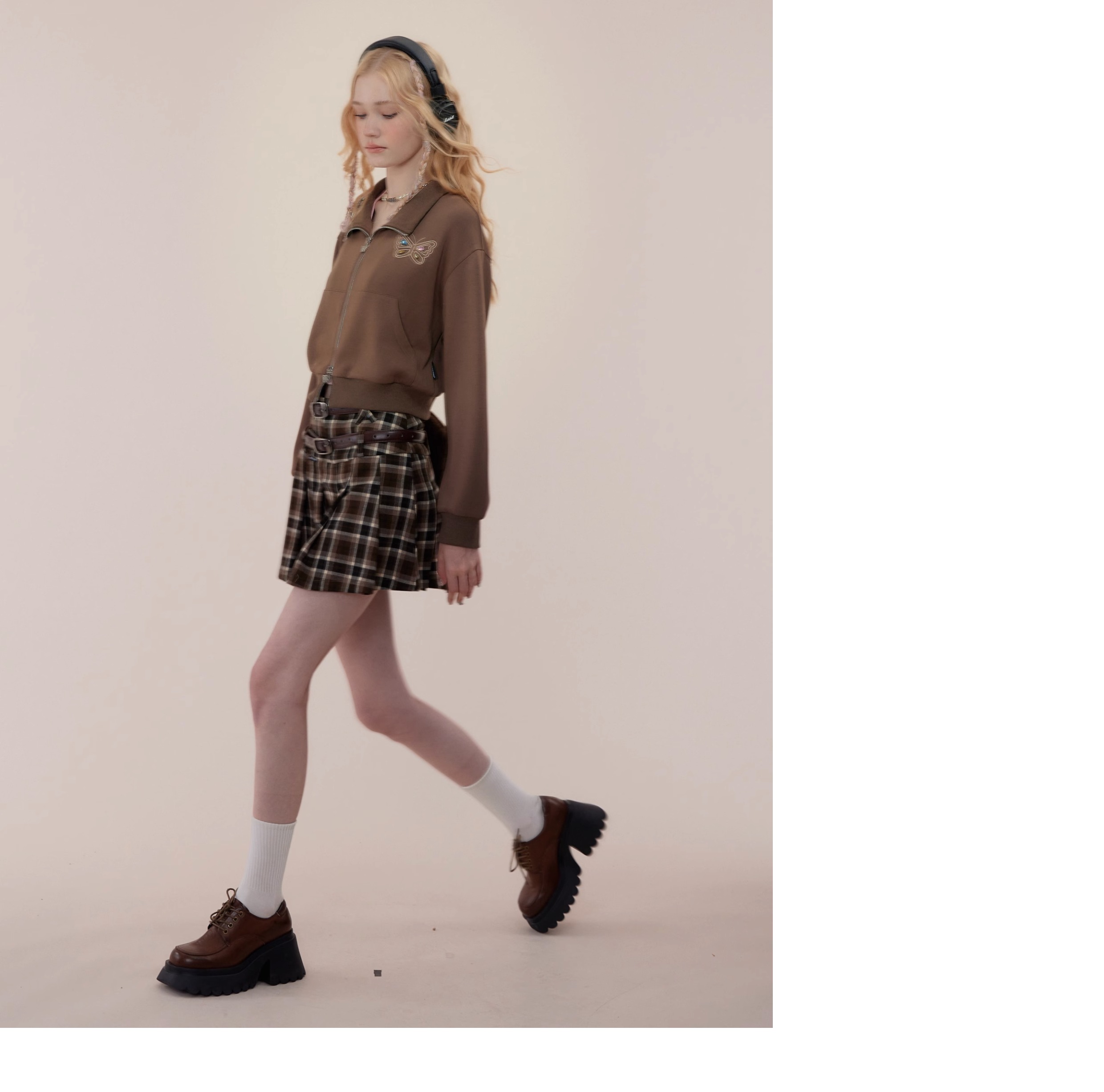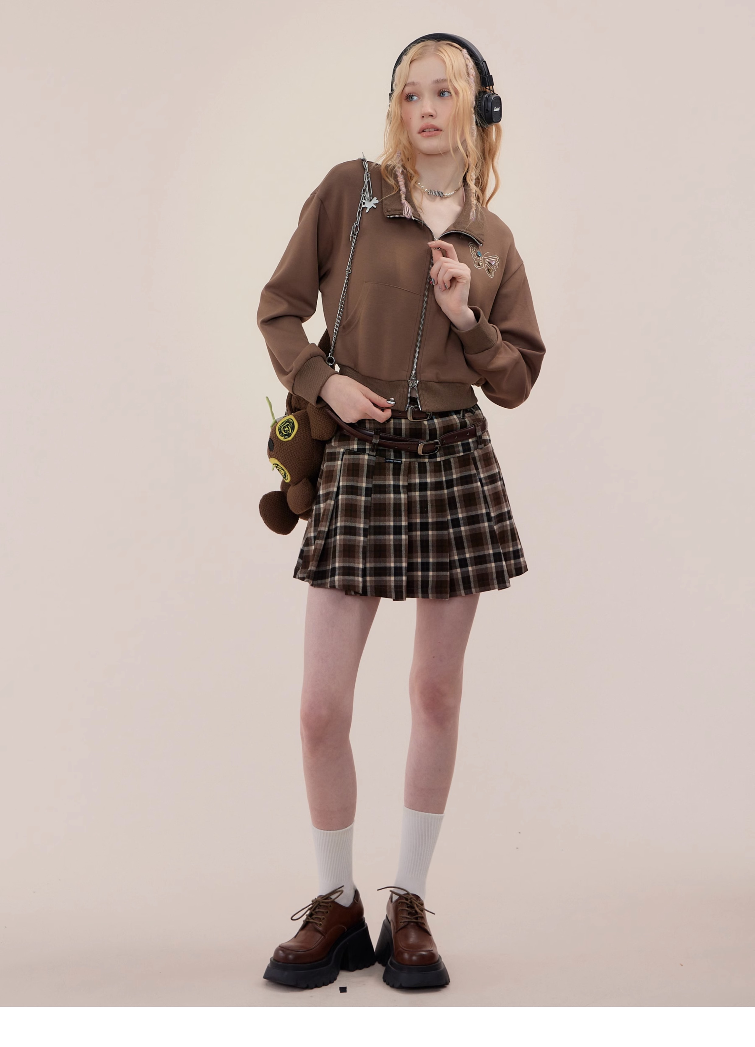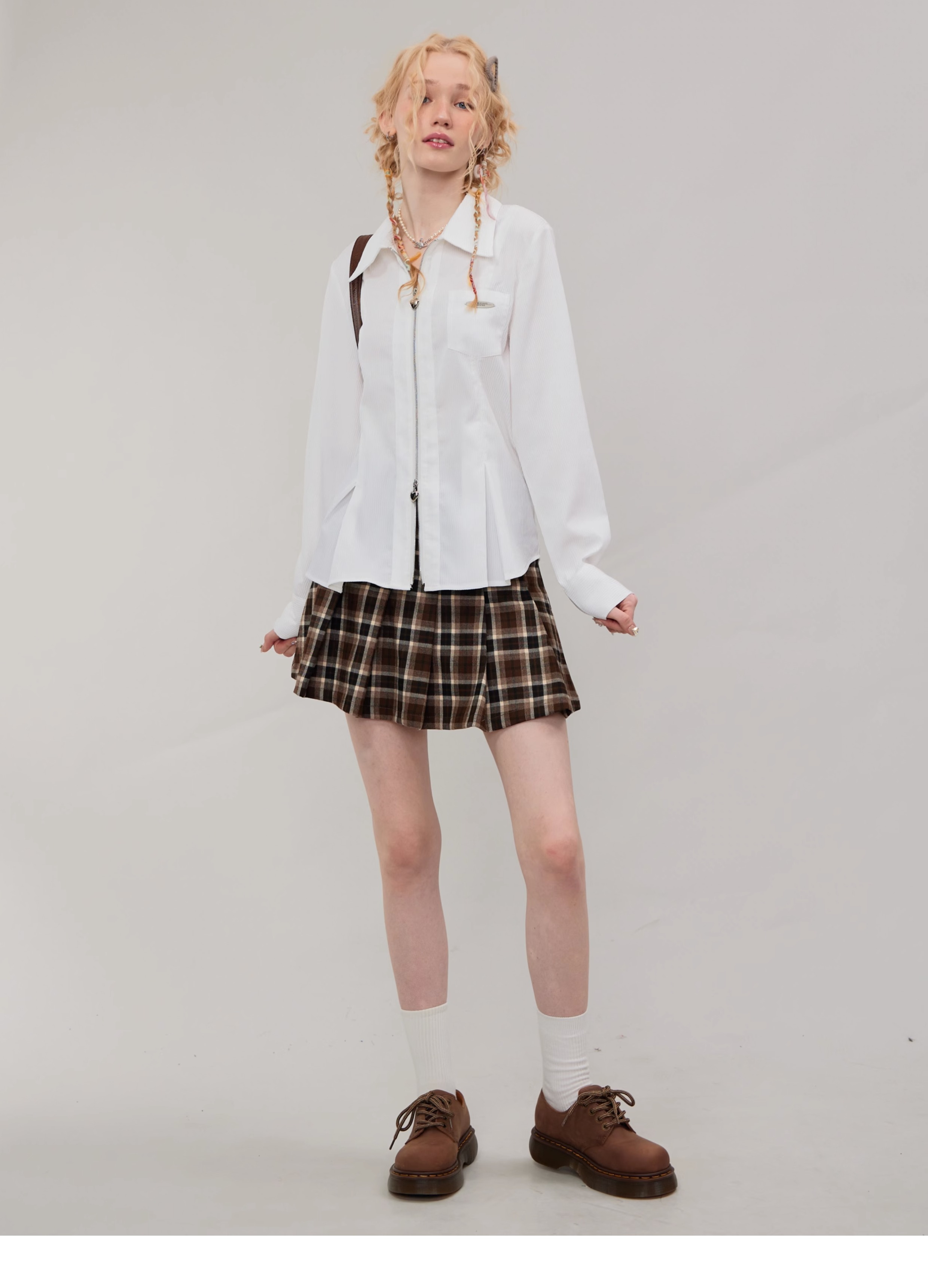 Jupe trapèze à carreaux marron | Taille haute, coupe ajustée, Design plissé rétro pour l'automne/hiver