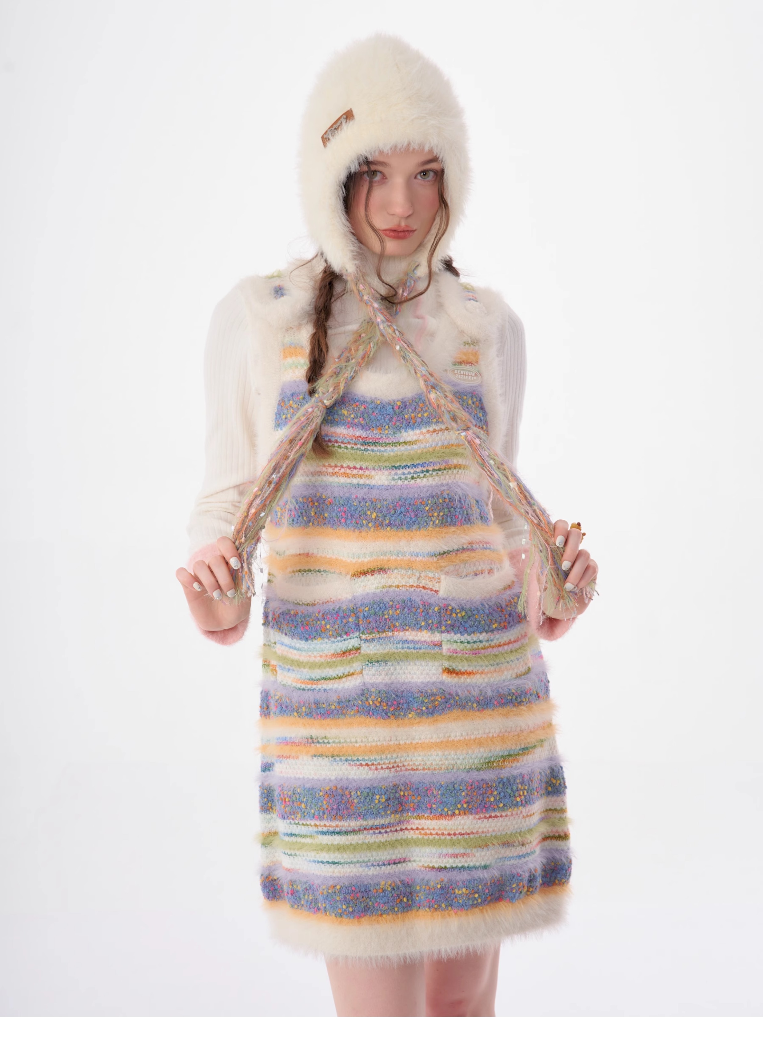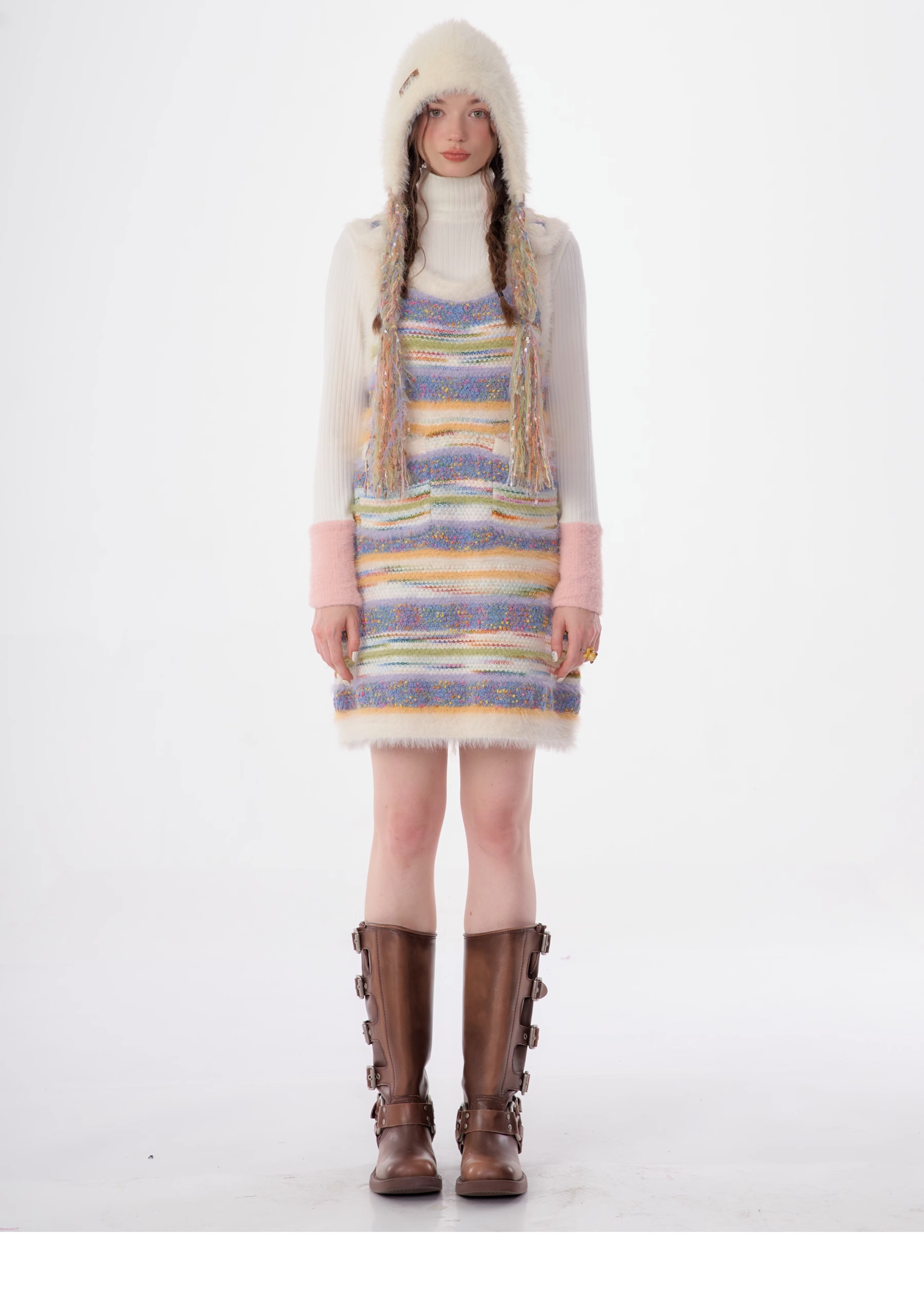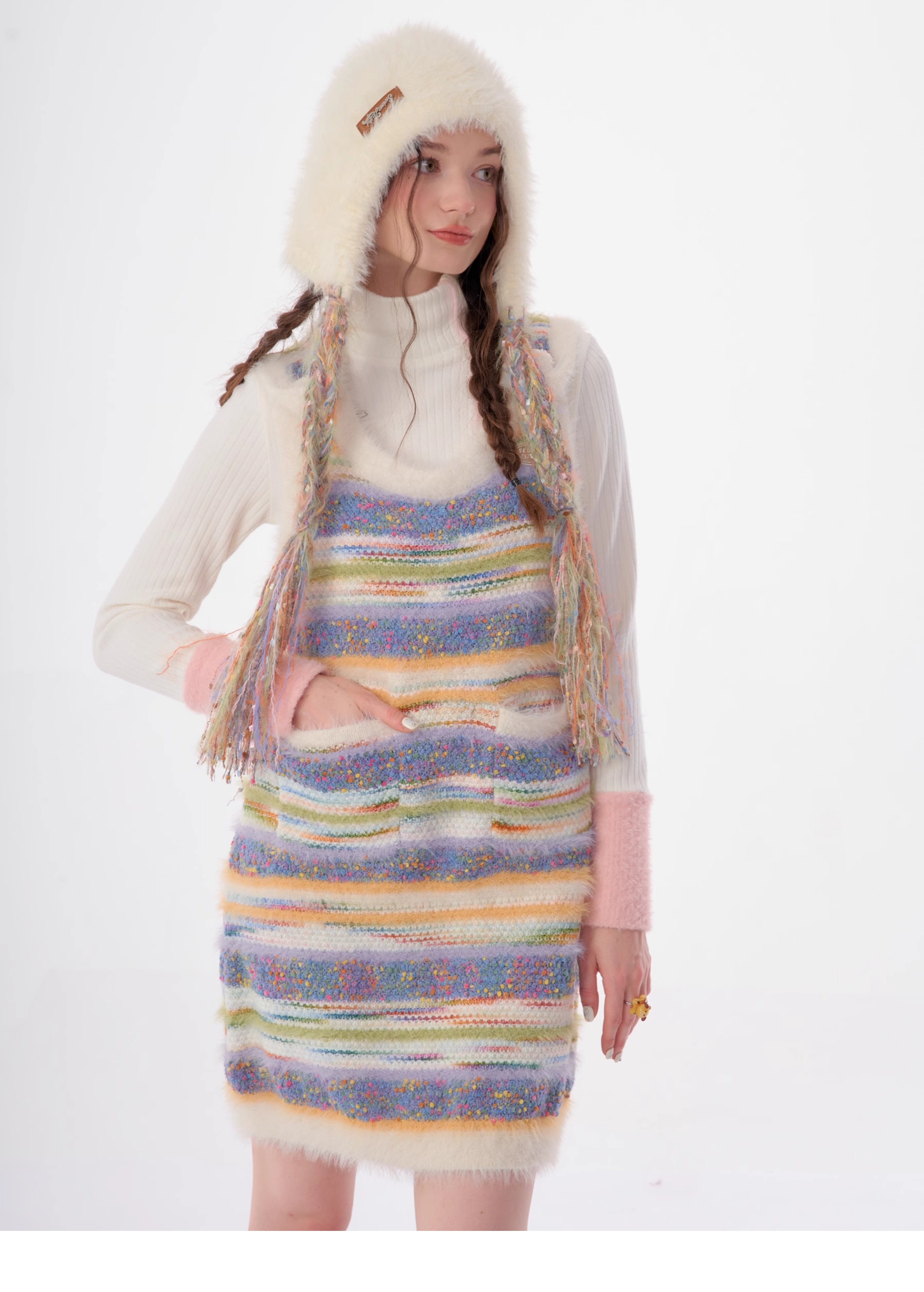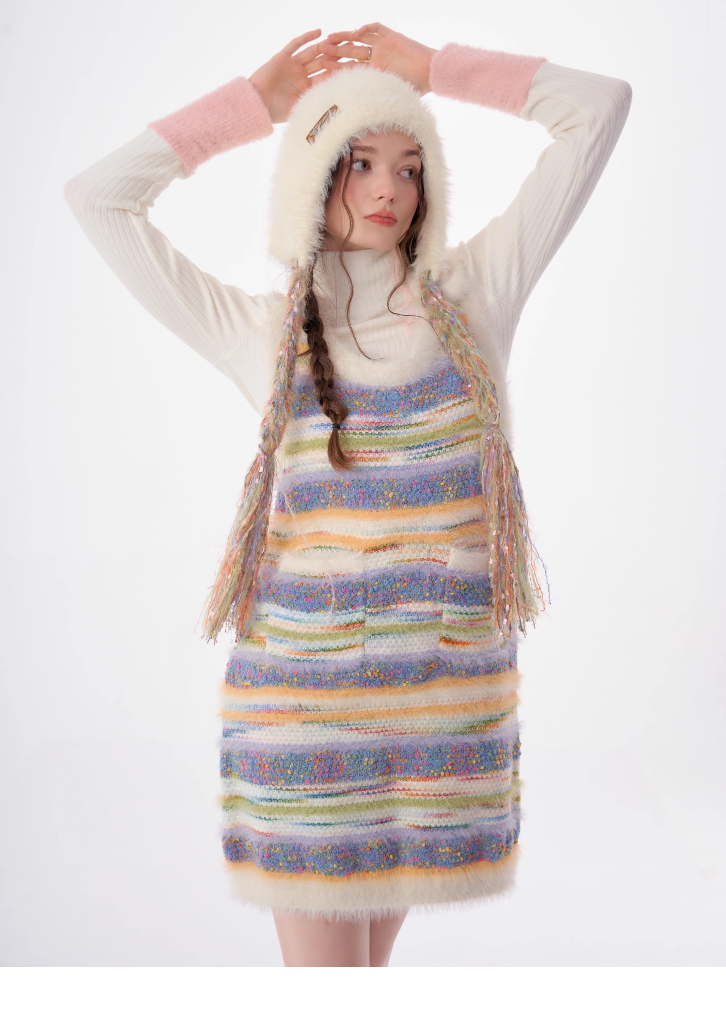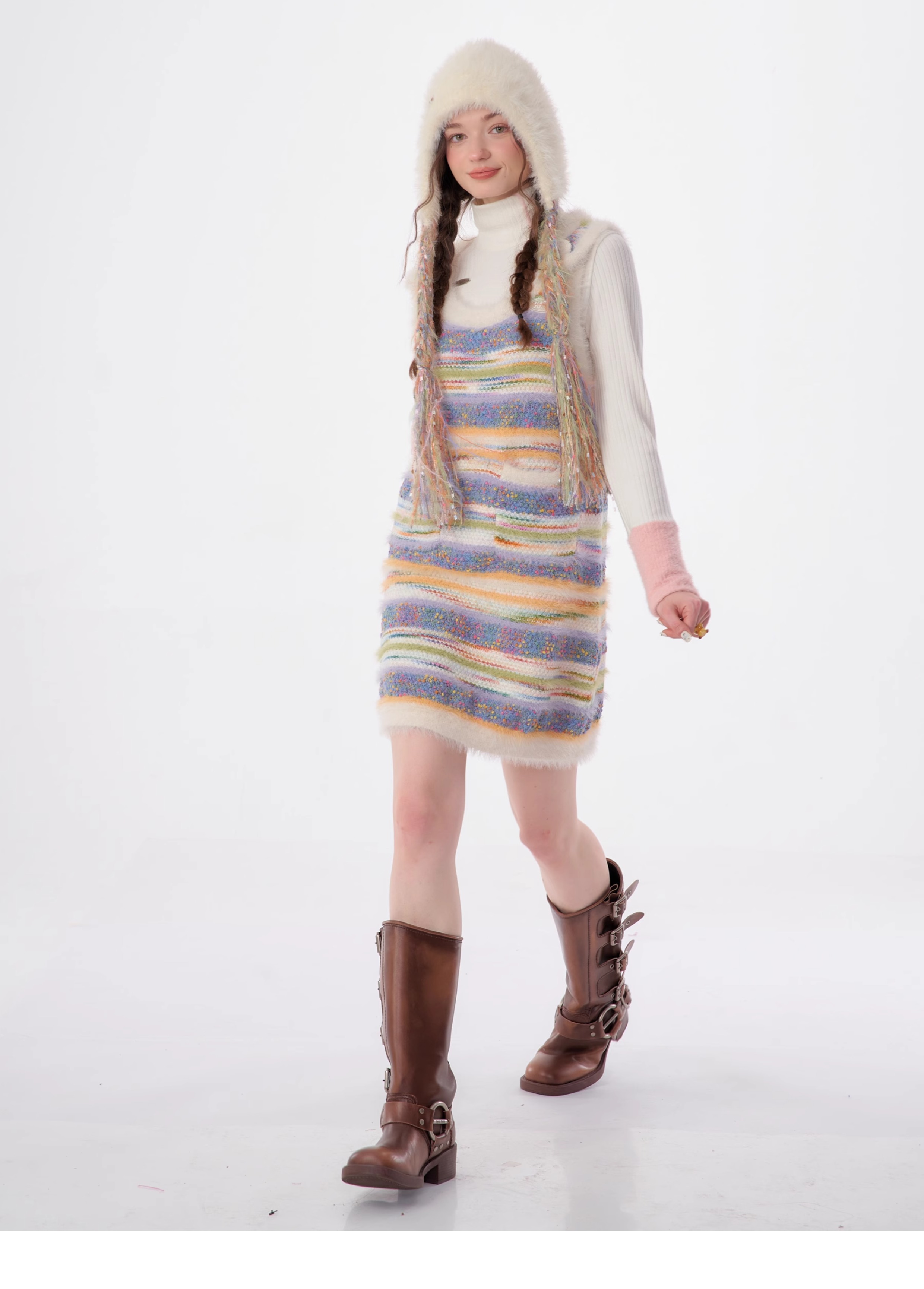 Robe débardeur tricotée à rayures rétro | Jupe longue en peluche sans manches pour l'automne/hiver