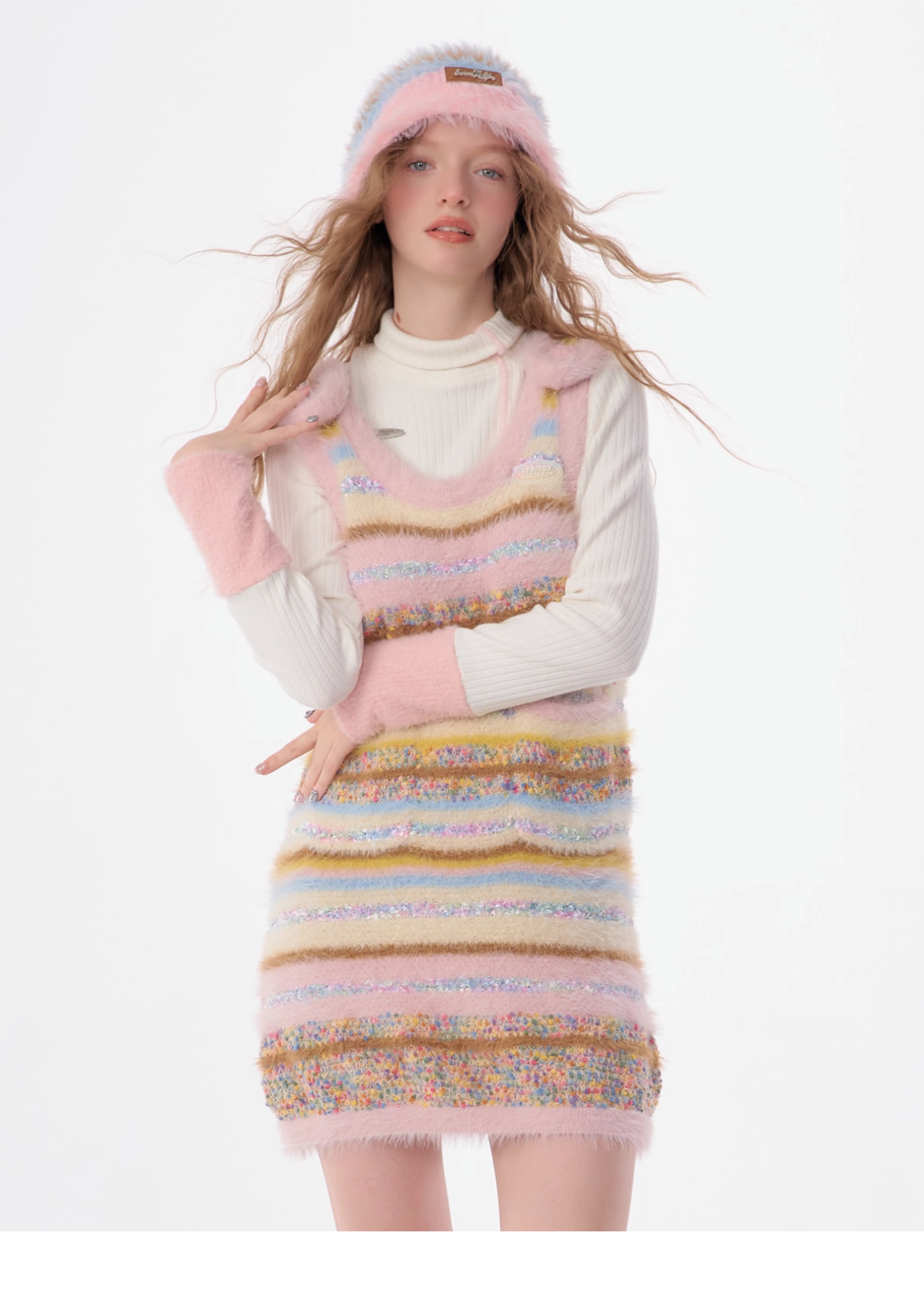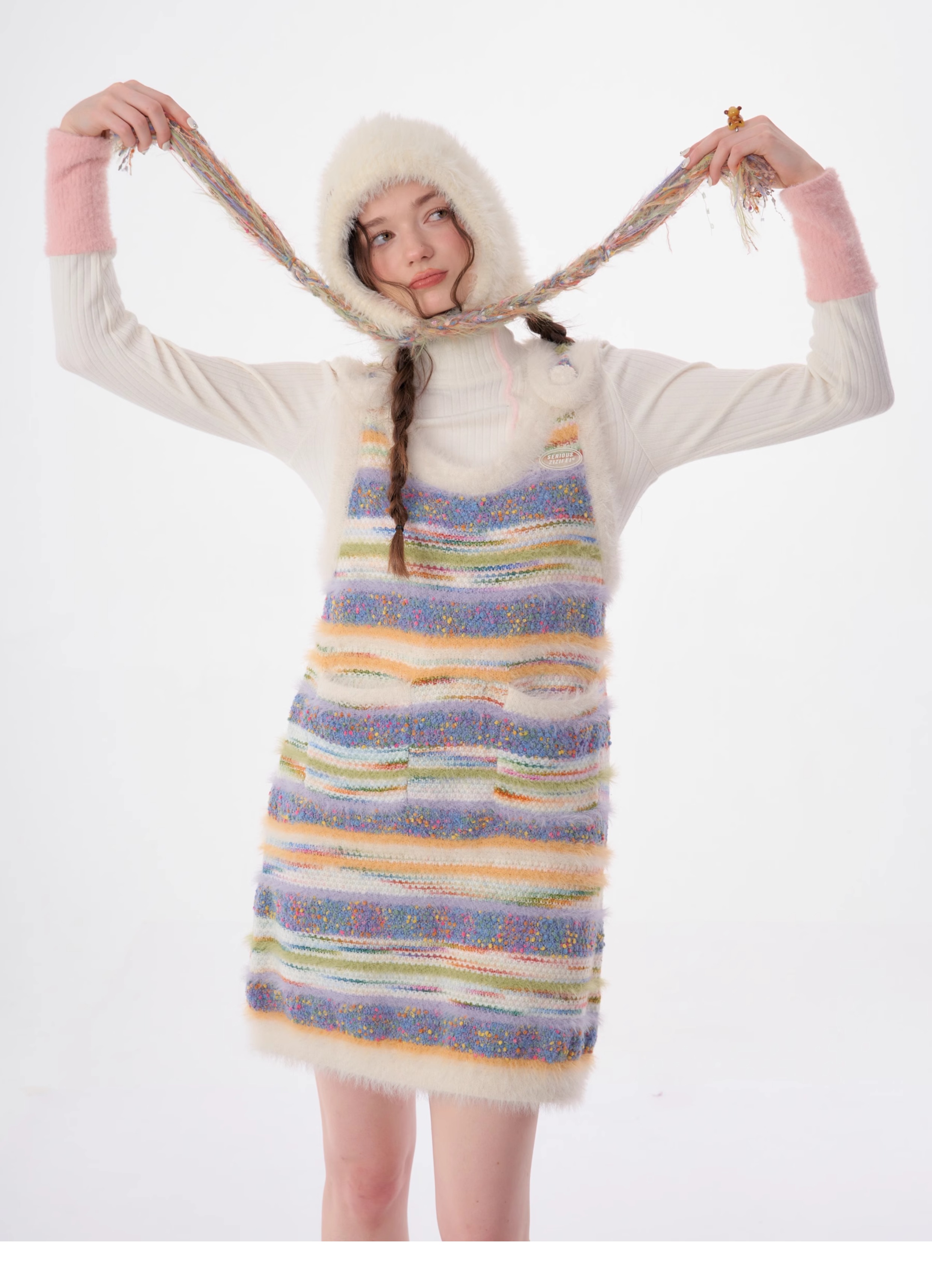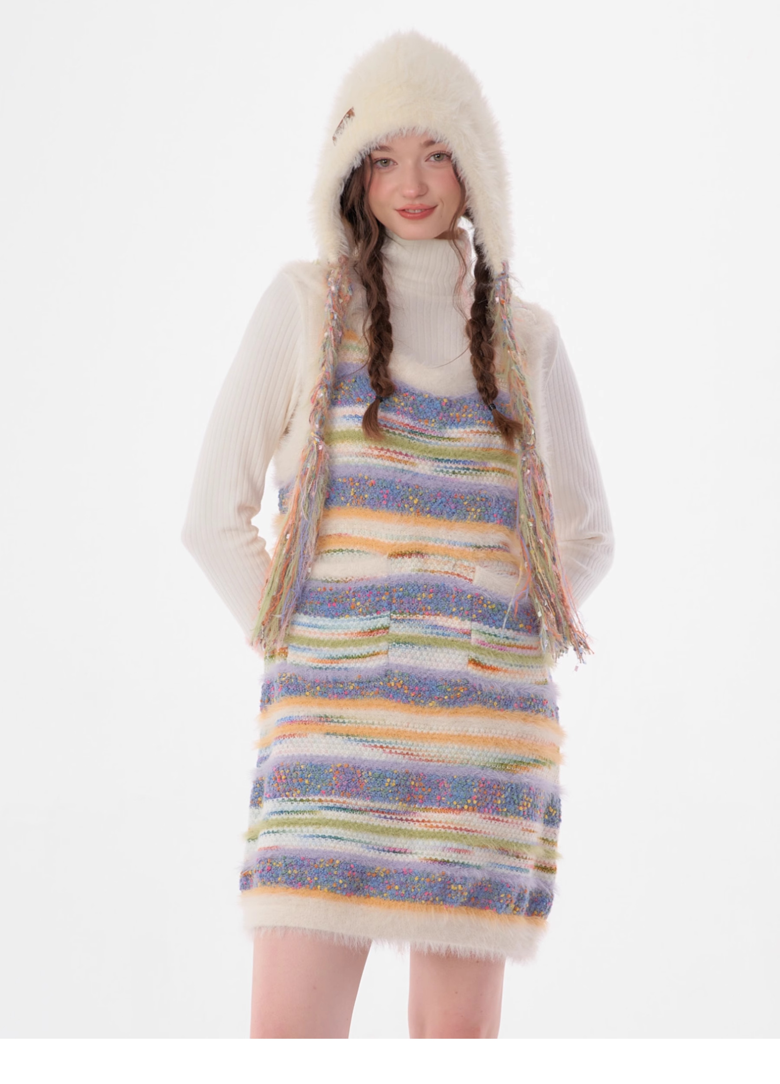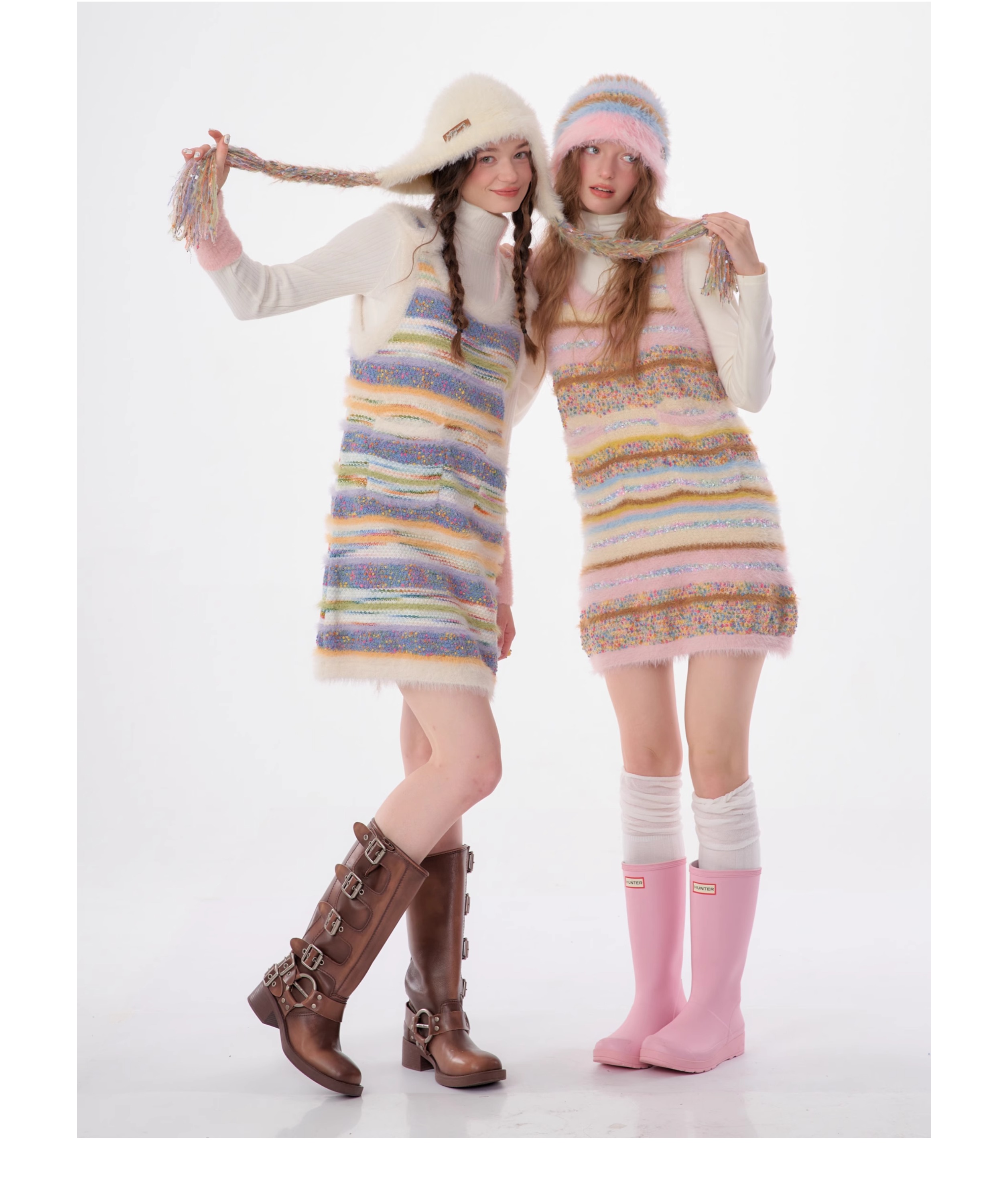 Robe débardeur tricotée à rayures rétro | Jupe longue en peluche sans manches pour l'automne/hiver