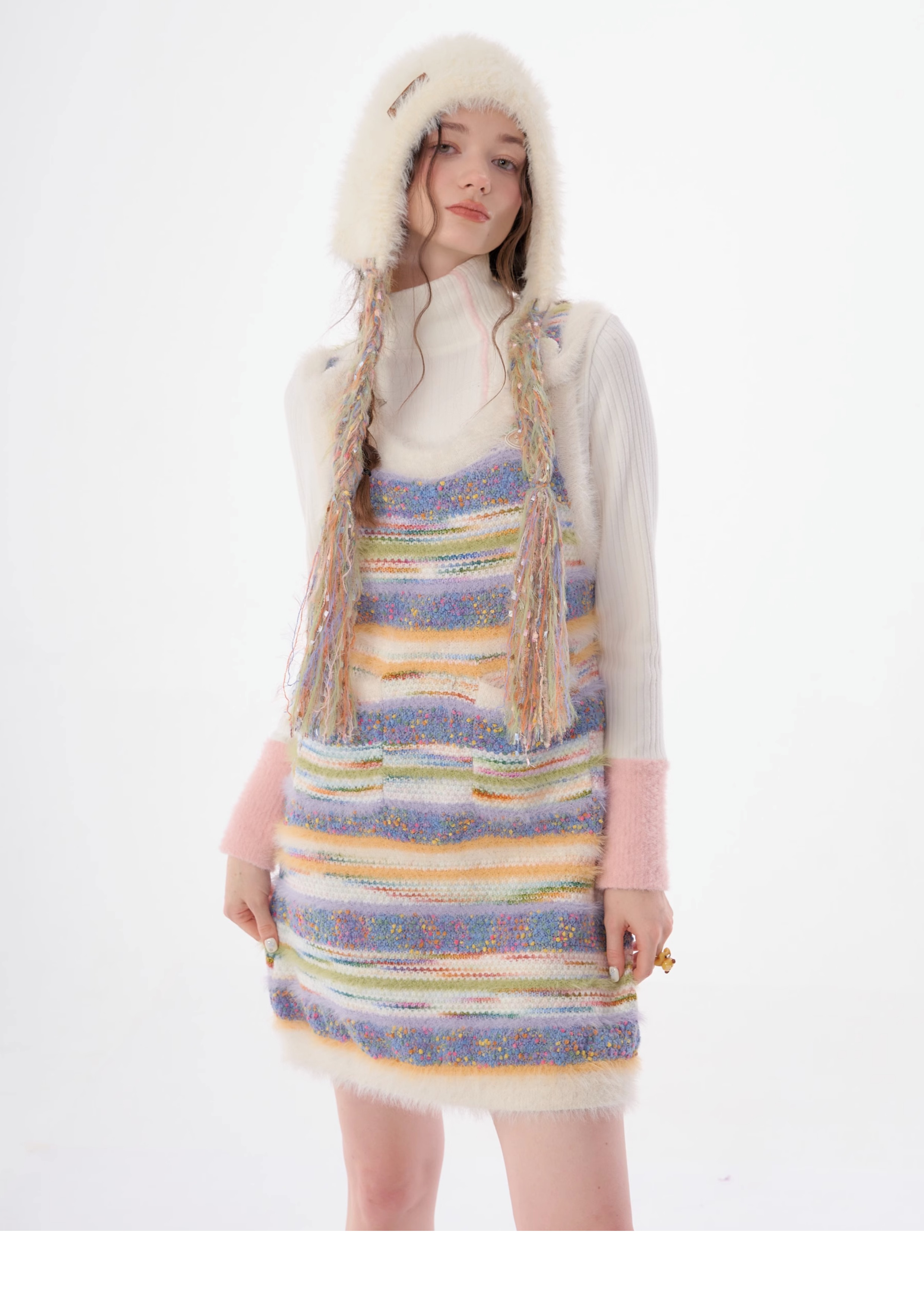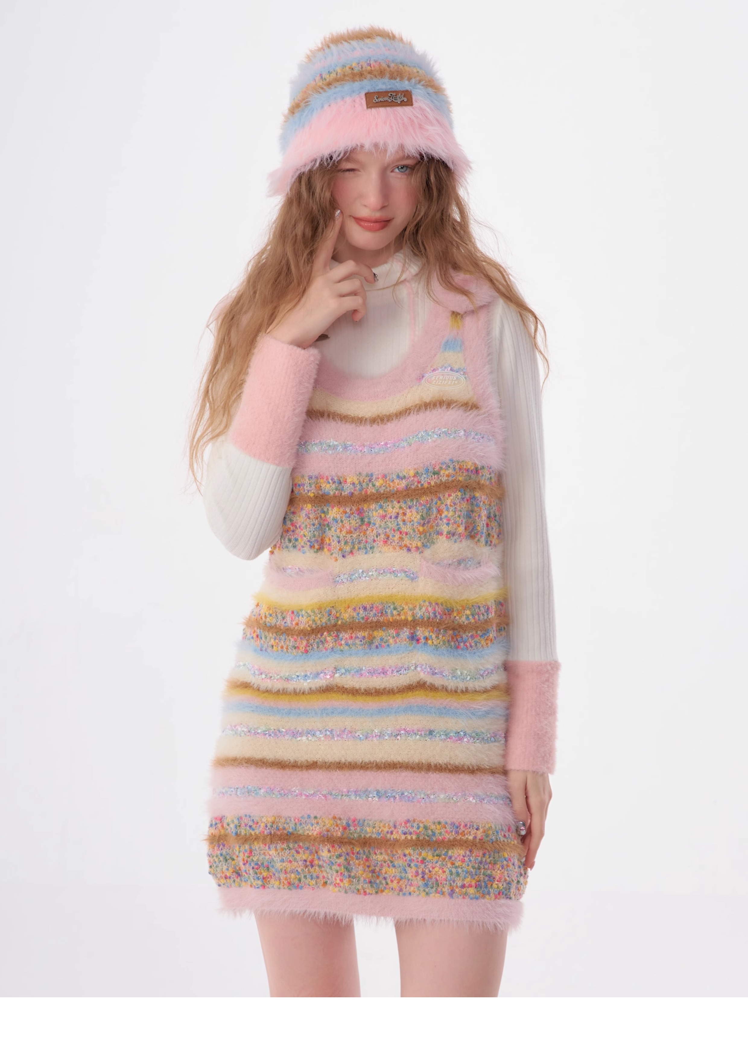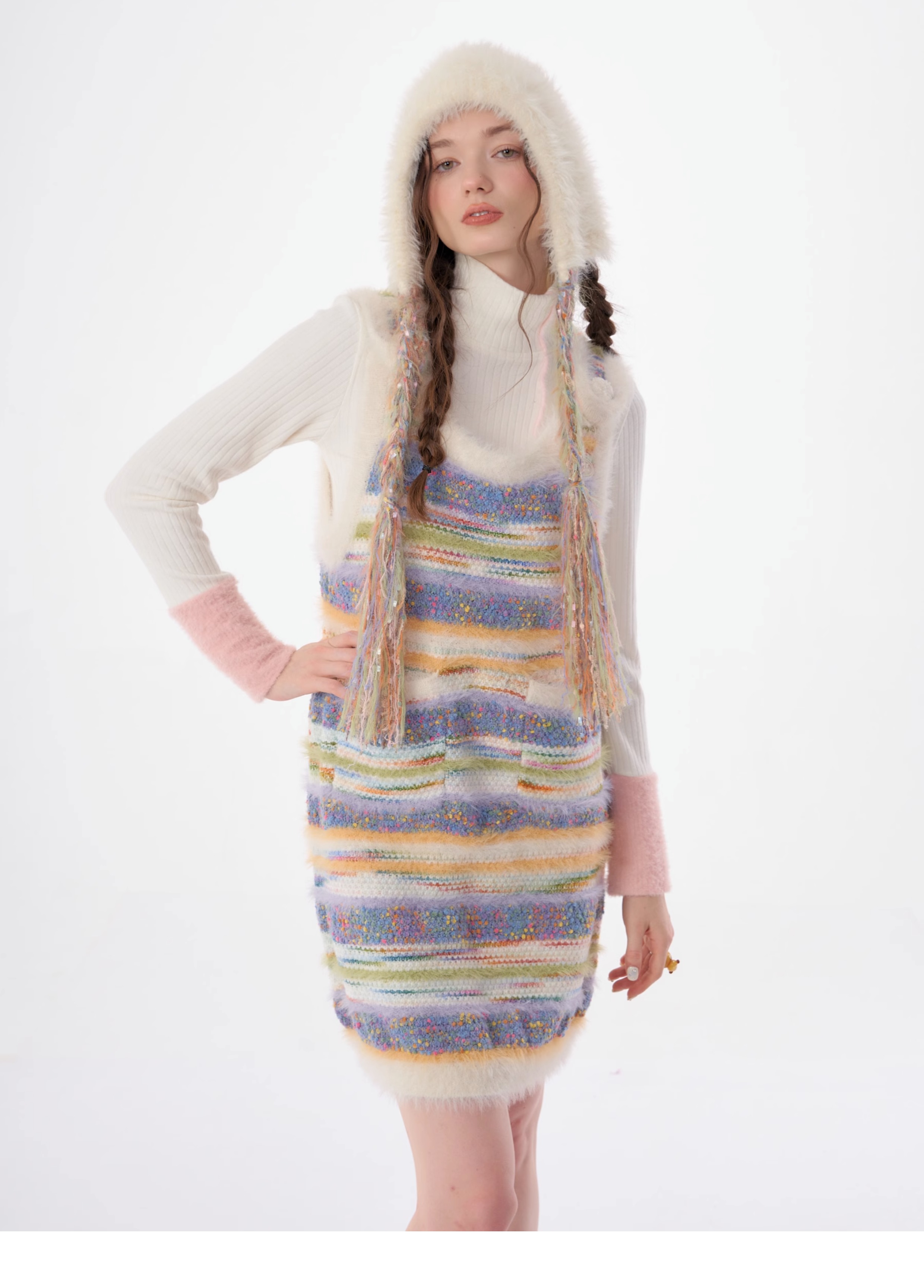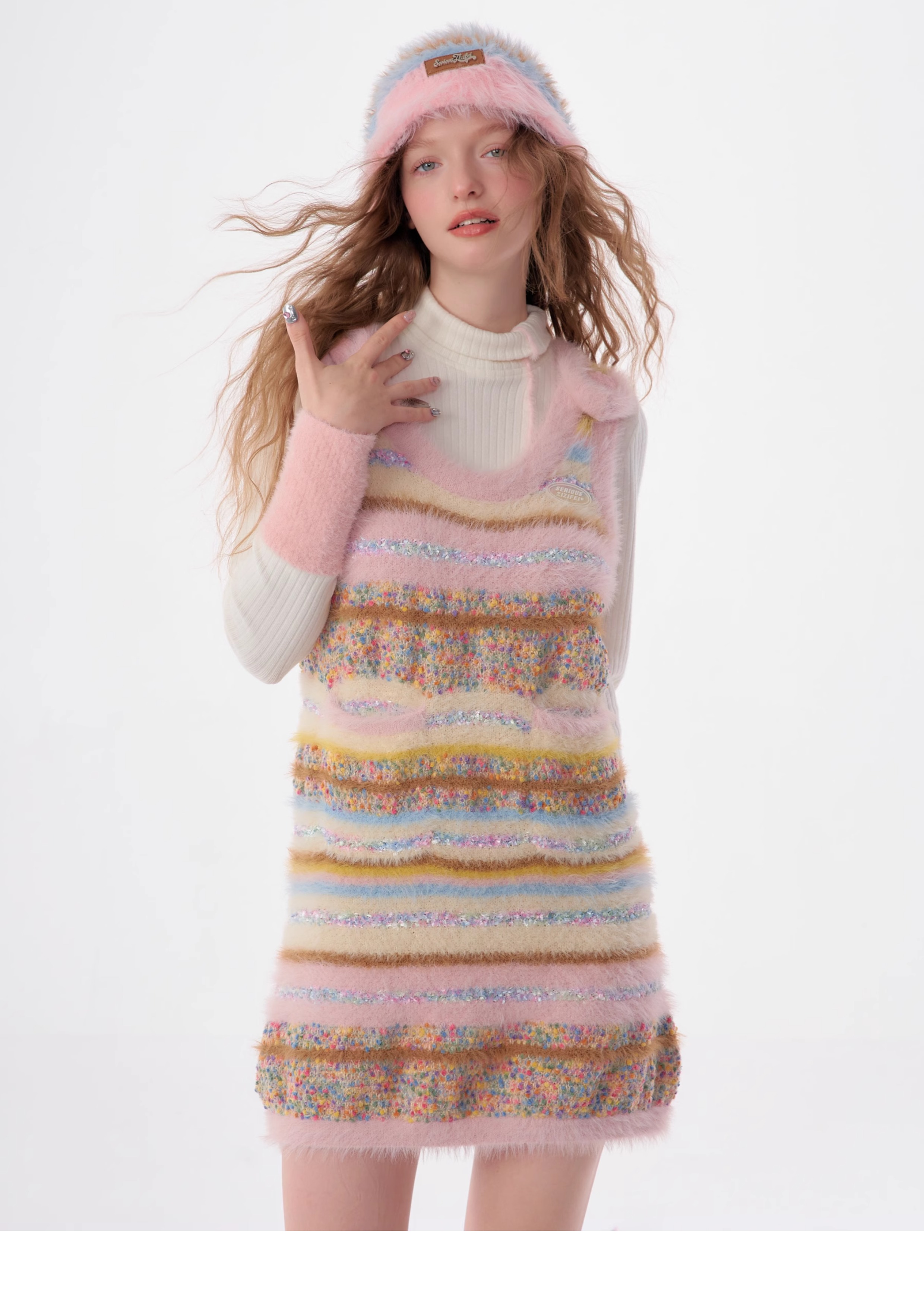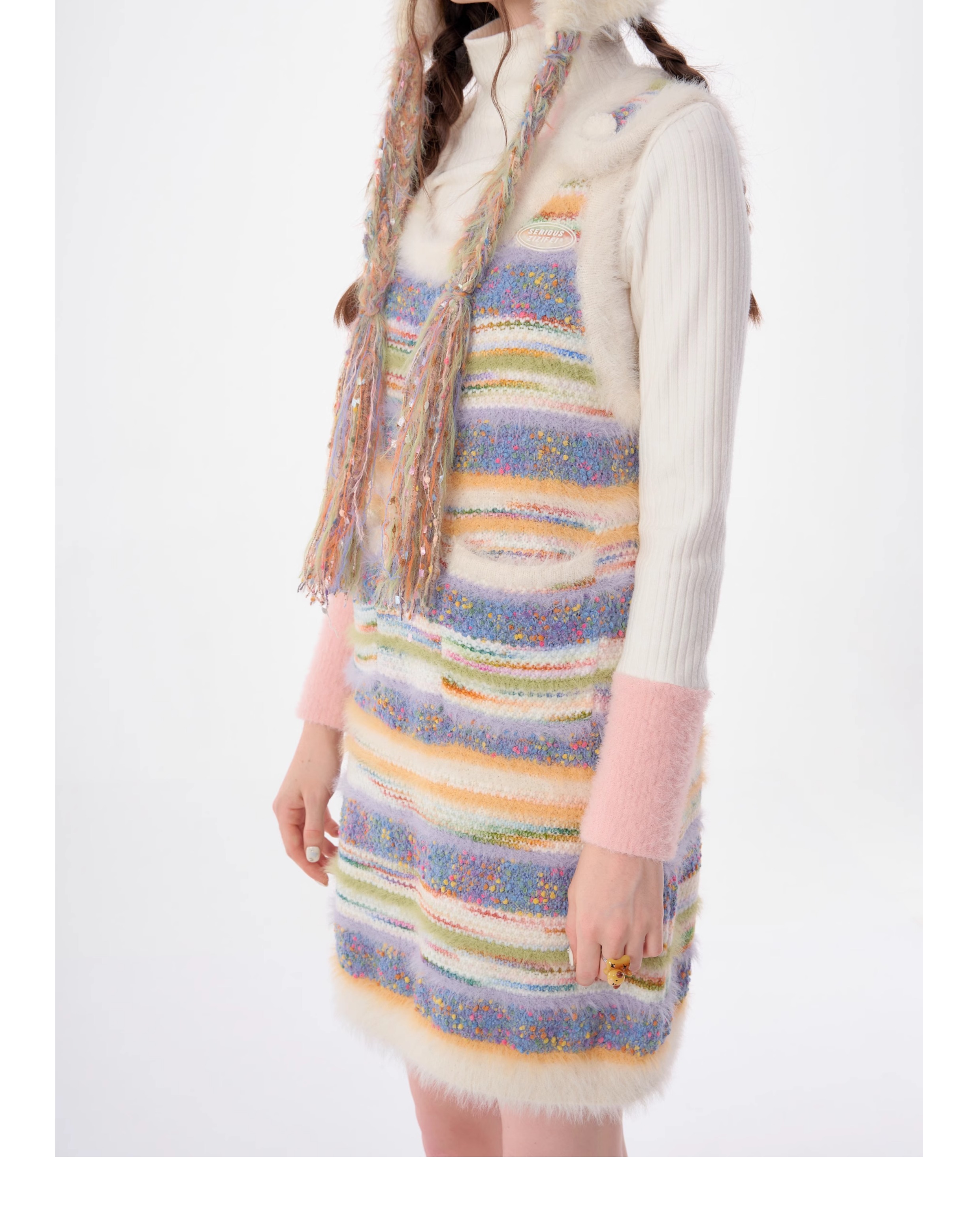 Robe débardeur tricotée à rayures rétro | Jupe longue en peluche sans manches pour l'automne/hiver