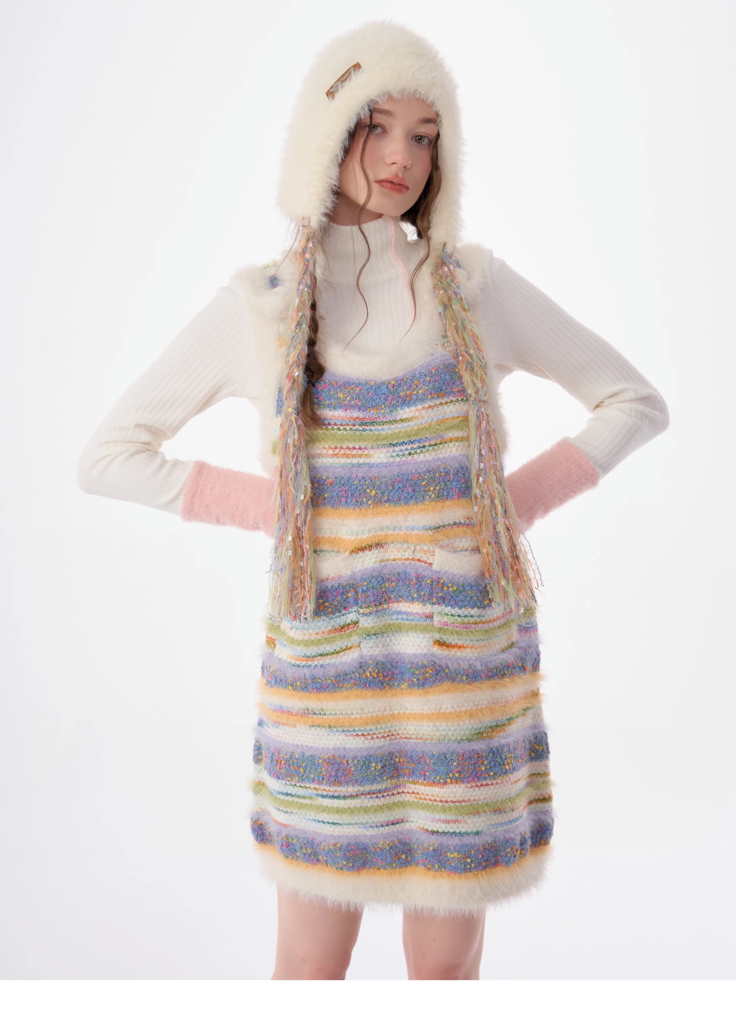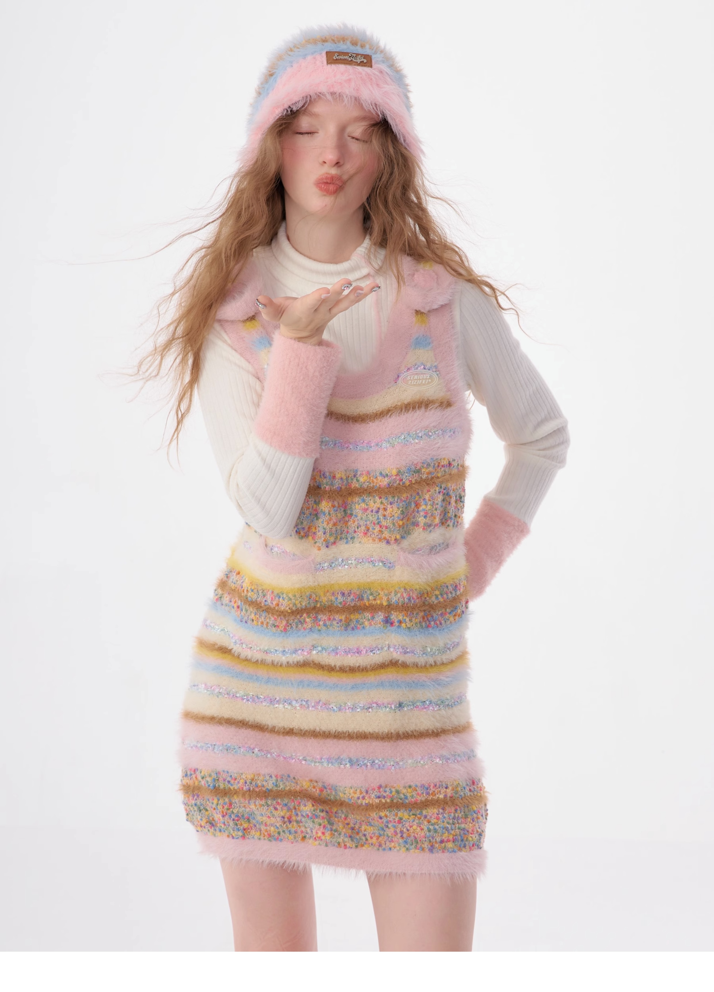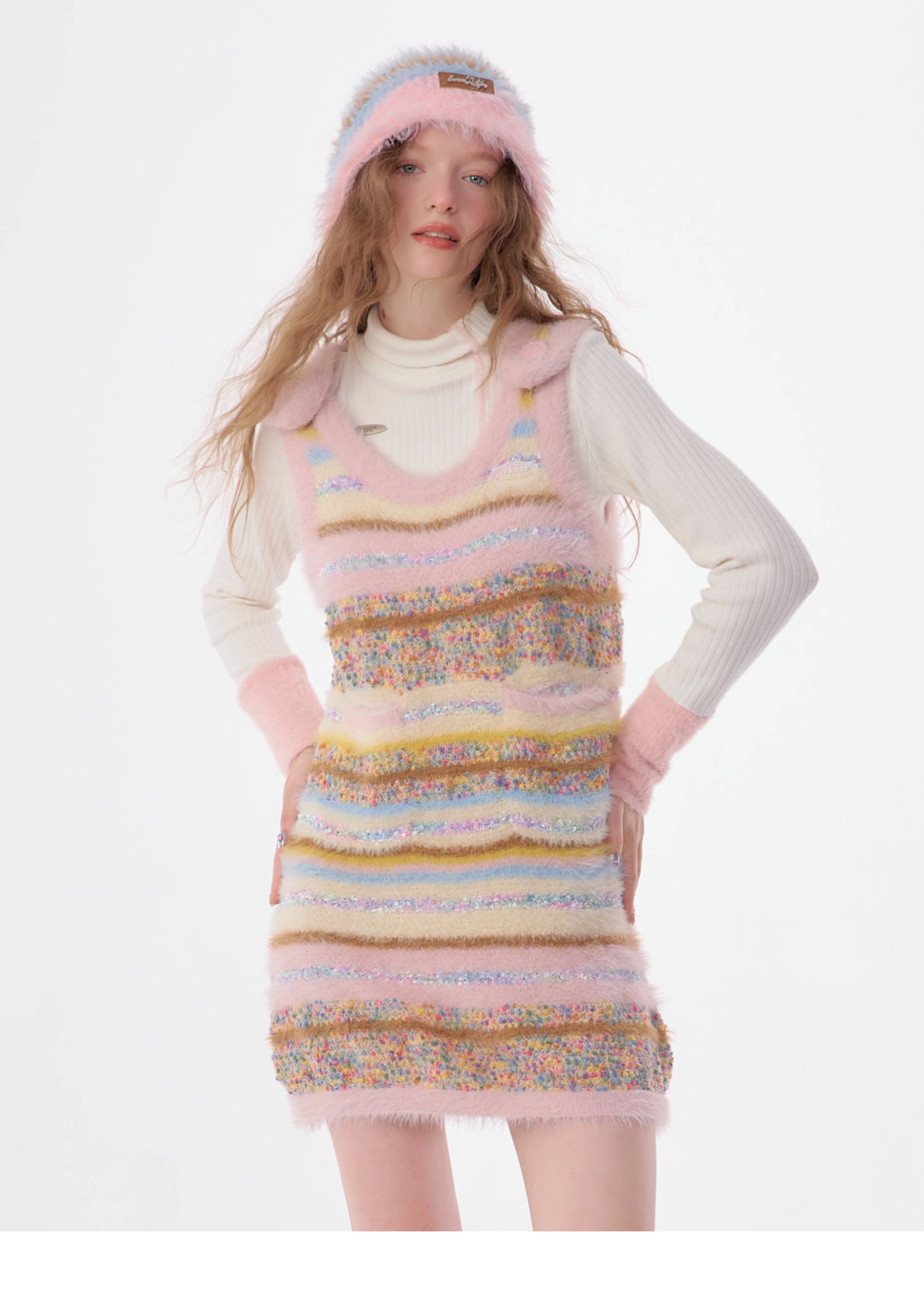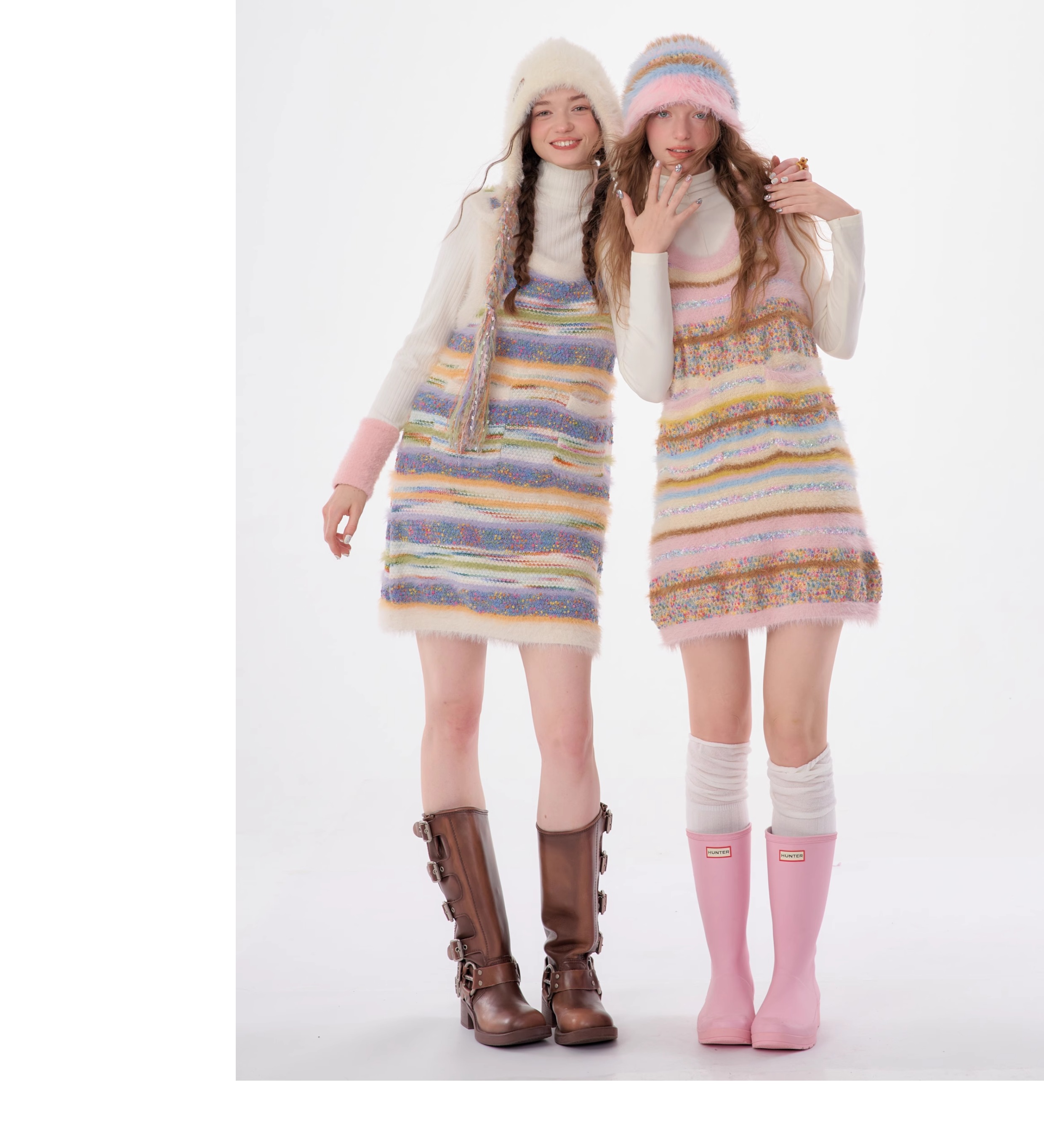 Robe débardeur tricotée à rayures rétro | Jupe longue en peluche sans manches pour l'automne/hiver