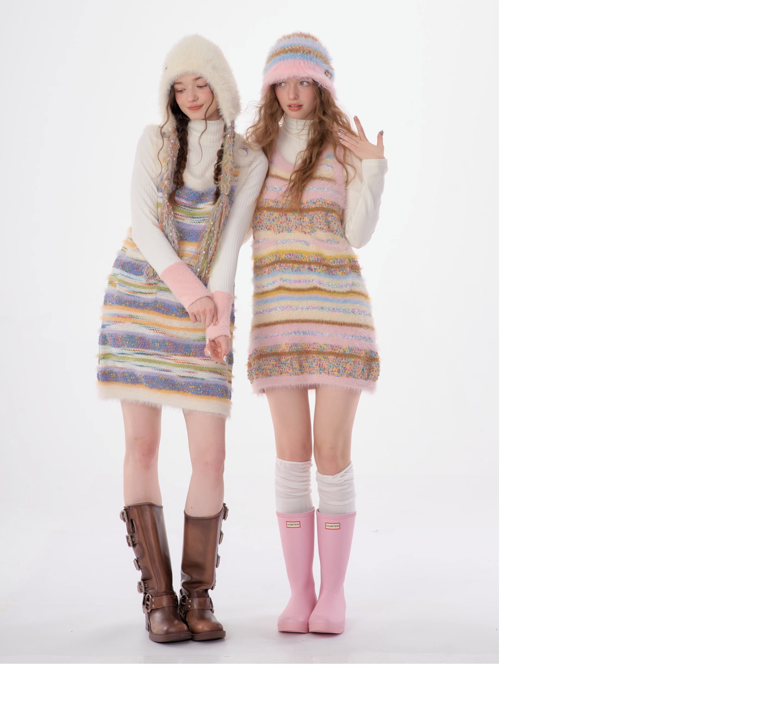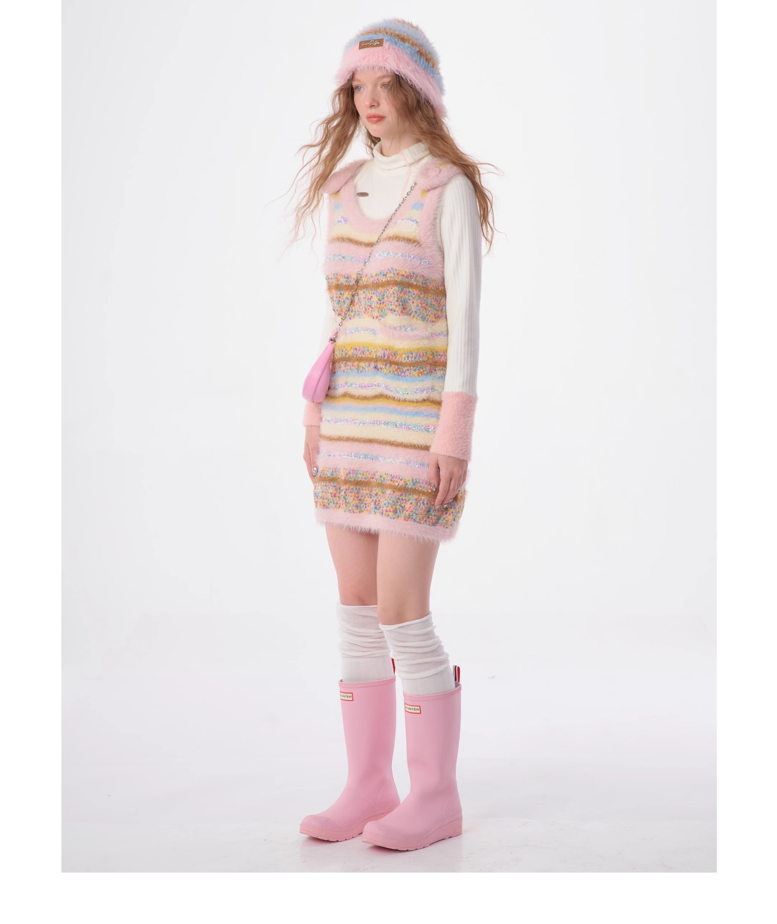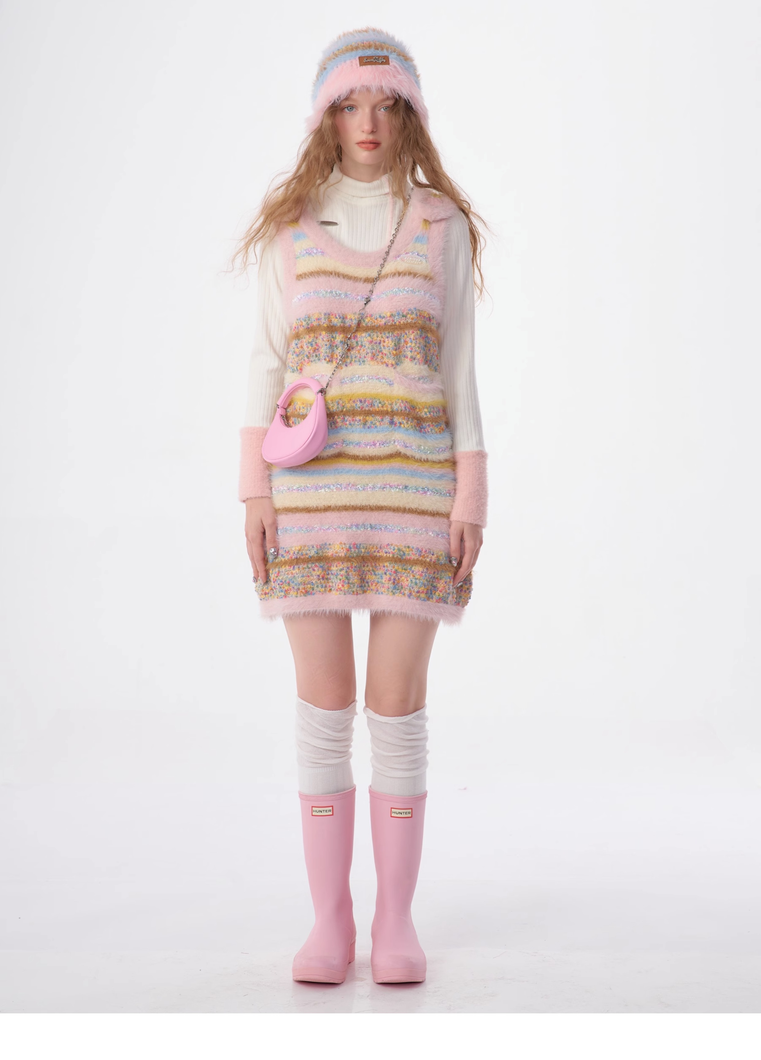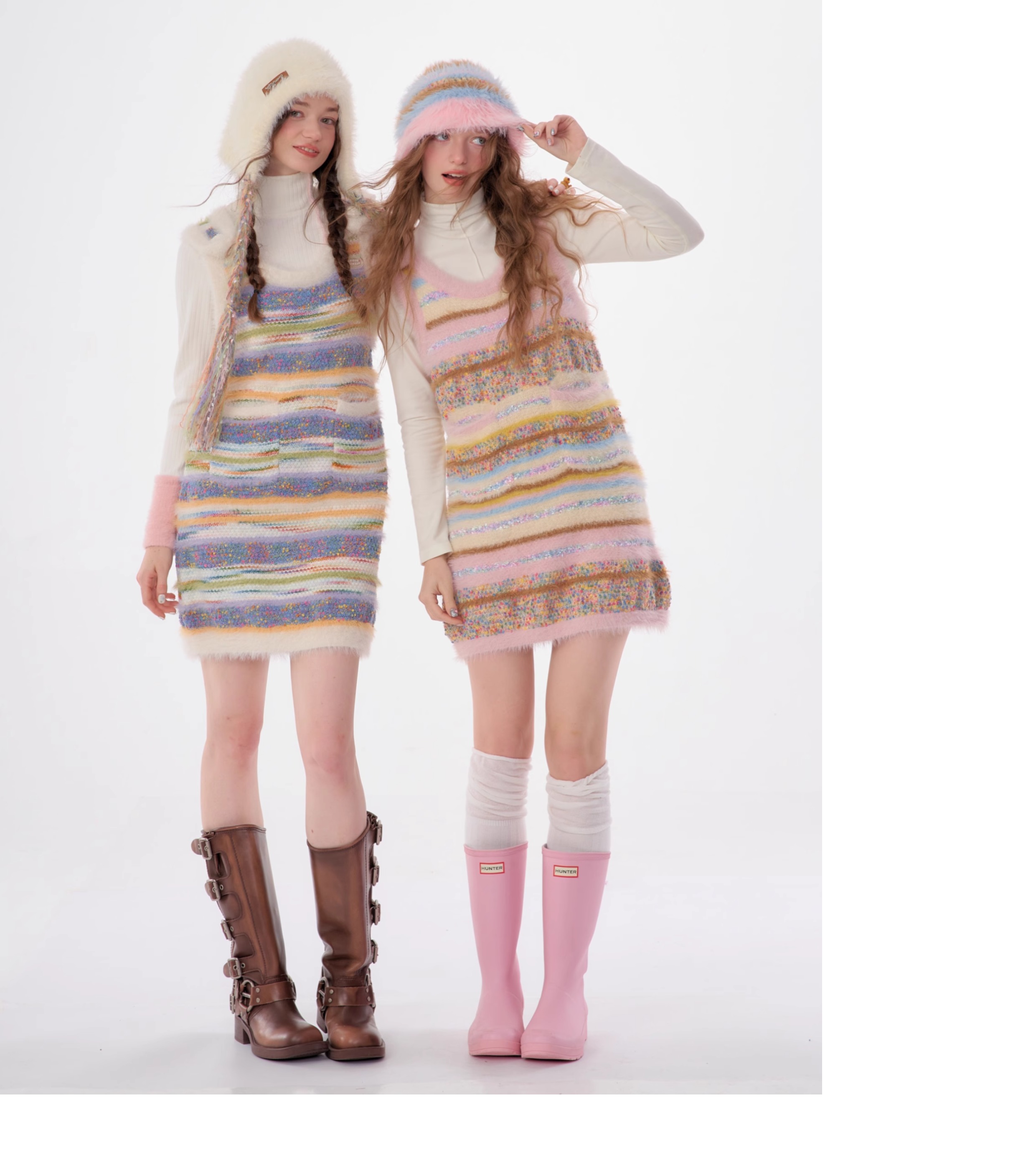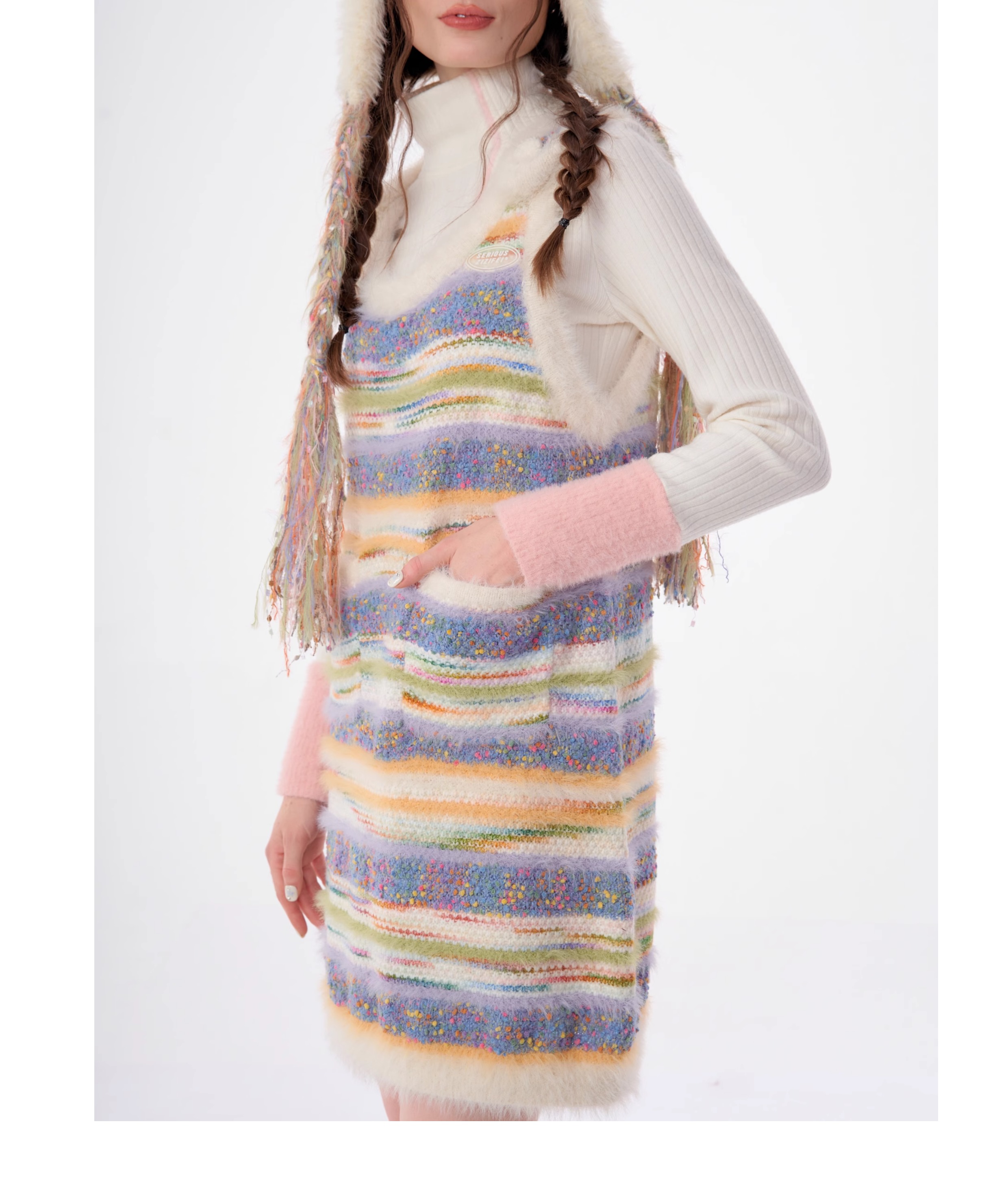 Robe débardeur tricotée à rayures rétro | Jupe longue en peluche sans manches pour l'automne/hiver