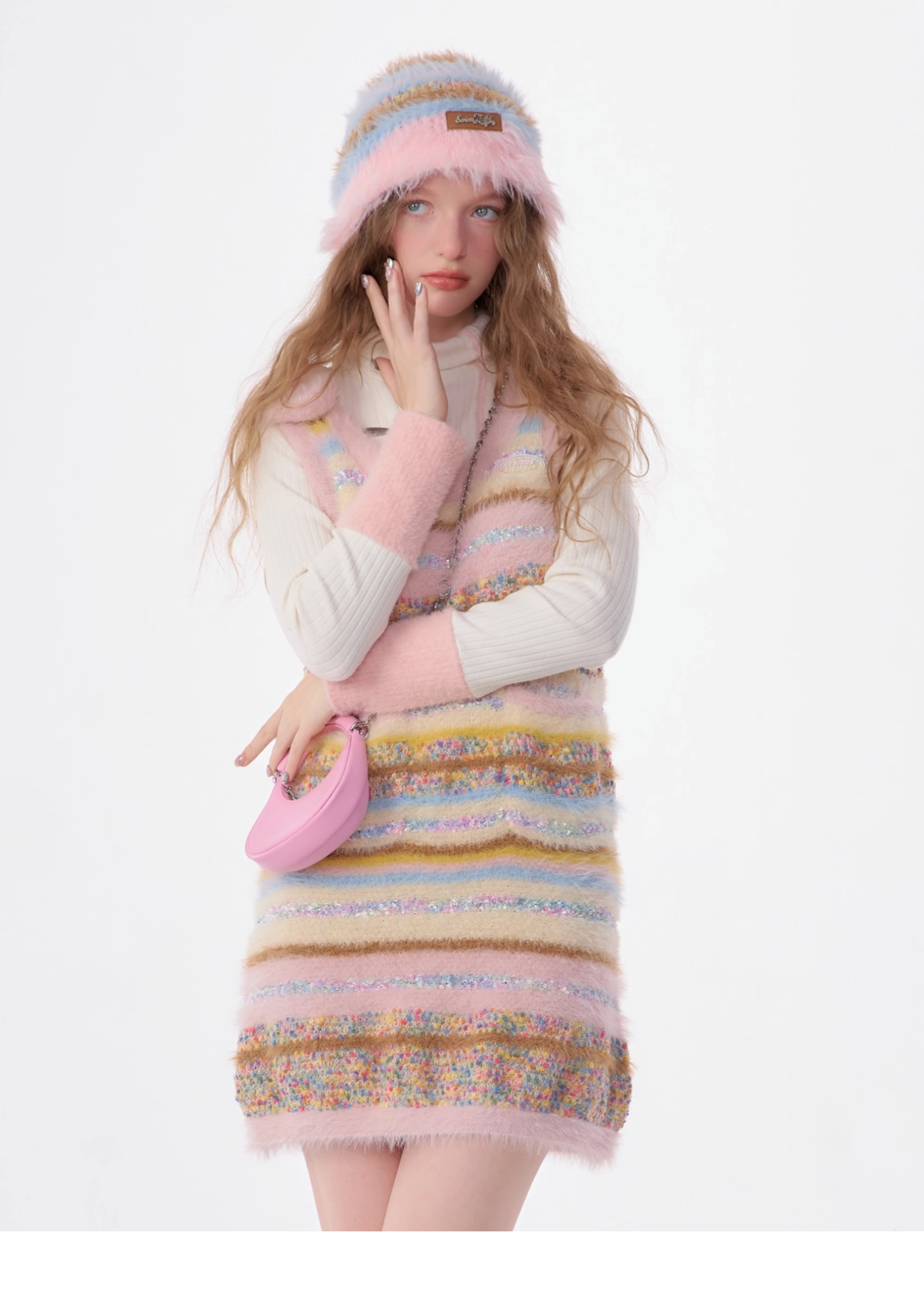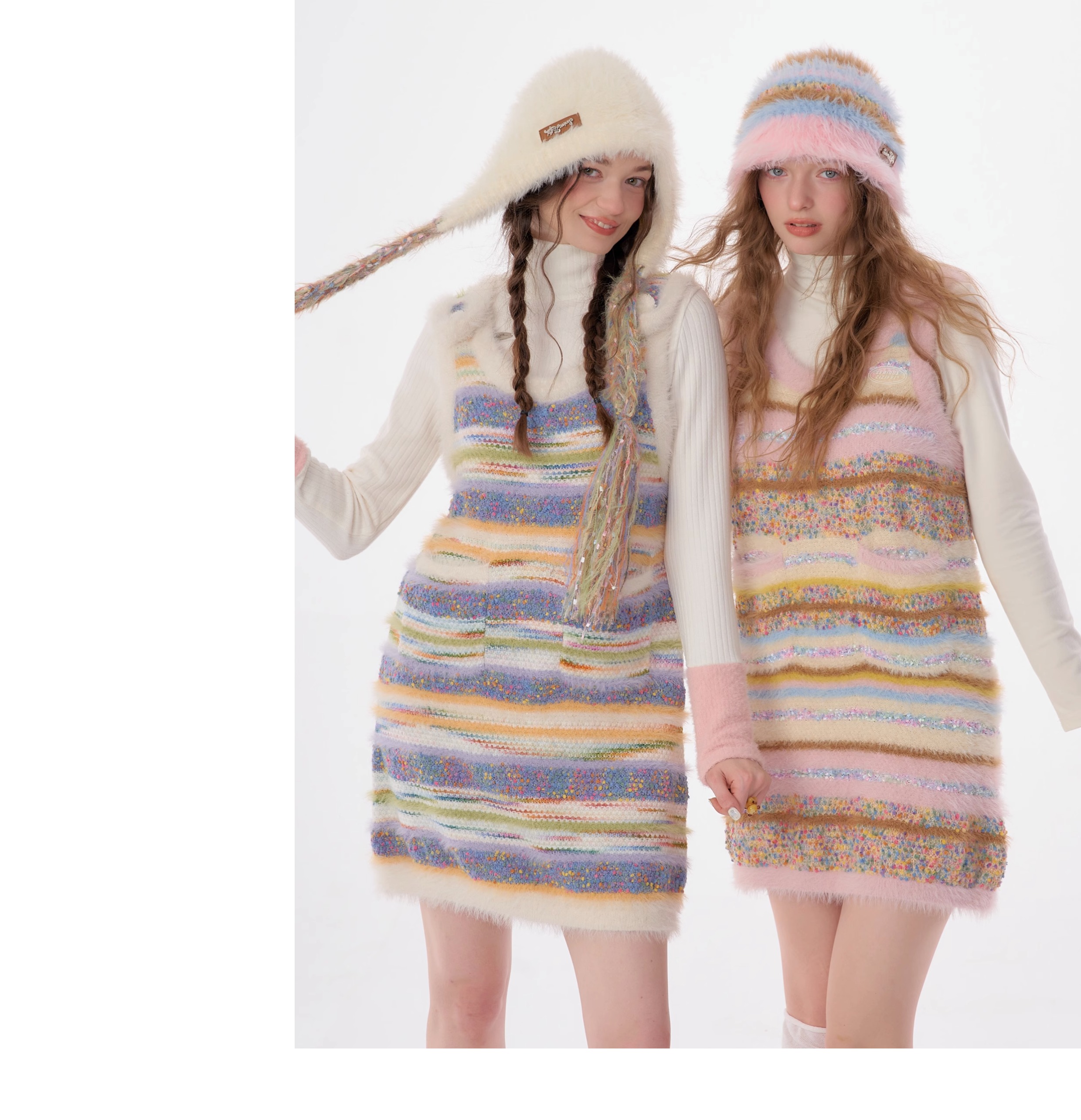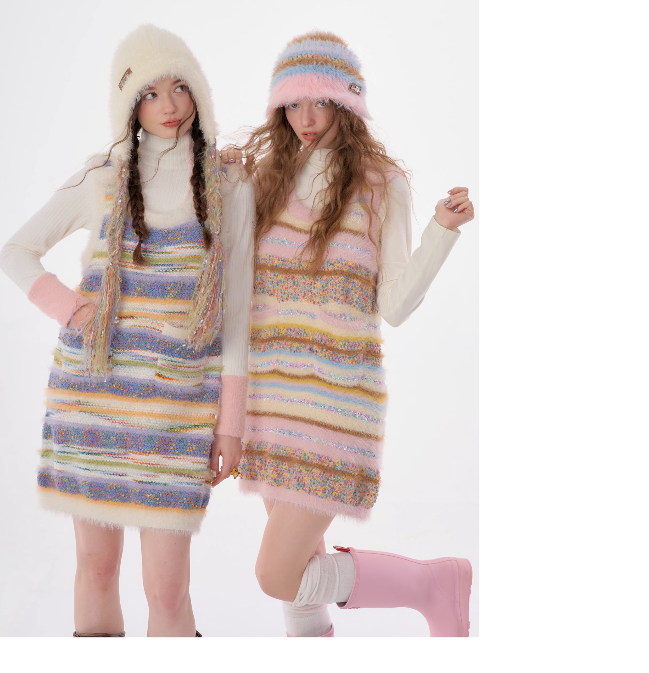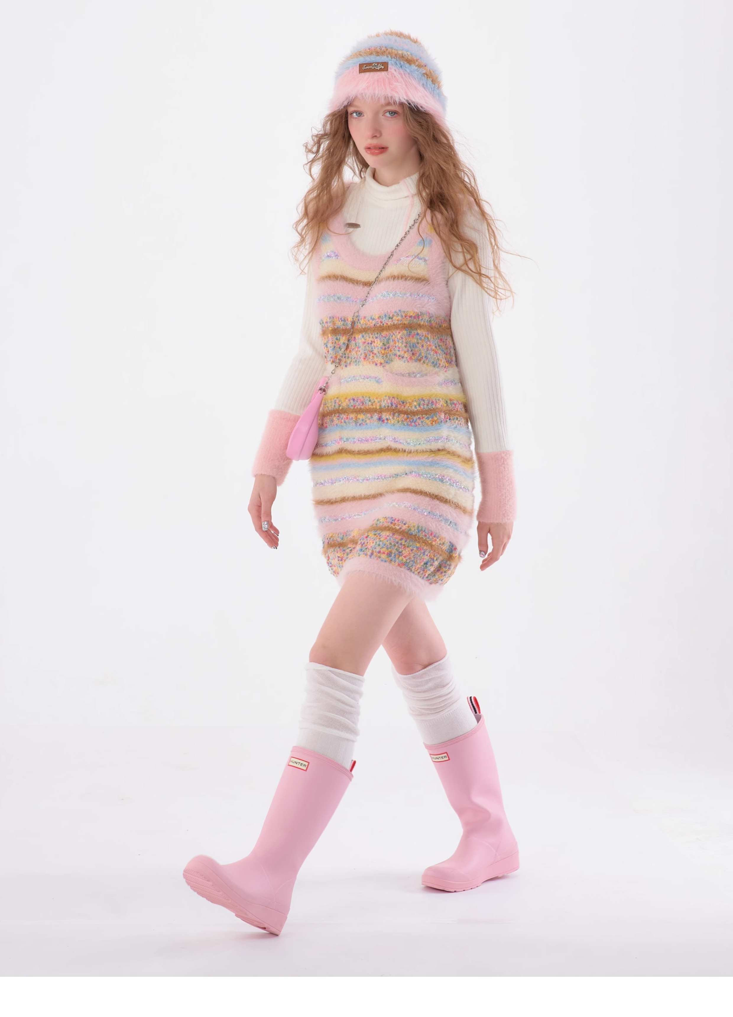 Robe débardeur tricotée à rayures rétro | Jupe longue en peluche sans manches pour l'automne/hiver